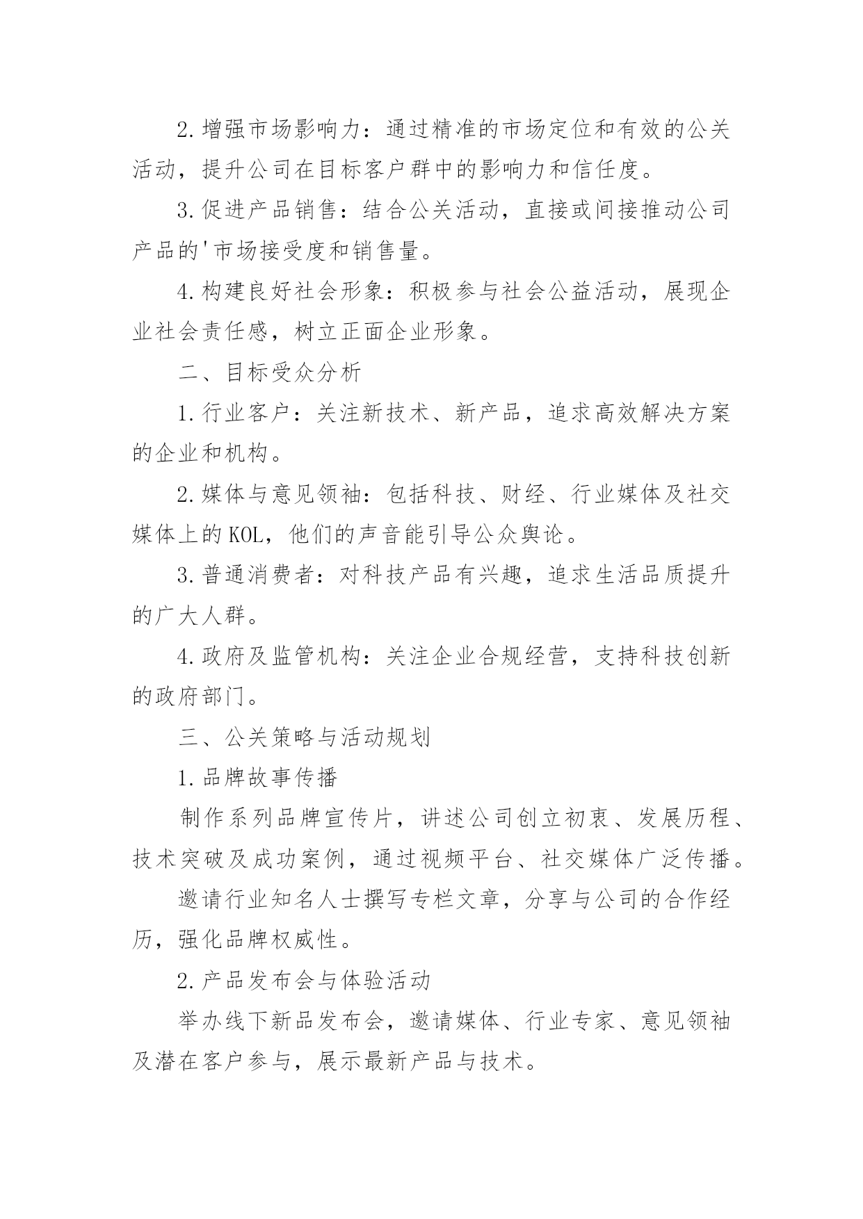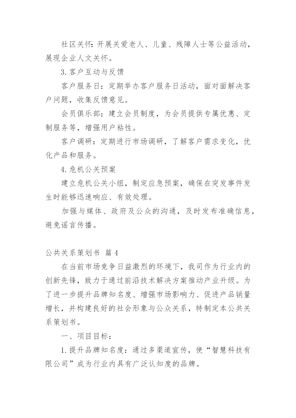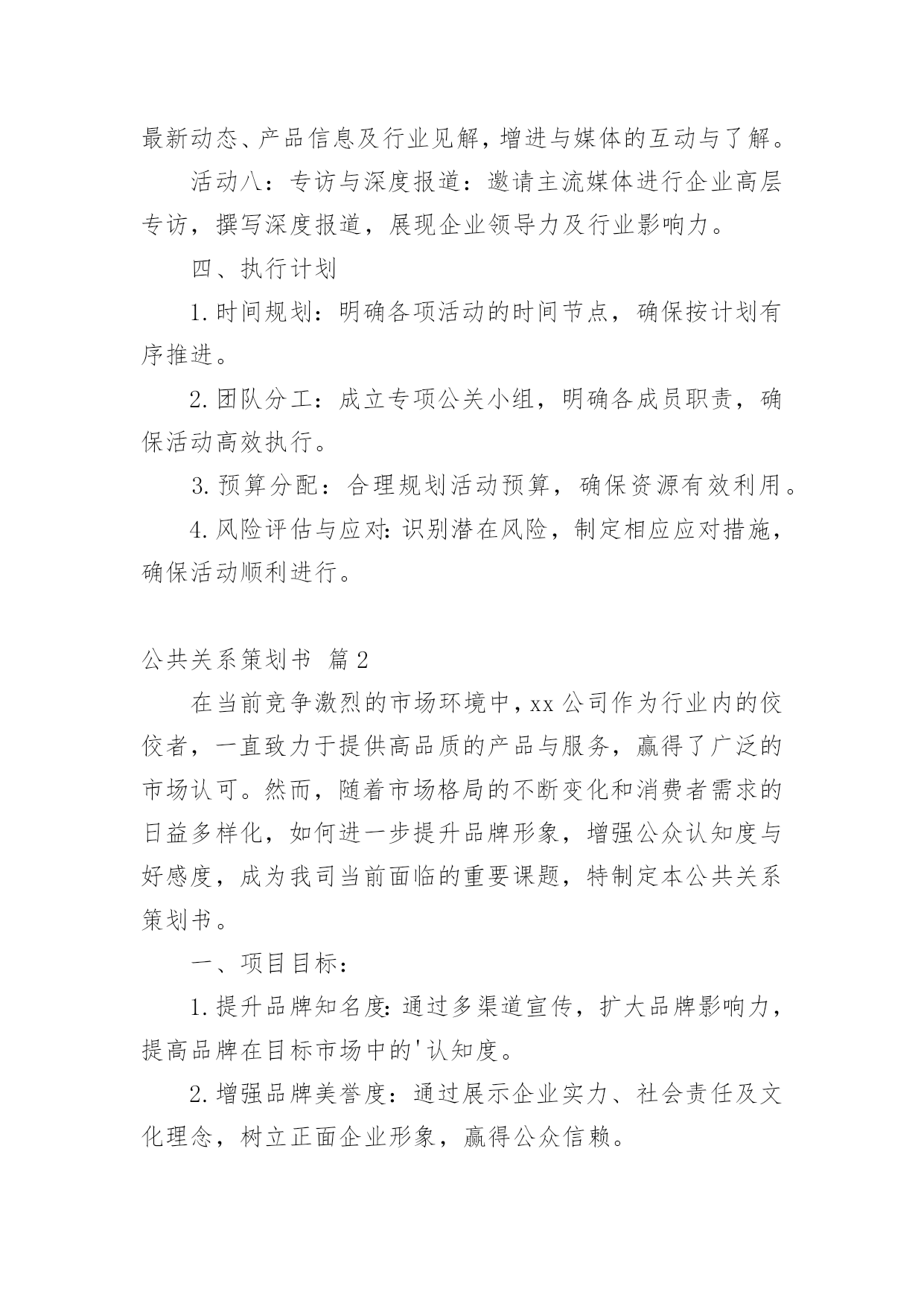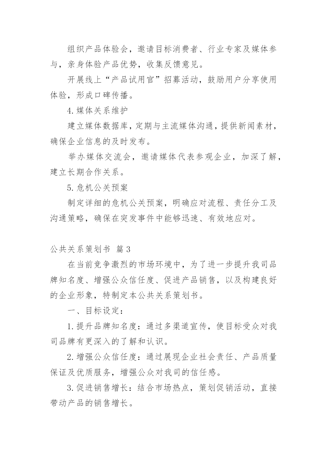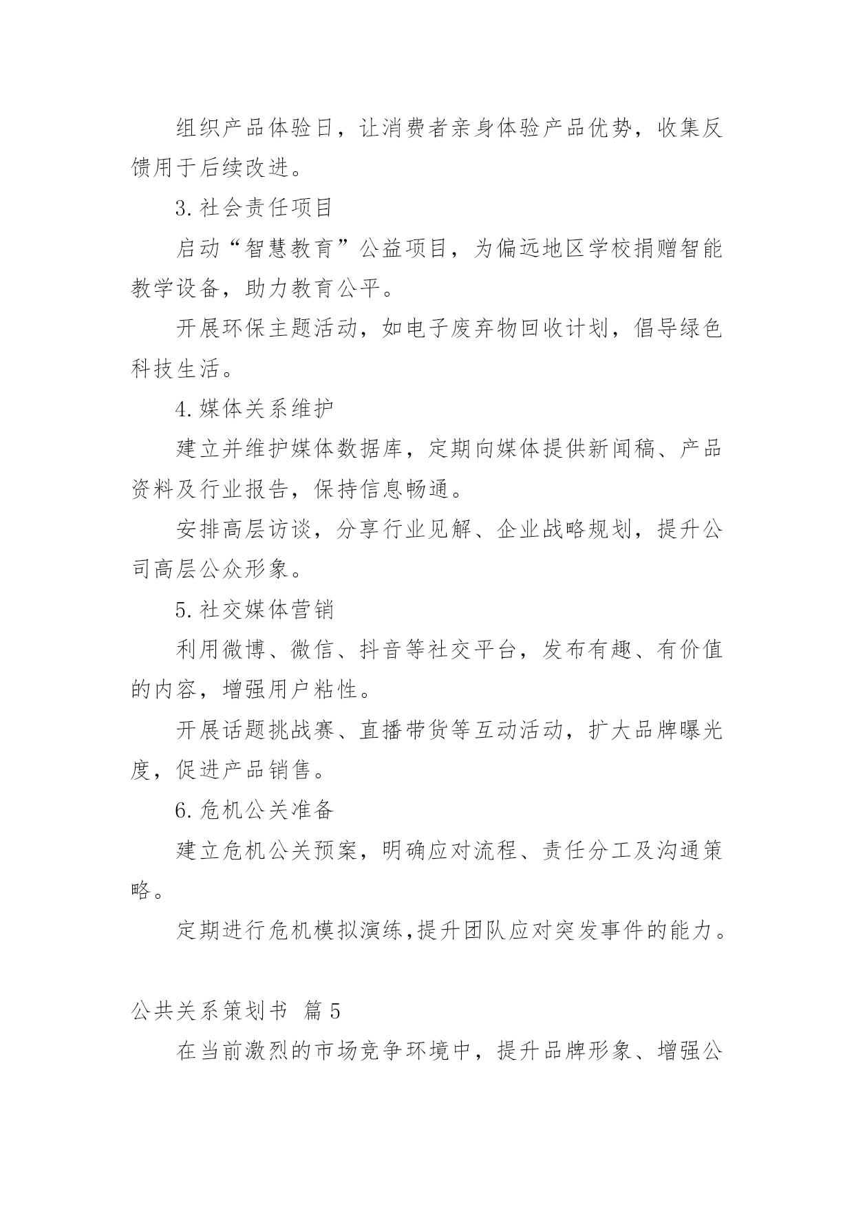 公共关系策划书篇1(精品)公共关系策划书时光如流水般匆匆流动,一段时间的工作已经结束了,很快就要开展新的工作了,当然要定好新的目标,需要认真地为此写一份策划书。那么如何把策划书做到重点突出呢?以下是小编为大家收集的公共关系策划书,供大家参考借鉴,希望可以帮助到有需要的朋友。公共关系策划书篇1为了进一步加强与公众、媒体、客户及合作伙伴的沟通与交流,提升品牌影响力和美誉度,特制定本公共关系策划书。一、目标设定:1.品牌形象塑造:通过一系列公关活动,强化我司的正面品牌形象,突出产品特色与企业文化。2.市场拓展:增加品牌曝光度,吸引潜在客户,拓展市场份额。3.客户忠诚度提升:增强现有客户的品牌忠诚度,促进口碑传播。4.媒体关系优化:建立并维护与媒体的良好关系,提升品牌在媒体中的'正面报道率。二、目标受众分析1.消费者:关注产品品质、性价比、品牌故事及社会责任的广泛消费群体。2.媒体:包括行业媒体、主流媒体及社交媒体平台上的意见领袖和KOL。3.合作伙伴:供应商、分销商、渠道商等商业合作伙伴。4.政府及行业协会:影响政策制定及行业标准的重要力量。三、公关策略与活动规划1.品牌故事传播活动一:品牌纪录片发布:制作一部展现我司发展历程、企业文化、技术创新及社会责任的品牌纪录片,通过线上线下多渠道发布。活动二:主题展览:在主要城市举办品牌主题展览,结合VR技术,让参观者沉浸式体验品牌故事。2.社会责任项目活动三:公益捐赠活动:联合慈善机构,开展针对教育、环保或灾害救援等领域的公益捐赠活动,提升品牌社会形象。活动四:绿色行动:推广绿色生产理念,组织员工参与植树造林、垃圾分类等环保活动。3.消费者互动体验活动五:产品体验日:邀请消费者参观工厂、研发中心,亲身体验产品生产过程及技术创新点。活动六:线上互动挑战赛:在社交媒体平台发起与产品相关的趣味挑战赛,鼓励用户参与并分享,增加品牌曝光度。4.媒体关系建设活动七:媒体沟通会:定期举办媒体沟通会,分享企业最新动态、产品信息及行业见解,增进与媒体的互动与了解。活动八:专访与深度报道:邀请主流媒体进行企业高层专访,撰写深度报道,展现企业领导力及行业影响力。四、执行计划1.时间规划:明确各项活动的时间节点,确保按计划有序推进。2.团队分工:成立专项公关小组,明确各成员职责,确保活动高效执行。3.预算分配:合理规划活动预算,确保资源有效利用。4.风险评估与应对:识别潜在风险,制定相应应对措施,确保活动顺利进行。公共关系策划书篇2在当前竞争激烈的市场环境中,xx公司作为行业内的佼佼者,一直致力于提供高品质的产品与服务,赢得了广泛的市场认可。然而,随着市场格局的不断变化和消费者需求的日益多样化,如何进一步提升品牌形象,增强公众认知度与好感度,成为我司当前面临的重要课题,特制定本公共关系策划书。一、项目目标:1.提升品牌知名度:通过多渠道宣传,扩大品牌影响力,提高品牌在目标市场中的'认知度。2.增强品牌美誉度:通过展示企业实力、社会责任及文化理念,树立正面企业形象,赢得公众信赖。3.促进产品销售:结合公关活动,推动产品试用、体验,促进潜在客户的转化,提升销售业绩。4.建立良好媒体关系:与主流媒体建立长期合作关系,确保企业信息的准确、及时传播,有效应对危机公关。二、目标受众分析1.消费者群体:主要面向我司产品的目标消费群体,包括不同年龄、性别、职业及兴趣爱好的人群。2.行业伙伴:包括供应商、渠道商、竞争对手及行业协会等,通过合作与交流,共同推动行业发展。3.媒体与公众:包括报纸、电视、网络等主流媒体及广大网民,通过正面报道与互动,提升品牌公信力。三、公关策略与活动方案1.品牌故事传播制作企业宣传片,讲述公司发展历程、企业文化、产品理念及成功案例,通过社交媒体、官方网站及线下活动进行广泛传播。邀请知名媒体进行深度访谈,分享企业背后的故事,展现企业精神风貌。2.社会责任项目发起“绿色行动”公益项目,倡导环保理念,如植树造林、垃圾分类宣传等,提升企业社会形象。开展“爱心助学”活动,资助贫困地区学生,传递企业温暖,增强公众好感度。3.产品体验活动组织产品体验会,邀请目标消费者、行业专家及媒体参与,亲身体验产品优势,收集反馈意见。开展线上“产品试用官”招募活动,鼓励用户分享使用体验,形成口碑传播。4.媒体关系维护建立媒体数据库,定期与主流媒体沟通,提供新闻素材,确保企业信息的及时发布。举办媒体交流会,邀请媒体代表参观企业,加深了解,建立长期合作关系。5.危机公关预案制定详细的危机公关预案,明确应对流程、责任分工及沟通策略,确保在突发事件中能够迅速、有效地应对。公共关系策划书篇3在当前竞争激烈的市场环境中,为了进一步提升我司品牌知名度、增强公众信任度、促进产品销售,以及构建良好的企业形象,特制定本公共关系策划书。一、目标设定