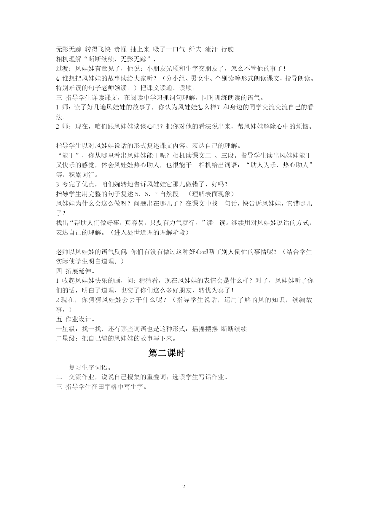 PAGE\*MERGEFORMAT216风娃娃一教学目标:★知能目标:1会认12个生字。会写10个生字。2能正确流利地朗读课文。3能积累“摇摇摆摆”这种AABB形式的词语。4模仿课文编故事。★过程与方法目标:在朗读中了解故事的来龙去脉,学会怎样读懂课文,重点学习边读边想:谁做了什么?★情感目标:1使学生通过学习课文,明白风的作用。明白有好心还要有好方法这个做人事的道理。2培养学生读书习惯和兴趣。二教学重点:HYPERLINK"http://www.teachercn.com/Xxyw/Yd/"\t"http://www.teachercn.com/Jxal/Xxsnjywja/2006-1/9/_blank"阅读能力的培养,通过学习使学生体会怎样HYPERLINK"http://www.teachercn.com/Xxyw/Yd/"\t"http://www.teachercn.com/Jxal/Xxsnjywja/2006-1/9/_blank"阅读较长的课文,怎样弄清课文内容。三教学思路:本文是一篇童话故事,有趣又富有哲理。既能使学生产生探究风到底有什么用途的兴趣,又能使学生认识到做好事也要讲究方法这个道理。学生刚刚开始接触这么长的课文,HYPERLINK"http://www.teachercn.com/Xxyw/Yd/"\t"http://www.teachercn.com/Jxal/Xxsnjywja/2006-1/9/_blank"阅读可能有一定困难,所以,教给学生怎样理清课文条理,弄清课文内容是学法指导的关键。采用指导学生“读一读,画一画”(关键词句、段落)弄清课文大意的办法,“议一议”,和风娃娃谈心,告诉他那里错了,那里对了,应该怎么做。继而续编故事,以“风娃娃听了小朋友的话。。。。。。”开头,说说风娃娃去做什么了,重点指导学生把自己想说的话表达清楚。四教学准备:布置学生预习课文,自学生HYPERLINK"http://www.teachercn.com/Xxyw/Zc/"\t"http://www.teachercn.com/Jxal/Xxsnjywja/2006-1/9/_blank"字词语;制作卡片。五课时安排:2课时六授课时间第一课时一激趣导入。1告诉学生:老师要给同学们介绍一个新朋友,瞧,它来啦!(出示风娃娃简笔画——快乐的样子),板书课题。2喜欢这个风娃娃吗?(说话练习。看到可爱的风娃娃,孩子肯定想说话,给他们表达的机会)老师快速伤心表情的风娃娃。示意学生说自己看到的。咦,风娃娃怎么了?他为什么伤心呢?让我听听风娃娃怎么说。(做倾听状):对了,风娃娃说,最近它有一些烦恼,很不开心,想找朋友倾诉,你们愿意作风娃娃的朋友吗?那就让我告诉你风娃娃的苦恼吧。(进入范读课文环节)二初读课文,弄清大意,检查预习。1范读课文。:听明白什么了?说一说。(检查预习和听的能力。)2鼓励学生读课文,解决疑难。大家再读读课文,把风娃娃的事情彻底弄清楚了,好给它出主意啊。把你在预习的时候学的还不熟练的生字圈出来,多读两遍。等会我们来放鞭炮,看看谁最利索,不出错。3用放鞭炮的形式检查生HYPERLINK"http://www.teachercn.com/Xxyw/Zc/"\t"http://www.teachercn.com/Jxal/Xxsnjywja/2006-1/9/_blank"字词语的预习。(逐步把生HYPERLINK"http://www.teachercn.com/Xxyw/Zc/"\t"http://www.teachercn.com/Jxal/Xxsnjywja/2006-1/9/_blank"字词的学习转化为自学,上课时重点指导难认的字。)断断续续摇摇摆摆奔跑一艘船表示感谢田野赶紧伤心风筝无影无踪转得飞快责怪抽上来吸了一口气纤夫流汗行驶相机理解“断断续续、无影无踪”,过渡:风娃娃有意见了,他说:小朋友光顾和生字交朋友了,怎么不管他的事了!4谁想把风娃娃的故事读给大家听?(分小组、男女生、个别读等形式朗读课文,指导朗读。特别难读的句子老师领读。)把课文读通、读顺。三指导学生详读课文,在HYPERLINK"http://www.teachercn.com/Xxyw/Yd/"\t"http://www.teachercn.com/Jxal/Xxsnjywja/2006-1/9/_blank"阅读中学习抓词句理解,同时训练朗读的语气。1师:读了好几遍风娃娃的故事了,你认为风娃娃怎么样?和身边的同学HYPERLINK"http://www.caidown.cn/"\t"http://www.teachercn.com/Jxal/Xxsnjywja/2006-1