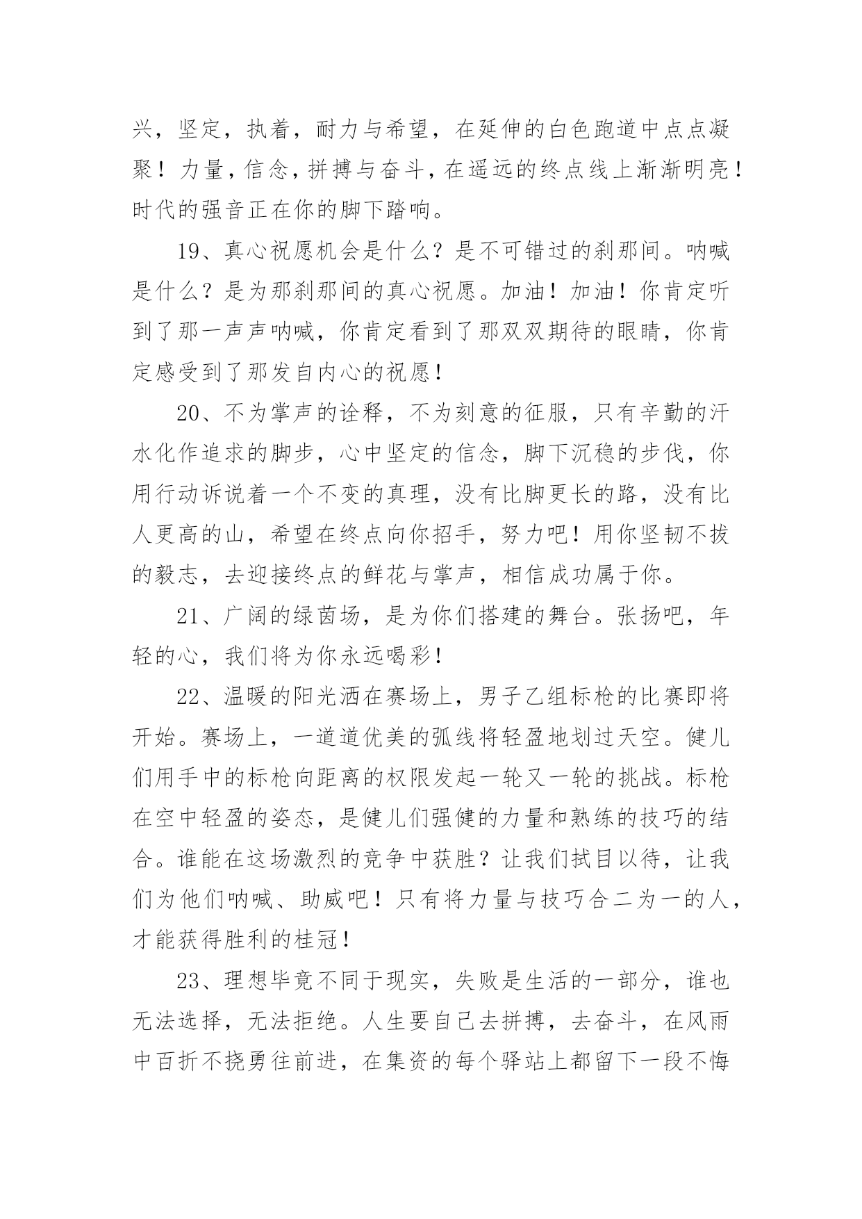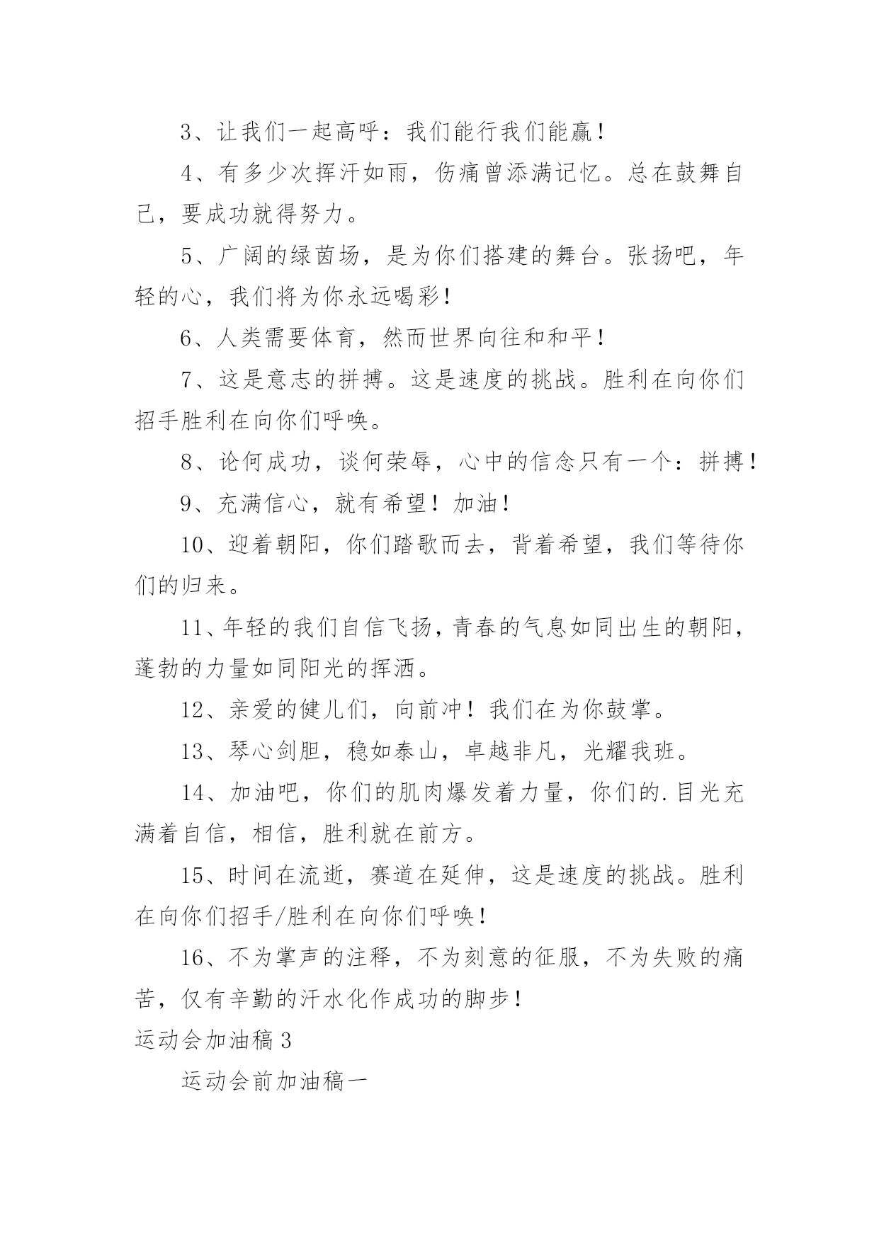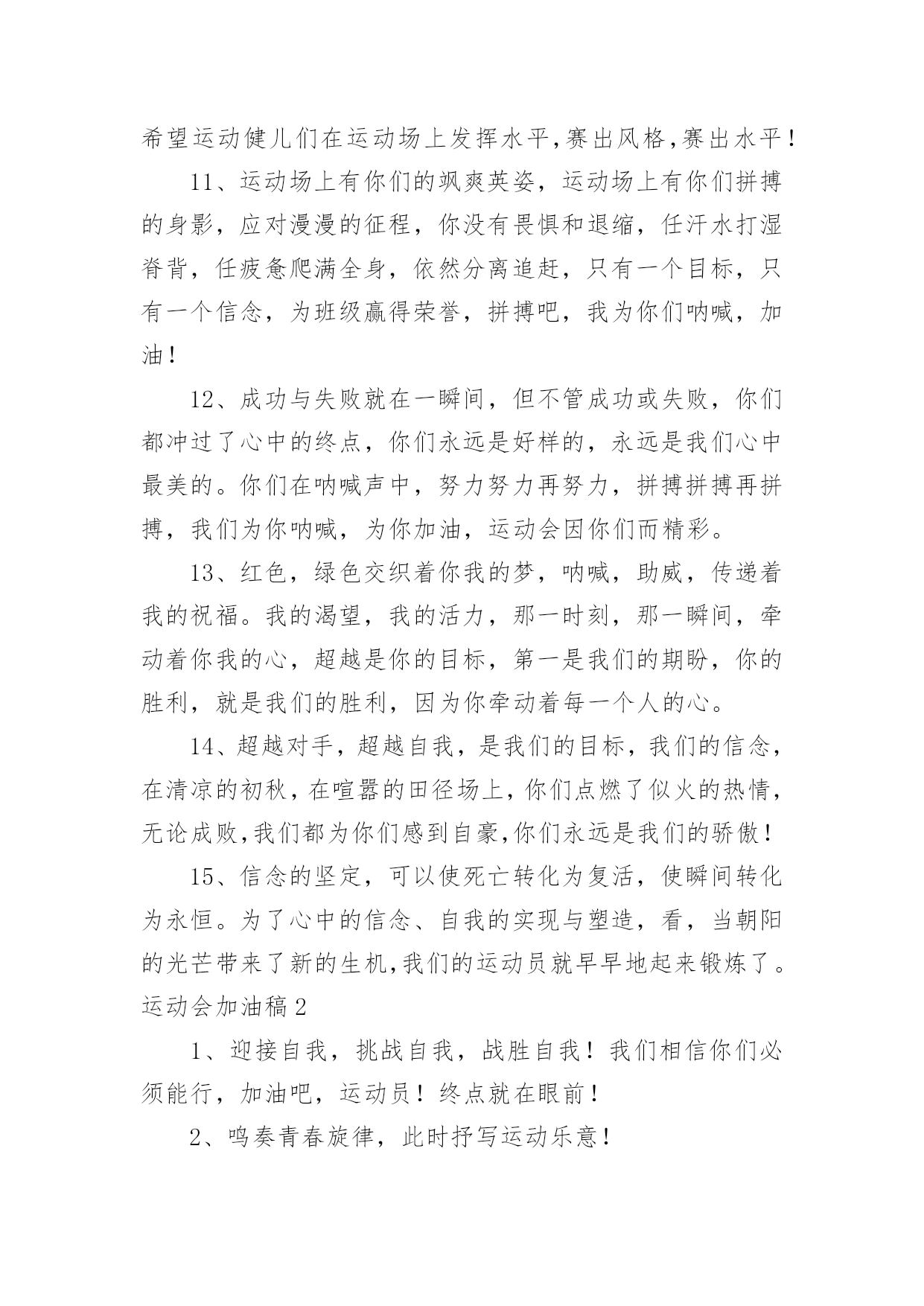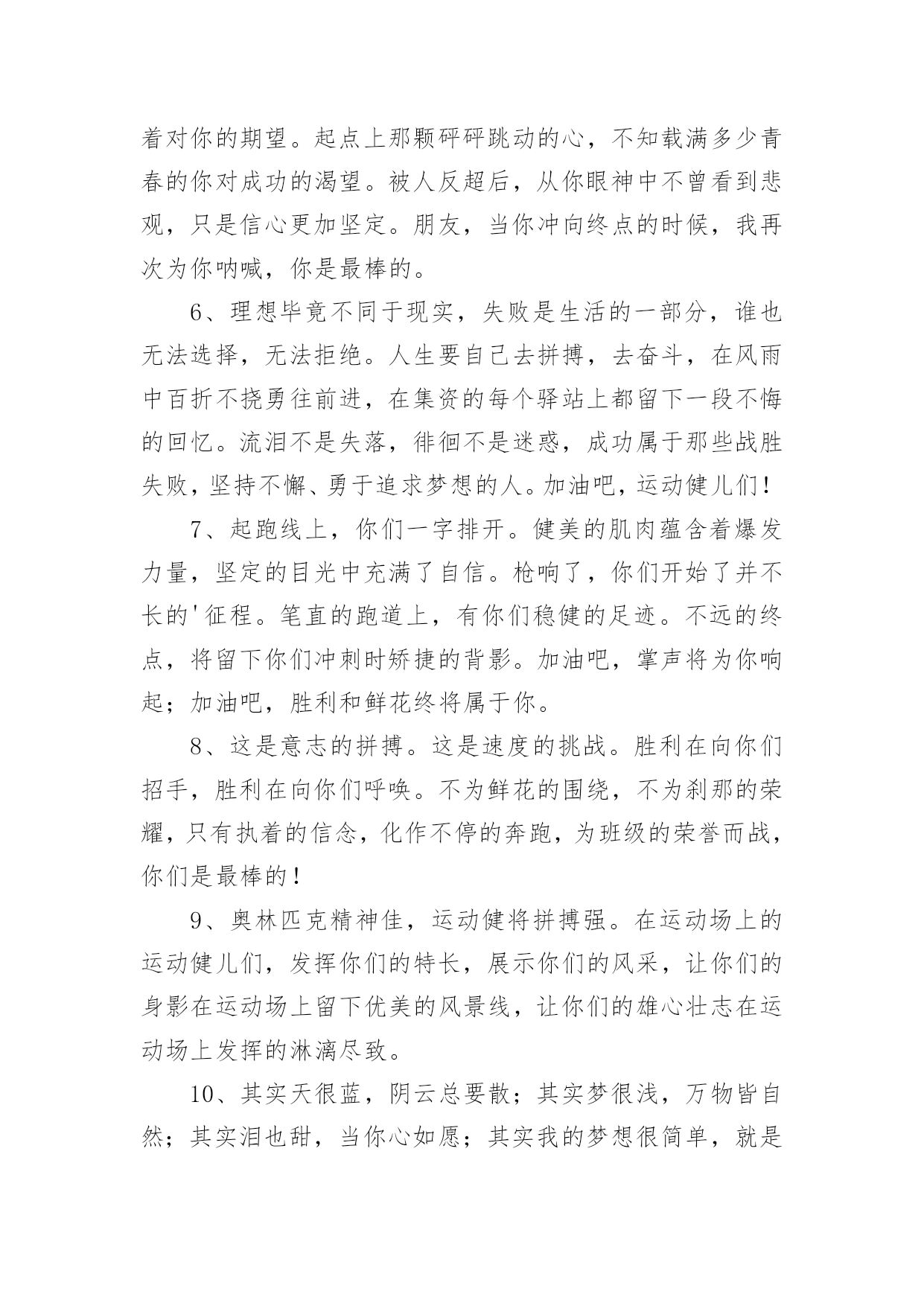 运动会加油稿运动会加油稿在日新月异的现代社会中,我们用到加油稿的地方越来越多,加油稿是鼓励激励对方的文稿。你知道加油稿怎样写才规范吗?下面是小编收集整理的运动会加油稿,希望对大家有所帮助。运动会加油稿11、秋阳普照大地,那攒动的人群在呐喊声与歌声中意气风发,那奔跑的身影融入秋日的阳光,青春的阳光在悄悄地流淌,流淌在那鼓声里,流淌在那奔跑的脚步里,流淌在那发令枪的声响里,生命浸润在阳光中。2、不长不短的距离,需要的是全身心全程投入,自始至终你们都在拼全力此时此刻,你们处在最风光的一刻,无论第几坚持胜利的信心,只要跑下来,你们就是英雄!3、坚定,执着,耐力与希望,在延伸的白色跑道中点点凝聚!力量,信念,拼搏与奋斗,在遥远的终点线上渐渐明亮!时代的强音正在你的脚下踏响。4、踏上跑道,是一种选择。离开起点,是一种勇气。驰骋赛场,是一种胜利。运动健将们,用你的实力,用你的精神,去开拓出,一片属于你的长跑天地!5、长长跑道上是你眼神望去的方向,身后的呐喊表示着对你的期望。起点上那颗砰砰跳动的心,不知载满多少青春的你对成功的渴望。被人反超后,从你眼神中不曾看到悲观,只是信心更加坚定。朋友,当你冲向终点的时候,我再次为你呐喊,你是最棒的。6、理想毕竟不同于现实,失败是生活的一部分,谁也无法选择,无法拒绝。人生要自己去拼搏,去奋斗,在风雨中百折不挠勇往前进,在集资的每个驿站上都留下一段不悔的回忆。流泪不是失落,徘徊不是迷惑,成功属于那些战胜失败,坚持不懈、勇于追求梦想的人。加油吧,运动健儿们!7、起跑线上,你们一字排开。健美的肌肉蕴含着爆发力量,坚定的目光中充满了自信。枪响了,你们开始了并不长的'征程。笔直的跑道上,有你们稳健的足迹。不远的终点,将留下你们冲刺时矫捷的背影。加油吧,掌声将为你响起;加油吧,胜利和鲜花终将属于你。8、这是意志的拼搏。这是速度的挑战。胜利在向你们招手,胜利在向你们呼唤。不为鲜花的围绕,不为刹那的荣耀,只有执着的信念,化作不停的奔跑,为班级的荣誉而战,你们是最棒的!9、奥林匹克精神佳,运动健将拼搏强。在运动场上的运动健儿们,发挥你们的特长,展示你们的风采,让你们的身影在运动场上留下优美的风景线,让你们的雄心壮志在运动场上发挥的淋漓尽致。10、其实天很蓝,阴云总要散;其实梦很浅,万物皆自然;其实泪也甜,当你心如愿;其实我的梦想很简单,就是希望运动健儿们在运动场上发挥水平,赛出风格,赛出水平!11、运动场上有你们的飒爽英姿,运动场上有你们拼搏的身影,应对漫漫的征程,你没有畏惧和退缩,任汗水打湿脊背,任疲惫爬满全身,依然分离追赶,只有一个目标,只有一个信念,为班级赢得荣誉,拼搏吧,我为你们呐喊,加油!12、成功与失败就在一瞬间,但不管成功或失败,你们都冲过了心中的终点,你们永远是好样的,永远是我们心中最美的。你们在呐喊声中,努力努力再努力,拼搏拼搏再拼搏,我们为你呐喊,为你加油,运动会因你们而精彩。13、红色,绿色交织着你我的梦,呐喊,助威,传递着我的祝福。我的渴望,我的活力,那一时刻,那一瞬间,牵动着你我的心,超越是你的目标,第一是我们的期盼,你的胜利,就是我们的胜利,因为你牵动着每一个人的心。14、超越对手,超越自我,是我们的目标,我们的信念,在清凉的初秋,在喧嚣的田径场上,你们点燃了似火的热情,无论成败,我们都为你们感到自豪,你们永远是我们的骄傲!15、信念的坚定,可以使死亡转化为复活,使瞬间转化为永恒。为了心中的信念、自我的实现与塑造,看,当朝阳的光芒带来了新的生机,我们的运动员就早早地起来锻炼了。运动会加油稿21、迎接自我,挑战自我,战胜自我!我们相信你们必须能行,加油吧,运动员!终点就在眼前!2、鸣奏青春旋律,此时抒写运动乐意!3、让我们一起高呼:我们能行我们能赢!4、有多少次挥汗如雨,伤痛曾添满记忆。总在鼓舞自己,要成功就得努力。5、广阔的绿茵场,是为你们搭建的舞台。张扬吧,年轻的心,我们将为你永远喝彩!6、人类需要体育,然而世界向往和和平!7、这是意志的拼搏。这是速度的挑战。胜利在向你们招手胜利在向你们呼唤。8、论何成功,谈何荣辱,心中的信念只有一个:拼搏!9、充满信心,就有希望!加油!10、迎着朝阳,你们踏歌而去,背着希望,我们等待你们的归来。11、年轻的我们自信飞扬,青春的气息如同出生的朝阳,蓬勃的力量如同阳光的挥洒。12、亲爱的健儿们,向前冲!我们在为你鼓掌。13、琴心剑胆,稳如泰山,卓越非凡,光耀我班。14、加油吧,你们的肌肉爆发着力量,你们的.目光充满着自信,相信,胜利就在前方。15、时间在流逝,赛道在延伸,这是速度的挑战。胜利在向你们招手/胜利在向你们呼唤!16、不为掌声的注释,不为刻意的征服,不为失败的痛苦,仅有辛勤的汗水化作成功的脚步!运动会加油稿3运动会前加油稿一枪声伴你踏上征程,你昂着