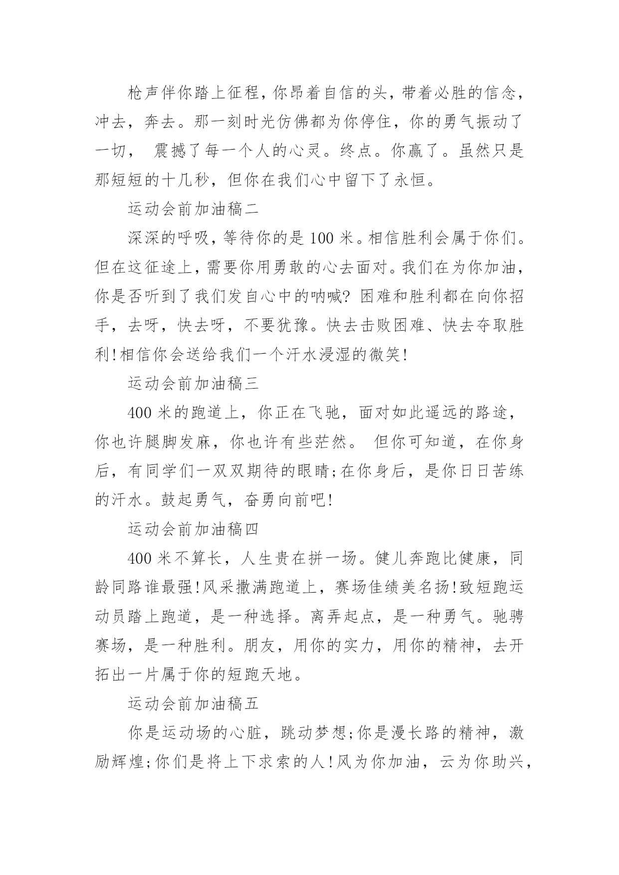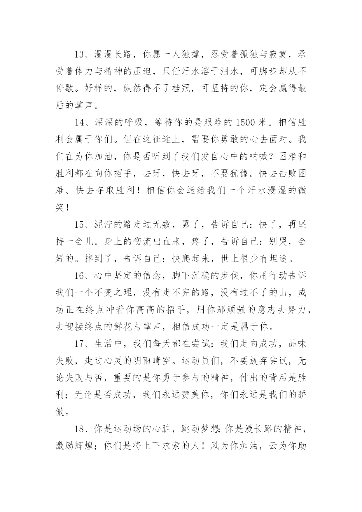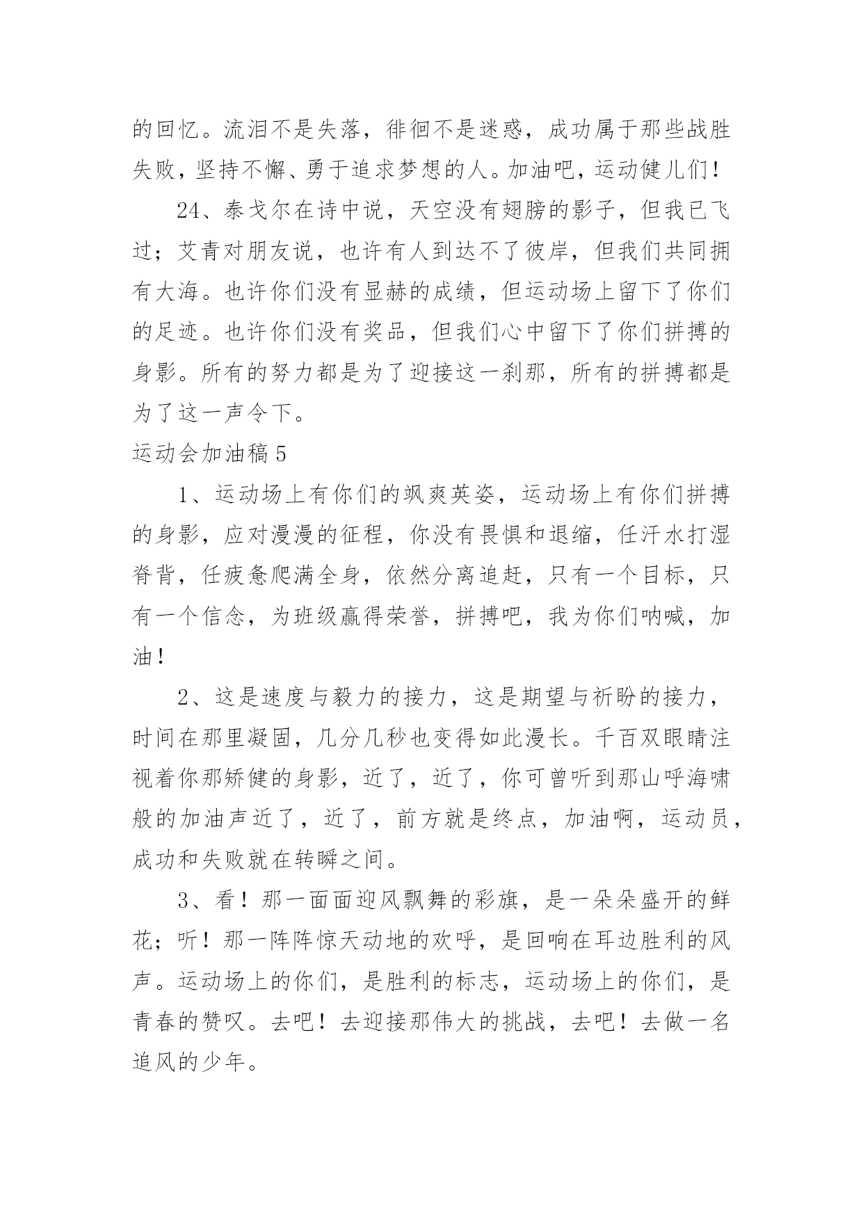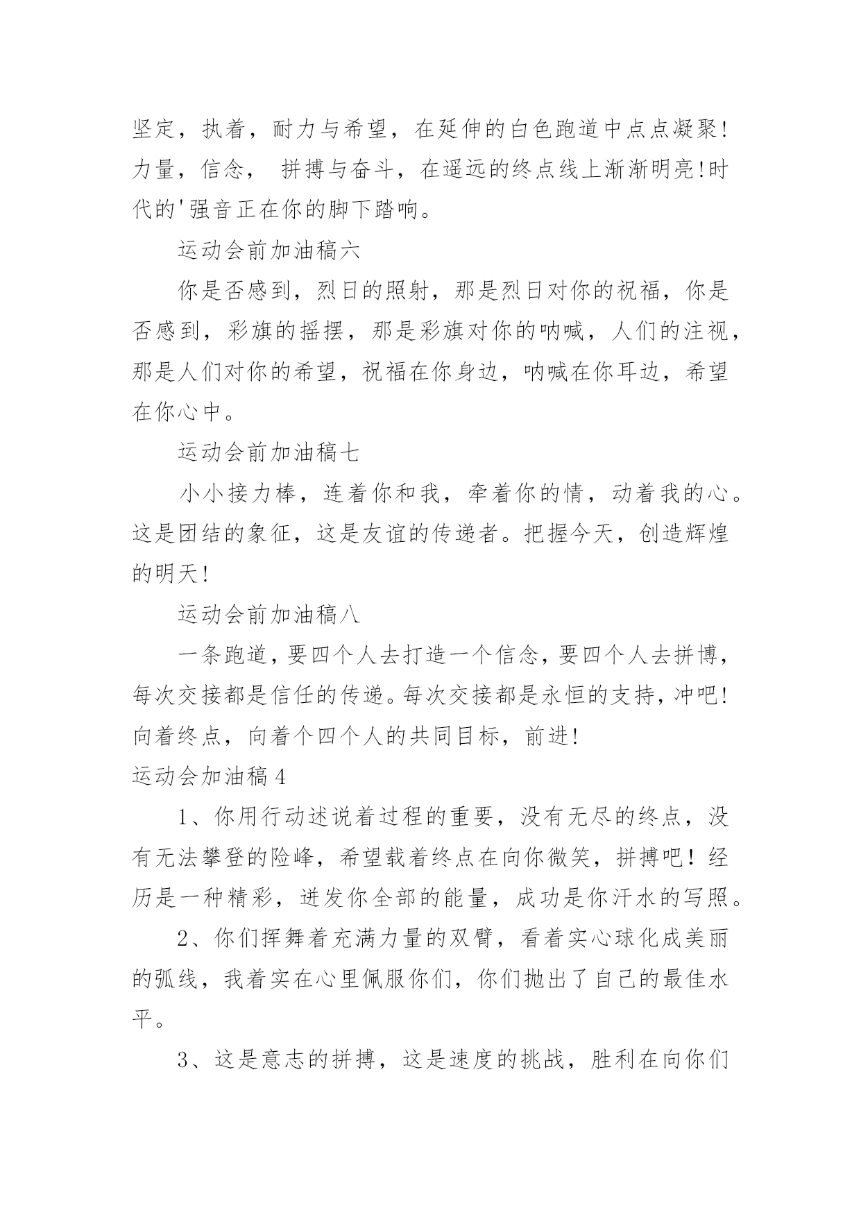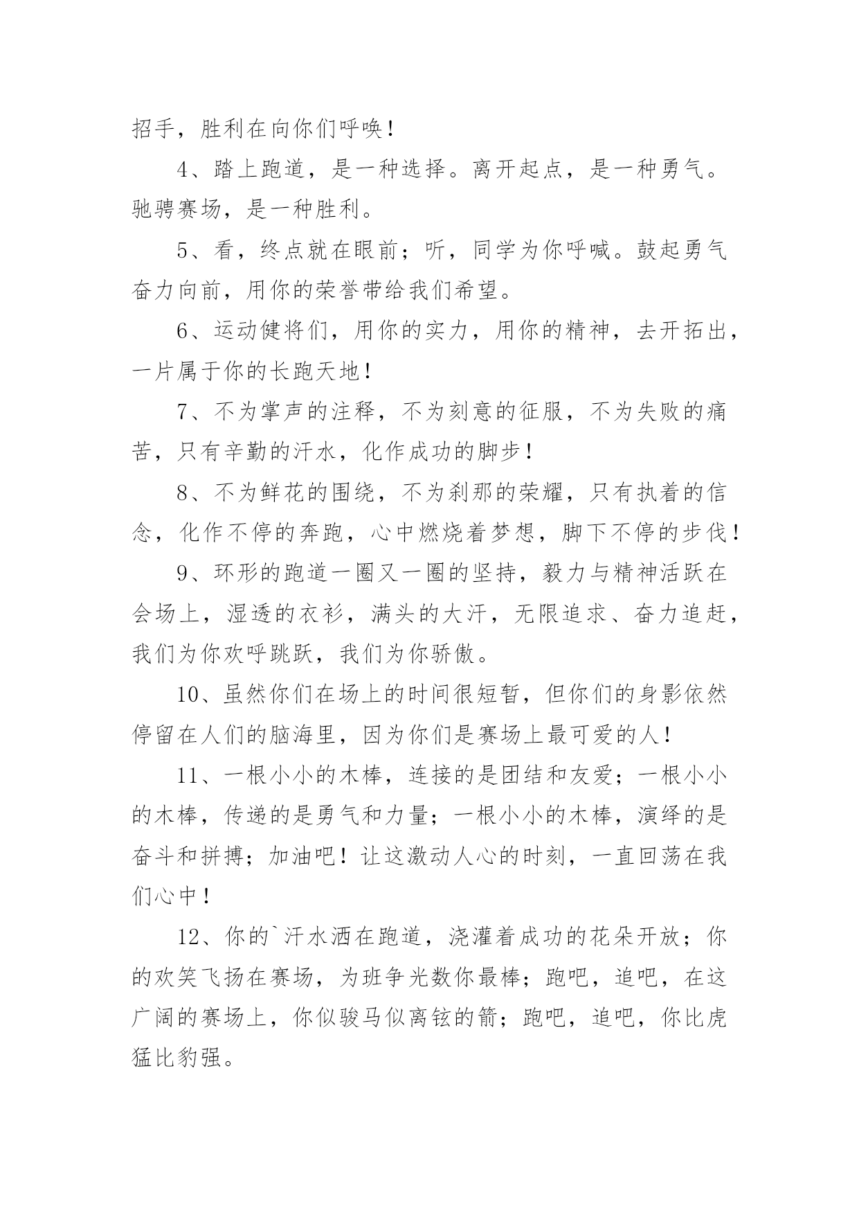 运动会加油稿运动会加油稿在日新月异的现代社会中,我们用到加油稿的地方越来越多,加油稿是鼓励激励对方的文稿。你知道加油稿怎样写才规范吗?下面是小编收集整理的运动会加油稿,希望对大家有所帮助。运动会加油稿11、秋阳普照大地,那攒动的人群在呐喊声与歌声中意气风发,那奔跑的身影融入秋日的阳光,青春的阳光在悄悄地流淌,流淌在那鼓声里,流淌在那奔跑的脚步里,流淌在那发令枪的声响里,生命浸润在阳光中。2、不长不短的距离,需要的是全身心全程投入,自始至终你们都在拼全力此时此刻,你们处在最风光的一刻,无论第几坚持胜利的信心,只要跑下来,你们就是英雄!3、坚定,执着,耐力与希望,在延伸的白色跑道中点点凝聚!力量,信念,拼搏与奋斗,在遥远的终点线上渐渐明亮!时代的强音正在你的脚下踏响。4、踏上跑道,是一种选择。离开起点,是一种勇气。驰骋赛场,是一种胜利。运动健将们,用你的实力,用你的精神,去开拓出,一片属于你的长跑天地!5、长长跑道上是你眼神望去的方向,身后的呐喊表示着对你的期望。起点上那颗砰砰跳动的心,不知载满多少青春的你对成功的渴望。被人反超后,从你眼神中不曾看到悲观,只是信心更加坚定。朋友,当你冲向终点的时候,我再次为你呐喊,你是最棒的。6、理想毕竟不同于现实,失败是生活的一部分,谁也无法选择,无法拒绝。人生要自己去拼搏,去奋斗,在风雨中百折不挠勇往前进,在集资的每个驿站上都留下一段不悔的回忆。流泪不是失落,徘徊不是迷惑,成功属于那些战胜失败,坚持不懈、勇于追求梦想的人。加油吧,运动健儿们!7、起跑线上,你们一字排开。健美的肌肉蕴含着爆发力量,坚定的目光中充满了自信。枪响了,你们开始了并不长的'征程。笔直的跑道上,有你们稳健的足迹。不远的终点,将留下你们冲刺时矫捷的背影。加油吧,掌声将为你响起;加油吧,胜利和鲜花终将属于你。8、这是意志的拼搏。这是速度的挑战。胜利在向你们招手,胜利在向你们呼唤。不为鲜花的围绕,不为刹那的荣耀,只有执着的信念,化作不停的奔跑,为班级的荣誉而战,你们是最棒的!9、奥林匹克精神佳,运动健将拼搏强。在运动场上的运动健儿们,发挥你们的特长,展示你们的风采,让你们的身影在运动场上留下优美的风景线,让你们的雄心壮志在运动场上发挥的淋漓尽致。10、其实天很蓝,阴云总要散;其实梦很浅,万物皆自然;其实泪也甜,当你心如愿;其实我的梦想很简单,就是希望运动健儿们在运动场上发挥水平,赛出风格,赛出水平!11、运动场上有你们的飒爽英姿,运动场上有你们拼搏的身影,应对漫漫的征程,你没有畏惧和退缩,任汗水打湿脊背,任疲惫爬满全身,依然分离追赶,只有一个目标,只有一个信念,为班级赢得荣誉,拼搏吧,我为你们呐喊,加油!12、成功与失败就在一瞬间,但不管成功或失败,你们都冲过了心中的终点,你们永远是好样的,永远是我们心中最美的。你们在呐喊声中,努力努力再努力,拼搏拼搏再拼搏,我们为你呐喊,为你加油,运动会因你们而精彩。13、红色,绿色交织着你我的梦,呐喊,助威,传递着我的祝福。我的渴望,我的活力,那一时刻,那一瞬间,牵动着你我的心,超越是你的目标,第一是我们的期盼,你的胜利,就是我们的胜利,因为你牵动着每一个人的心。14、超越对手,超越自我,是我们的目标,我们的信念,在清凉的初秋,在喧嚣的田径场上,你们点燃了似火的热情,无论成败,我们都为你们感到自豪,你们永远是我们的骄傲!15、信念的坚定,可以使死亡转化为复活,使瞬间转化为永恒。为了心中的信念、自我的实现与塑造,看,当朝阳的光芒带来了新的生机,我们的运动员就早早地起来锻炼了。运动会加油稿21、迎接自我,挑战自我,战胜自我!我们相信你们必须能行,加油吧,运动员!终点就在眼前!2、鸣奏青春旋律,此时抒写运动乐意!3、让我们一起高呼:我们能行我们能赢!4、有多少次挥汗如雨,伤痛曾添满记忆。总在鼓舞自己,要成功就得努力。5、广阔的绿茵场,是为你们搭建的舞台。张扬吧,年轻的心,我们将为你永远喝彩!6、人类需要体育,然而世界向往和和平!7、这是意志的拼搏。这是速度的挑战。胜利在向你们招手胜利在向你们呼唤。8、论何成功,谈何荣辱,心中的信念只有一个:拼搏!9、充满信心,就有希望!加油!10、迎着朝阳,你们踏歌而去,背着希望,我们等待你们的归来。11、年轻的我们自信飞扬,青春的气息如同出生的朝阳,蓬勃的力量如同阳光的挥洒。12、亲爱的健儿们,向前冲!我们在为你鼓掌。13、琴心剑胆,稳如泰山,卓越非凡,光耀我班。14、加油吧,你们的肌肉爆发着力量,你们的.目光充满着自信,相信,胜利就在前方。15、时间在流逝,赛道在延伸,这是速度的挑战。胜利在向你们招手/胜利在向你们呼唤!16、不为掌声的注释,不为刻意的征服,不为失败的痛苦,仅有辛勤的汗水化作成功的脚步!运动会加油稿3运动会前加油稿一枪声伴你踏上征程,你昂着