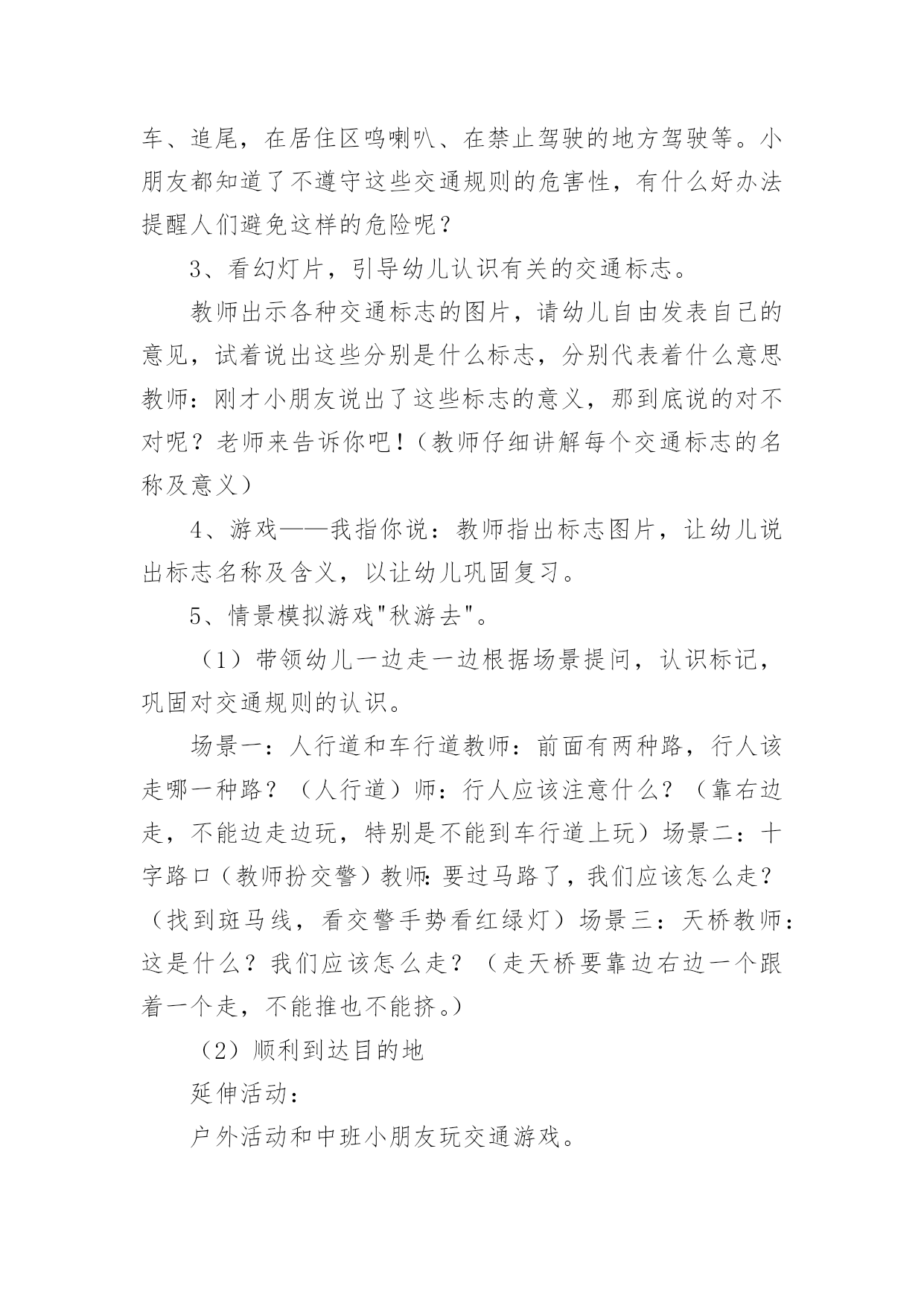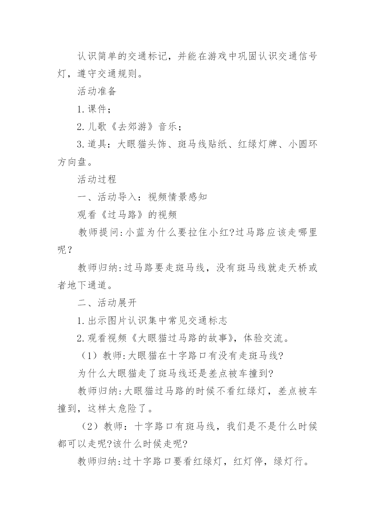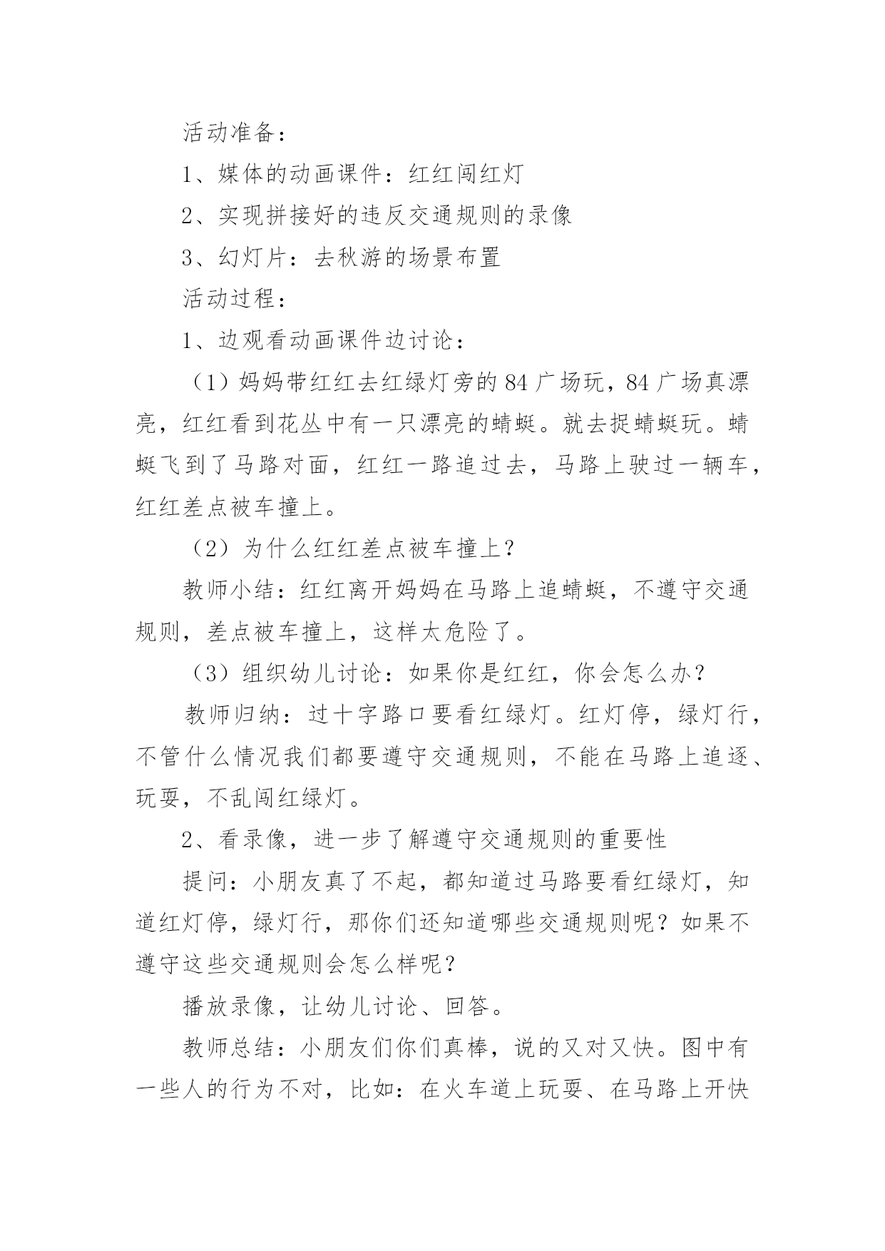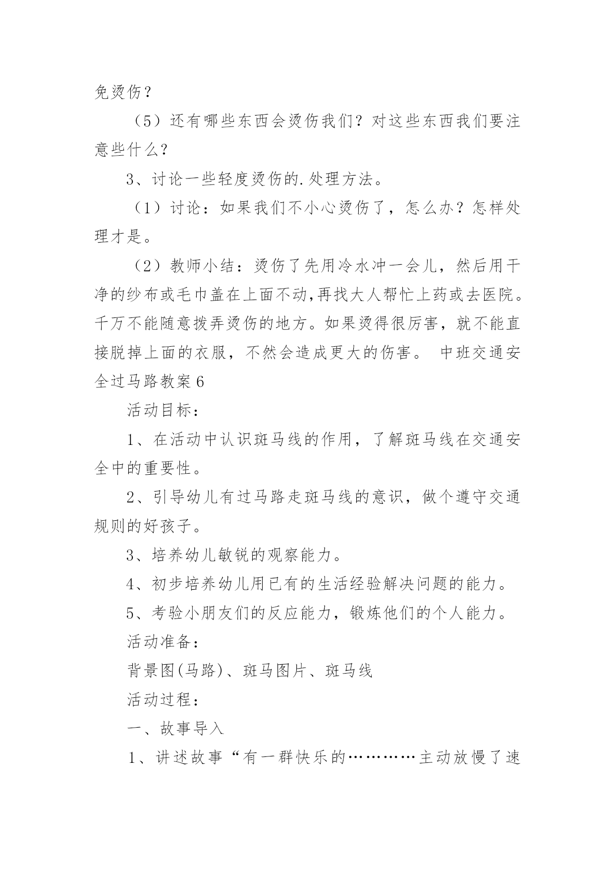 中班教案《交通安全》作为一位无私奉献的人民教师,有必要进行细致的教案准备工作,借助教案可以更好地组织教学活动。那么大家知道正规的教案是怎么写的吗?下面是小编收集整理的中班教案《交通安全》,欢迎阅读,希望大家能够喜欢。中班教案《交通安全》1设计意图:安全教育是幼儿教育的重中之重,城市交通的不断发展促使我们必须加强对幼儿的交通安全教育,幼儿园传统的课堂教育枯燥,单调,大大的制约了课堂效果。我充分利用多媒体现代教育技术的动画效果好,游戏气氛浓,形象直观的特点,选择了幼儿比较熟悉的生活场景,设计了这节安全教育课,使孩子们在自然,宽松,和谐的.气氛中学习,认识交通标志,掌握一些必要的交通规则,懂得了如何保护自己。活动目标:1、引导幼儿初步了解必须遵守的交通规则,形成初步的安全意识与自我保护意识,提高自我保护能力。2、认识常见的交通标志,了解标志的作用和特征,培养幼儿的规则意识。3、发展幼儿的观察力,思维力及口语表达能力4、帮助幼儿初步建立自我防范和自我保护的意识。5、考验小朋友们的反应能力,锻炼他们的个人能力。活动准备:1、媒体的动画课件:红红闯红灯2、实现拼接好的违反交通规则的录像3、幻灯片:去秋游的场景布置活动过程:1、边观看动画课件边讨论:(1)妈妈带红红去红绿灯旁的84广场玩,84广场真漂亮,红红看到花丛中有一只漂亮的蜻蜓。就去捉蜻蜓玩。蜻蜓飞到了马路对面,红红一路追过去,马路上驶过一辆车,红红差点被车撞上。(2)为什么红红差点被车撞上?教师小结:红红离开妈妈在马路上追蜻蜓,不遵守交通规则,差点被车撞上,这样太危险了。(3)组织幼儿讨论:如果你是红红,你会怎么办?教师归纳:过十字路口要看红绿灯。红灯停,绿灯行,不管什么情况我们都要遵守交通规则,不能在马路上追逐、玩耍,不乱闯红绿灯。2、看录像,进一步了解遵守交通规则的重要性提问:小朋友真了不起,都知道过马路要看红绿灯,知道红灯停,绿灯行,那你们还知道哪些交通规则呢?如果不遵守这些交通规则会怎么样呢?播放录像,让幼儿讨论、回答。教师总结:小朋友们你们真棒,说的又对又快。图中有一些人的行为不对,比如:在火车道上玩耍、在马路上开快车、追尾,在居住区鸣喇叭、在禁止驾驶的地方驾驶等。小朋友都知道了不遵守这些交通规则的危害性,有什么好办法提醒人们避免这样的危险呢?3、看幻灯片,引导幼儿认识有关的交通标志。教师出示各种交通标志的图片,请幼儿自由发表自己的意见,试着说出这些分别是什么标志,分别代表着什么意思教师:刚才小朋友说出了这些标志的意义,那到底说的对不对呢?老师来告诉你吧!(教师仔细讲解每个交通标志的名称及意义)4、游戏——我指你说:教师指出标志图片,让幼儿说出标志名称及含义,以让幼儿巩固复习。5、情景模拟游戏"秋游去"。(1)带领幼儿一边走一边根据场景提问,认识标记,巩固对交通规则的认识。场景一:人行道和车行道教师:前面有两种路,行人该走哪一种路?(人行道)师:行人应该注意什么?(靠右边走,不能边走边玩,特别是不能到车行道上玩)场景二:十字路口(教师扮交警)教师:要过马路了,我们应该怎么走?(找到斑马线,看交警手势看红绿灯)场景三:天桥教师:这是什么?我们应该怎么走?(走天桥要靠边右边一个跟着一个走,不能推也不能挤。)(2)顺利到达目的地延伸活动:户外活动和中班小朋友玩交通游戏。中班教案《交通安全》2活动目标:1、初步了解烫伤对身体的危害。2、了解简单的预防和自救的方法。3、加强幼儿的安全意识。4、初步培养幼儿用已有的生活经验解决问题的能力。5、培养幼儿敏锐的观察能力。活动准备:1、收集皮肤烫伤的各种图片。2、收集容易造成烫伤的高温设备图片。活动过程:1、出示皮肤烫伤的各种图片,了解烫伤对身体的危害。(1)这些图片上的人怎么啦?他们怎么会这样的?你被烫伤过吗?(2)教师小结:这些人都是因为自己或别人大意把自己烫伤了,烫伤后有时会留下很难看的疤痕,有时会对自己的生活也带来不利的影响。2、讨论生活中哪些东西会烫伤我们?(1)哪些东西会烫伤我们?(2)这些东西会怎么会把我们烫伤的?怎样做才能避免烫伤?(3)幼儿园哪些东西可能会烫伤我们?(4)这些东西会怎么会把我们烫伤的?怎样做才能避免烫伤?(5)还有哪些东西会烫伤我们?对这些东西我们要注意些什么?3、讨论一些轻度烫伤的.处理方法。(1)讨论:如果我们不小心烫伤了,怎么办?怎样处理才是。(2)教师小结:烫伤了先用冷水冲一会儿,然后用干净的纱布或毛巾盖在上面不动,再找大人帮忙上药或去医院。千万不能随意拨弄烫伤的地方。如果烫得很厉害,就不能直接脱掉上面的衣服,不然会造成更大的伤害。中班交通安全过马路教案6活动目标:1、在活动中认识斑马线的作用,了解斑马线在交通安全中的重要性。2、引导幼儿有过马路走斑马线的意识,做个遵守交通规则的好孩子。3、培养