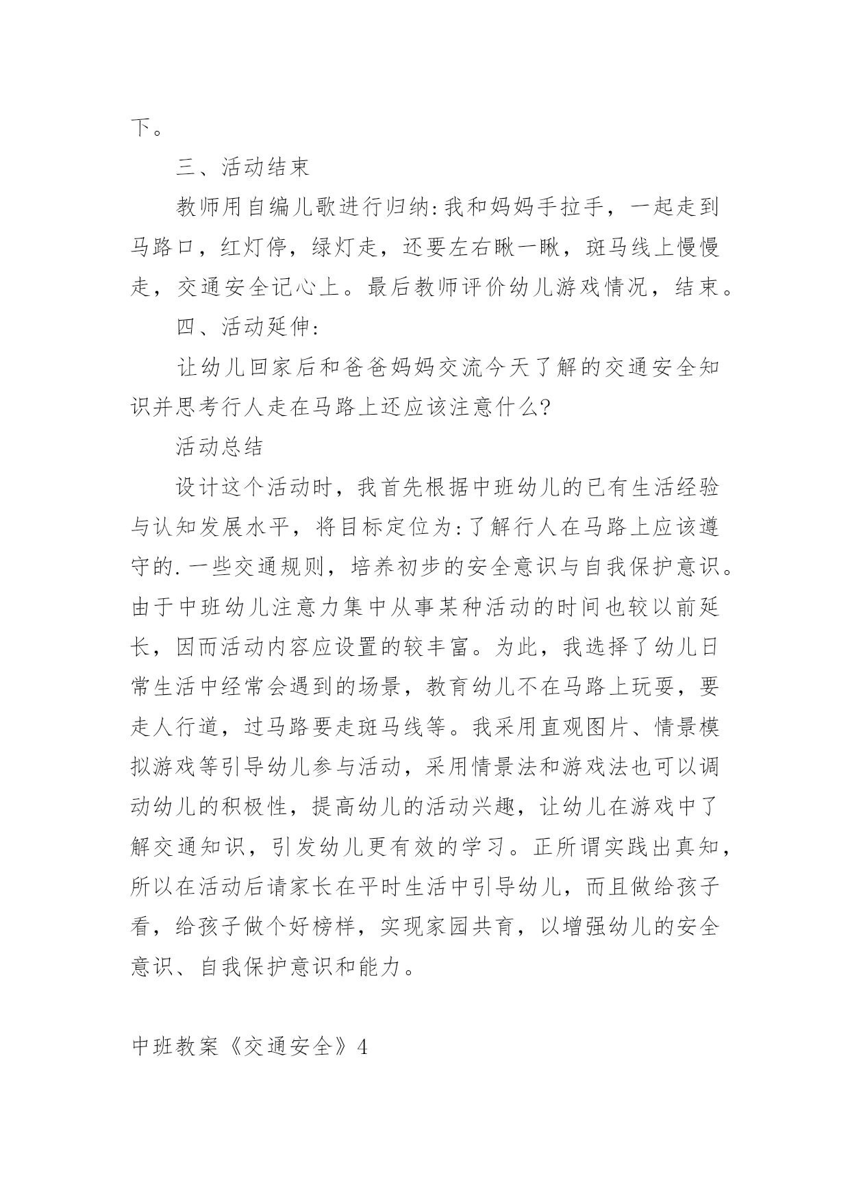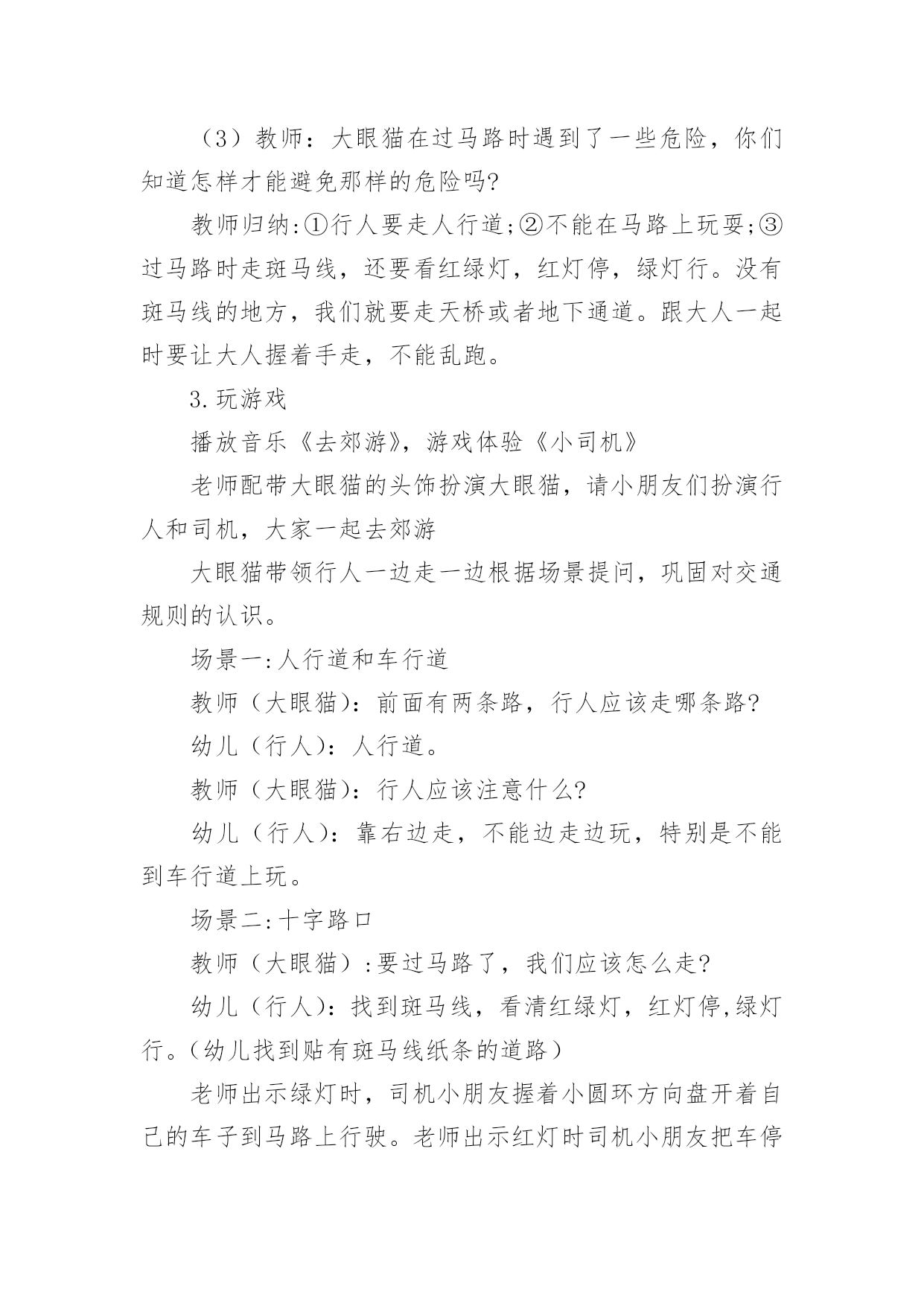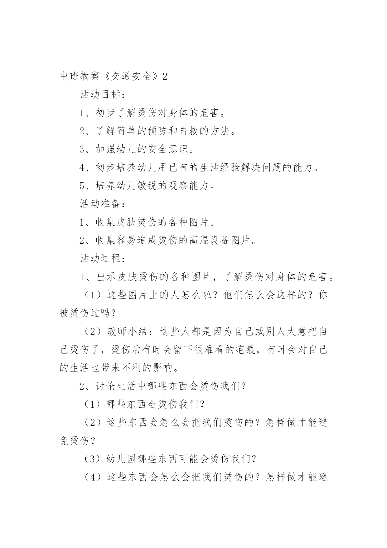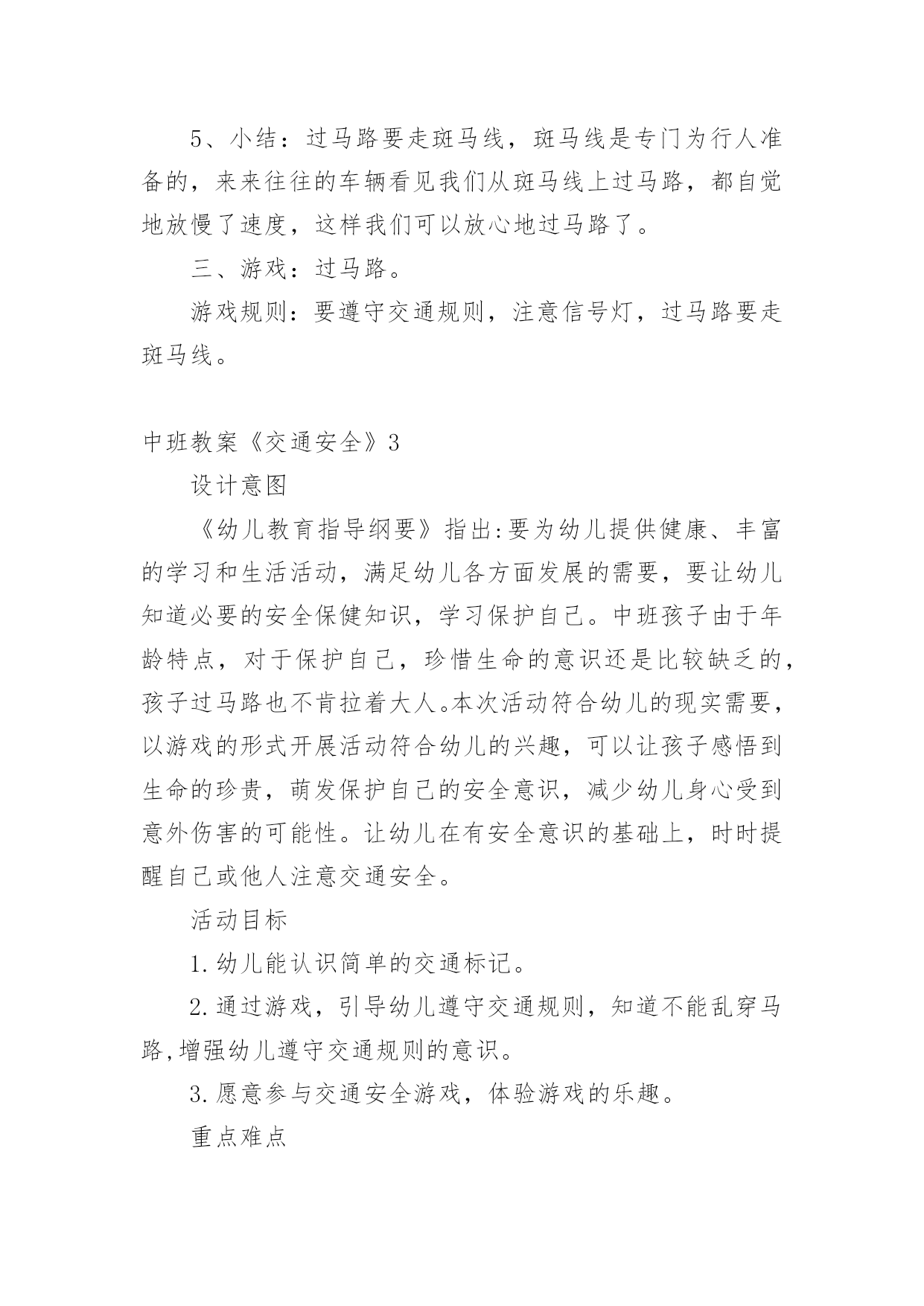 中班教案《交通安全》作为一位无私奉献的人民教师,有必要进行细致的教案准备工作,借助教案可以更好地组织教学活动。那么大家知道正规的教案是怎么写的吗?下面是小编收集整理的中班教案《交通安全》,欢迎阅读,希望大家能够喜欢。中班教案《交通安全》1设计意图:安全教育是幼儿教育的重中之重,城市交通的不断发展促使我们必须加强对幼儿的交通安全教育,幼儿园传统的课堂教育枯燥,单调,大大的制约了课堂效果。我充分利用多媒体现代教育技术的动画效果好,游戏气氛浓,形象直观的特点,选择了幼儿比较熟悉的生活场景,设计了这节安全教育课,使孩子们在自然,宽松,和谐的.气氛中学习,认识交通标志,掌握一些必要的交通规则,懂得了如何保护自己。活动目标:1、引导幼儿初步了解必须遵守的交通规则,形成初步的安全意识与自我保护意识,提高自我保护能力。2、认识常见的交通标志,了解标志的作用和特征,培养幼儿的规则意识。3、发展幼儿的观察力,思维力及口语表达能力4、帮助幼儿初步建立自我防范和自我保护的意识。5、考验小朋友们的反应能力,锻炼他们的个人能力。活动准备:1、媒体的动画课件:红红闯红灯2、实现拼接好的违反交通规则的录像3、幻灯片:去秋游的场景布置活动过程:1、边观看动画课件边讨论:(1)妈妈带红红去红绿灯旁的84广场玩,84广场真漂亮,红红看到花丛中有一只漂亮的蜻蜓。就去捉蜻蜓玩。蜻蜓飞到了马路对面,红红一路追过去,马路上驶过一辆车,红红差点被车撞上。(2)为什么红红差点被车撞上?教师小结:红红离开妈妈在马路上追蜻蜓,不遵守交通规则,差点被车撞上,这样太危险了。(3)组织幼儿讨论:如果你是红红,你会怎么办?教师归纳:过十字路口要看红绿灯。红灯停,绿灯行,不管什么情况我们都要遵守交通规则,不能在马路上追逐、玩耍,不乱闯红绿灯。2、看录像,进一步了解遵守交通规则的重要性提问:小朋友真了不起,都知道过马路要看红绿灯,知道红灯停,绿灯行,那你们还知道哪些交通规则呢?如果不遵守这些交通规则会怎么样呢?播放录像,让幼儿讨论、回答。教师总结:小朋友们你们真棒,说的又对又快。图中有一些人的行为不对,比如:在火车道上玩耍、在马路上开快车、追尾,在居住区鸣喇叭、在禁止驾驶的地方驾驶等。小朋友都知道了不遵守这些交通规则的危害性,有什么好办法提醒人们避免这样的危险呢?3、看幻灯片,引导幼儿认识有关的交通标志。教师出示各种交通标志的图片,请幼儿自由发表自己的意见,试着说出这些分别是什么标志,分别代表着什么意思教师:刚才小朋友说出了这些标志的意义,那到底说的对不对呢?老师来告诉你吧!(教师仔细讲解每个交通标志的名称及意义)4、游戏——我指你说:教师指出标志图片,让幼儿说出标志名称及含义,以让幼儿巩固复习。5、情景模拟游戏"秋游去"。(1)带领幼儿一边走一边根据场景提问,认识标记,巩固对交通规则的认识。场景一:人行道和车行道教师:前面有两种路,行人该走哪一种路?(人行道)师:行人应该注意什么?(靠右边走,不能边走边玩,特别是不能到车行道上玩)场景二:十字路口(教师扮交警)教师:要过马路了,我们应该怎么走?(找到斑马线,看交警手势看红绿灯)场景三:天桥教师:这是什么?我们应该怎么走?(走天桥要靠边右边一个跟着一个走,不能推也不能挤。)(2)顺利到达目的地延伸活动:户外活动和中班小朋友玩交通游戏。中班教案《交通安全》2活动目标:1、初步了解烫伤对身体的危害。2、了解简单的预防和自救的方法。3、加强幼儿的安全意识。4、初步培养幼儿用已有的生活经验解决问题的能力。5、培养幼儿敏锐的观察能力。活动准备:1、收集皮肤烫伤的各种图片。2、收集容易造成烫伤的高温设备图片。活动过程:1、出示皮肤烫伤的各种图片,了解烫伤对身体的危害。(1)这些图片上的人怎么啦?他们怎么会这样的?你被烫伤过吗?(2)教师小结:这些人都是因为自己或别人大意把自己烫伤了,烫伤后有时会留下很难看的疤痕,有时会对自己的生活也带来不利的影响。2、讨论生活中哪些东西会烫伤我们?(1)哪些东西会烫伤我们?(2)这些东西会怎么会把我们烫伤的?怎样做才能避免烫伤?(3)幼儿园哪些东西可能会烫伤我们?(4)这些东西会怎么会把我们烫伤的?怎样做才能避免烫伤?(5)还有哪些东西会烫伤我们?对这些东西我们要注意些什么?3、讨论一些轻度烫伤的.处理方法。(1)讨论:如果我们不小心烫伤了,怎么办?怎样处理才是。(2)教师小结:烫伤了先用冷水冲一会儿,然后用干净的纱布或毛巾盖在上面不动,再找大人帮忙上药或去医院。千万不能随意拨弄烫伤的地方。如果烫得很厉害,就不能直接脱掉上面的衣服,不然会造成更大的伤害。中班交通安全过马路教案6活动目标:1、在活动中认识斑马线的作用,了解斑马线在交通安全中的重要性。2、引导幼儿有过马路走斑马线的意识,做个遵守交通规则的好孩子。3、培养