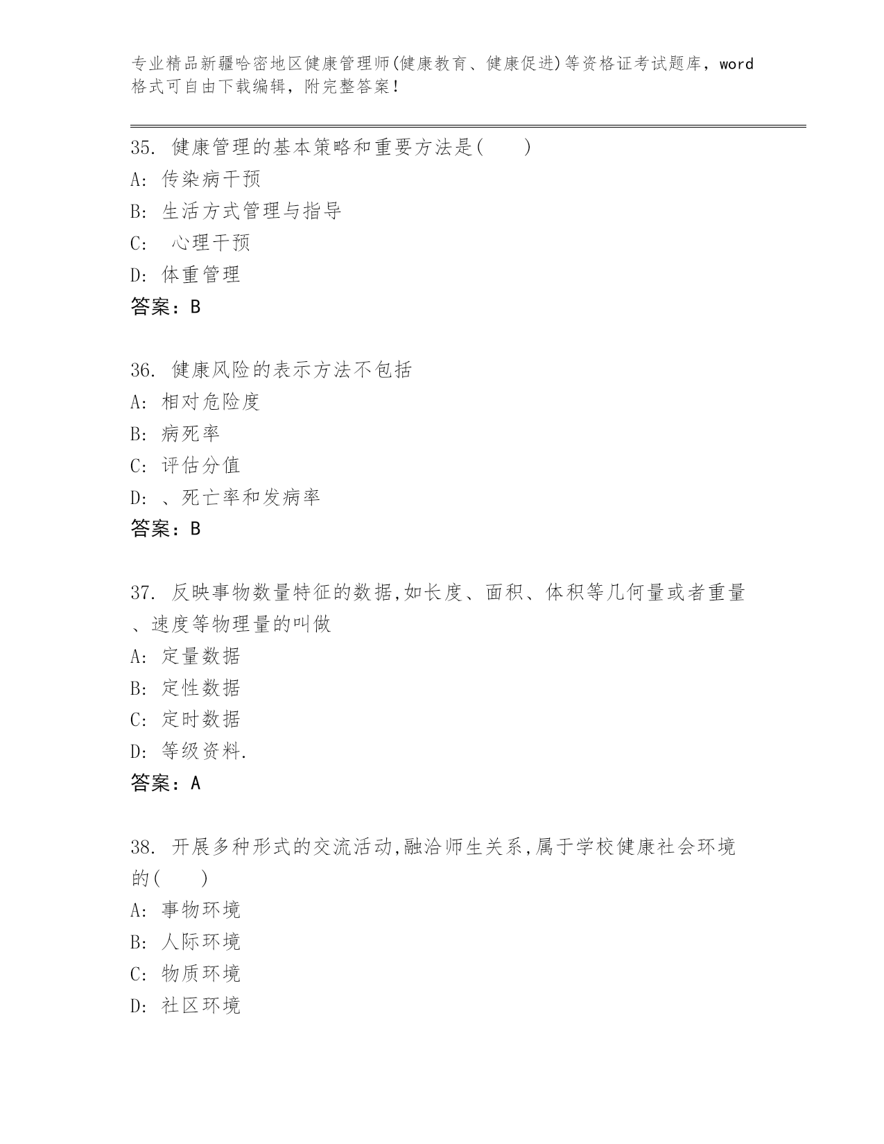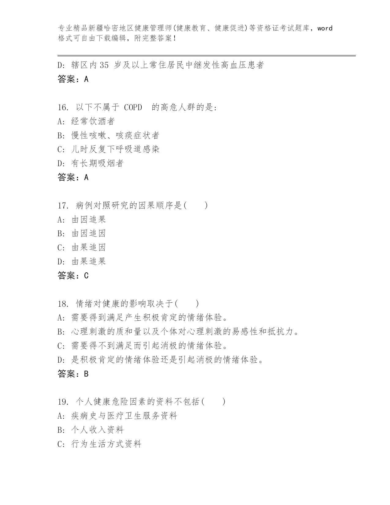 优选新疆哈密地区健康管理师(健康教育、健康促进)等资格证考试精选题库含答案(A卷)