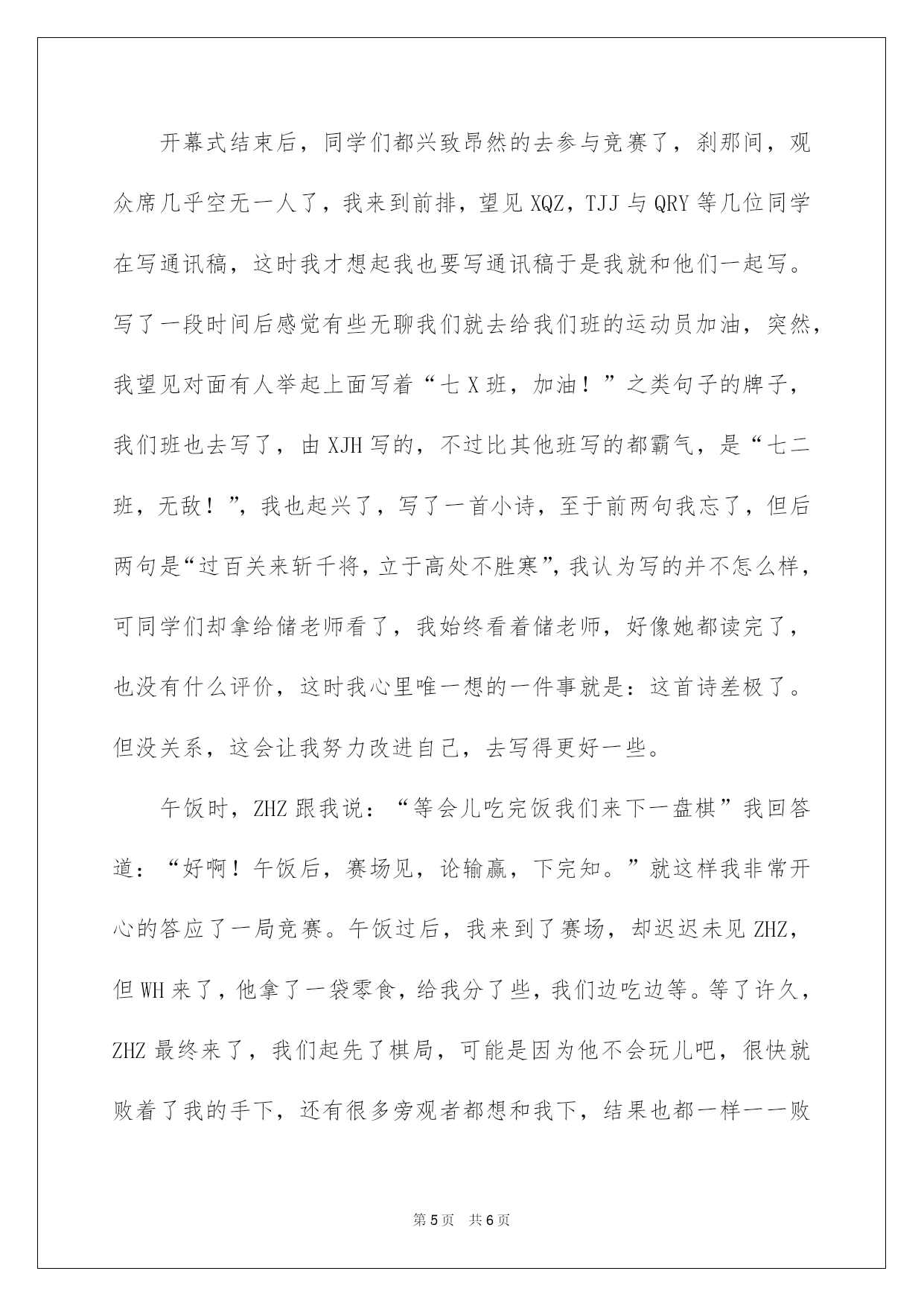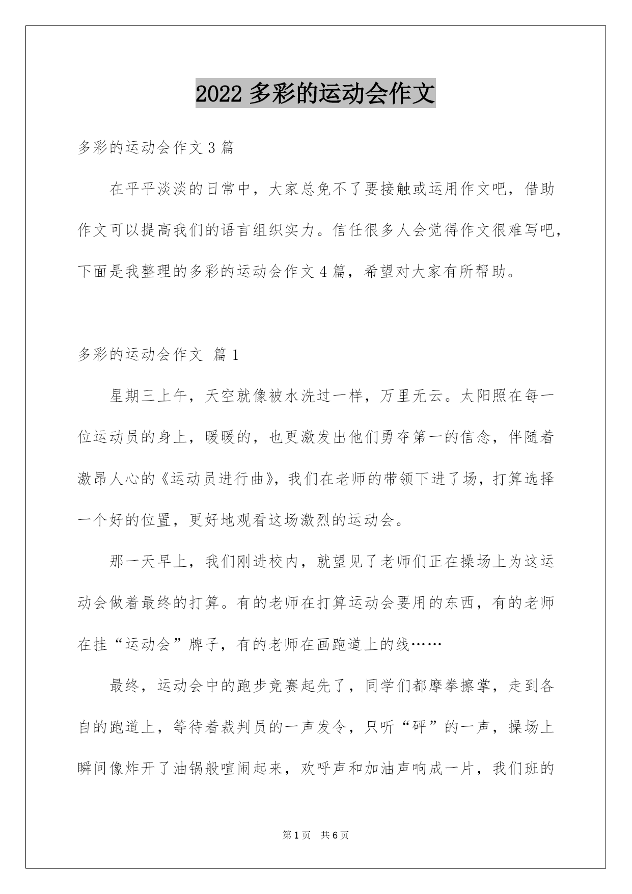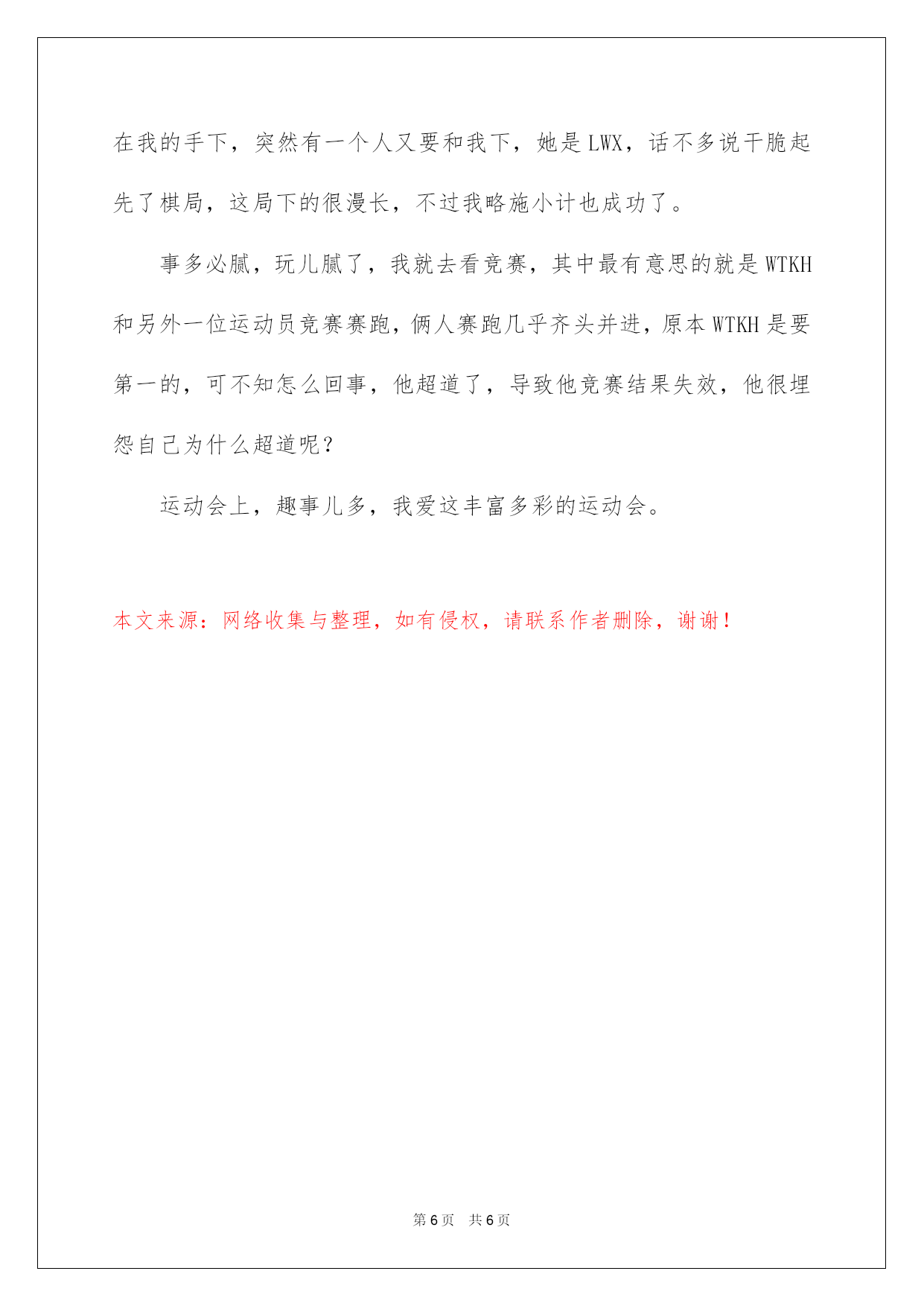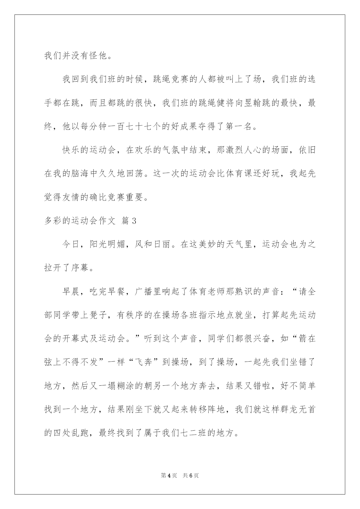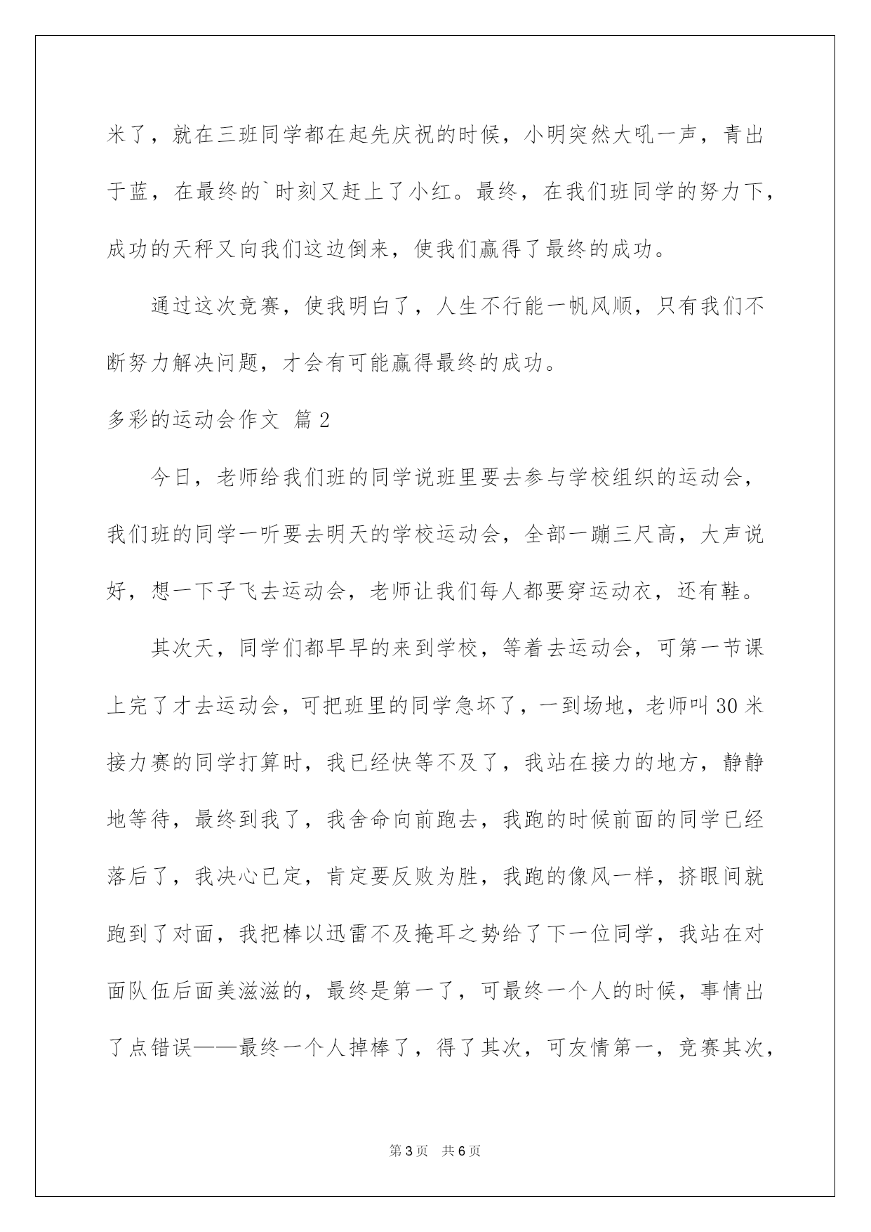 第PAGE\*Arabic\*MERGEFORMAT6页共NUMPAGES\*Arabic\*MERGEFORMAT6页第PAGE\*MERGEFORMAT6页共NUMPAGES\*MERGEFORMAT6页第PAGE\*MERGEFORMAT6页共NUMPAGES\*MERGEFORMAT6页第PAGE\*MERGEFORMAT6页共NUMPAGES\*MERGEFORMAT6页第PAGE\*MERGEFORMAT6页共NUMPAGES\*MERGEFORMAT6页第PAGE\*MERGEFORMAT6页共NUMPAGES\*MERGEFORMAT6页第PAGE\*MERGEFORMAT6页共NUMPAGES\*MERGEFORMAT6页第PAGE\*MERGEFORMAT6页共NUMPAGES\*MERGEFORMAT6页第PAGE\*MERGEFORMAT6页共NUMPAGES\*MERGEFORMAT6页第PAGE\*MERGEFORMAT6页共NUMPAGES\*MERGEFORMAT6页第PAGE\*MERGEFORMAT6页共NUMPAGES\*MERGEFORMAT6页2022多彩的运动会作文多彩的运动会作文3篇在平平淡淡的日常中,大家总免不了要接触或运用作文吧,借助作文可以提高我们的语言组织实力。信任很多人会觉得作文很难写吧,下面是我整理的多彩的运动会作文4篇,希望对大家有所帮助。多彩的运动会作文篇1星期三上午,天空就像被水洗过一样,万里无云。太阳照在每一位运动员的身上,暖暖的,也更激发出他们勇夺第一的信念,伴随着激昂人心的《运动员进行曲》,我们在老师的带领下进了场,打算选择一个好的位置,更好地观看这场激烈的运动会。那一天早上,我们刚进校内,就望见了老师们正在操场上为这运动会做着最终的打算。有的老师在打算运动会要用的东西,有的老师在挂“运动会”牌子,有的老师在画跑道上的线……最终,运动会中的跑步竞赛起先了,同学们都摩拳擦掌,走到各自的跑道上,等待着裁判员的一声发令,只听“砰”的一声,操场上瞬间像炸开了油锅般喧闹起来,欢呼声和加油声响成一片,我们班的“小明”一个箭步冲到第一的位置,使得其他班的同学都很难再超赶他了。平常我们都讪笑他个子矮,腿还短,可是在今日的运动会上,他竟然跑出了飞一般的速度,把后面的同学都远远地甩在身后。使我不禁赞美起他那双小短腿了。过了一会,老师看到后面的同学要超上来了,舍命地对小明喊道:“加油,坚持就是成功,千万不要放弃!”但是老师的话刚一出口,就被沉没在了同学们的加油声,使得小明根本不知道老师在为自己的加油。这时候,从啦啦队中爆发出一阵“三班加油!小红加油!”的声音,仿佛一下子就给了小红力气,使原来排名第四的“小红”一下子和我们班的“小明”齐头并进。这使得我们不禁起先为“小明”担忧起来,两个班的啦啦队喊的正起劲,场上同学的交锋也同样激烈无比,只见“小明”像是拼了命了一样鼓着腮帮子,手摆得像发电机一样快,脸像“烧着”了的苹果一样拼了命地往前冲。而三班的“小红”也不甘示弱,他们俩再又跑了一圈后,照旧不前不后。这可急坏了场外的观众,只见他们又是蹦又是跳,口中还不停地大喊加油,都恨不得自己上场助他们一臂之力。到了最终冲刺的时候了,小红的优势就体现出来了,只见他那双大长腿在冲刺的时候,脚后面像长了推动器一样跑的飞速,很快就超过了小明,只剩30米了,就在三班同学都在起先庆祝的时候,小明突然大吼一声,青出于蓝,在最终的`时刻又赶上了小红。最终,在我们班同学的努力下,成功的天秤又向我们这边倒来,使我们赢得了最终的成功。通过这次竞赛,使我明白了,人生不行能一帆风顺,只有我们不断努力解决问题,才会有可能赢得最终的成功。多彩的运动会作文篇2今日,老师给我们班的同学说班里要去参与学校组织的运动会,我们班的同学一听要去明天的学校运动会,全部一蹦三尺高,大声说好,想一下子飞去运动会,老师让我们每人都要穿运动衣,还有鞋。其次天,同学们都早早的来到学校,等着去运动会,可第一节课上完了才去运动会,可把班里的同学急坏了,一到场地,老师叫30米接力赛的同学打算时,我已经快等不及了,我站在接力的地方,静静地等待,最终到我了,我舍命向前跑去,我跑的时候前面的同学已经落后了,我决心已定,肯定要反败为胜,我跑的像风一样,挤眼间就跑到了对面,我把棒以迅雷不及掩耳之势给了下一位同学,我站在对面队伍后面美滋滋的,最终是第一了,可最终一个人的时候,事情出了点错误——最终一个人掉棒了,得了其次,可友情第一,竞赛其次,我们并没有怪他。我回到我们班的时候,跳绳竞赛的人都被叫上了场,我们班的选
