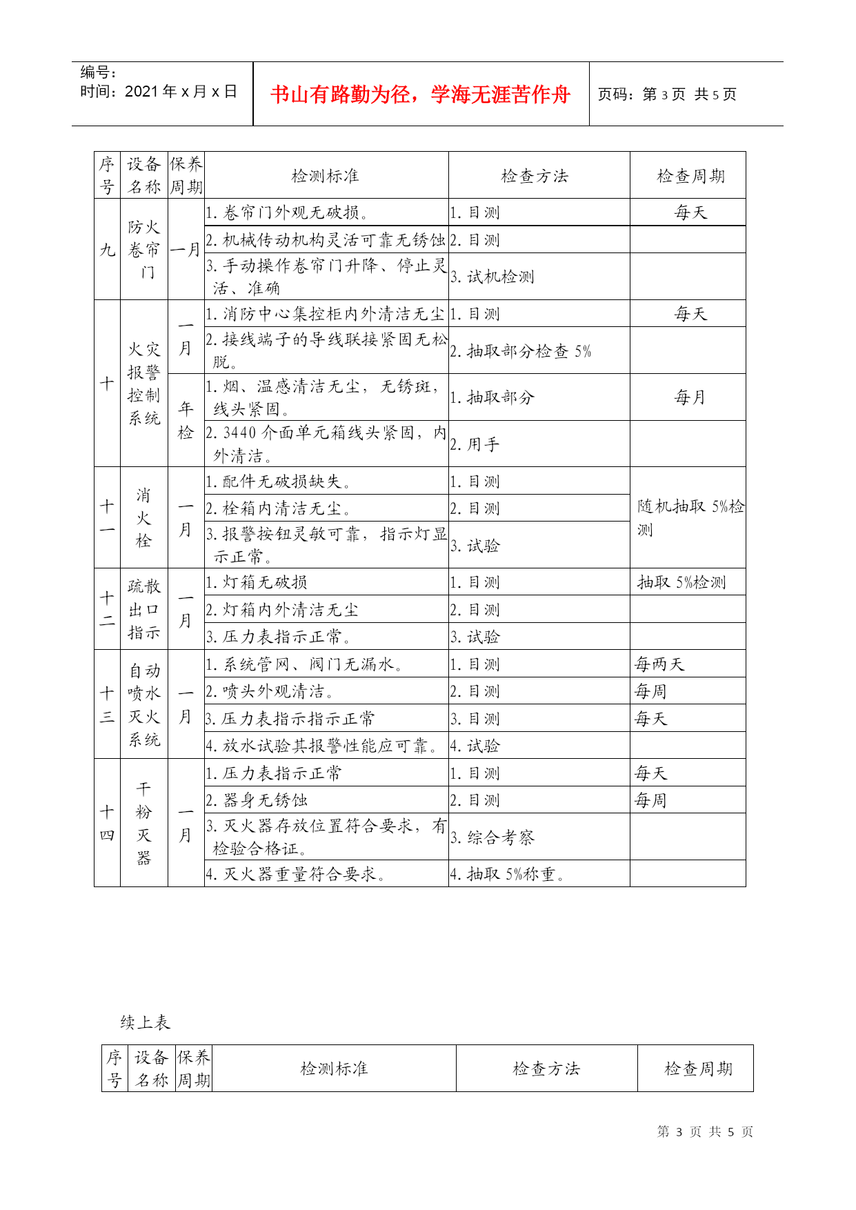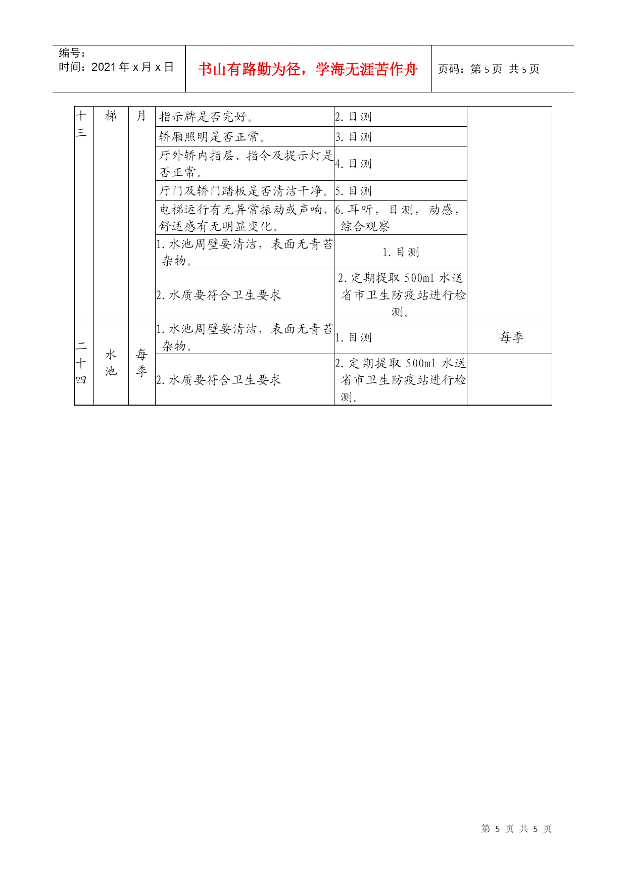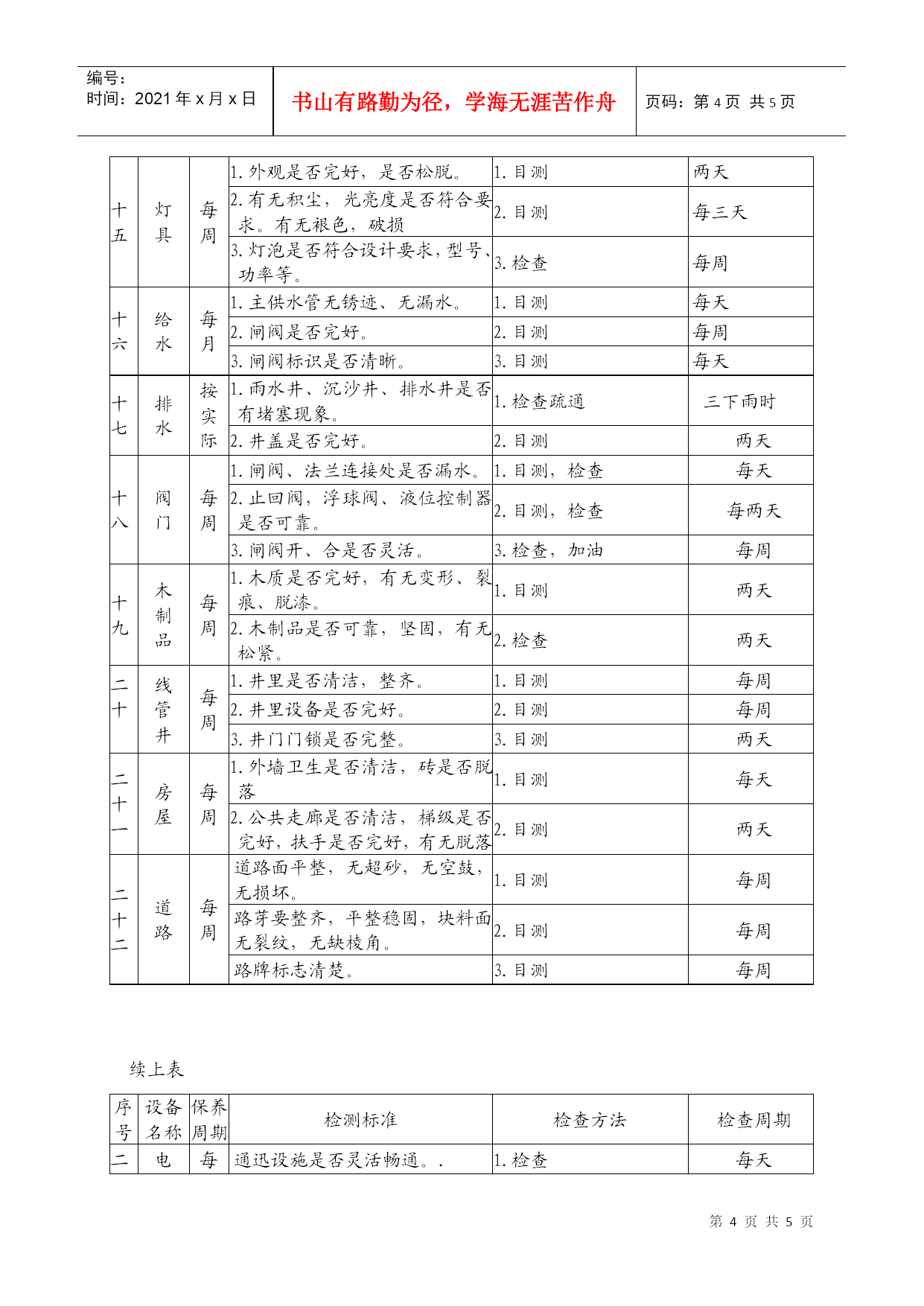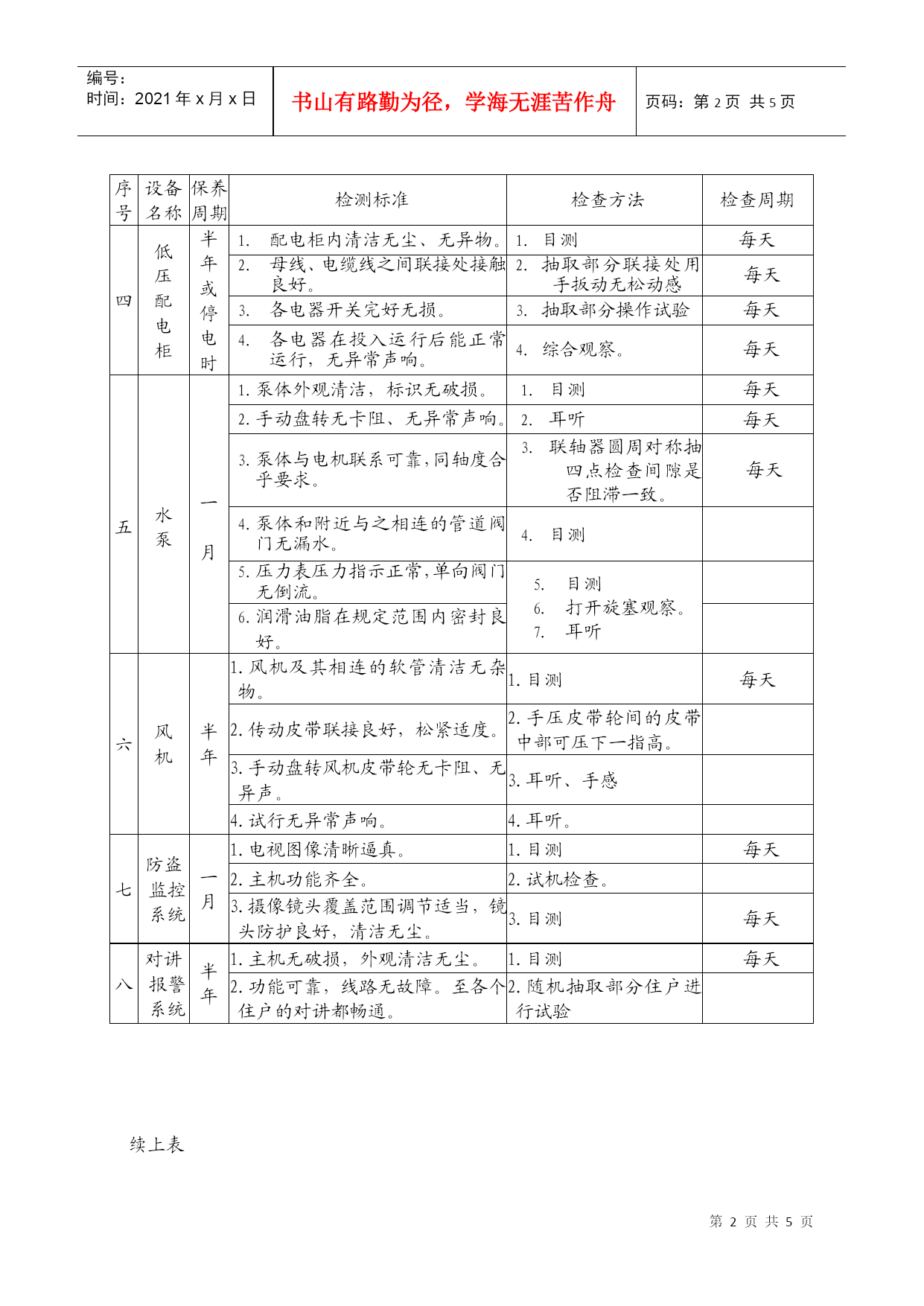 编号:时间:2021年x月x日书山有路勤为径,学海无涯苦作舟页码:第PAGE5页共NUMPAGES5页第PAGE\*MERGEFORMAT5页共NUMPAGES\*MERGEFORMAT5页机电设备完好标准序号设备名称保养周期检测标准检查方法检查周期一电动机每两个月手动盘转应无异常声响无卡阻。.耳听、手感。开机前.三相绕组绝缘符合要求。用1000V摇表摇测。联轴器的联接可靠,间隙符合标准,传动皮带或传动链的联接松紧适度。联轴器联接间隙约2-3毫米传运皮带、传动链在两传动轮中部下压可压下一指高为松紧适度。带负荷运行无异常声响。用长螺丝刀一端与电动机相接触,另一端与耳朵相贴,听其内部声响。每天三相电流应平衡。用钳形电流表测电流。每天二柴油发电机十五天或运行前机油油位、水箱水位、柴油油位,符合标准。目测整个机组无漏油、漏水现象。目测蓄电池电解液液位、输出电压合乎标准。液位高于极片约10—15MM,输出电压不低于24V。开机试运行运转正常,各仪表指示在规定范围内。综合考察分析运行声音正常,排烟口排出的烟为灰白烟。耳听目测三干式变压器按保养规定变压器内外清洁无异物。目测每天巡查母线、电缆线与变压器联接良好。用手扳动无松动感。每天巡查各电器开关完好无损。用2500V播表摇测。半年或停电时各电器在投入运行后能正常运行,无异常声响。耳听每天巡查续上表序号设备名称保养周期检测标准检查方法检查周期四低压配电柜半年或停电时配电柜内清洁无尘、无异物。目测每天母线、电缆线之间联接处接触良好。抽取部分联接处用手扳动无松动感每天各电器开关完好无损。抽取部分操作试验每天各电器在投入运行后能正常运行,无异常声响。综合观察。每天五水泵一月泵体外观清洁,标识无破损。目测每天手动盘转无卡阻、无异常声响。耳听每天泵体与电机联系可靠,同轴度合乎要求。联轴器圆周对称抽四点检查间隙是否阻滞一致。每天泵体和附近与之相连的管道阀门无漏水。目测压力表压力指示正常,单向阀门无倒流。目测打开旋塞观察。耳听润滑油脂在规定范围内密封良好。六风机半年1.风机及其相连的软管清洁无杂物。1.目测每天2.传动皮带联接良好,松紧适度。2.手压皮带轮间的皮带中部可压下一指高。3.手动盘转风机皮带轮无卡阻、无异声。3.耳听、手感4.试行无异常声响。4.耳听。七防盗监控系统一月1.电视图像清晰逼真。1.目测每天2.主机功能齐全。2.试机检查。3.摄像镜头覆盖范围调节适当,镜头防护良好,清洁无尘。3.目测每天八对讲报警系统半年1.主机无破损,外观清洁无尘。1.目测每天2.功能可靠,线路无故障。至各个住户的对讲都畅通。2.随机抽取部分住户进行试验续上表序号设备名称保养周期检测标准检查方法检查周期九防火卷帘门一月1.卷帘门外观无破损。1.目测每天2.机械传动机构灵活可靠无锈蚀2.目测3.手动操作卷帘门升降、停止灵活、准确3.试机检测十火灾报警控制系统一月1.消防中心集控柜内外清洁无尘。1.目测每天2.接线端子的导线联接紧固无松脱。2.抽取部分检查5%年检1.烟、温感清洁无尘,无锈斑,线头紧固。1.抽取部分每月2.3440介面单元箱线头紧固,内外清洁。2.用手十一消火栓一月1.配件无破损缺失。1.目测随机抽取5%检测2.栓箱内清洁无尘。2.目测3.报警按钮灵敏可靠,指示灯显示正常。3.试验十二疏散出口指示一月1.灯箱无破损1.目测抽取5%检测2.灯箱内外清洁无尘2.目测3.压力表指示正常。3.试验十三自动喷水灭火系统一月1.系统管网、阀门无漏水。1.目测每两天2.喷头外观清洁。2.目测每周3.压力表指示指示正常3.目测每天4.放水试验其报警性能应可靠。4.试验十四干粉灭器一月1.压力表指示正常1.目测每天2.器身无锈蚀2.目测每周3.灭火器存放位置符合要求,有检验合格证。3.综合考察4.灭火器重量符合要求。4.抽取5%称重。续上表序号设备名称保养周期检测标准检查方法检查周期十五灯具每周1.外观是否完好,是否松脱。1.目测两天2.有无积尘,光亮度是否符合要求。有无裉色,破损2.目测每三天3.灯泡是否符合设计要求,型号、功率等。3.检查每周十六给水每月1.主供水管无锈迹、无漏水。1.目测每天2.闸阀是否完好。2.目测每周3.闸阀标识是否清晰。3.目测每天十七排水按实际1.雨水井、沉沙井、排水井是否有堵塞现象。1.检查疏通三下雨时2.井盖是否完好。2.目测两天十八阀门每周1.闸阀、法兰连接处是否漏水。1.目测,检查每天2.止回阀,浮球阀、液位控制器是否可靠。2.目测