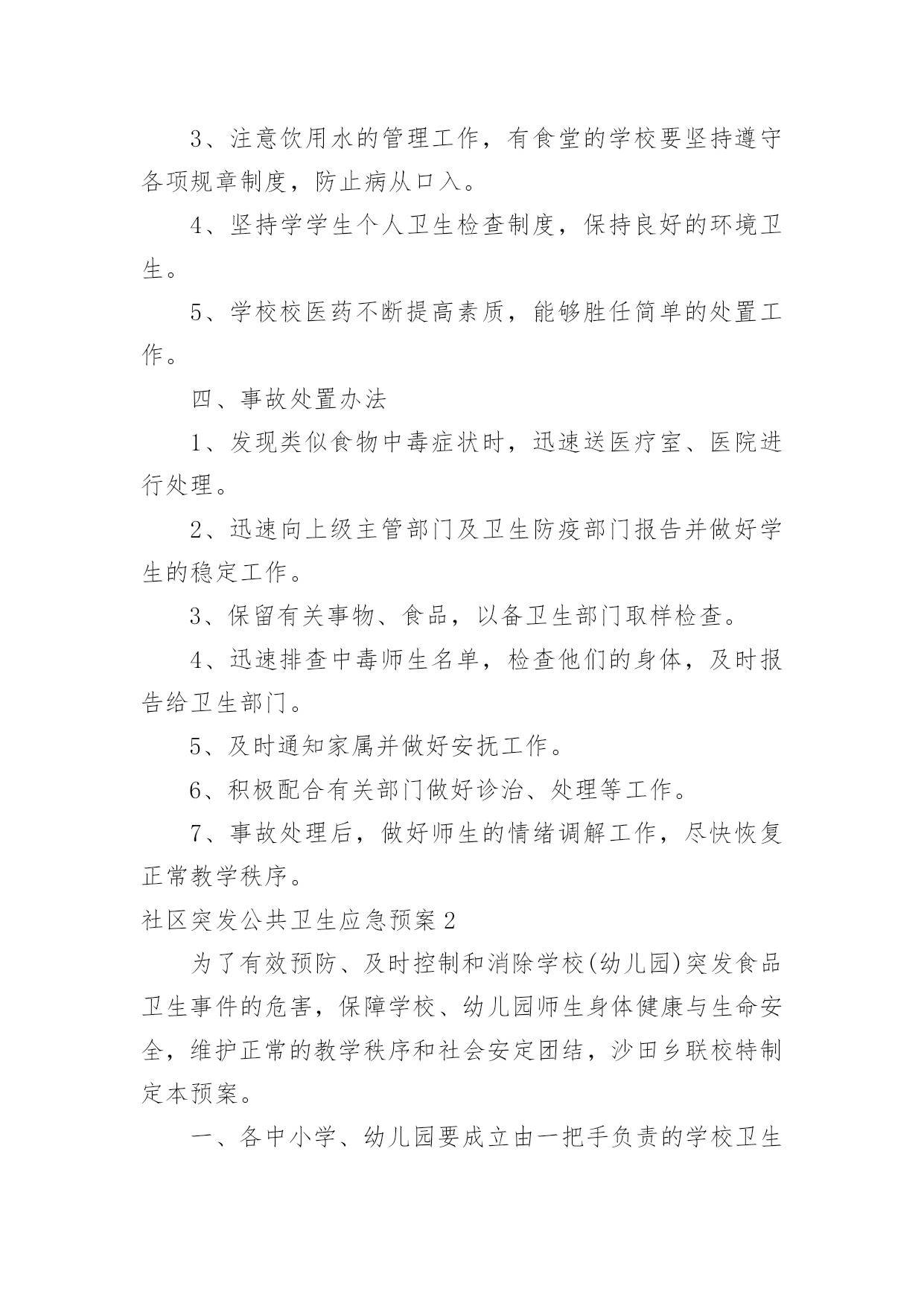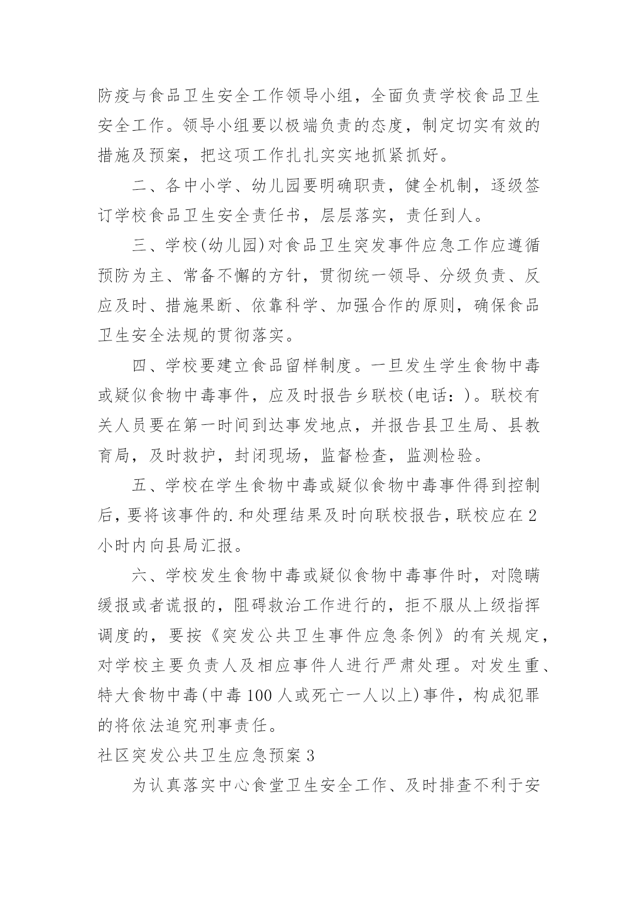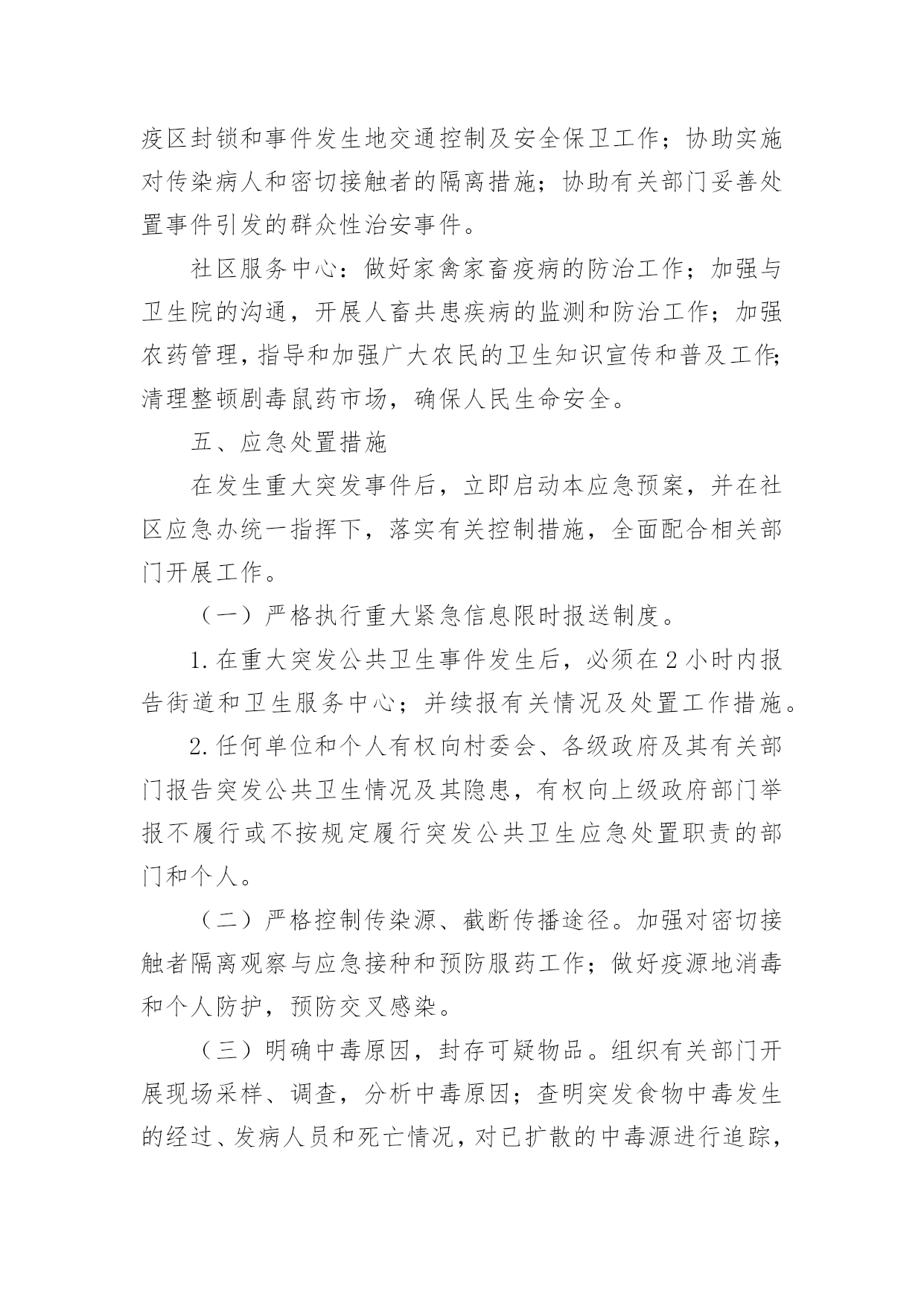 社区突发公共卫生应急预案社区突发公共卫生应急预案在日常生活或是工作学习中,难免会发生一些不在自己预料之中的事件,为了控制事故的发展势态,预先制定应急预案是必不可少的。那么什么样的应急预案才是好的呢?下面是小编收集整理的社区突发公共卫生应急预案,希望对大家有所帮助。社区突发公共卫生应急预案1为提高师生的饮食卫生安全意识,确保师生人身安全,结合学校实际情况,特制定本应急预案:一、基本原则:1、加强宣传,教育为主饮食卫生安全工作尤其重要,要坚持“加强宣传,教育为主”的原则,常抓不懈。2、科学管理,抓好落实要坚持科学管理的`原则,抓好具体落实,严格把关,决不出现漏洞。二、领导小组:组长:副组长:组员:三、具体措施、要求1、学校要加强《食品卫生》及常规卫生知识宣传落实,使师生掌握基本卫生常识。2、上好卫生课,坚持每年的卫生体检制度,做好疫苗接种。3、注意饮用水的管理工作,有食堂的学校要坚持遵守各项规章制度,防止病从口入。4、坚持学学生个人卫生检查制度,保持良好的环境卫生。5、学校校医药不断提高素质,能够胜任简单的处置工作。四、事故处置办法1、发现类似食物中毒症状时,迅速送医疗室、医院进行处理。2、迅速向上级主管部门及卫生防疫部门报告并做好学生的稳定工作。3、保留有关事物、食品,以备卫生部门取样检查。4、迅速排查中毒师生名单,检查他们的身体,及时报告给卫生部门。5、及时通知家属并做好安抚工作。6、积极配合有关部门做好诊治、处理等工作。7、事故处理后,做好师生的情绪调解工作,尽快恢复正常教学秩序。社区突发公共卫生应急预案2为了有效预防、及时控制和消除学校(幼儿园)突发食品卫生事件的危害,保障学校、幼儿园师生身体健康与生命安全,维护正常的教学秩序和社会安定团结,沙田乡联校特制定本预案。一、各中小学、幼儿园要成立由一把手负责的学校卫生防疫与食品卫生安全工作领导小组,全面负责学校食品卫生安全工作。领导小组要以极端负责的态度,制定切实有效的措施及预案,把这项工作扎扎实实地抓紧抓好。二、各中小学、幼儿园要明确职责,健全机制,逐级签订学校食品卫生安全责任书,层层落实,责任到人。三、学校(幼儿园)对食品卫生突发事件应急工作应遵循预防为主、常备不懈的方针,贯彻统一领导、分级负责、反应及时、措施果断、依靠科学、加强合作的原则,确保食品卫生安全法规的贯彻落实。四、学校要建立食品留样制度。一旦发生学生食物中毒或疑似食物中毒事件,应及时报告乡联校(电话:)。联校有关人员要在第一时间到达事发地点,并报告县卫生局、县教育局,及时救护,封闭现场,监督检查,监测检验。五、学校在学生食物中毒或疑似食物中毒事件得到控制后,要将该事件的.和处理结果及时向联校报告,联校应在2小时内向县局汇报。六、学校发生食物中毒或疑似食物中毒事件时,对隐瞒缓报或者谎报的,阻碍救治工作进行的,拒不服从上级指挥调度的,要按《突发公共卫生事件应急条例》的有关规定,对学校主要负责人及相应事件人进行严肃处理。对发生重、特大食物中毒(中毒100人或死亡一人以上)事件,构成犯罪的将依法追究刑事责任。社区突发公共卫生应急预案3为认真落实中心食堂卫生安全工作、及时排查不利于安全稳定工作问题、确保职工的身体健康,经中心安全生产管理委员会研究,特制定食堂卫生安全的应急预案:一、加强组织领导,落实岗位职责:后勤服务管理部经理是中心食堂卫生管理的第一责任人,主管食堂的司务长和炊管人员是食堂膳食卫生安全管理的直接责任人,中心认真落实“安全第一,预防为主”的方针。把食堂膳食卫生安全管理作为重中之重,纳入年度经营管理责任目标考核,切实做好此项工作。后勤管理服务部经理要经常督促、检查食堂卫生情况,责任落实到人,成立食堂卫生安全管理的.组织机构,明确责任,层层签订责任状,实行责任目标分解,层层负责,人人有责的良好机制。二、建立食品卫生安全管理制度:坚持从业人员按规定时间体检,持有健康证才能上岗,食堂有《卫生许可证》并健全卫生安全管理规章及岗位责任,公示上墙,接受用餐者监督,加强食品安全保卫措施,严禁非工作人员进入食堂,强化食堂卫生工作的过程性管理、监督,规范运作,科学管理。三、建立切实可行的食物中毒突发事件的应急处理措施:1、发现食物中毒突发事件,司务长、炊事人员或第一发现者立即通知部门领导的同时,报告总值班领导、住站中心领导。2、应急小分队立即奔赴现场,查明原因,及时用药,控制病情。3、信息联络员第一时间上报安管科,通知县卫生部门,详细告知单位住址,职工数量,食物中毒情况等具体内容。4、情节严重的,后勤保障提供车辆,资金保障及时送医院。四、责任追究:因管理人员不到位,造成重、特大卫生安全责任事故人员,给予行政处分,构成玩忽职守罪的责任人要依法追究刑事责任。社区突发公共卫生应急预案4一、目的和依据为有效预防、及时控制和消除突发
