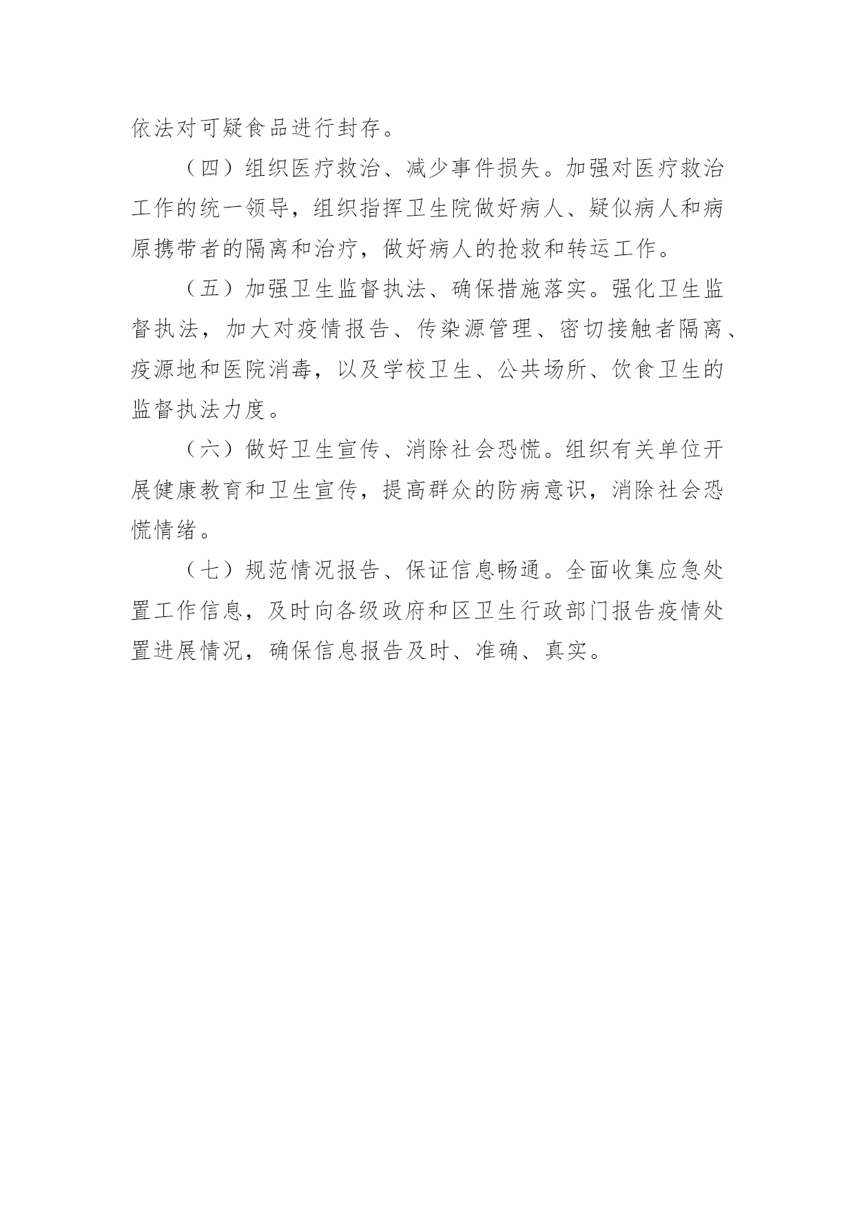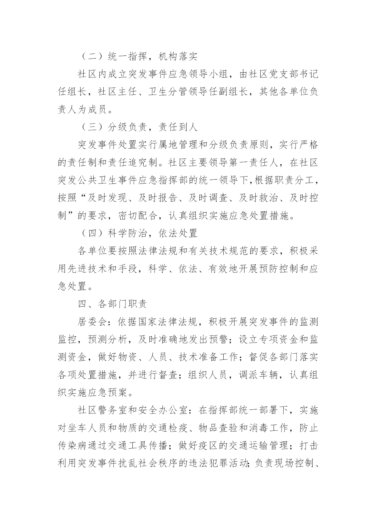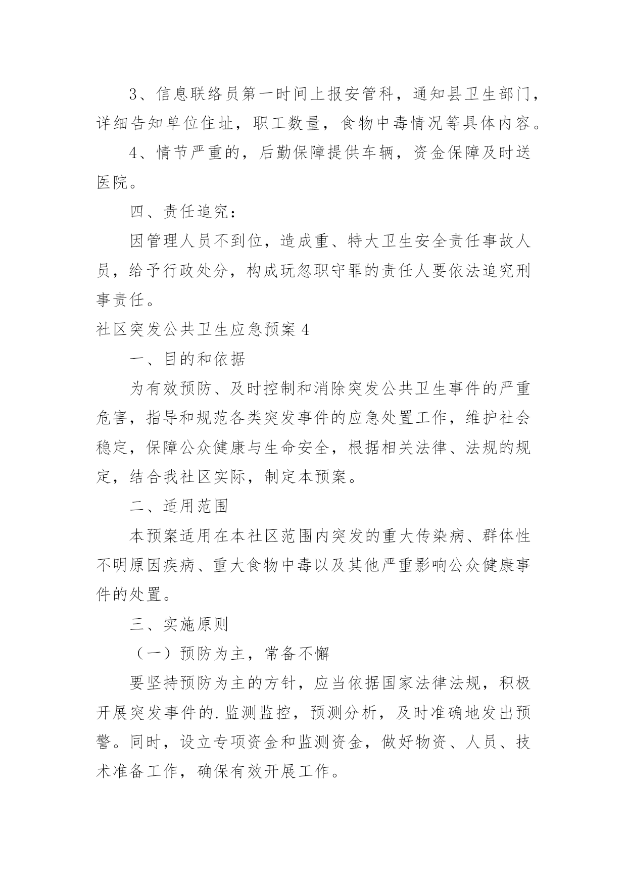 社区突发公共卫生应急预案社区突发公共卫生应急预案在日常生活或是工作学习中,难免会发生一些不在自己预料之中的事件,为了控制事故的发展势态,预先制定应急预案是必不可少的。那么什么样的应急预案才是好的呢?下面是小编收集整理的社区突发公共卫生应急预案,希望对大家有所帮助。社区突发公共卫生应急预案1为提高师生的饮食卫生安全意识,确保师生人身安全,结合学校实际情况,特制定本应急预案:一、基本原则:1、加强宣传,教育为主饮食卫生安全工作尤其重要,要坚持“加强宣传,教育为主”的原则,常抓不懈。2、科学管理,抓好落实要坚持科学管理的`原则,抓好具体落实,严格把关,决不出现漏洞。二、领导小组:组长:副组长:组员:三、具体措施、要求1、学校要加强《食品卫生》及常规卫生知识宣传落实,使师生掌握基本卫生常识。2、上好卫生课,坚持每年的卫生体检制度,做好疫苗接种。3、注意饮用水的管理工作,有食堂的学校要坚持遵守各项规章制度,防止病从口入。4、坚持学学生个人卫生检查制度,保持良好的环境卫生。5、学校校医药不断提高素质,能够胜任简单的处置工作。四、事故处置办法1、发现类似食物中毒症状时,迅速送医疗室、医院进行处理。2、迅速向上级主管部门及卫生防疫部门报告并做好学生的稳定工作。3、保留有关事物、食品,以备卫生部门取样检查。4、迅速排查中毒师生名单,检查他们的身体,及时报告给卫生部门。5、及时通知家属并做好安抚工作。6、积极配合有关部门做好诊治、处理等工作。7、事故处理后,做好师生的情绪调解工作,尽快恢复正常教学秩序。社区突发公共卫生应急预案2为了有效预防、及时控制和消除学校(幼儿园)突发食品卫生事件的危害,保障学校、幼儿园师生身体健康与生命安全,维护正常的教学秩序和社会安定团结,沙田乡联校特制定本预案。一、各中小学、幼儿园要成立由一把手负责的学校卫生防疫与食品卫生安全工作领导小组,全面负责学校食品卫生安全工作。领导小组要以极端负责的态度,制定切实有效的措施及预案,把这项工作扎扎实实地抓紧抓好。二、各中小学、幼儿园要明确职责,健全机制,逐级签订学校食品卫生安全责任书,层层落实,责任到人。三、学校(幼儿园)对食品卫生突发事件应急工作应遵循预防为主、常备不懈的方针,贯彻统一领导、分级负责、反应及时、措施果断、依靠科学、加强合作的原则,确保食品卫生安全法规的贯彻落实。四、学校要建立食品留样制度。一旦发生学生食物中毒或疑似食物中毒事件,应及时报告乡联校(电话:)。联校有关人员要在第一时间到达事发地点,并报告县卫生局、县教育局,及时救护,封闭现场,监督检查,监测检验。五、学校在学生食物中毒或疑似食物中毒事件得到控制后,要将该事件的.和处理结果及时向联校报告,联校应在2小时内向县局汇报。六、学校发生食物中毒或疑似食物中毒事件时,对隐瞒缓报或者谎报的,阻碍救治工作进行的,拒不服从上级指挥调度的,要按《突发公共卫生事件应急条例》的有关规定,对学校主要负责人及相应事件人进行严肃处理。对发生重、特大食物中毒(中毒100人或死亡一人以上)事件,构成犯罪的将依法追究刑事责任。社区突发公共卫生应急预案3为认真落实中心食堂卫生安全工作、及时排查不利于安全稳定工作问题、确保职工的身体健康,经中心安全生产管理委员会研究,特制定食堂卫生安全的应急预案:一、加强组织领导,落实岗位职责:后勤服务管理部经理是中心食堂卫生管理的第一责任人,主管食堂的司务长和炊管人员是食堂膳食卫生安全管理的直接责任人,中心认真落实“安全第一,预防为主”的方针。把食堂膳食卫生安全管理作为重中之重,纳入年度经营管理责任目标考核,切实做好此项工作。后勤管理服务部经理要经常督促、检查食堂卫生情况,责任落实到人,成立食堂卫生安全管理的.组织机构,明确责任,层层签订责任状,实行责任目标分解,层层负责,人人有责的良好机制。二、建立食品卫生安全管理制度:坚持从业人员按规定时间体检,持有健康证才能上岗,食堂有《卫生许可证》并健全卫生安全管理规章及岗位责任,公示上墙,接受用餐者监督,加强食品安全保卫措施,严禁非工作人员进入食堂,强化食堂卫生工作的过程性管理、监督,规范运作,科学管理。三、建立切实可行的食物中毒突发事件的应急处理措施:1、发现食物中毒突发事件,司务长、炊事人员或第一发现者立即通知部门领导的同时,报告总值班领导、住站中心领导。2、应急小分队立即奔赴现场,查明原因,及时用药,控制病情。3、信息联络员第一时间上报安管科,通知县卫生部门,详细告知单位住址,职工数量,食物中毒情况等具体内容。4、情节严重的,后勤保障提供车辆,资金保障及时送医院。四、责任追究:因管理人员不到位,造成重、特大卫生安全责任事故人员,给予行政处分,构成玩忽职守罪的责任人要依法追究刑事责任。社区突发公共卫生应急预案4一、目的和依据为有效预防、及时控制和消除突发