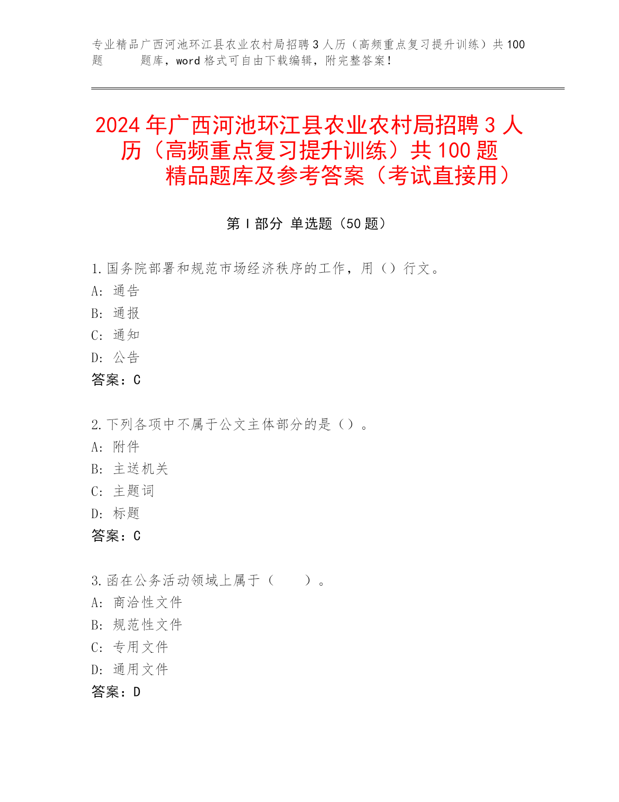 2024年广西河池环江县农业农村局招聘3人历(高频重点复习提升训练)共100题 精品题库及参考答案(考试直接用)