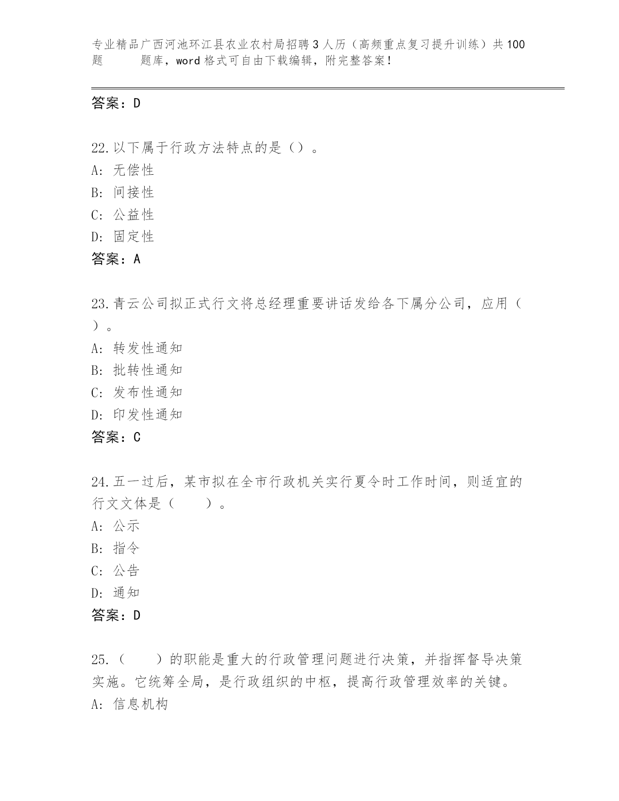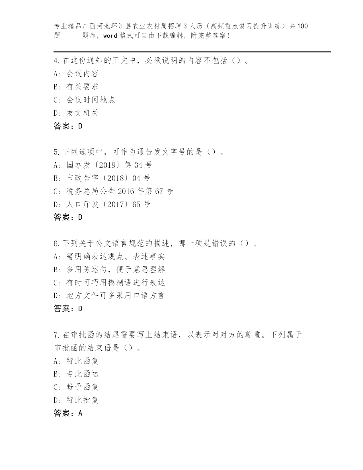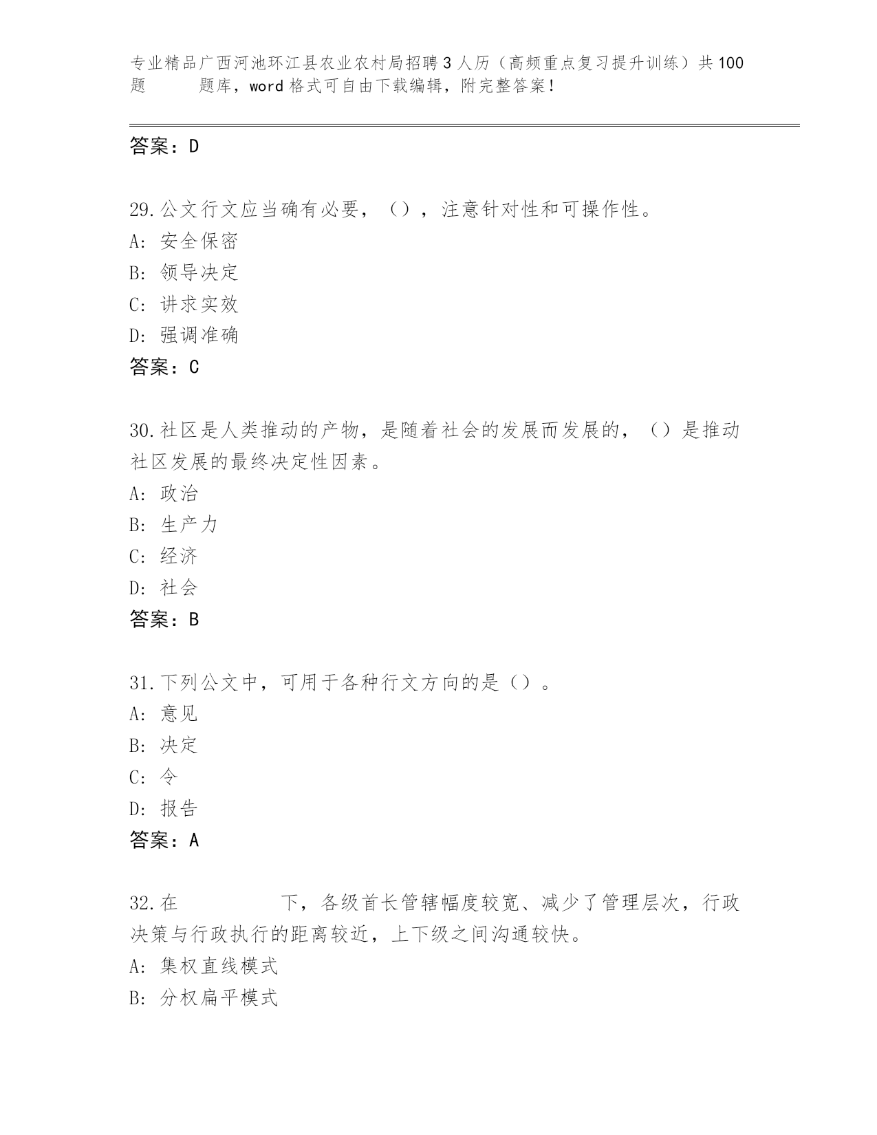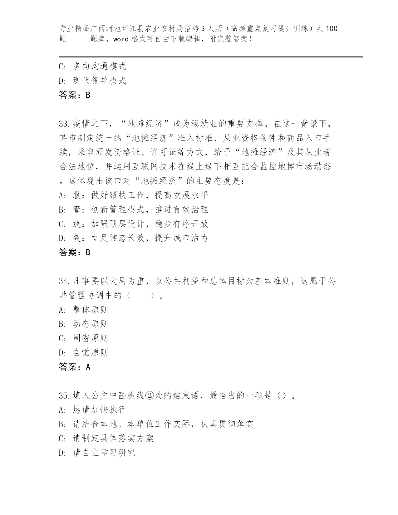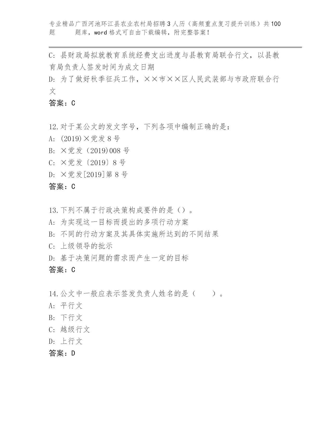 最新广西河池环江县农业农村局招聘3人历(高频重点复习提升训练)共100题 大全精品(考试直接用)