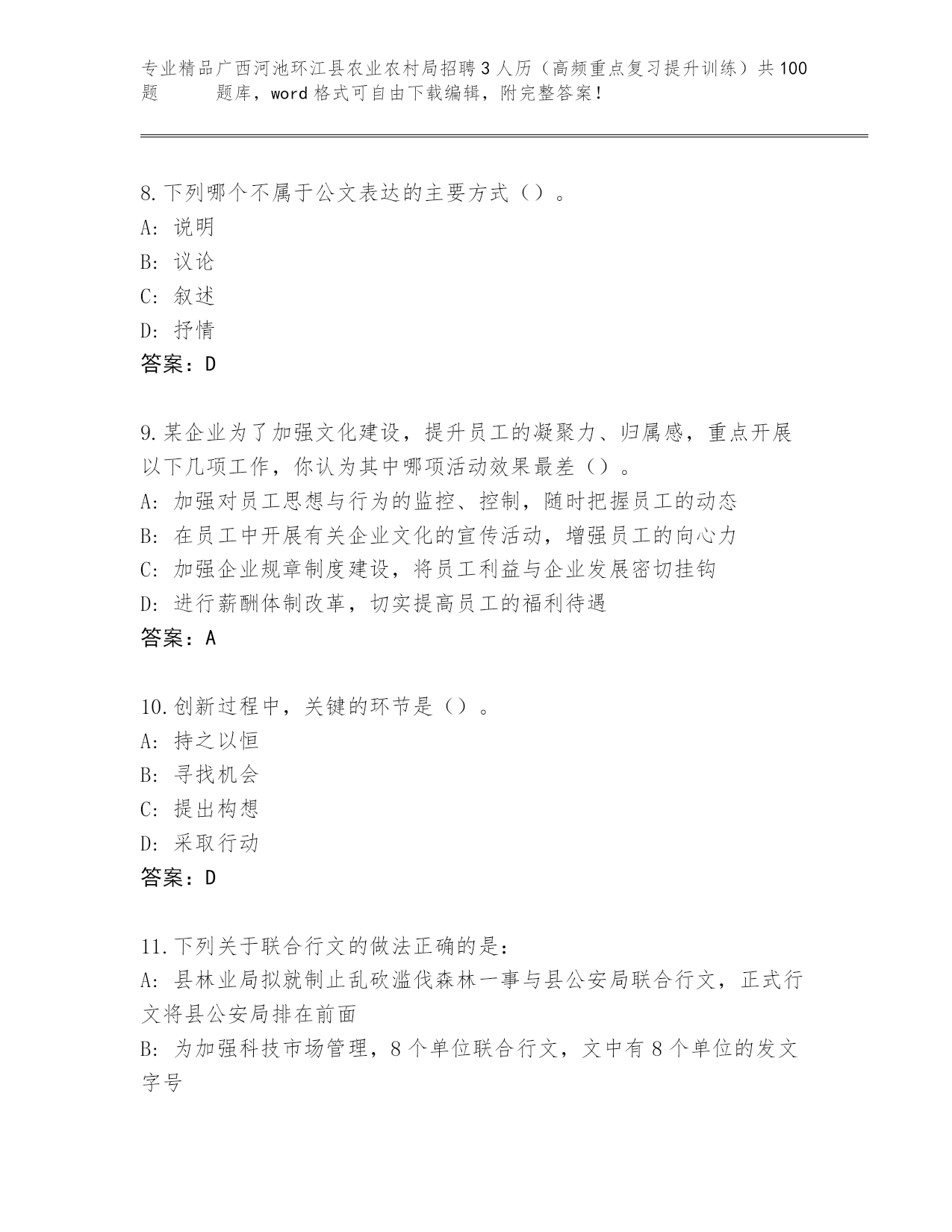 2024年广西河池环江县农业农村局招聘3人历(高频重点复习提升训练)共100题 真题含答案【考试直接用】