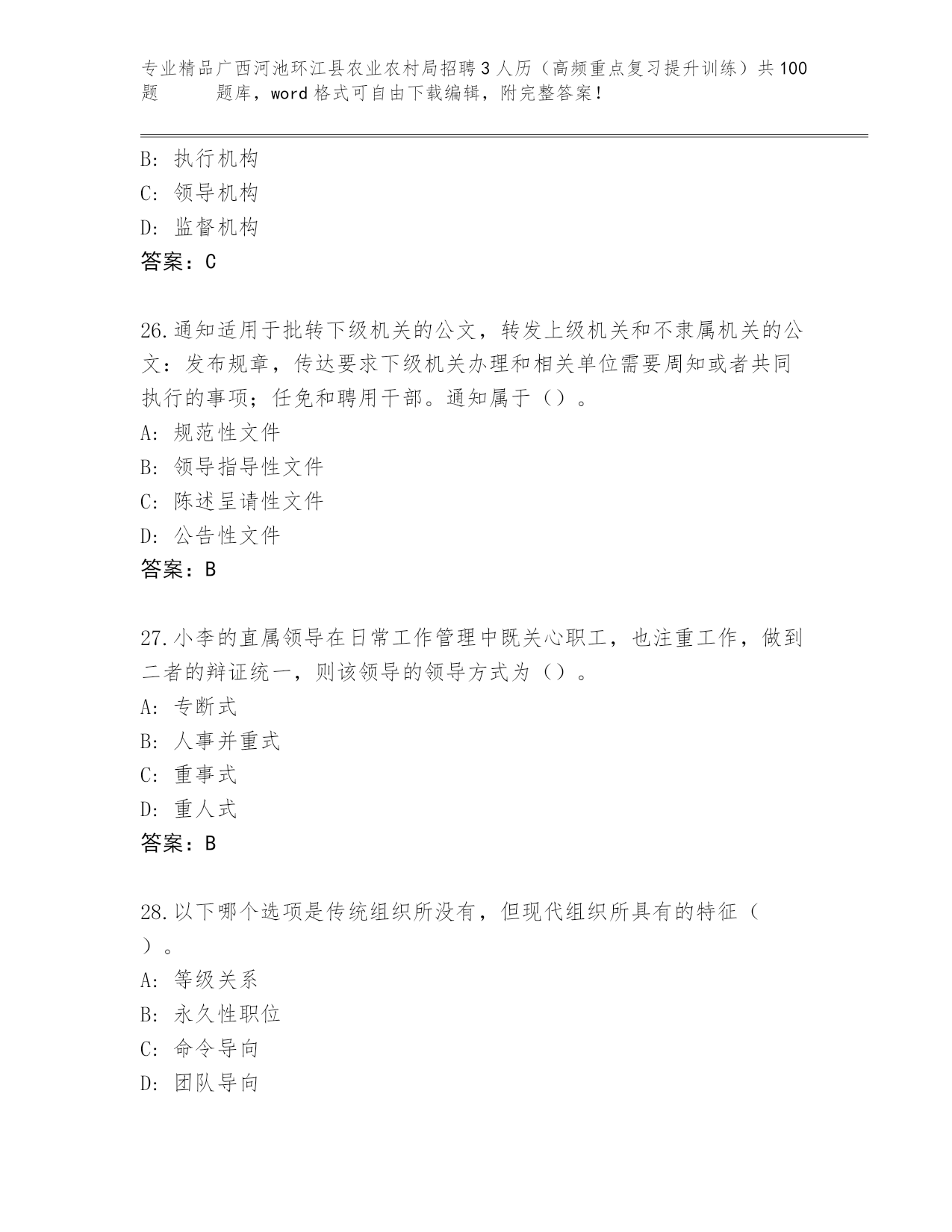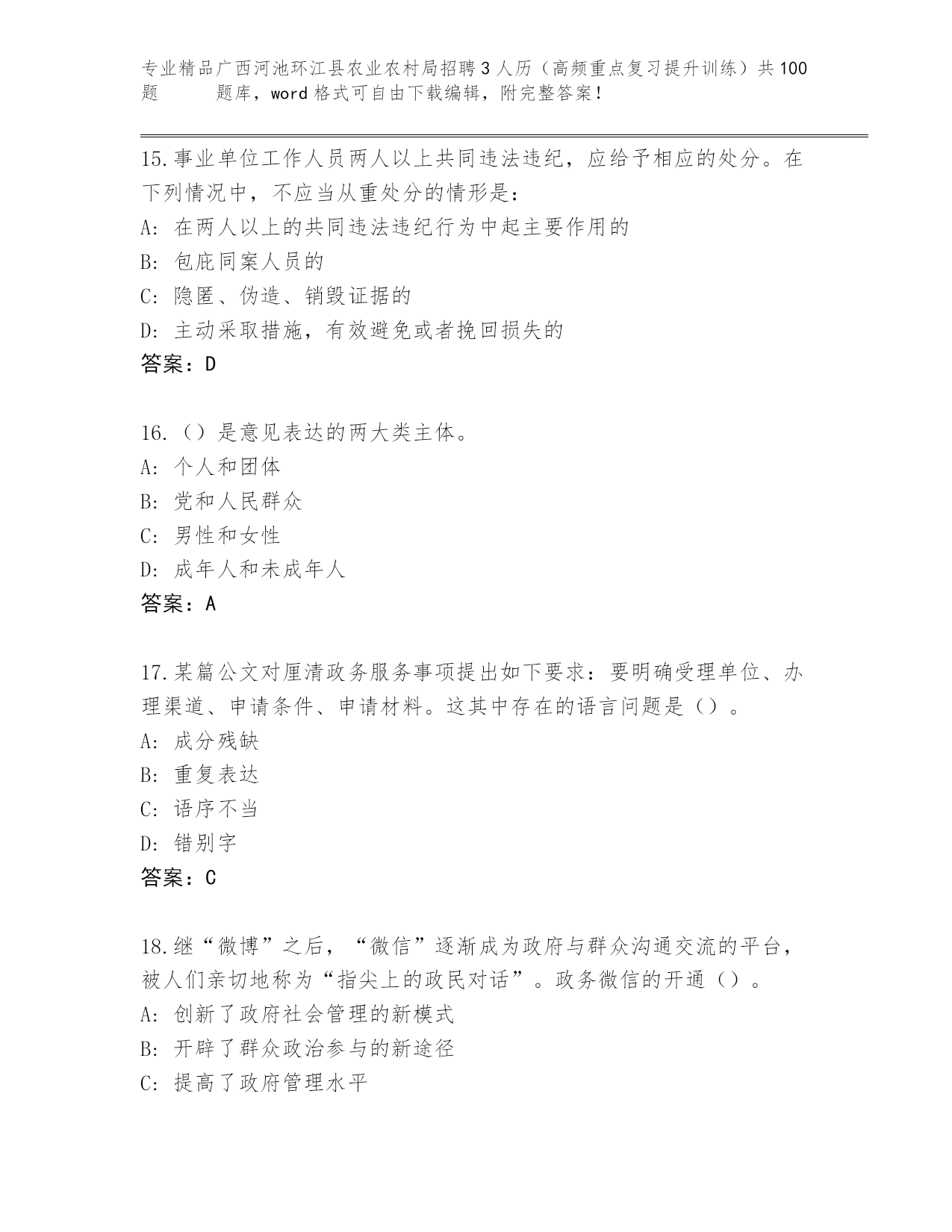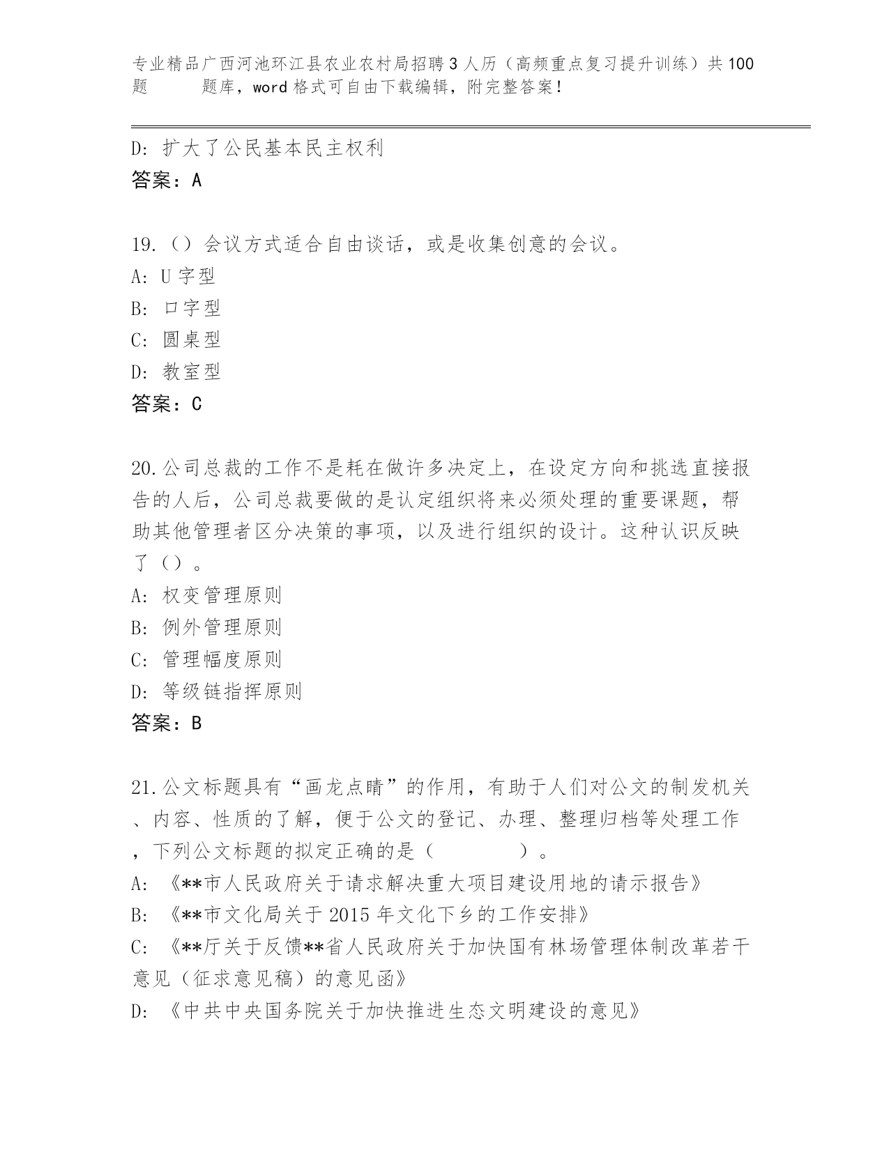 优选广西河池环江县农业农村局招聘3人历(高频重点复习提升训练)共100题 王牌题库各版本