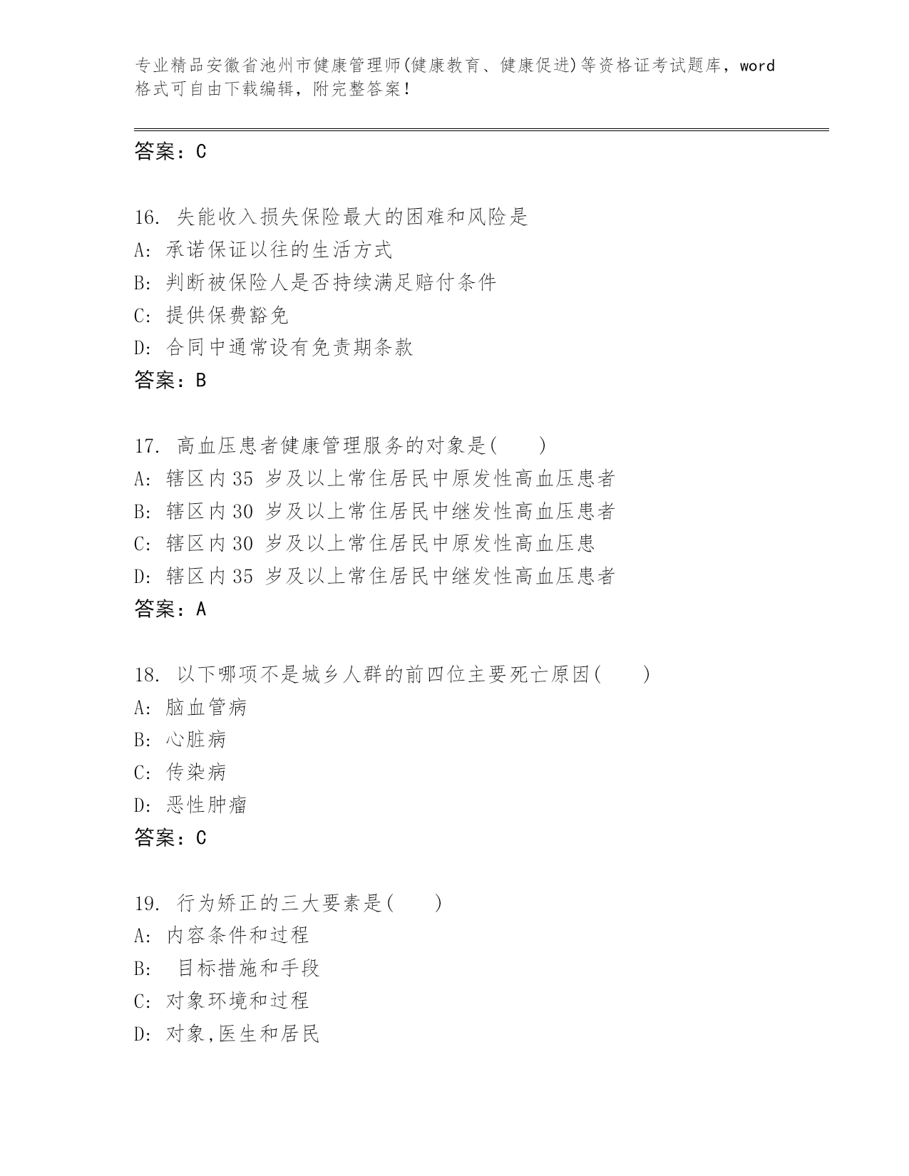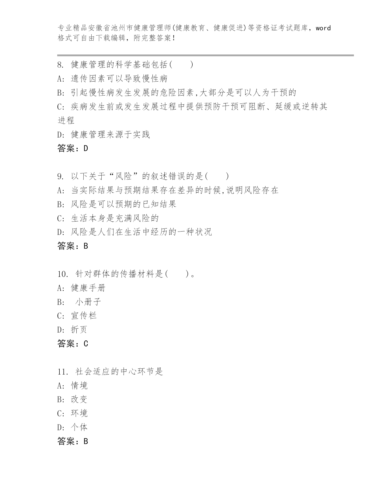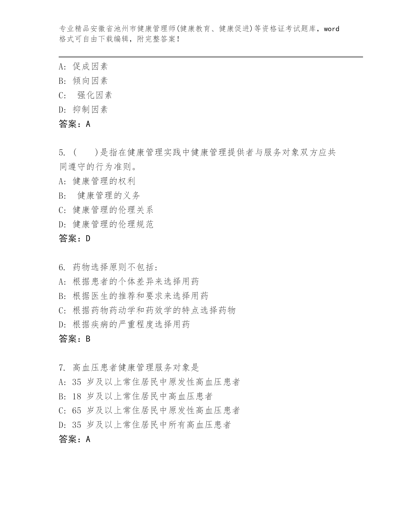 优选安徽省池州市健康管理师(健康教育、健康促进)等资格证考试完整题库及完整答案
