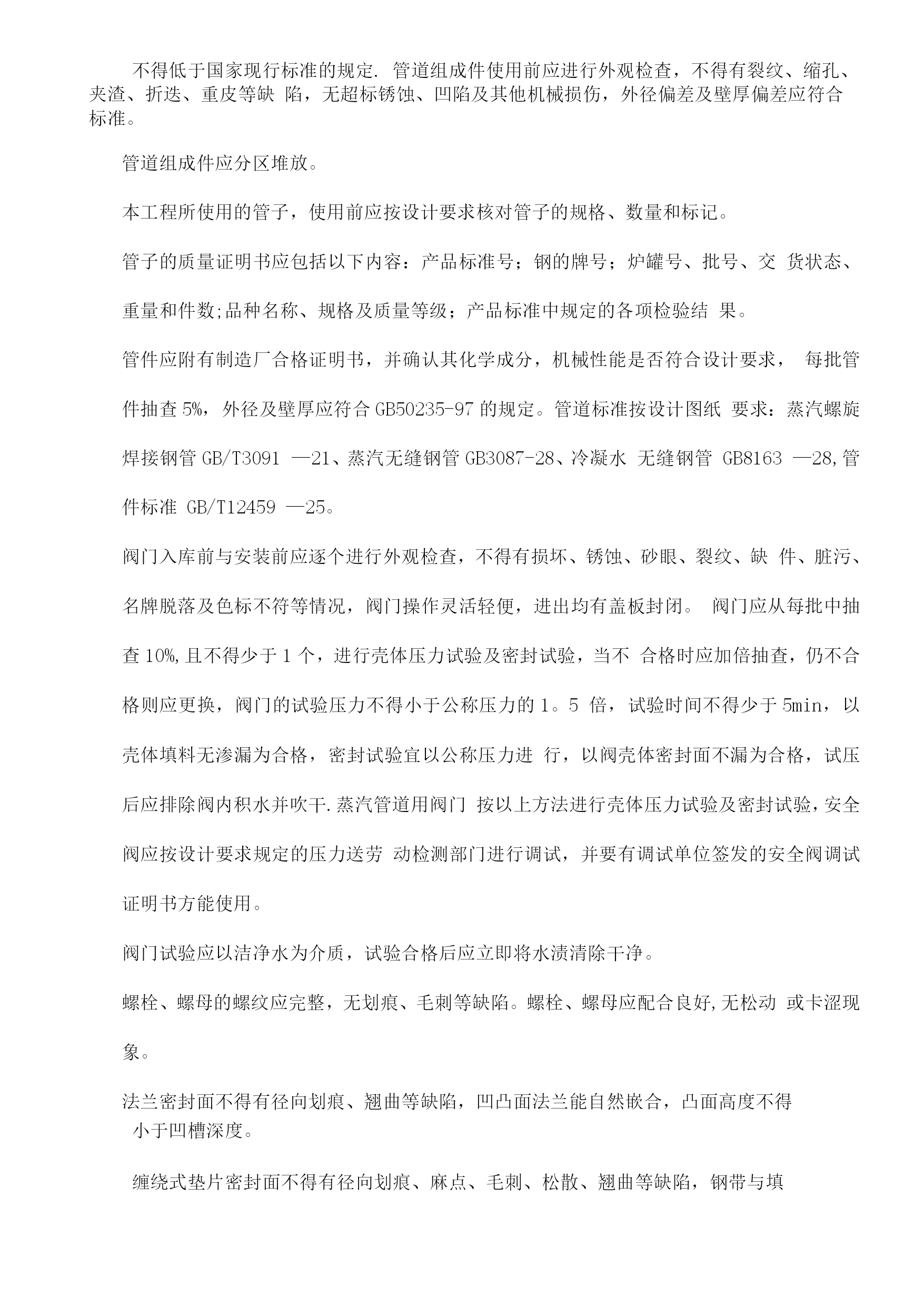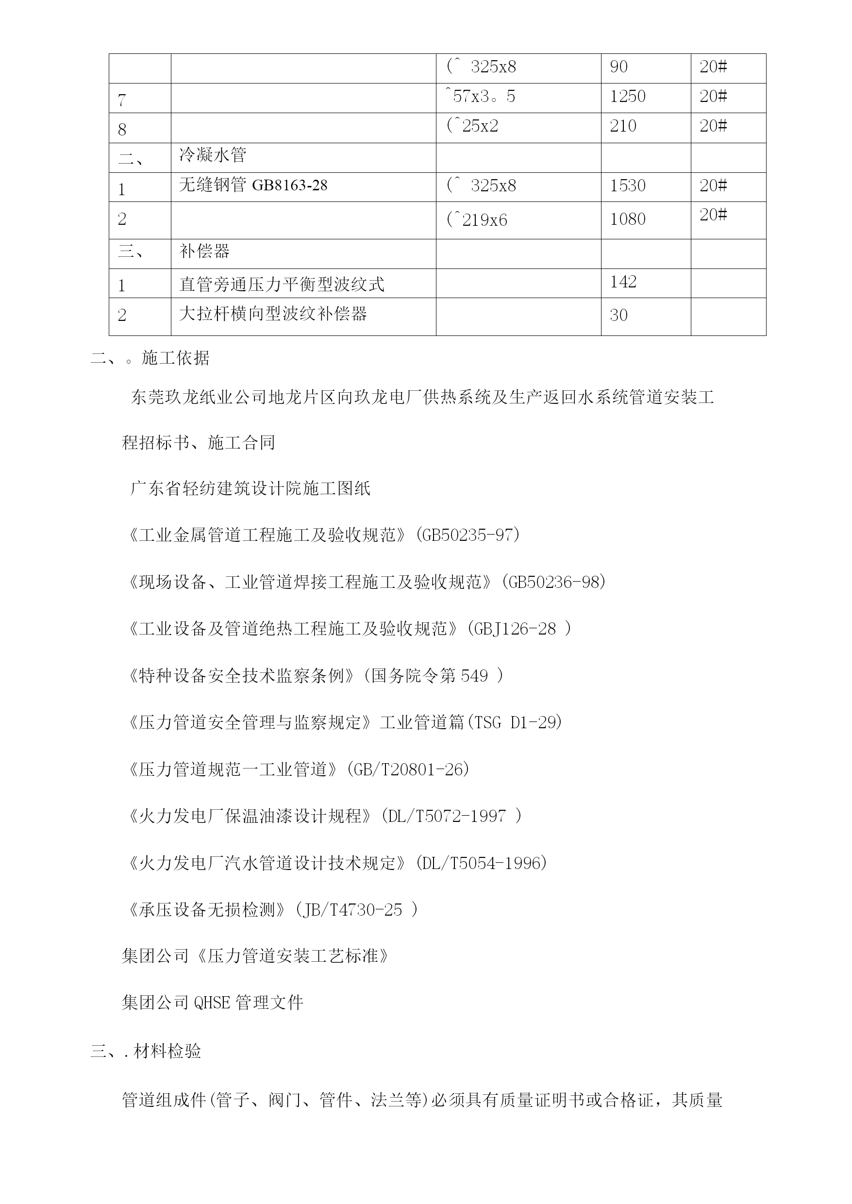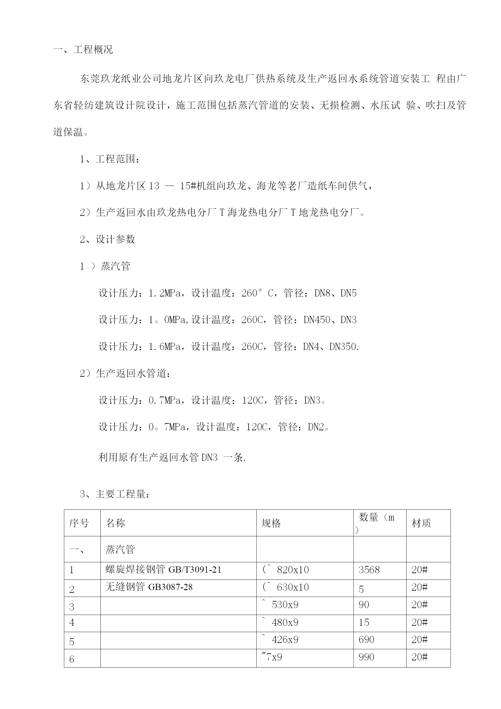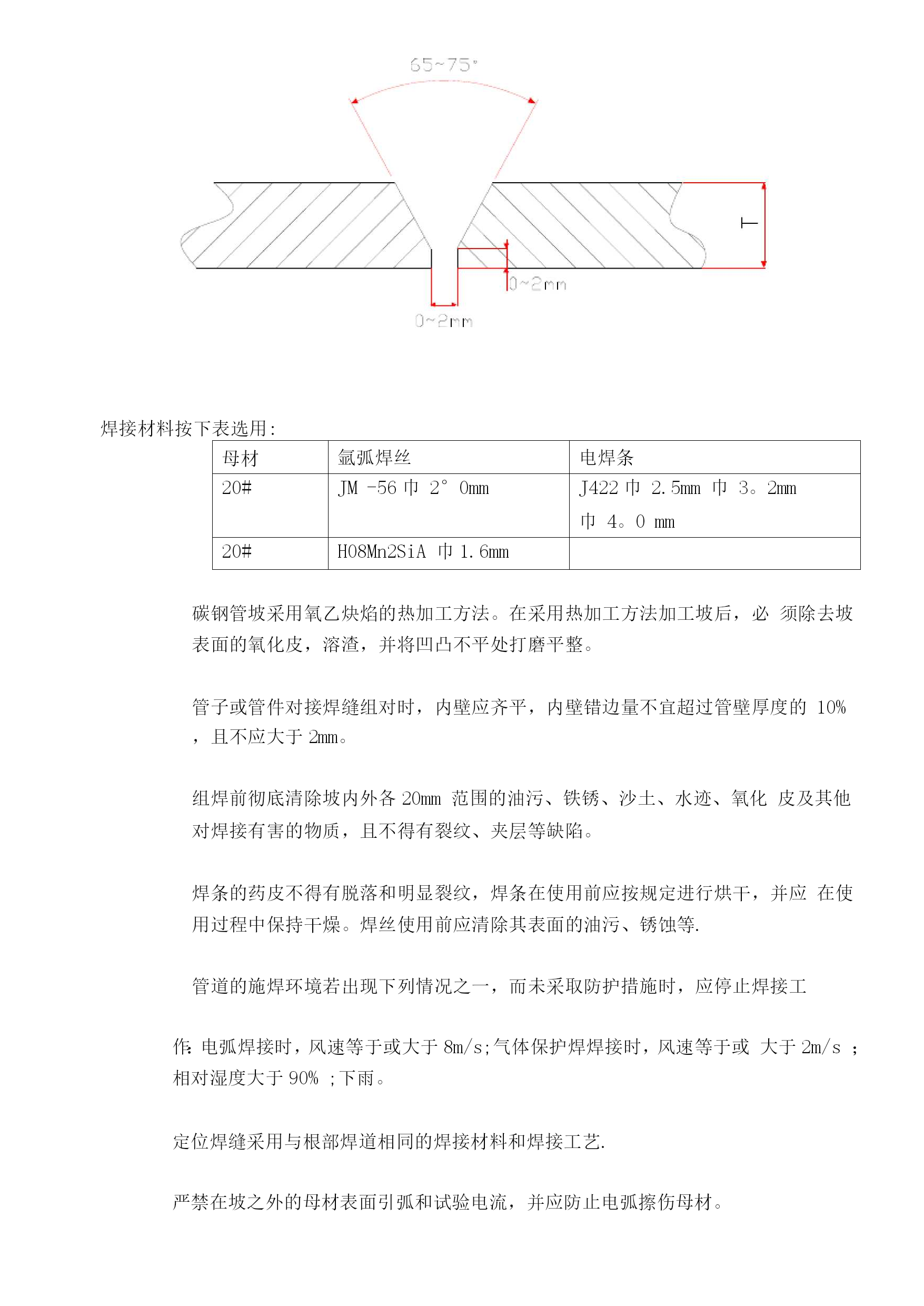 东莞玖龙纸业公司供热系统及生产返回水系统管道改造安装工程压力管道施工方案编制:审核:批准:广东省石油化工建设集团公司0年十二月六日一、工程概况东莞玖龙纸业公司地龙片区向玖龙电厂供热系统及生产返回水系统管道安装工程由广东省轻纺建筑设计院设计,施工范围包括蒸汽管道的安装、无损检测、水压试验、吹扫及管道保温。1、工程范围:1)从地龙片区13—15#机组向玖龙、海龙等老厂造纸车间供气,2)生产返回水由玖龙热电分厂T海龙热电分厂T地龙热电分厂。2、设计参数1)蒸汽管设计压力:1.2MPa,设计温度:260°C,管径:DN8、DN5设计压力:1。0MPa,设计温度:260C,管径:DN450、DN3设计压力:1.6MPa,设计温度:260C,管径:DN4、DN350.2)生产返回水管道:设计压力:0.7MPa,设计温度:120C,管径:DN3。设计压力:0。7MPa,设计温度:120C,管径:DN2。利用原有生产返回水管DN3一条.3、主要工程量:序号名称规格数量(m)材质一、蒸汽管1螺旋焊接钢管GB/T3091-21(^820x10356820#2无缝钢管GB3087-28(^630x10520#3^530x99020#4^480x91520#5^426x969020#6"7x999020#(^325x89020#7^57x3。5125020#8(^25x221020#二、冷凝水管1无缝钢管GB8163-28(^325x8153020#2(^219x6108020#三、补偿器1直管旁通压力平衡型波纹式1422大拉杆横向型波纹补偿器30二、。施工依据东莞玖龙纸业公司地龙片区向玖龙电厂供热系统及生产返回水系统管道安装工程招标书、施工合同广东省轻纺建筑设计院施工图纸《工业金属管道工程施工及验收规范》(GB50235-97)《现场设备、工业管道焊接工程施工及验收规范》(GB50236-98)《工业设备及管道绝热工程施工及验收规范》(GBJ126-28)《特种设备安全技术监察条例》(国务院令第549)《压力管道安全管理与监察规定》工业管道篇(TSGD1-29)《压力管道规范一工业管道》(GB/T20801-26)《火力发电厂保温油漆设计规程》(DL/T5072-1997)《火力发电厂汽水管道设计技术规定》(DL/T5054-1996)《承压设备无损检测》(JB/T4730-25)集团公司《压力管道安装工艺标准》集团公司QHSE管理文件三、.材料检验管道组成件(管子、阀门、管件、法兰等)必须具有质量证明书或合格证,其质量不得低于国家现行标准的规定.管道组成件使用前应进行外观检查,不得有裂纹、缩孔、夹渣、折迭、重皮等缺陷,无超标锈蚀、凹陷及其他机械损伤,外径偏差及壁厚偏差应符合标准。管道组成件应分区堆放。本工程所使用的管子,使用前应按设计要求核对管子的规格、数量和标记。管子的质量证明书应包括以下内容:产品标准号;钢的牌号;炉罐号、批号、交货状态、重量和件数;品种名称、规格及质量等级;产品标准中规定的各项检验结果。管件应附有制造厂合格证明书,并确认其化学成分,机械性能是否符合设计要求,每批管件抽查5%,外径及壁厚应符合GB50235-97的规定。管道标准按设计图纸要求:蒸汽螺旋焊接钢管GB/T3091—21、蒸汽无缝钢管GB3087-28、冷凝水无缝钢管GB8163—28,管件标准GB/T12459—25。阀门入库前与安装前应逐个进行外观检查,不得有损坏、锈蚀、砂眼、裂纹、缺件、脏污、名牌脱落及色标不符等情况,阀门操作灵活轻便,进出均有盖板封闭。阀门应从每批中抽查10%,且不得少于1个,进行壳体压力试验及密封试验,当不合格时应加倍抽查,仍不合格则应更换,阀门的试验压力不得小于公称压力的1。5倍,试验时间不得少于5min,以壳体填料无渗漏为合格,密封试验宜以公称压力进行,以阀壳体密封面不漏为合格,试压后应排除阀内积水并吹干.蒸汽管道用阀门按以上方法进行壳体压力试验及密封试验,安全阀应按设计要求规定的压力送劳动检测部门进行调试,并要有调试单位签发的安全阀调试证明书方能使用。阀门试验应以洁净水为介质,试验合格后应立即将水渍清除干净。螺栓、螺母的螺纹应完整,无划痕、毛刺等缺陷。螺栓、螺母应配合良好,无松动或卡涩现象。法兰密封面不得有径向划痕、翘曲等缺陷,凹凸面法兰能自然嵌合,凸面高度不得小于凹槽深度。缠绕式垫片密封面不得有径向划痕、麻点、毛刺、松散、翘曲等缺陷,钢带与填充带应紧密贴合,层次均匀,无断裂、重迭、空隙、弯曲等缺陷。焊接工程所用的材料,应符合设计文件的规定.焊接材料必须具有制造厂的质量证明书,其质量不得低于国家现行标准的规定。焊条烘焙前应认真核