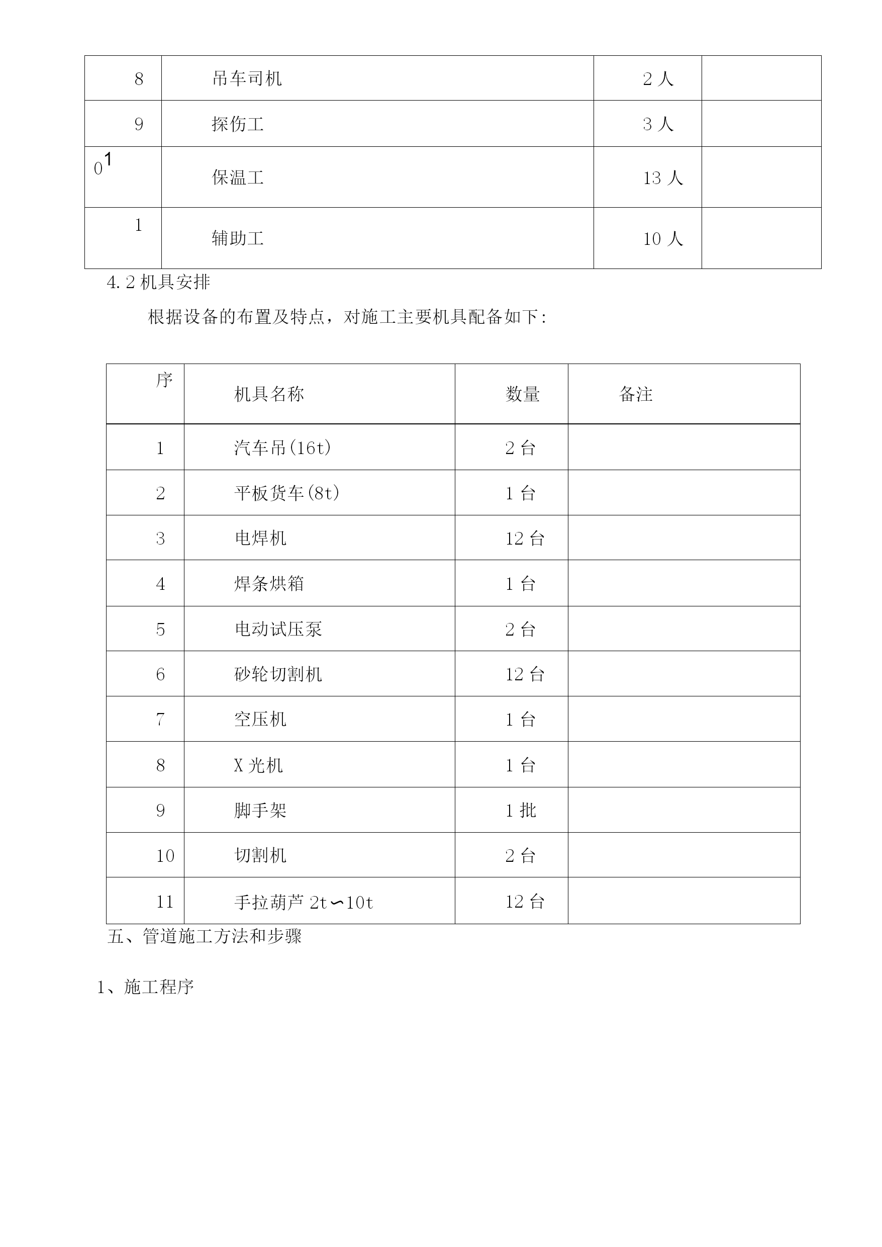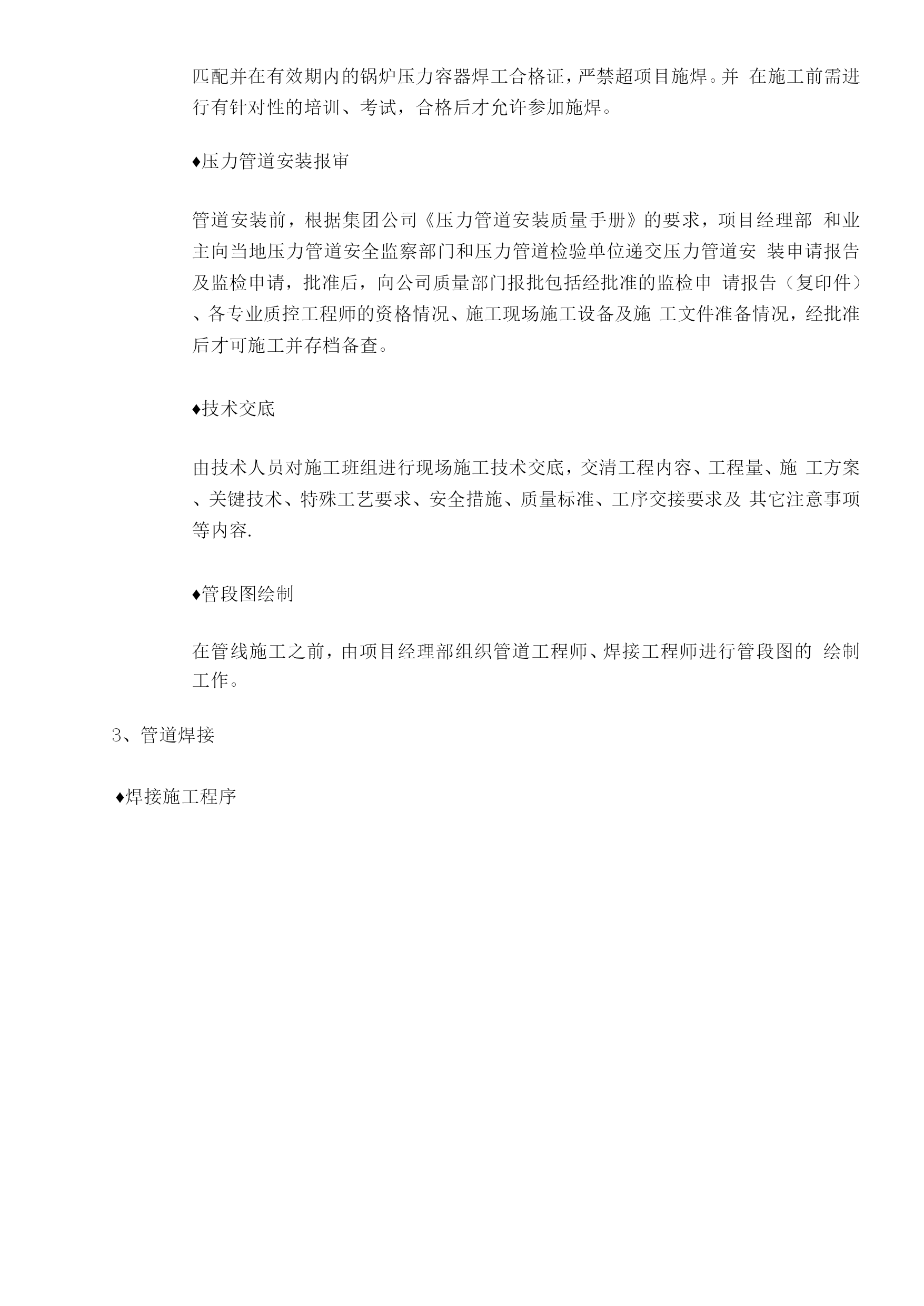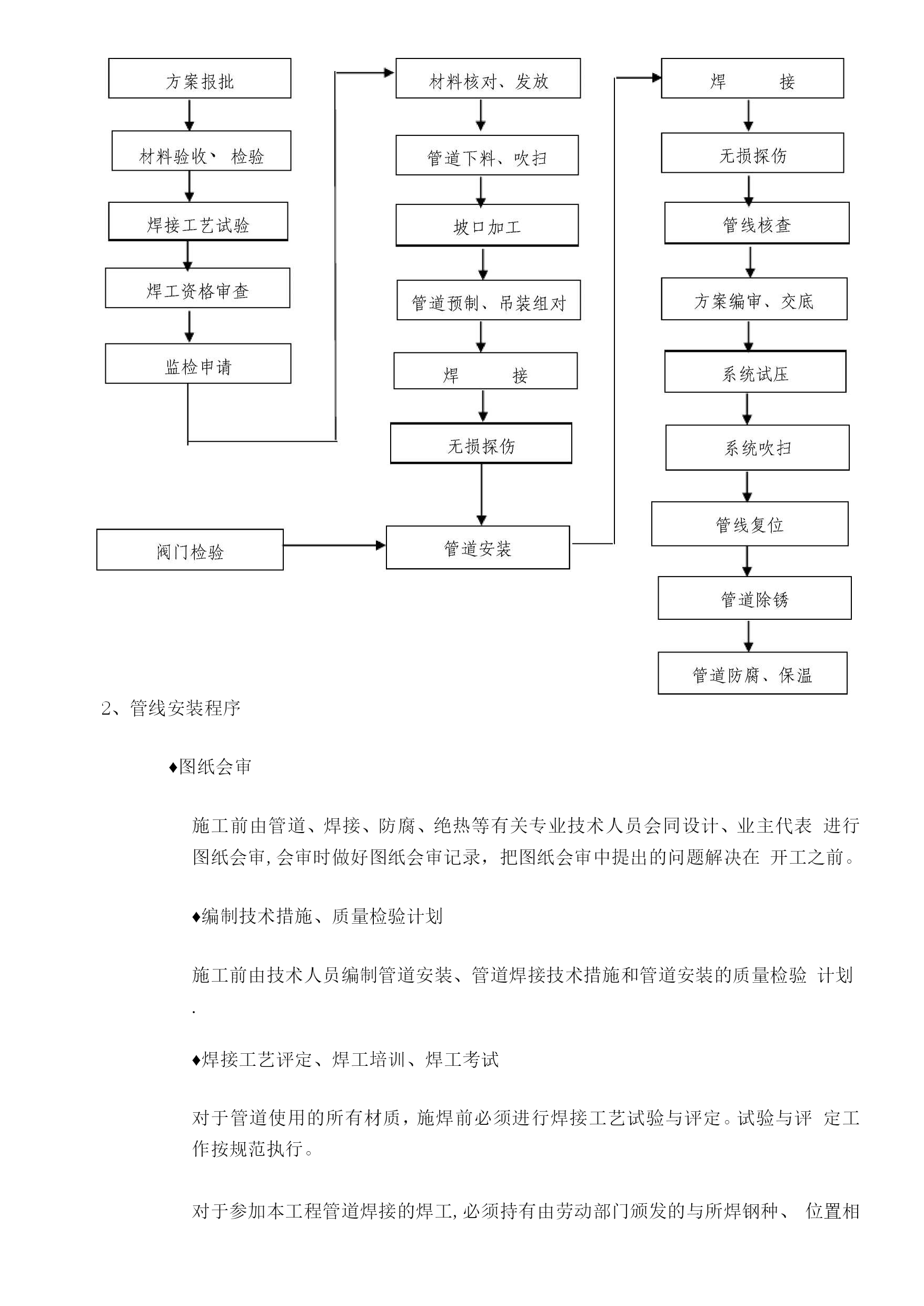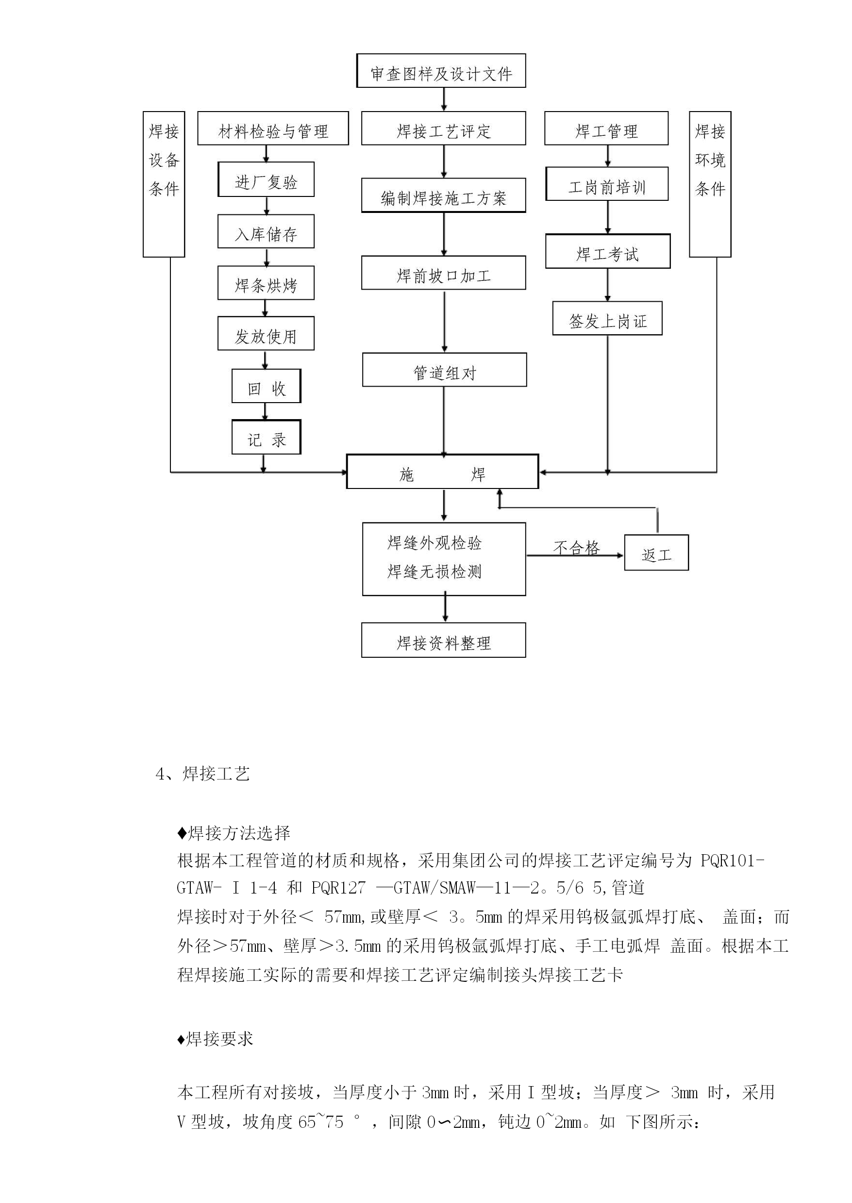 东莞玖龙纸业公司供热系统及生产返回水系统管道改造安装工程压力管道施工方案编制:审核:批准:广东省石油化工建设集团公司0年十二月六日一、工程概况东莞玖龙纸业公司地龙片区向玖龙电厂供热系统及生产返回水系统管道安装工程由广东省轻纺建筑设计院设计,施工范围包括蒸汽管道的安装、无损检测、水压试验、吹扫及管道保温。1、工程范围:1)从地龙片区13—15#机组向玖龙、海龙等老厂造纸车间供气,2)生产返回水由玖龙热电分厂T海龙热电分厂T地龙热电分厂。2、设计参数1)蒸汽管设计压力:1.2MPa,设计温度:260°C,管径:DN8、DN5设计压力:1。0MPa,设计温度:260C,管径:DN450、DN3设计压力:1.6MPa,设计温度:260C,管径:DN4、DN350.2)生产返回水管道:设计压力:0.7MPa,设计温度:120C,管径:DN3。设计压力:0。7MPa,设计温度:120C,管径:DN2。利用原有生产返回水管DN3一条.3、主要工程量:序号名称规格数量(m)材质一、蒸汽管1螺旋焊接钢管GB/T3091-21(^820x10356820#2无缝钢管GB3087-28(^630x10520#3^530x99020#4^480x91520#5^426x969020#6"7x999020#(^325x89020#7^57x3。5125020#8(^25x221020#二、冷凝水管1无缝钢管GB8163-28(^325x8153020#2(^219x6108020#三、补偿器1直管旁通压力平衡型波纹式1422大拉杆横向型波纹补偿器30二、。施工依据东莞玖龙纸业公司地龙片区向玖龙电厂供热系统及生产返回水系统管道安装工程招标书、施工合同广东省轻纺建筑设计院施工图纸《工业金属管道工程施工及验收规范》(GB50235-97)《现场设备、工业管道焊接工程施工及验收规范》(GB50236-98)《工业设备及管道绝热工程施工及验收规范》(GBJ126-28)《特种设备安全技术监察条例》(国务院令第549)《压力管道安全管理与监察规定》工业管道篇(TSGD1-29)《压力管道规范一工业管道》(GB/T20801-26)《火力发电厂保温油漆设计规程》(DL/T5072-1997)《火力发电厂汽水管道设计技术规定》(DL/T5054-1996)《承压设备无损检测》(JB/T4730-25)集团公司《压力管道安装工艺标准》集团公司QHSE管理文件三、.材料检验管道组成件(管子、阀门、管件、法兰等)必须具有质量证明书或合格证,其质量不得低于国家现行标准的规定.管道组成件使用前应进行外观检查,不得有裂纹、缩孔、夹渣、折迭、重皮等缺陷,无超标锈蚀、凹陷及其他机械损伤,外径偏差及壁厚偏差应符合标准。管道组成件应分区堆放。本工程所使用的管子,使用前应按设计要求核对管子的规格、数量和标记。管子的质量证明书应包括以下内容:产品标准号;钢的牌号;炉罐号、批号、交货状态、重量和件数;品种名称、规格及质量等级;产品标准中规定的各项检验结果。管件应附有制造厂合格证明书,并确认其化学成分,机械性能是否符合设计要求,每批管件抽查5%,外径及壁厚应符合GB50235-97的规定。管道标准按设计图纸要求:蒸汽螺旋焊接钢管GB/T3091—21、蒸汽无缝钢管GB3087-28、冷凝水无缝钢管GB8163—28,管件标准GB/T12459—25。阀门入库前与安装前应逐个进行外观检查,不得有损坏、锈蚀、砂眼、裂纹、缺件、脏污、名牌脱落及色标不符等情况,阀门操作灵活轻便,进出均有盖板封闭。阀门应从每批中抽查10%,且不得少于1个,进行壳体压力试验及密封试验,当不合格时应加倍抽查,仍不合格则应更换,阀门的试验压力不得小于公称压力的1。5倍,试验时间不得少于5min,以壳体填料无渗漏为合格,密封试验宜以公称压力进行,以阀壳体密封面不漏为合格,试压后应排除阀内积水并吹干.蒸汽管道用阀门按以上方法进行壳体压力试验及密封试验,安全阀应按设计要求规定的压力送劳动检测部门进行调试,并要有调试单位签发的安全阀调试证明书方能使用。阀门试验应以洁净水为介质,试验合格后应立即将水渍清除干净。螺栓、螺母的螺纹应完整,无划痕、毛刺等缺陷。螺栓、螺母应配合良好,无松动或卡涩现象。法兰密封面不得有径向划痕、翘曲等缺陷,凹凸面法兰能自然嵌合,凸面高度不得小于凹槽深度。缠绕式垫片密封面不得有径向划痕、麻点、毛刺、松散、翘曲等缺陷,钢带与填充带应紧密贴合,层次均匀,无断裂、重迭、空隙、弯曲等缺陷。焊接工程所用的材料,应符合设计文件的规定.焊接材料必须具有制造厂的质量证明书,其质量不得低于国家现行标准的规定。焊条烘焙前应认真核