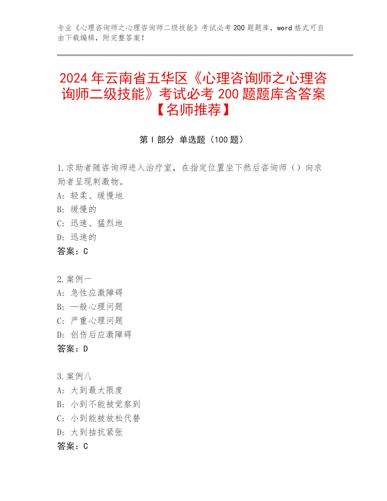 2024年云南省五华区《心理咨询师之心理咨询师二级技能》考试必考200题题库含答案【名师推荐】