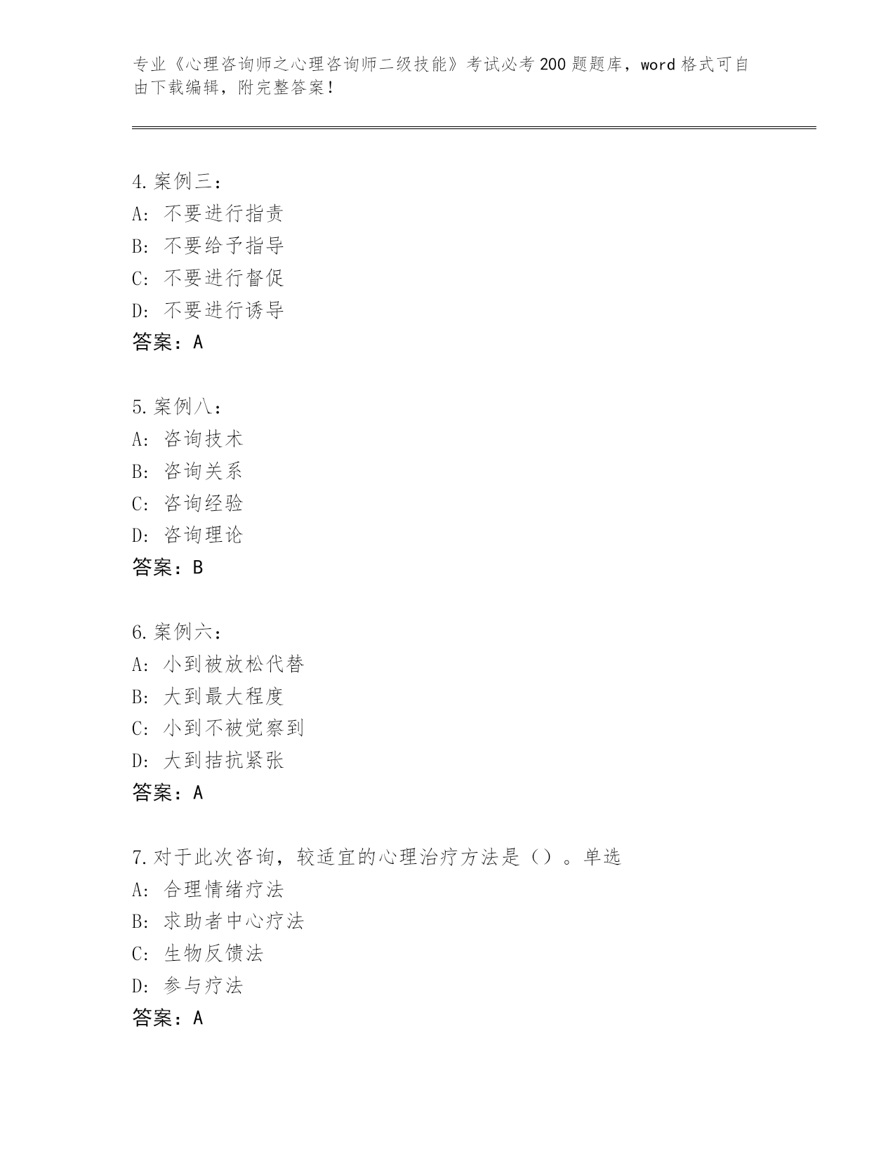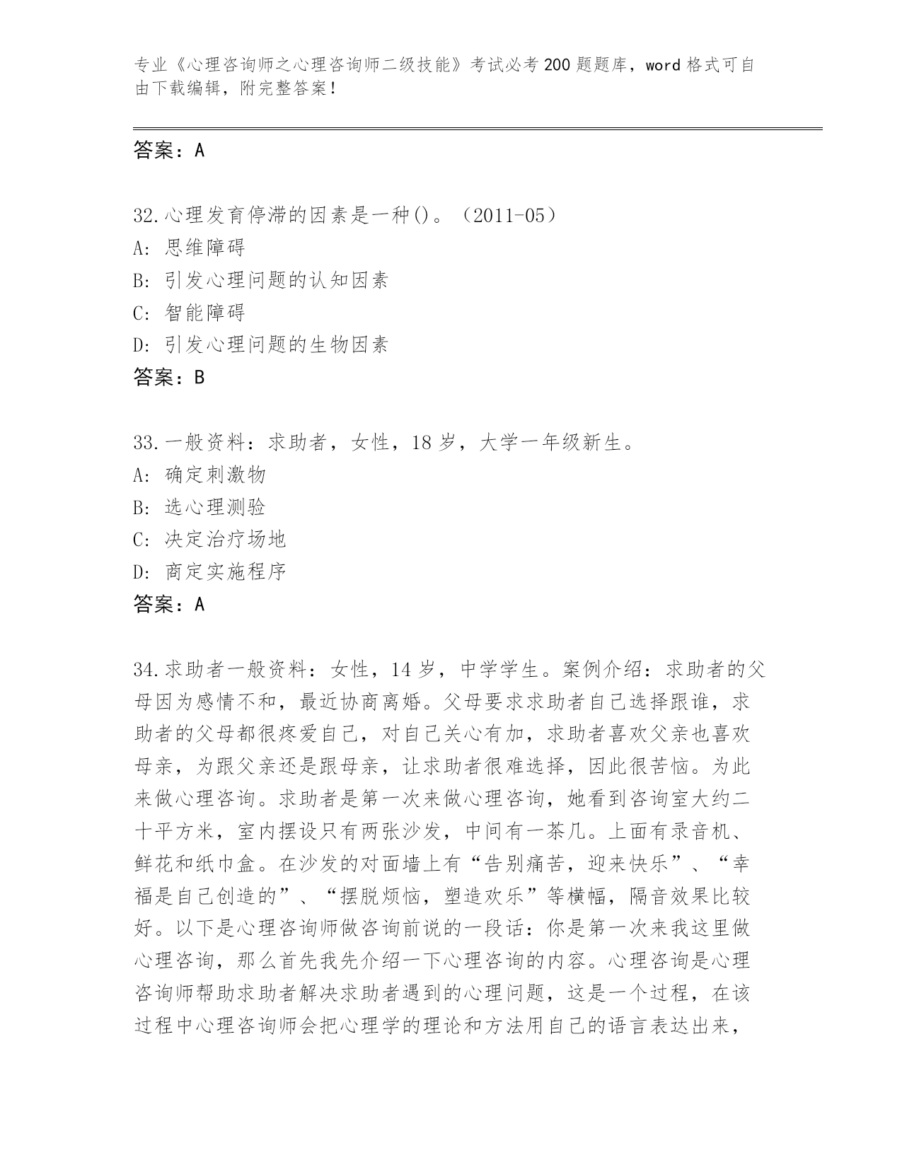 河南省2024年《心理咨询师之心理咨询师二级技能》考试必考200题王牌题库含答案(名师推荐)