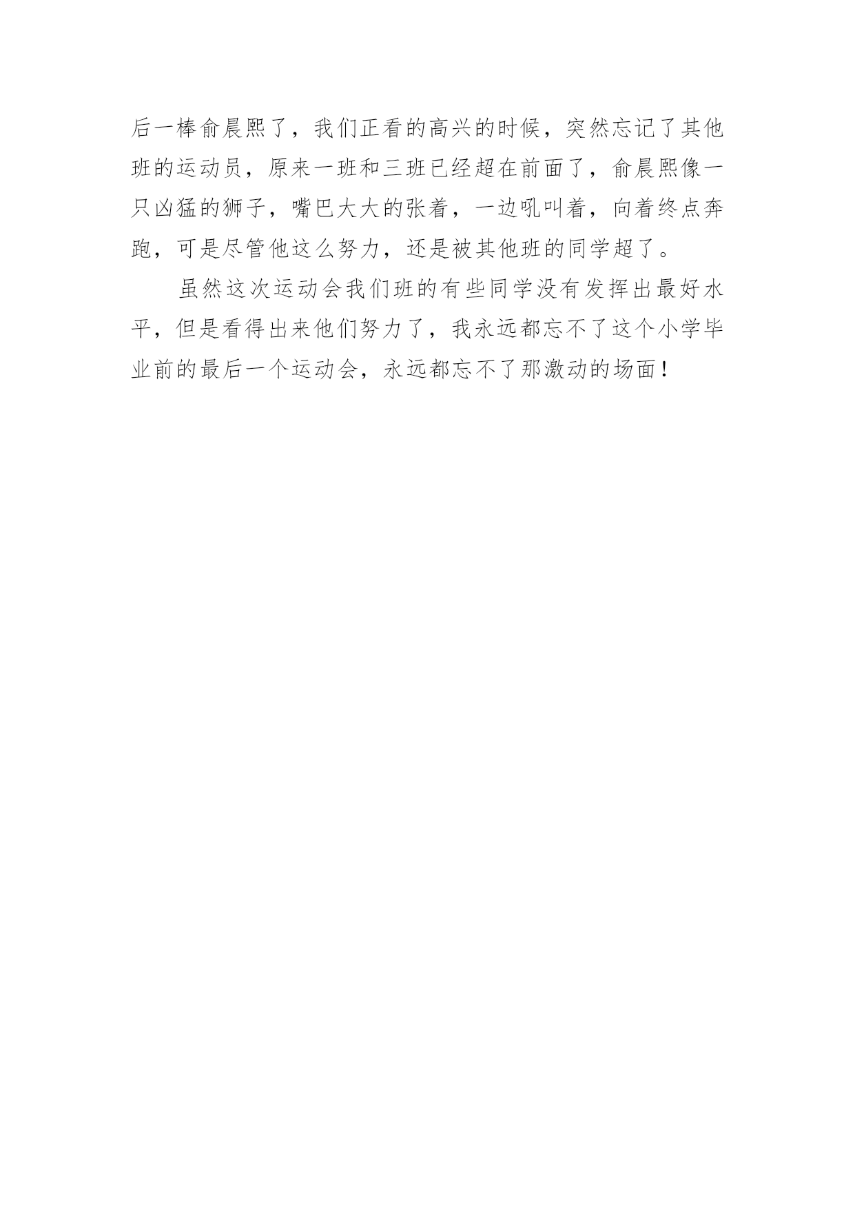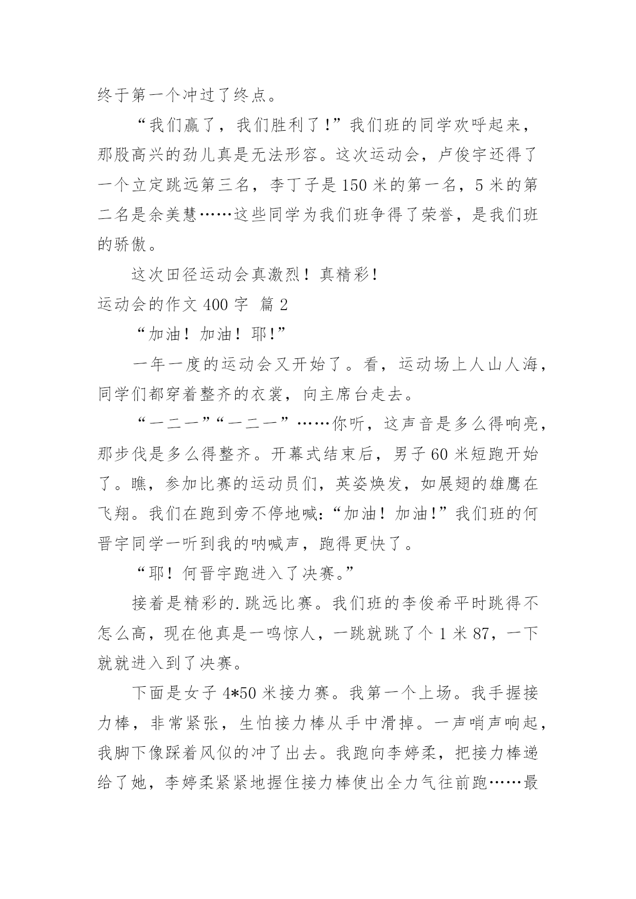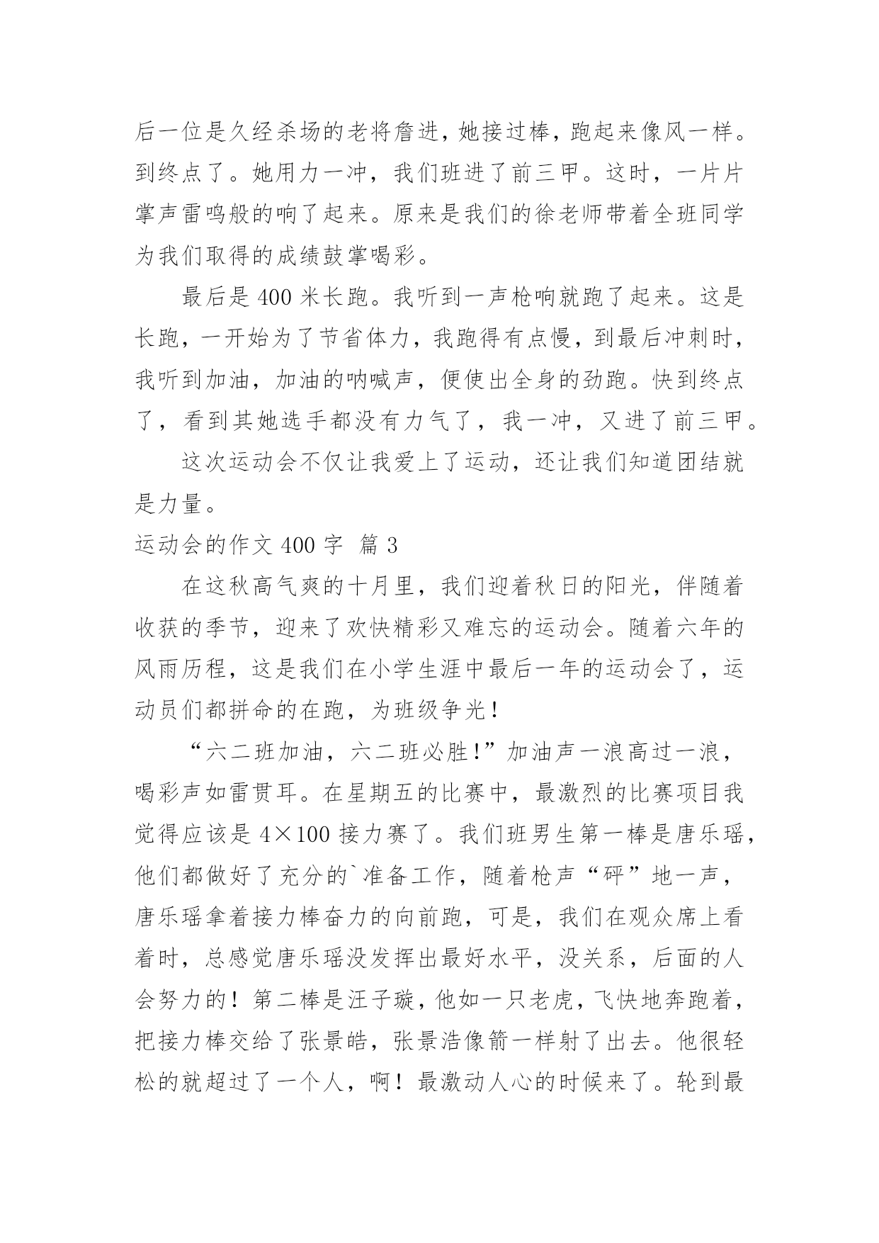 运动会的作文400字【实用】运动会的作文400字3篇在平凡的学习、工作、生活中,大家都有写作文的经历,对作文很是熟悉吧,作文根据体裁的不同可以分为记叙文、说明文、应用文、议论文。为了让您在写作文时更加简单方便,下面是小编为大家收集的运动会的作文400字3篇,希望对大家有所帮助。运动会的作文400字篇1星期五,我们学校隆重地举行了第21届冬季田径运动会。这天,操场上热闹非凡,加油声、欢呼声、鼓掌声此起彼伏。瞧,300米跑步比赛马上就要开始了,场上的运动员蓄势待发,就像战场上的勇士,一个个雄心勃勃,因为他们要为集体的荣誉而战。“啪”随着一声哨响,运动员们就像离弦的箭向终点冲去,从我们面前飞速地“过”。“加油,加油!”拉拉队的喊声震耳欲聋,全场一片沸腾。你瞧,我们班的跑步健将卢俊宇,只见他摆动着双臂,双脚生风似的,总算跑在最前面。可别班同学也不甘示弱,紧追着卢俊宇使劲往前跑。离终点越来越近时,还是不分上下,拉拉队的喊声更是一浪高过一浪。同学们的心绷得紧紧的我的`心简直提到了嗓子眼,真想过去推卢俊宇一把。卢俊宇果然没有辜负我们的的希望,他听到拉拉队在为自己喊加油,双脚就像踩着风火轮,最后终于第一个冲过了终点。“我们赢了,我们胜利了!”我们班的同学欢呼起来,那股高兴的劲儿真是无法形容。这次运动会,卢俊宇还得了一个立定跳远第三名,李丁子是150米的第一名,5米的第二名是余美慧……这些同学为我们班争得了荣誉,是我们班的骄傲。这次田径运动会真激烈!真精彩!运动会的作文400字篇2“加油!加油!耶!”一年一度的运动会又开始了。看,运动场上人山人海,同学们都穿着整齐的衣裳,向主席台走去。“一二一”“一二一”……你听,这声音是多么得响亮,那步伐是多么得整齐。开幕式结束后,男子60米短跑开始了。瞧,参加比赛的运动员们,英姿焕发,如展翅的雄鹰在飞翔。我们在跑到旁不停地喊:“加油!加油!”我们班的何晋宇同学一听到我的呐喊声,跑得更快了。“耶!何晋宇跑进入了决赛。”接着是精彩的.跳远比赛。我们班的李俊希平时跳得不怎么高,现在他真是一鸣惊人,一跳就跳了个1米87,一下就就进入到了决赛。下面是女子4*50米接力赛。我第一个上场。我手握接力棒,非常紧张,生怕接力棒从手中滑掉。一声哨声响起,我脚下像踩着风似的冲了出去。我跑向李婷柔,把接力棒递给了她,李婷柔紧紧地握住接力棒使出全力气往前跑……最后一位是久经杀场的老将詹进,她接过棒,跑起来像风一样。到终点了。她用力一冲,我们班进了前三甲。这时,一片片掌声雷鸣般的响了起来。原来是我们的徐老师带着全班同学为我们取得的成绩鼓掌喝彩。最后是400米长跑。我听到一声枪响就跑了起来。这是长跑,一开始为了节省体力,我跑得有点慢,到最后冲刺时,我听到加油,加油的呐喊声,便使出全身的劲跑。快到终点了,看到其她选手都没有力气了,我一冲,又进了前三甲。这次运动会不仅让我爱上了运动,还让我们知道团结就是力量。运动会的作文400字篇3在这秋高气爽的十月里,我们迎着秋日的阳光,伴随着收获的季节,迎来了欢快精彩又难忘的运动会。随着六年的风雨历程,这是我们在小学生涯中最后一年的运动会了,运动员们都拼命的在跑,为班级争光!“六二班加油,六二班必胜!”加油声一浪高过一浪,喝彩声如雷贯耳。在星期五的比赛中,最激烈的比赛项目我觉得应该是4×100接力赛了。我们班男生第一棒是唐乐瑶,他们都做好了充分的`准备工作,随着枪声“砰”地一声,唐乐瑶拿着接力棒奋力的向前跑,可是,我们在观众席上看着时,总感觉唐乐瑶没发挥出最好水平,没关系,后面的人会努力的!第二棒是汪子璇,他如一只老虎,飞快地奔跑着,把接力棒交给了张景皓,张景浩像箭一样射了出去。他很轻松的就超过了一个人,啊!最激动人心的时候来了。轮到最后一棒俞晨熙了,我们正看的高兴的时候,突然忘记了其他班的运动员,原来一班和三班已经超在前面了,俞晨熙像一只凶猛的狮子,嘴巴大大的张着,一边吼叫着,向着终点奔跑,可是尽管他这么努力,还是被其他班的同学超了。虽然这次运动会我们班的有些同学没有发挥出最好水平,但是看得出来他们努力了,我永远都忘不了这个小学毕业前的最后一个运动会,永远都忘不了那激动的场面!