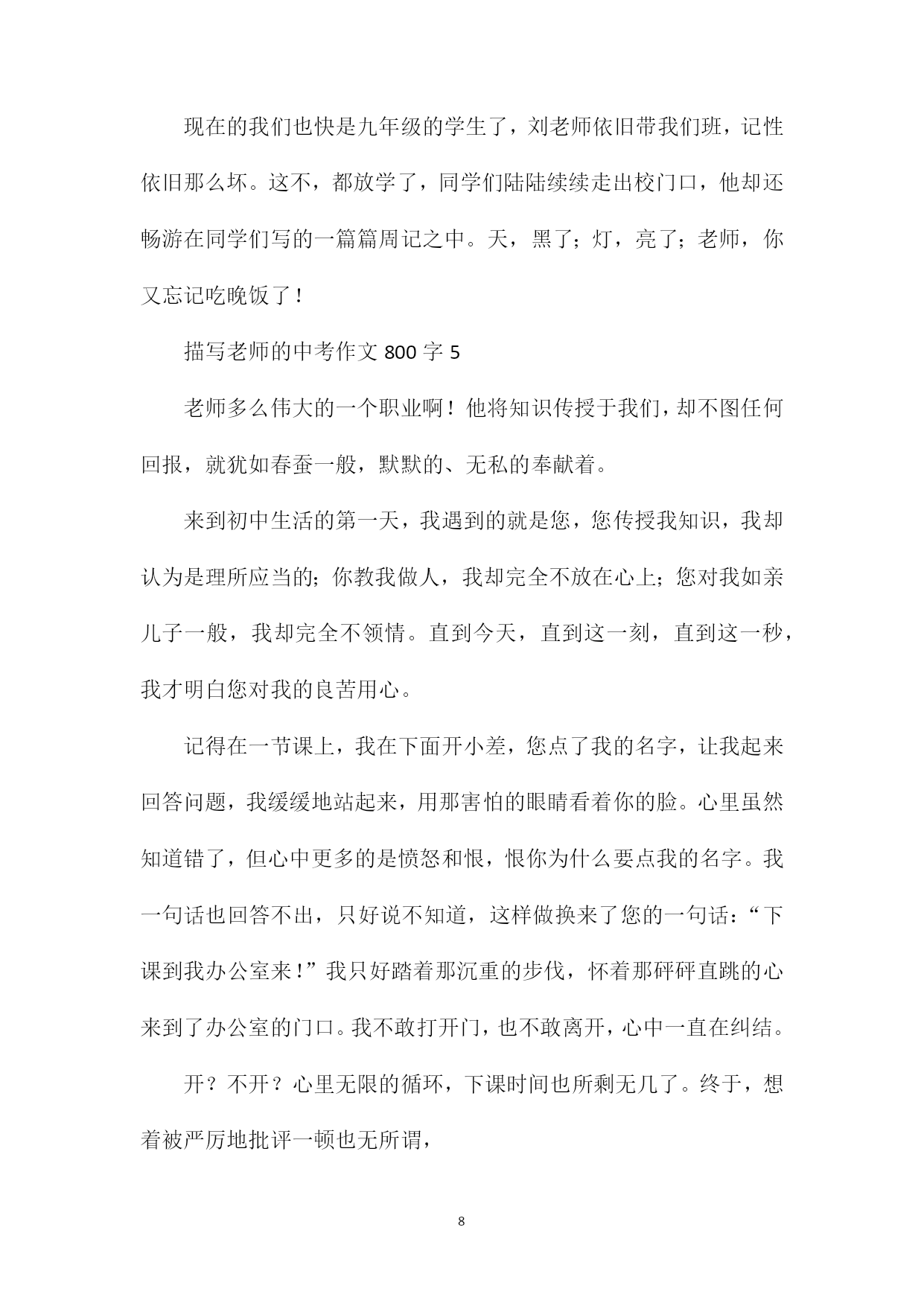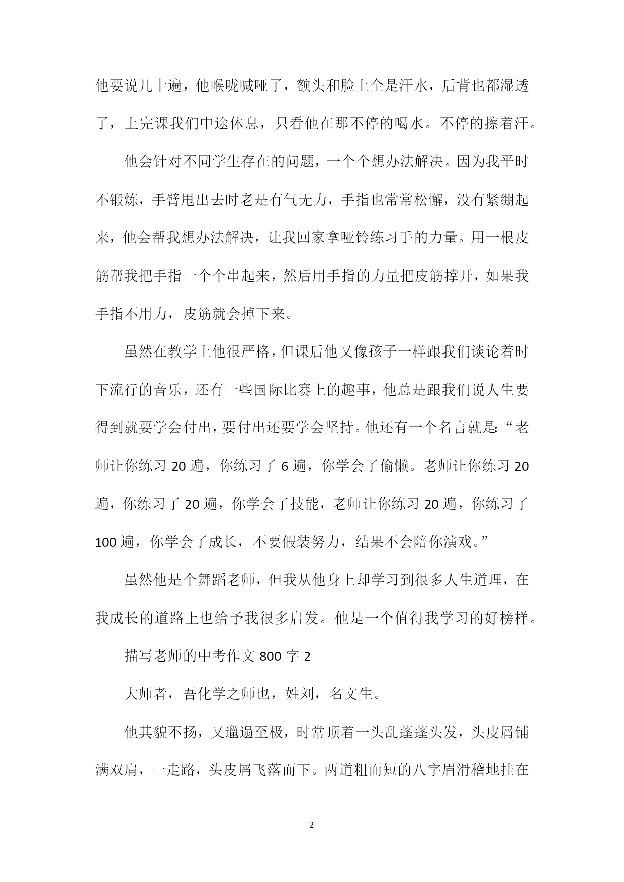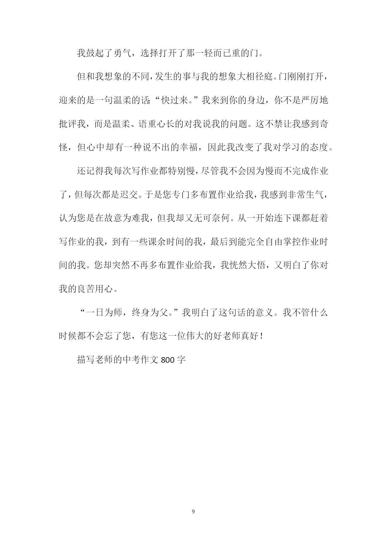 PAGEPAGE9描写老师的中考作文800字光阴似箭,不知不觉中我们已经成为一名初三的学生了。在这三年中我们认识了许多老师,每一个老师都和蔼可亲,但有一个老师却让我们十分敬佩。下面就是xx给大家带来的描写老师的中考作文800字,希望能帮助到大家!描写老师的中考作文800字1一提到跳拉丁舞的老师,大家脑海里浮现出的肯定是年轻漂亮的女老师,她们有着天鹅颈,柳枝腰,大长腿……可是,我的老师这些一样都没有,因为他是一个有着许多国际奖杯的男老师。老师二十岁出头,圆圆的脸蛋上嵌着一双炯炯有神的眼睛,跳起舞来他的眼睛会发光发亮,看起来特别神气。他身材比例匀称,手臂和双腿都有着很结实的肌肉,别看他像个健身教练,可他跳起舞来却柔中带刚,刚中带柔。每一个甩手,甩胯,每一个转身都非常有力量。每次上舞蹈课,他都是把头发梳的很整齐,跟电视上经常走红毯的明星一样耀眼,好像时刻准备着去参加比赛。只要一进入工作状态,他就变得非常严肃,对动作的细节也非常严格,只要教新动作,他都会亲自一个个纠正,让我们反复练习,哪怕十几遍,他都不厌其烦。有一次我们学习扭胯,他让我们每个人抓着跳舞杆,用手扶住我们的腰,一个一个的扭,让我们找到感觉。同样的注意事项,同样的拍子,他要说几十遍,他喉咙喊哑了,额头和脸上全是汗水,后背也都湿透了,上完课我们中途休息,只看他在那不停的喝水。不停的擦着汗。他会针对不同学生存在的问题,一个个想办法解决。因为我平时不锻炼,手臂甩出去时老是有气无力,手指也常常松懈,没有紧绷起来,他会帮我想办法解决,让我回家拿哑铃练习手的力量。用一根皮筋帮我把手指一个个串起来,然后用手指的力量把皮筋撑开,如果我手指不用力,皮筋就会掉下来。虽然在教学上他很严格,但课后他又像孩子一样跟我们谈论着时下流行的音乐,还有一些国际比赛上的趣事,他总是跟我们说人生要得到就要学会付出,要付出还要学会坚持。他还有一个名言就是:“老师让你练习20遍,你练习了6遍,你学会了偷懒。老师让你练习20遍,你练习了20遍,你学会了技能,老师让你练习20遍,你练习了100遍,你学会了成长,不要假装努力,结果不会陪你演戏。”虽然他是个舞蹈老师,但我从他身上却学习到很多人生道理,在我成长的道路上也给予我很多启发。他是一个值得我学习的好榜样。描写老师的中考作文800字2大师者,吾化学之师也,姓刘,名文生。他其貌不扬,又邋遢至极,时常顶着一头乱蓬蓬头发,头皮屑铺满双肩,一走路,头皮屑飞落而下。两道粗而短的八字眉滑稽地挂在眼睛上方,整张脸像极了一个“囧字”,他总喜欢穿着或灰或黑的深色系衣服,将手背在身后慢慢踱步,乍一看像极了公园里遛鸟的大爷,形是大爷,神是大师。记得初见大师就被他的一个举动惊呆了:只见他推开教室门,闲庭信步,两手空空,在我们热切的目光下,拿起粉笔移步至黑板前,随即,有条不紊,将一节课的内容分割,从引出到解释到引伸,整个过程流畅似行云流水,板书扬扬洒洒布满整个黑板。那么多概念体系似乎已经在大师脑中刻骨铭心,无需带书便可如清泉般汩汩涌出。后经打听才知,大师之所以被称为大师,来源于他对化学学科几十年如一日的钻研,这才使他熟练掌握初、高中甚至大学的化学知识。不信,你瞧,许多我们百思不得其解的题,一经大师三言两语点拔,便如醒醐灌顶,豁然开朗。别看大师平常总喜欢板着一张脸显得很严肃,其实他也拥有许多幽默细胞。每次上课讲到动情之处,大师总不自觉地一拍双手,一扭腰,脸也跟着转几圈,紧接着左手伸在半空中微微蜷屈,似乎想要摘什么果子,在空中左右旋着圈,左脚也向前探去,右手却又背在微弯的背上,脸上表情极为丰富,两只眼睛瞪得像铜铃,小眼珠子迸射出激动兴奋的光。他还喜欢将整个身子都俯在讲台上,仅靠双手支撑,大半个身体都快探到第一排,兴奋地扫视教室后,用骄傲自豪的语气问道:“是不是!”神气十足。大师不仅在教学上很有一套,在教育学生上也非常智慧,记得有一次化学考试失利,我作为班内为数不多的60分以下的人,怀着忐忑不安的心情被大师“请”到办公室,本以为会看到大师如阴云密布的脸、会受到批头盖脸一顿骂。没想到,大师脸色如常,甚至透露出些温和,坐下亲切地询问我卷子上有哪些疑难。我一一列出,他一一详细耐心地给我讲解,不仅剖析了出题意图,又耐心说出解题思路,若我面露难色,他还会不厌其烦换另一种更易理解的讲法。分析完毕后,大师语重心长地告诫:“平时有不懂的就及时问,切忌堆积难题,要注重基础,多背笔记,更重要的是建立自信,相信只要把基础巩固好,上60也不是难事”,说完又拍拍我的肩膀,潇洒地挥挥手:“去吧”。这就是我们的刘大师,教书育人数十载,质朴敬业永不改。描写老师的中考作文800字3有人说“老师是梯,以伟岸的身躯,托着我们稚嫩的双脚,一步步攀高,攀高……”有人说“老师是烛,