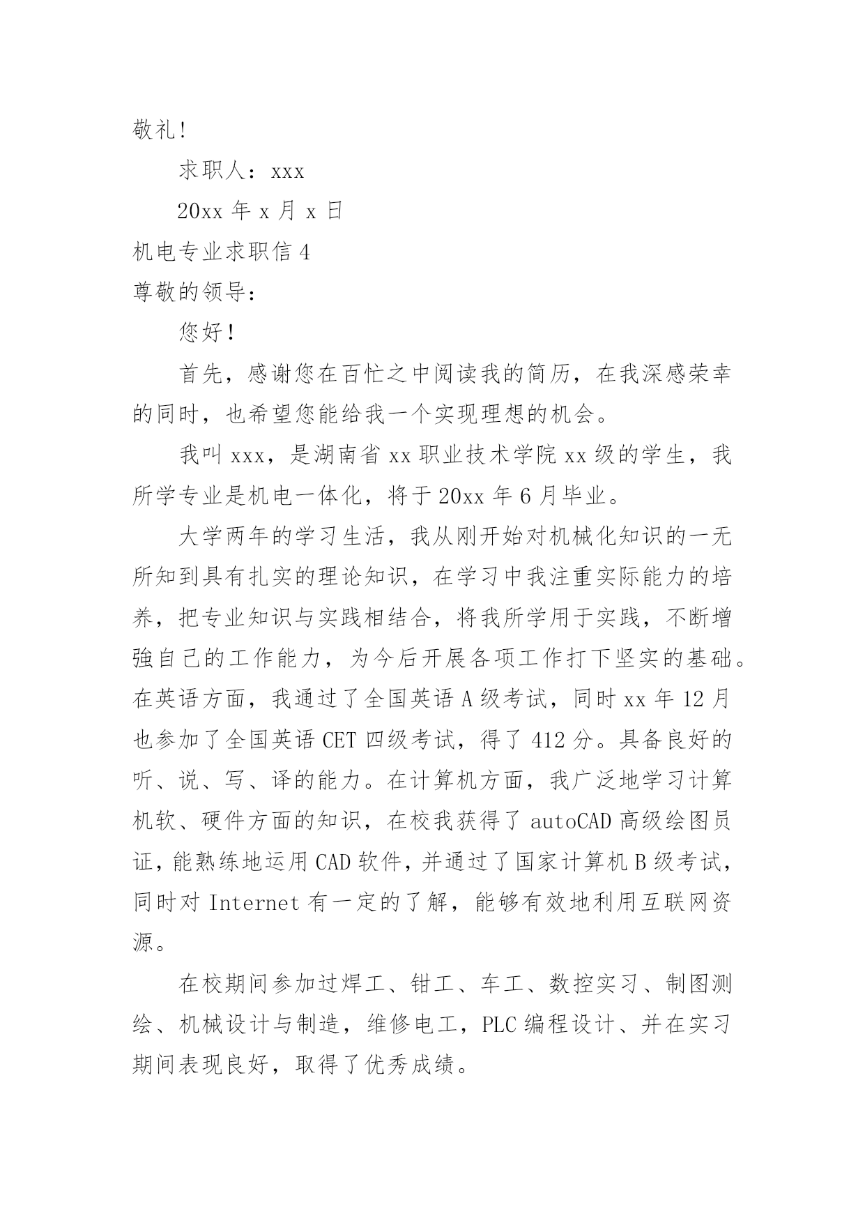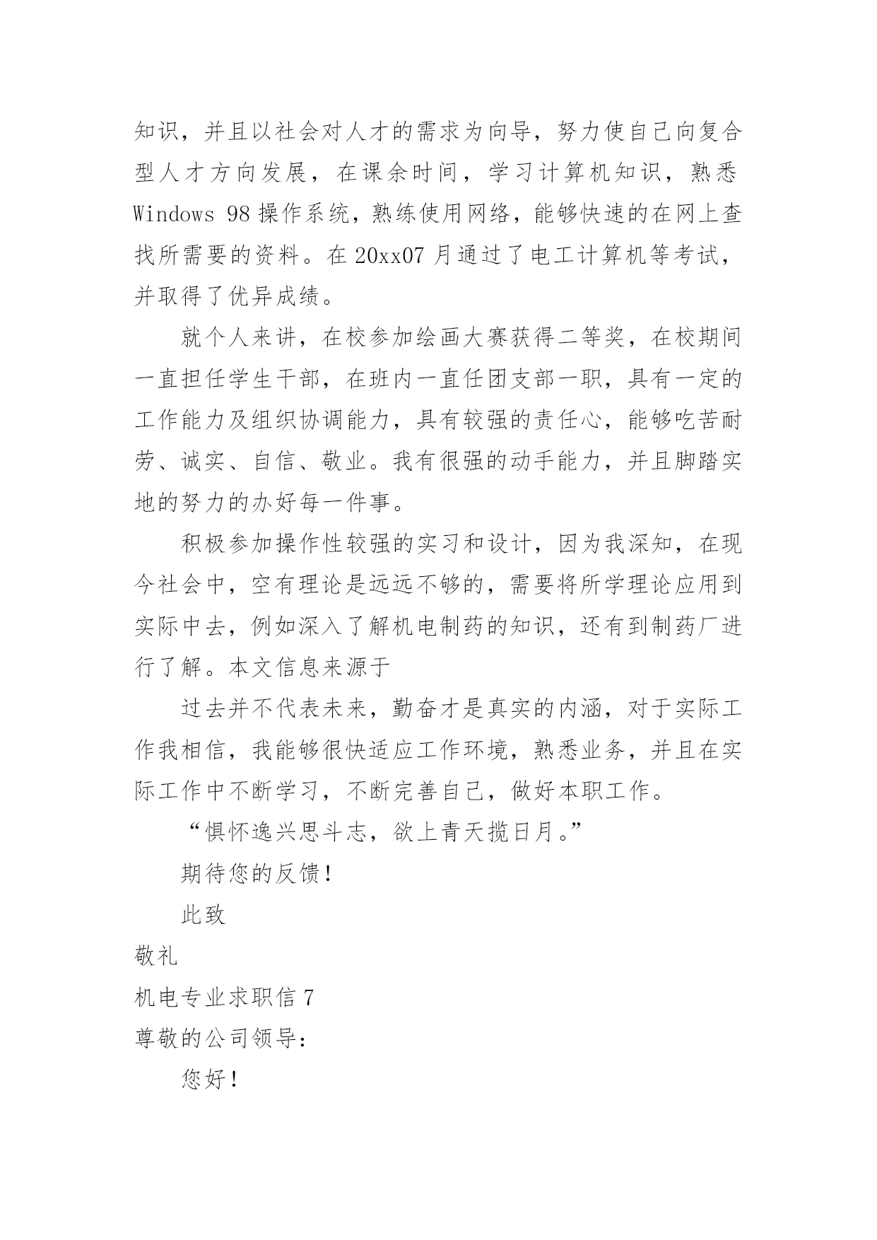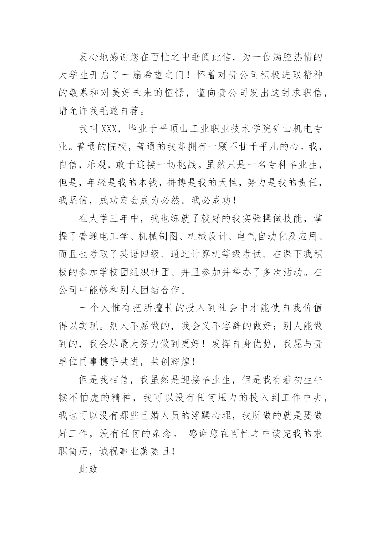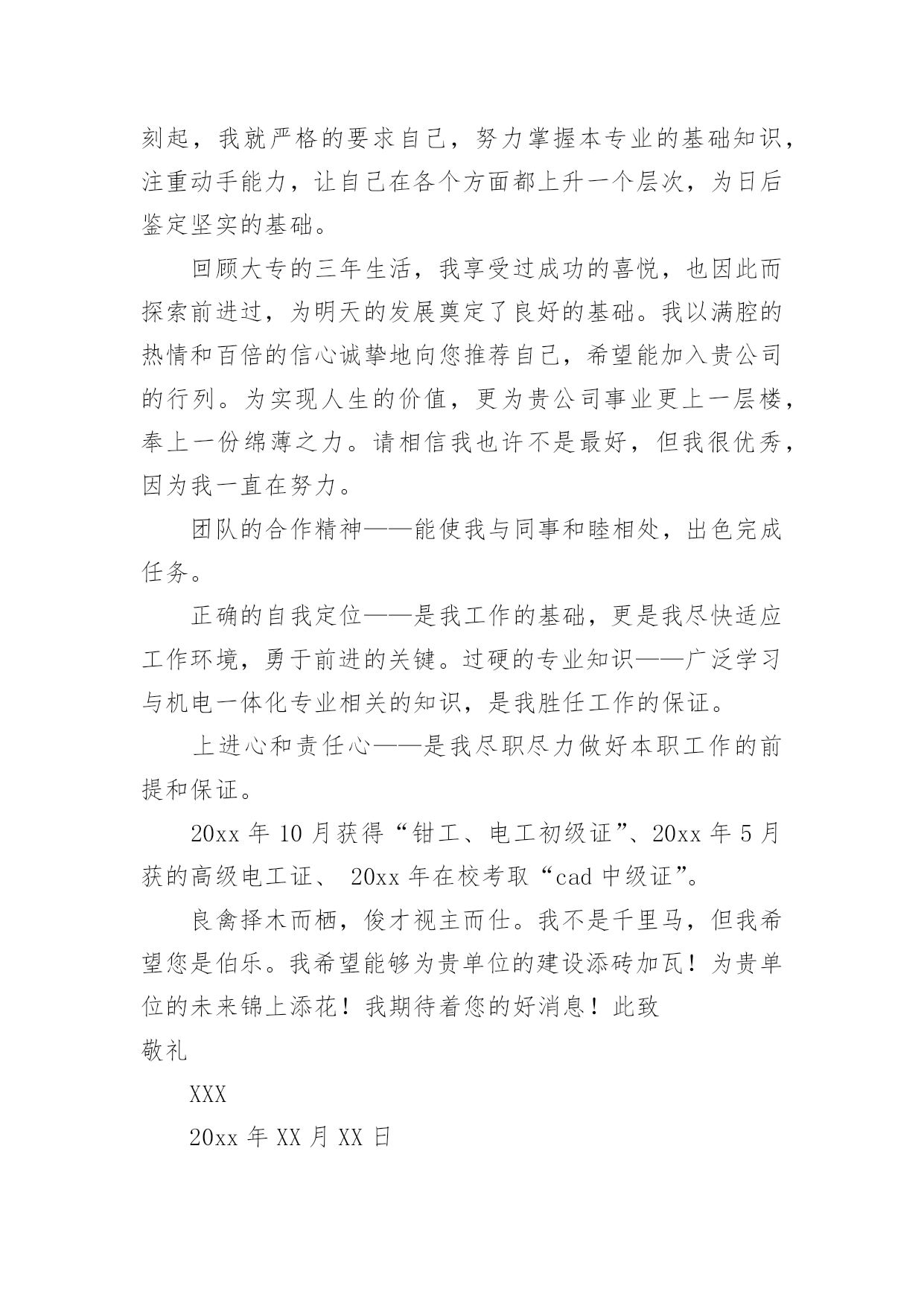 机电专业求职信机电专业求职信人生天地之间,若白驹过隙,忽然而已,又到了求职找工作的时候,是时候静下心来写一封求职信了哦。求职信怎样写才能让人满意呢?下面是小编收集整理的机电专业求职信,欢迎大家分享。机电专业求职信1尊敬的贵公司领导:您好!首先感谢您在百忙之中阅读我的个人简历,我不甚荣幸与感激。我来自一个农民家庭,自幼父母就培养了自己吃苦耐劳的精神。诚实守信是我做人的基本原则。我觉得不管做什么事之前都要先学会做人,这就是为什么为人在前处事在后的最重要原因吧,再说一个人很有才可是无德也不会被录用,更重要的是这不仅是一个人的人格魅力的体现同样也是一个人职业素养的体现。我有较强的上进心、责任心以及团队合作精神,具备良好的独立分析解决问题的能力,做事积极踏实,能吃苦耐劳,有良好的沟通能力。20xx考入阜阳这也技术学院机电一体化专业。我深知自己生长在竞争与挑战并存的时代,也了解竞争的激烈和现实的残酷。因为作为一个大专生来说,起点就比别人低。因此从踏入大学大门的那一刻起,我就严格的要求自己,努力掌握本专业的基础知识,注重动手能力,让自己在各个方面都上升一个层次,为日后鉴定坚实的基础。回顾大专的三年生活,我享受过成功的喜悦,也因此而探索前进过,为明天的发展奠定了良好的基础。我以满腔的热情和百倍的信心诚挚地向您推荐自己,希望能加入贵公司的行列。为实现人生的价值,更为贵公司事业更上一层楼,奉上一份绵薄之力。请相信我也许不是最好,但我很优秀,因为我一直在努力。团队的合作精神——能使我与同事和睦相处,出色完成任务。正确的自我定位——是我工作的基础,更是我尽快适应工作环境,勇于前进的关键。过硬的专业知识——广泛学习与机电一体化专业相关的知识,是我胜任工作的保证。上进心和责任心——是我尽职尽力做好本职工作的前提和保证。20xx年10月获得“钳工、电工初级证”、20xx年5月获的高级电工证、20xx年在校考取“cad中级证”。良禽择木而栖,俊才视主而仕。我不是千里马,但我希望您是伯乐。我希望能够为贵单位的建设添砖加瓦!为贵单位的未来锦上添花!我期待着您的好消息!此致敬礼XXX20xx年XX月XX日机电专业求职信2尊敬的x公司人事部领导:您好!首先感谢您在百忙之中审阅我的这份求职材料,诚待您的指导。我叫xx,出生于1984年11月,女,壮族,共青团员,广西x县人,20xx年7月毕业于x民族工业中专机电技术应用专业。我生长在一个充满竞争和挑战,机遇和发展并存的年代。对未来,我充满希望。中专四年,我深深知道竞争的激烈与残酷,因此,我认真学习专业知识,从各门课程的基础知识出发,刻苦钻研,寻求内在规律,掌握基本技能,提高操能力,并取得良好的成绩。主修了电工学、工程力学、电子技术、机械拖动基础、机械制图、工厂电气控制设备、电力电子变流技术、机械设备与维修、控制工程基础等专业知识,实习期间,能将所学的理论知识与实践相结合,有较强的实际操作能力,得到同学和师傅的好评。在校期间,还积极参加各种社会活动,注重道德与能力的塑造和培养,担任校团委劳动委员、宣传委员,还担任校广播室的编辑,工作一丝不苟,认真负责,自己的组织领导能力、写作水平在工作中得到不断提高。曾获学校“三好学生”、“优秀团员”、“优秀团干”、“优秀编辑”等称号,其中20xx年度曾荣获“全区三好学生”光荣称号。四年的中专时光,我从一个稚气未脱的学生成长为德智体全面发展的人才,期间凝聚了我奋斗的艰辛和喜悦。但成绩属于过去,未来的成功要靠不断的努力拼搏。毕业一年多来,我换了两个工种,先在x市当过打字员,现在广州市的一家电子厂里打工。这些工作经历增加了我的工作经验和社会阅历,在今后的工作中将给我提供不可多得的借鉴和帮助。为开发铝矿资源,促进x铝工业的发展,广西华银铝业有限公司在x投巨资致力于建设中国乃至亚洲最大的铝工业基地。这是x人民的大喜事,作为x一员,我感到十分自豪和激动。本着发挥自身特长,服务铝业这一目的,我渴望成为广西华银铝业有限公司的一员,与同事们携手并进,为中国铝业的发展奉献自己的力量。也许我并非是众多求职者中最优秀的,但我会尽力做得最好。“天道酬勤”是我的信念,“自强不息”是我的追求。期盼您的赐教!最后,恭祝贵公司兴旺发达,蒸蒸日上!此致敬礼求职人:xxx20xx年xx月x日机电专业求职信3尊敬的领导:您好!首先衷心感谢您在百忙之中阅读我的求职应聘信,为一位满腔热情的大学生开启一扇希望之门。今毛遂自荐,诚待您的指导。我是xxxx技术学院09届机电系的一名应届毕业生。今天,我是怀着平静而又激动的心情呈上这份自荐书。之所以平静,我的知识和能力不会让你们失望,将无愧于您出示任何有权威人士的推荐书来为我谋得职业,也拿不出一摞摞的获奖证书来作为我的筹码,而只能凭自己十几年来刻苦学习的结果和自己吃苦耐劳的本性来作为