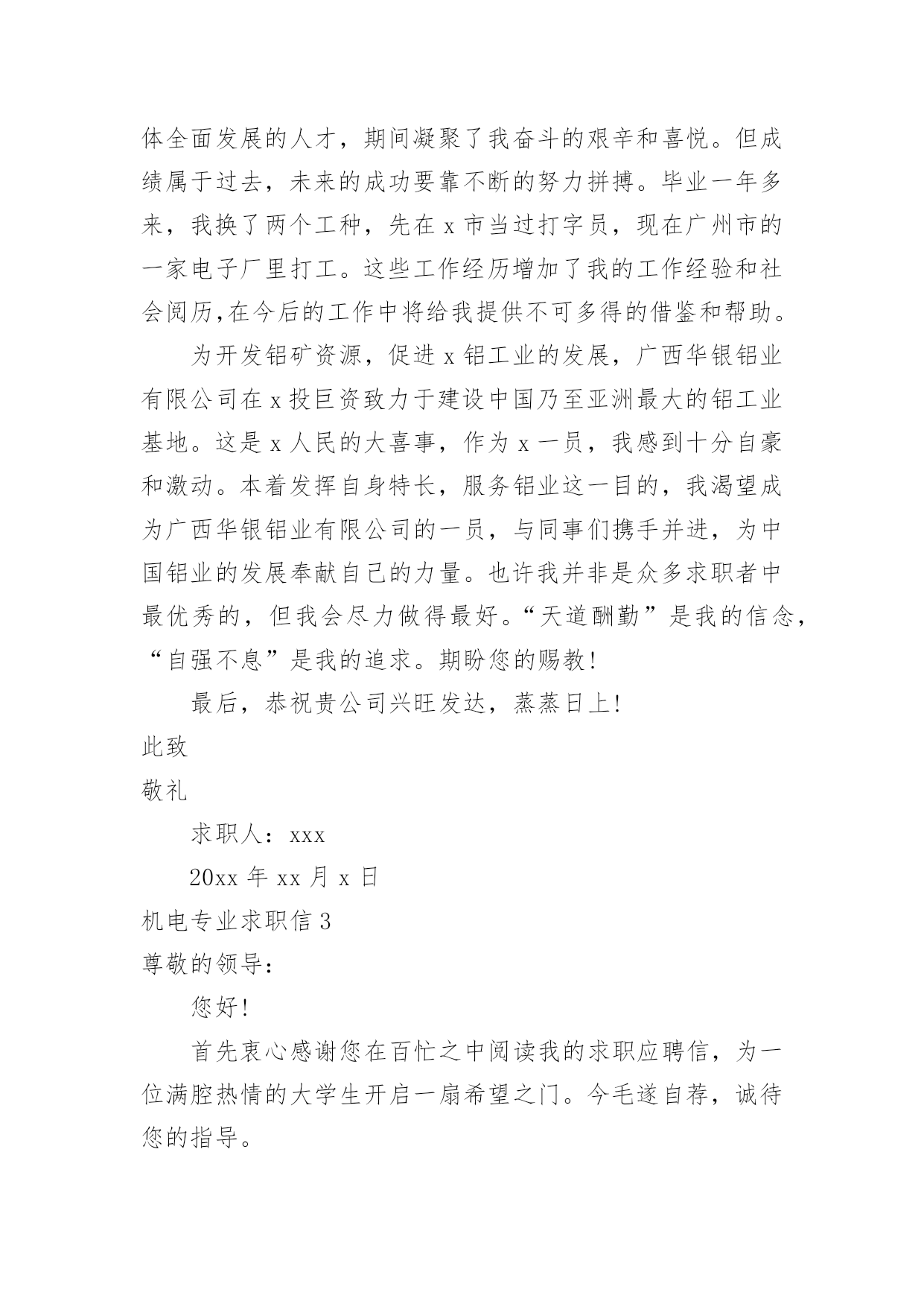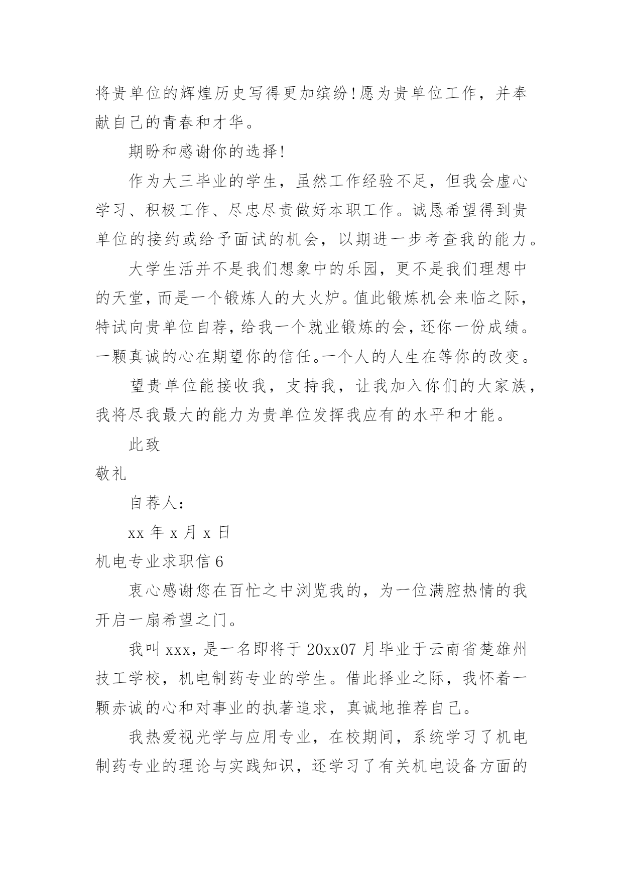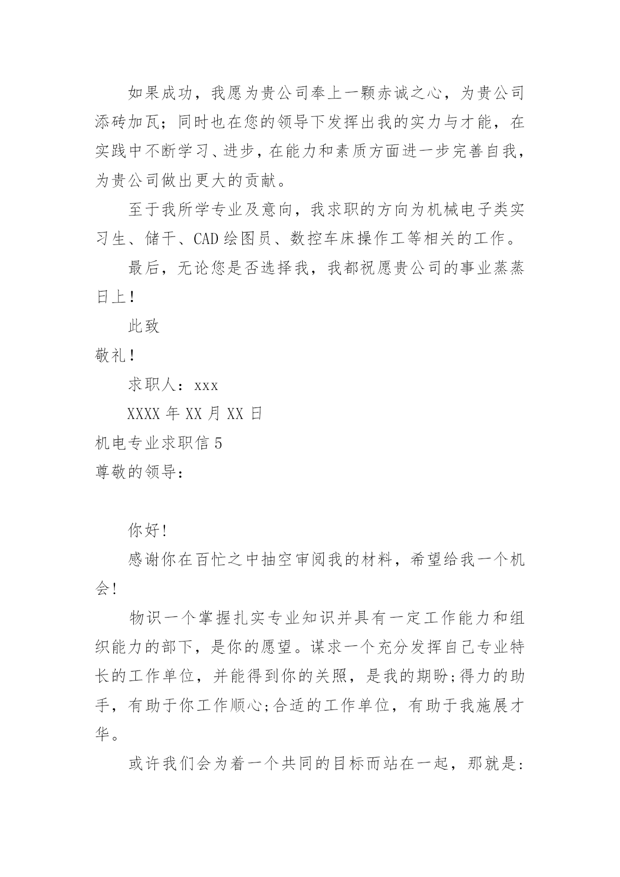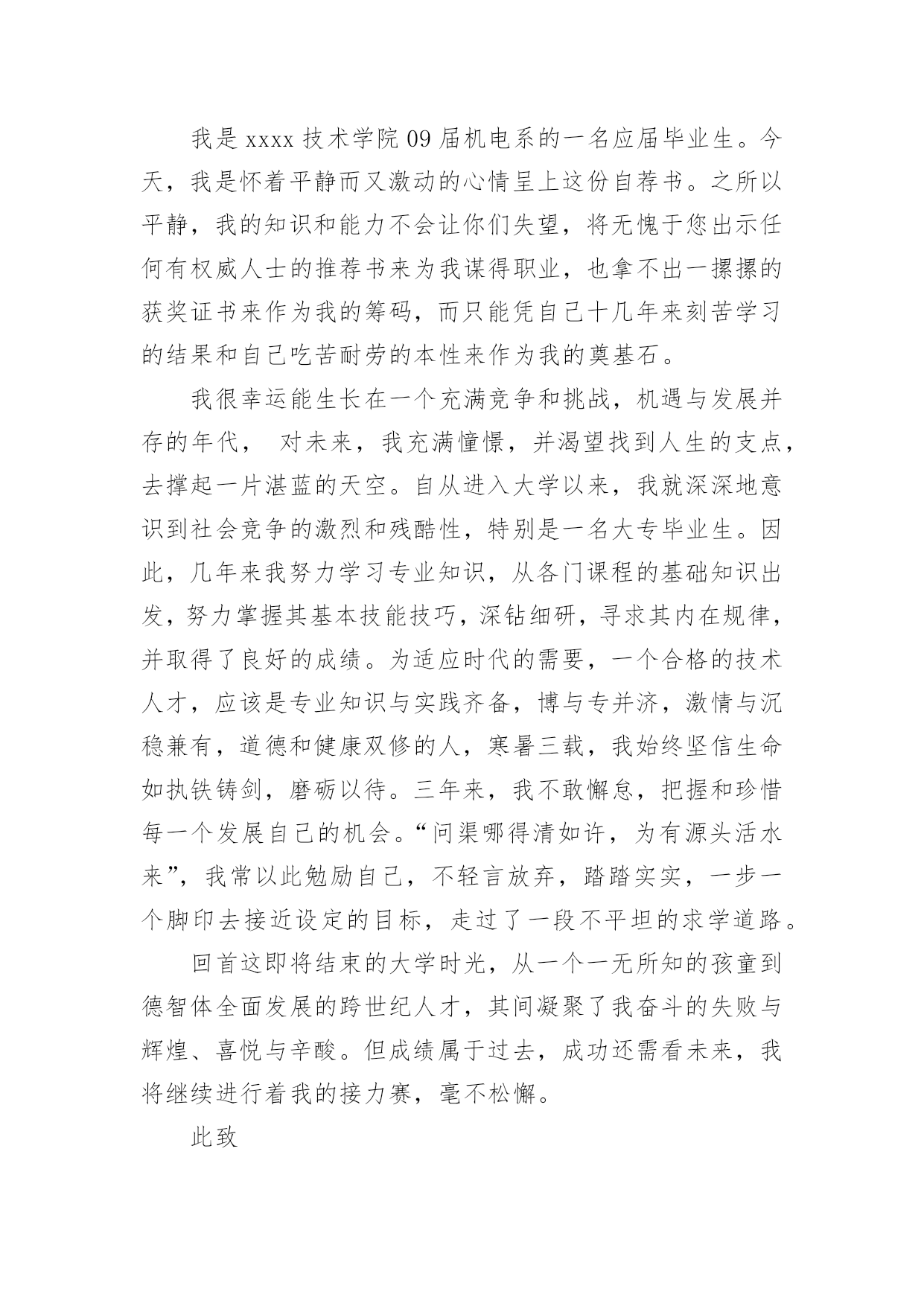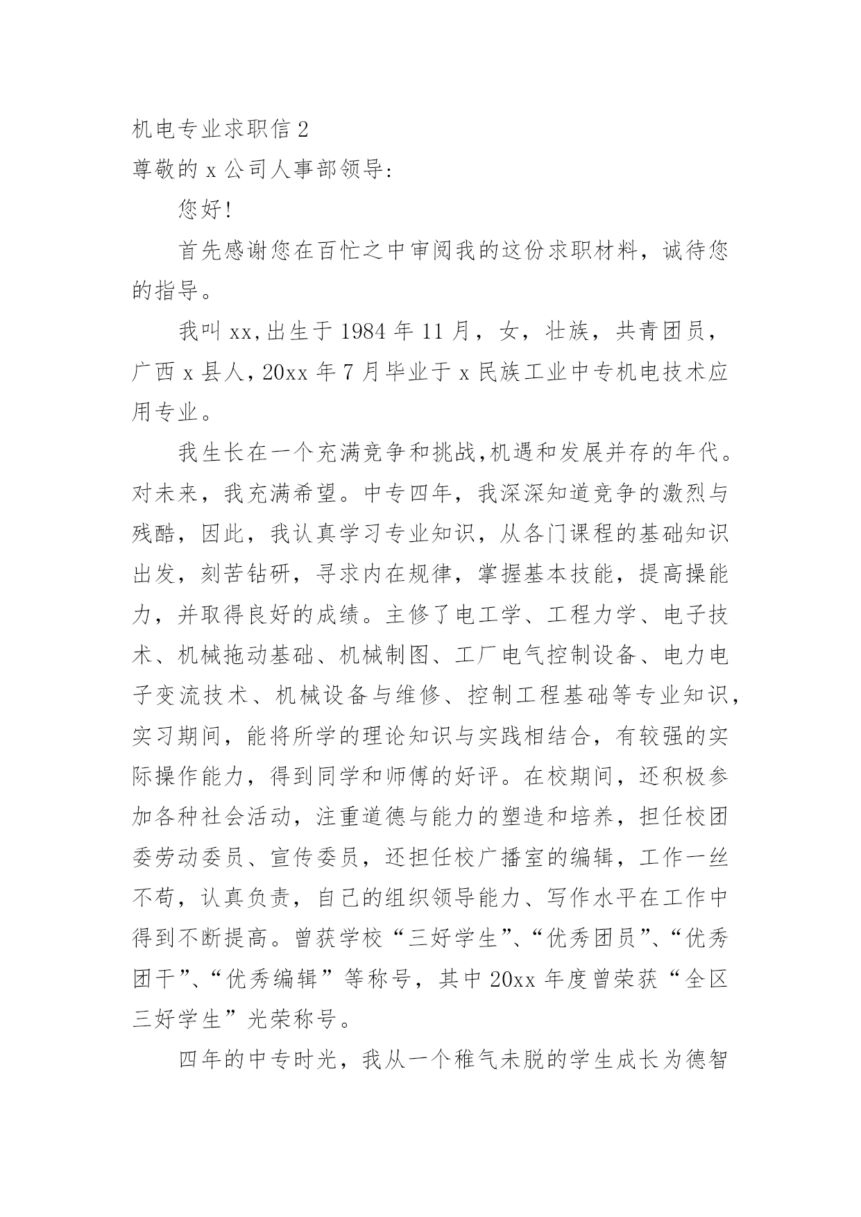 机电专业求职信机电专业求职信人生天地之间,若白驹过隙,忽然而已,又到了求职找工作的时候,是时候静下心来写一封求职信了哦。求职信怎样写才能让人满意呢?下面是小编收集整理的机电专业求职信,欢迎大家分享。机电专业求职信1尊敬的贵公司领导:您好!首先感谢您在百忙之中阅读我的个人简历,我不甚荣幸与感激。我来自一个农民家庭,自幼父母就培养了自己吃苦耐劳的精神。诚实守信是我做人的基本原则。我觉得不管做什么事之前都要先学会做人,这就是为什么为人在前处事在后的最重要原因吧,再说一个人很有才可是无德也不会被录用,更重要的是这不仅是一个人的人格魅力的体现同样也是一个人职业素养的体现。我有较强的上进心、责任心以及团队合作精神,具备良好的独立分析解决问题的能力,做事积极踏实,能吃苦耐劳,有良好的沟通能力。20xx考入阜阳这也技术学院机电一体化专业。我深知自己生长在竞争与挑战并存的时代,也了解竞争的激烈和现实的残酷。因为作为一个大专生来说,起点就比别人低。因此从踏入大学大门的那一刻起,我就严格的要求自己,努力掌握本专业的基础知识,注重动手能力,让自己在各个方面都上升一个层次,为日后鉴定坚实的基础。回顾大专的三年生活,我享受过成功的喜悦,也因此而探索前进过,为明天的发展奠定了良好的基础。我以满腔的热情和百倍的信心诚挚地向您推荐自己,希望能加入贵公司的行列。为实现人生的价值,更为贵公司事业更上一层楼,奉上一份绵薄之力。请相信我也许不是最好,但我很优秀,因为我一直在努力。团队的合作精神——能使我与同事和睦相处,出色完成任务。正确的自我定位——是我工作的基础,更是我尽快适应工作环境,勇于前进的关键。过硬的专业知识——广泛学习与机电一体化专业相关的知识,是我胜任工作的保证。上进心和责任心——是我尽职尽力做好本职工作的前提和保证。20xx年10月获得“钳工、电工初级证”、20xx年5月获的高级电工证、20xx年在校考取“cad中级证”。良禽择木而栖,俊才视主而仕。我不是千里马,但我希望您是伯乐。我希望能够为贵单位的建设添砖加瓦!为贵单位的未来锦上添花!我期待着您的好消息!此致敬礼XXX20xx年XX月XX日机电专业求职信2尊敬的x公司人事部领导:您好!首先感谢您在百忙之中审阅我的这份求职材料,诚待您的指导。我叫xx,出生于1984年11月,女,壮族,共青团员,广西x县人,20xx年7月毕业于x民族工业中专机电技术应用专业。我生长在一个充满竞争和挑战,机遇和发展并存的年代。对未来,我充满希望。中专四年,我深深知道竞争的激烈与残酷,因此,我认真学习专业知识,从各门课程的基础知识出发,刻苦钻研,寻求内在规律,掌握基本技能,提高操能力,并取得良好的成绩。主修了电工学、工程力学、电子技术、机械拖动基础、机械制图、工厂电气控制设备、电力电子变流技术、机械设备与维修、控制工程基础等专业知识,实习期间,能将所学的理论知识与实践相结合,有较强的实际操作能力,得到同学和师傅的好评。在校期间,还积极参加各种社会活动,注重道德与能力的塑造和培养,担任校团委劳动委员、宣传委员,还担任校广播室的编辑,工作一丝不苟,认真负责,自己的组织领导能力、写作水平在工作中得到不断提高。曾获学校“三好学生”、“优秀团员”、“优秀团干”、“优秀编辑”等称号,其中20xx年度曾荣获“全区三好学生”光荣称号。四年的中专时光,我从一个稚气未脱的学生成长为德智体全面发展的人才,期间凝聚了我奋斗的艰辛和喜悦。但成绩属于过去,未来的成功要靠不断的努力拼搏。毕业一年多来,我换了两个工种,先在x市当过打字员,现在广州市的一家电子厂里打工。这些工作经历增加了我的工作经验和社会阅历,在今后的工作中将给我提供不可多得的借鉴和帮助。为开发铝矿资源,促进x铝工业的发展,广西华银铝业有限公司在x投巨资致力于建设中国乃至亚洲最大的铝工业基地。这是x人民的大喜事,作为x一员,我感到十分自豪和激动。本着发挥自身特长,服务铝业这一目的,我渴望成为广西华银铝业有限公司的一员,与同事们携手并进,为中国铝业的发展奉献自己的力量。也许我并非是众多求职者中最优秀的,但我会尽力做得最好。“天道酬勤”是我的信念,“自强不息”是我的追求。期盼您的赐教!最后,恭祝贵公司兴旺发达,蒸蒸日上!此致敬礼求职人:xxx20xx年xx月x日机电专业求职信3尊敬的领导:您好!首先衷心感谢您在百忙之中阅读我的求职应聘信,为一位满腔热情的大学生开启一扇希望之门。今毛遂自荐,诚待您的指导。我是xxxx技术学院09届机电系的一名应届毕业生。今天,我是怀着平静而又激动的心情呈上这份自荐书。之所以平静,我的知识和能力不会让你们失望,将无愧于您出示任何有权威人士的推荐书来为我谋得职业,也拿不出一摞摞的获奖证书来作为我的筹码,而只能凭自己十几年来刻苦学习的结果和自己吃苦耐劳的本性来作为