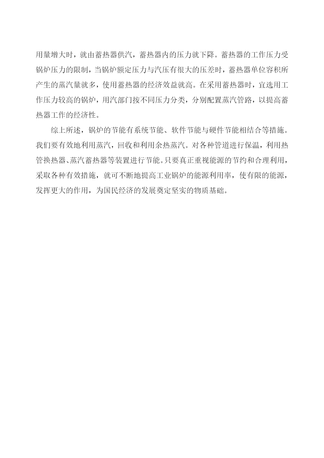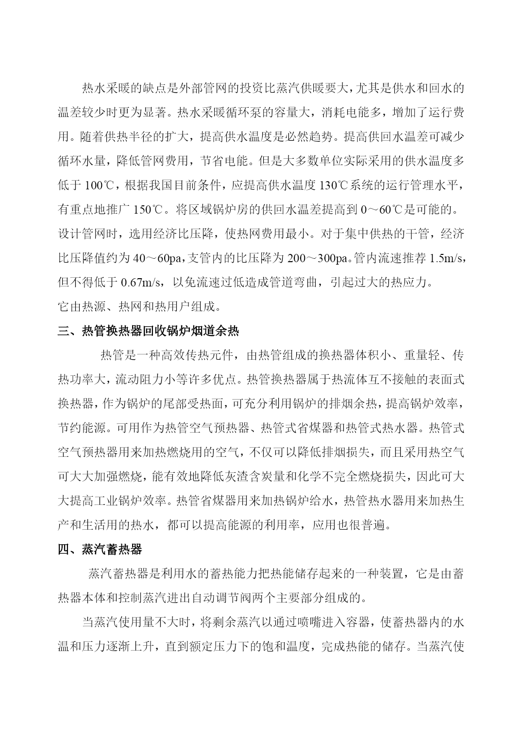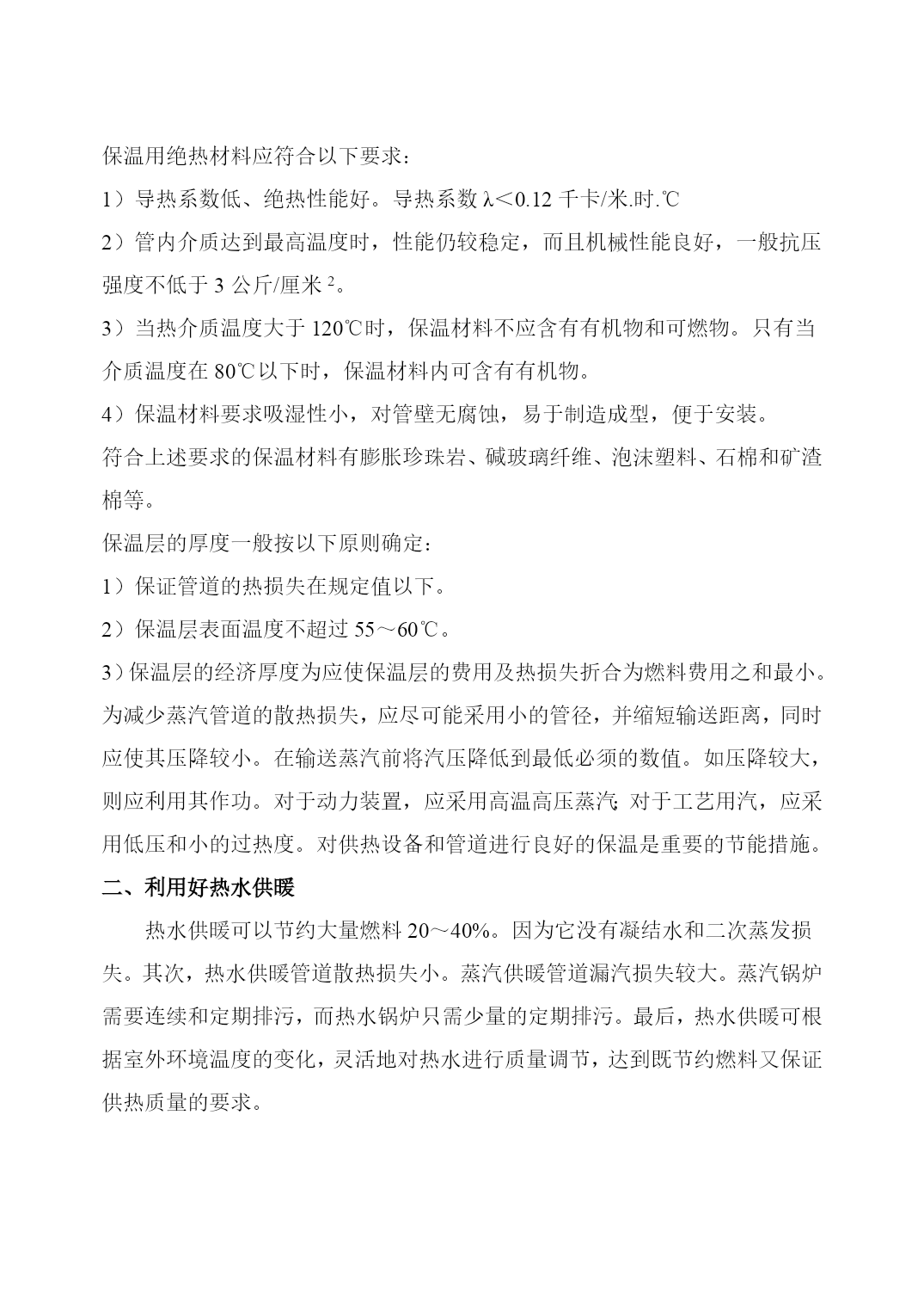 锅炉供热节能措施技术总结锅炉是我国耗能最多的设备之一,每年消耗的能源约占整个国家能源消耗的三分之一。锅炉耗能是为了生产二次能源——蒸汽或热水。蒸汽或热水是通过热力管网送往各种用热设备。锅炉、管网和用热设备组成了热力系统,该系统的能源利用率等于锅炉热效率、管网热效率和用热设备热效率的乘积。由此可见,锅炉耗能的大小不仅决定于本身热效率的高低,而且也决定于热力系统的能源利用率。因此,节省锅炉耗能必需从锅炉、管网和用热设备三方面系统地考虑。许多企事业单位只重视锅炉本身的技术改造,提高出力和热效率,而对能量的综合利用考虑得较少,忽视了管网和用热设备的滴漏散热,结果是锅炉愈改愈大,热效率虽有很大的提高,但耗能却很多,能源利用率不高。因此,要提高锅炉的能源利用率,除了要提高工业锅炉本身的热效率外,还要实行锅炉的供热系统节能、软件节能与硬件节能相结合的全方位节能策略。软件节能要重视并抓好燃料供应管理和运行操作人员的培训工作。让燃料去适应锅炉,比改造锅炉见效快投资少,应作为节能的主要措施。应有技术人员负责锅炉、管网和用热设备的管理。司炉工应进行操作培训,经锅炉安全监察部门考试合格,发给操作证明后方可上岗。硬件节能包括燃料加工(原燃的洗选、混配、筛分、破碎、成型煤等),采用新工艺、新设备,改造旧工艺、旧设备等。改进管网和用热设备基础上,对锅炉的容量和热效率提出合理的要求,避免改造锅炉或更新的盲目性。所以锅炉的节能主攻方向应放在锅炉、管网和用热设备组成的供热系统上。一、管道保温蒸汽管道、热水管道及各种用热设备都会向周围的空气散失热量,另外为了安全的目的,必须对输汽、水管道保温。保温用绝热材料应符合以下要求:1)导热系数低、绝热性能好。导热系数λ<0.12千卡/米.时.℃2)管内介质达到最高温度时,性能仍较稳定,而且机械性能良好,一般抗压强度不低于3公斤/厘米2。3)当热介质温度大于120℃时,保温材料不应含有有机物和可燃物。只有当介质温度在80℃以下时,保温材料内可含有有机物。4)保温材料要求吸湿性小,对管壁无腐蚀,易于制造成型,便于安装。符合上述要求的保温材料有膨胀珍珠岩、碱玻璃纤维、泡沫塑料、石棉和矿渣棉等。保温层的厚度一般按以下原则确定:1)保证管道的热损失在规定值以下。2)保温层表面温度不超过55~60℃。3)保温层的经济厚度为应使保温层的费用及热损失折合为燃料费用之和最小。为减少蒸汽管道的散热损失,应尽可能采用小的管径,并缩短输送距离,同时应使其压降较小。在输送蒸汽前将汽压降低到最低必须的数值。如压降较大,则应利用其作功。对于动力装置,应采用高温高压蒸汽;对于工艺用汽,应采用低压和小的过热度。对供热设备和管道进行良好的保温是重要的节能措施。二、利用好热水供暖热水供暖可以节约大量燃料20~40%。因为它没有凝结水和二次蒸发损失。其次,热水供暖管道散热损失小。蒸汽供暖管道漏汽损失较大。蒸汽锅炉需要连续和定期排污,而热水锅炉只需少量的定期排污。最后,热水供暖可根据室外环境温度的变化,灵活地对热水进行质量调节,达到既节约燃料又保证供热质量的要求。热水采暖的缺点是外部管网的投资比蒸汽供暖要大,尤其是供水和回水的温差较少时更为显著。热水采暖循环泵的容量大,消耗电能多,增加了运行费用。随着供热半径的扩大,提高供水温度是必然趋势。提高供回水温差可减少循环水量,降低管网费用,节省电能。但是大多数单位实际采用的供水温度多低于100℃,根据我国目前条件,应提高供水温度130℃系统的运行管理水平,有重点地推广150℃。将区域锅炉房的供回水温差提高到0~60℃是可能的。设计管网时,选用经济比压降,使热网费用最小。对于集中供热的干管,经济比压降值约为40~60pa,支管内的比压降为200~300pa。管内流速推荐1.5m/s,但不得低于0.67m/s,以免流速过低造成管道弯曲,引起过大的热应力。它由热源、热网和热用户组成。三、热管换热器回收锅炉烟道余热热管是一种高效传热元件,由热管组成的换热器体积小、重量轻、传热功率大,流动阻力小等许多优点。热管换热器属于热流体互不接触的表面式换热器,作为锅炉的尾部受热面,可充分利用锅炉的排烟余热,提高锅炉效率,节约能源。可用作为热管空气预热器、热管式省煤器和热管式热水器。热管式空气预热器用来加热燃烧用的空气,不仅可以降低排烟损失,而且采用热空气可大大加强燃烧,能有效地降低灰渣含炭量和化学不完全燃烧损失,因此可大大提高工业锅炉效率。热管省煤器用来加热锅炉给水,热管热水器用来加热生产和生活用的热水,都可以提高能源的利用率,应用也很普遍。四、蒸汽蓄热器蒸汽蓄热器是利用水的蓄热能力把热能储存起来的一种装置,它是由蓄热器本体和控制蒸汽进出自动调节阀两个主要部分组成的。当蒸汽使用量不大时,