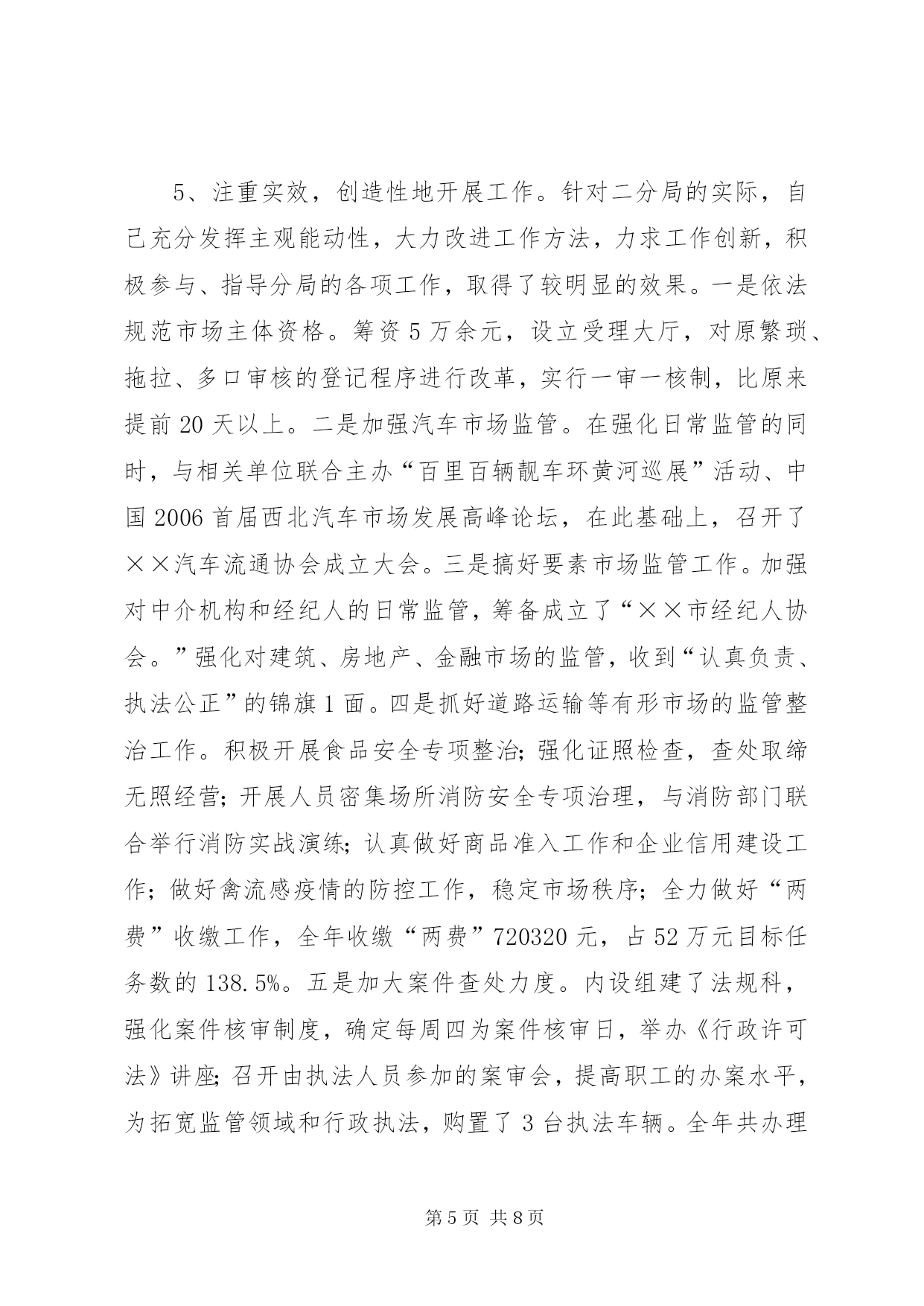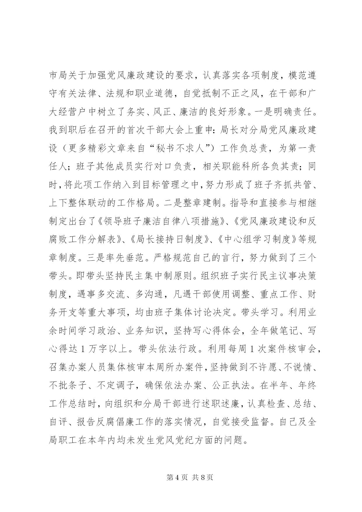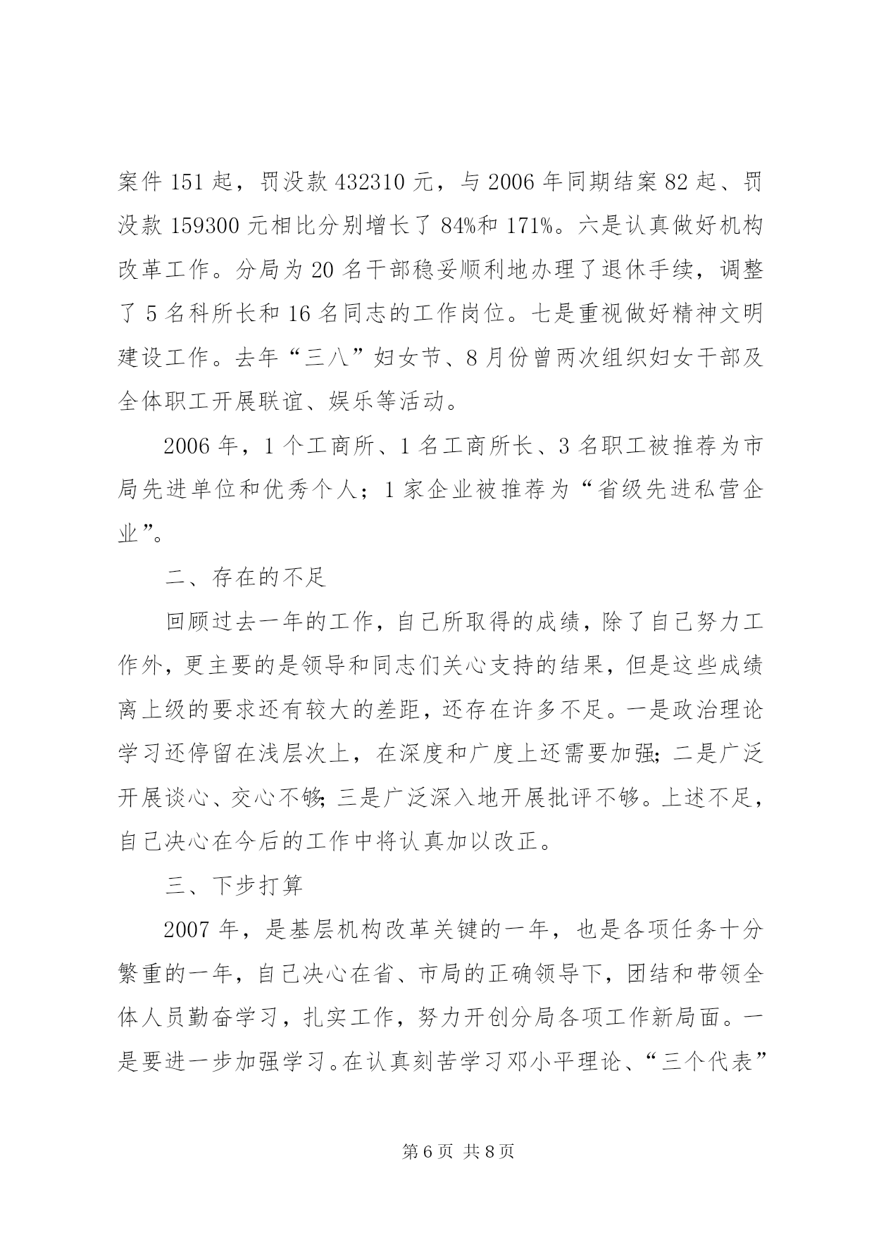 第PAGE\*Arabic\*MERGEFORMAT8页共NUMPAGES\*MERGEFORMAT8页工商局长个人述职述廉报告一年来,在省、市局的正确领导和班子成员以及同志们的大力支持帮助下,狠抓了政治理论学习,努力转变工作作风,强化党风廉政建设工作,创造性地开展工作,圆满地完成上级赋予的各项工作任务。现将2006年度的思想、工作、廉政情况做以述职,不妥之处,请批评指正。一、主要工作情况1、加强学习,提高思想政治素质。去年,尤其是自己担任分局局长以来,在抓好全体职工政治理论学习的同时,注重加强自身的学习,自觉投入到分局开展的“三个代表”重要思想的学习活动中去。首先,以“三个代表”为主线,把学习、践行“三个代表”贯穿全年工作的始终,坚持用“三个代表”统领分局全盘工作、衡量自我的思想与工作;其次,以树立马克思主义的世界观为根本,以艰苦奋斗、廉洁奉公为重点,以立党为公、执政为民为目标,认真开展权力观自我教育,增强权为民所用的责任感;再次,以学习系统内外涌现出的先进典型和从阜阳等地暴露出的问题吸取深刻教训为内容,对自己进行示范和警示教育,不断警醒自己该干什么和不干什么。通过学习,一是坚定了正确的政治方向。一年来,自己在政治上、思想上和行动上始终与党中央保持一致,能紧密地团结班子成员,保证党的路线方针政策在分局的正确贯彻执行,保证省、市局的工作安排部署和目标任务在分局的全面落实和完成。二是提高了思想政治素质。坚持理论与实践相结合的学风,在实践中学,在实干中用,不断改造自己的主观世界和客观世界,从而进一步提高了思想政治觉悟和道德品质修养,做到了与人为善,和睦相处。三是提高了政策理论水平。通过学习,进一步增强了政策观念,能正确理解和掌握党和国家有关政策、法规,并能结合分局的实际及时贯彻执行,为搞好全市“双生”市场监管和行政执法工作奠定了良好的基础。2、勤奋敬业,增强组织领导能力。我做为一名基层单位的主要领导,应比一般干部更要爱岗敬业,勤奋从政,尽职尽责,做到事事、处处为人表率,身体力行,而且应具有较强的组织领导才能。通过一年来的实际工作锻炼,使自己的组织领导能力得到提高。一是表达能力得到提高。对分局的全盘工作能做到统筹考虑,思路清晰,条理清楚,协调有方,落到实处;能准确地表达自己的思想和意图,能熟练地指导下属草拟各类工作文件,观点正确,文字简练;能组织并主持召开各类会议,语言精练,言简意赅,使分局办文办会的质量有了较大提高。二是组织领导能力得到提高。在实践中能独立组织指导开展各项工作;能发扬民主,集思广益,正确决策,敢于拍板;具有较强的指导、帮助基层科所开展各项工作的能力;注重充分调动广大干部的积极因素,并使他们发挥各自的主观能动性;能整合和协调分局内外的各种力量,把单位的事情办好。三是业务水平得到提高。一年来,通过对业务知识的学习,自己已比较全面的掌握了本职岗位工作的专业理论和管理知识,较为熟悉本级机关的工作程序并指导其组织开展各项工作;对基层科所的工作动态做到胸中有数,并能随时提出指导和改进意见,使科所工作能顺利开展并取得最佳效果;能组织带领班子成员正确处理各自职责范围内的各种问题,使下属在工作中遇到的疑难问题迎刃而解。3、深入实际,不断转变工作作风。扎实、艰苦的工作作风,来源于强烈的事业心和高度的责任感。自己觉得,既然组织安排我在这个单位担任主要领导,就要扑下身子、甩开膀子,想大事,干大事,成大事。去年,自己带领班子成员深入科所、各有形市场等基层单位,开展现场办公,为基层单位或个人协调办理各类实事人均达5件以上。对待工作中的每一件事情,都是经过深入调查和反复思考后才认真扎实地去做。对于来分局办事的,无论亲疏,都能以诚相待,严格按照程序,尽快、果断地办理;对不符合条件一时办不成的,就耐心细致地向他们做解释说服工作,既不敷衍了事,又不放弃原则乱办,让他们高兴而来、满意而去。工作中不推诿扯皮,不拣轻怕重,勇于揽大事、挑大头;有了成绩就总结经验共同提高,不沾沾自喜;有了问题就认真查找原因吸取教训,不推脱责任。一年来,分局的各项工作均未出现大的失误和过错。4、廉洁自律,促进党风廉政建设。按照国家工商总局、省、市局关于加强党风廉政建设的要求,认真落实各项制度,模范遵守有关法律、法规和职业道德,自觉抵制不正之风,在干部和广大经营户中树立了务实、风正、廉洁的良好形象。一是明确责任。我到职后在召开的首次干部大会上重申:局长对分局党风廉政建设(更多精彩文章来自“秘书不求人”)工作负总责,为第一责任人;班子其他成员实行对口负责,相关职能科所各负其责;同时,将此项工作纳入到目标管理之中,努力形成了班子齐抓共管、上下整体联动的工作格局。二是整章建制。指导和直接参与相继制定出台了《领导班子廉洁自律八项措施》、《党风廉政建设和反腐败工作