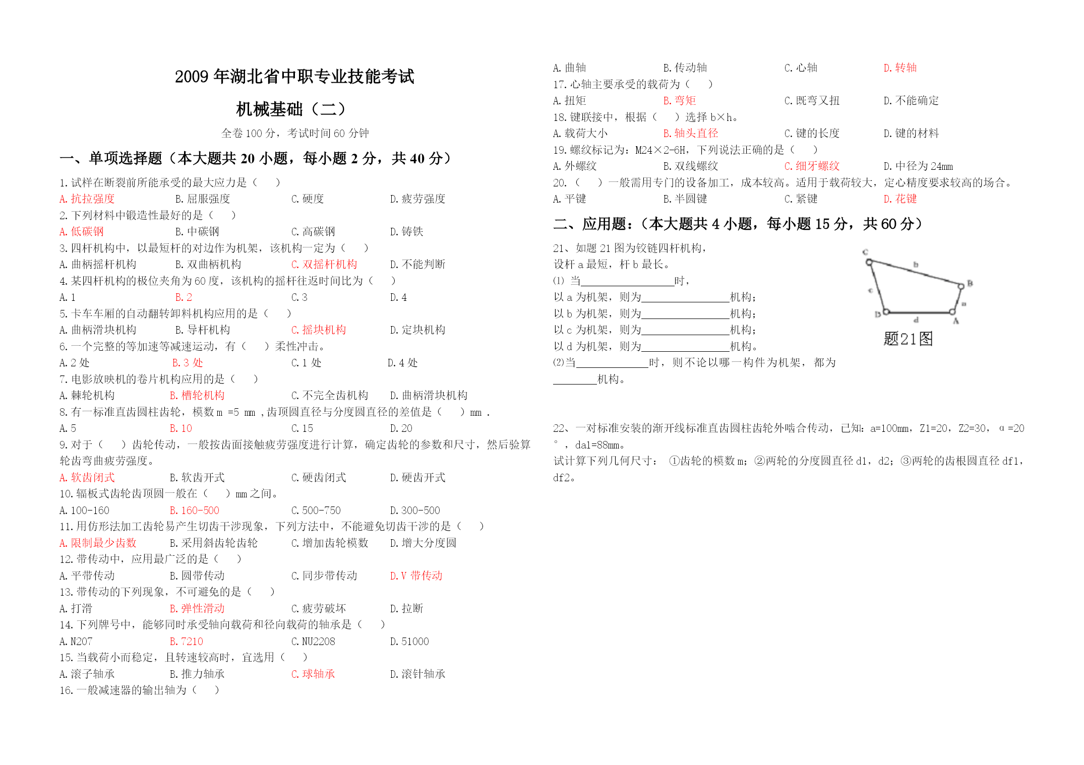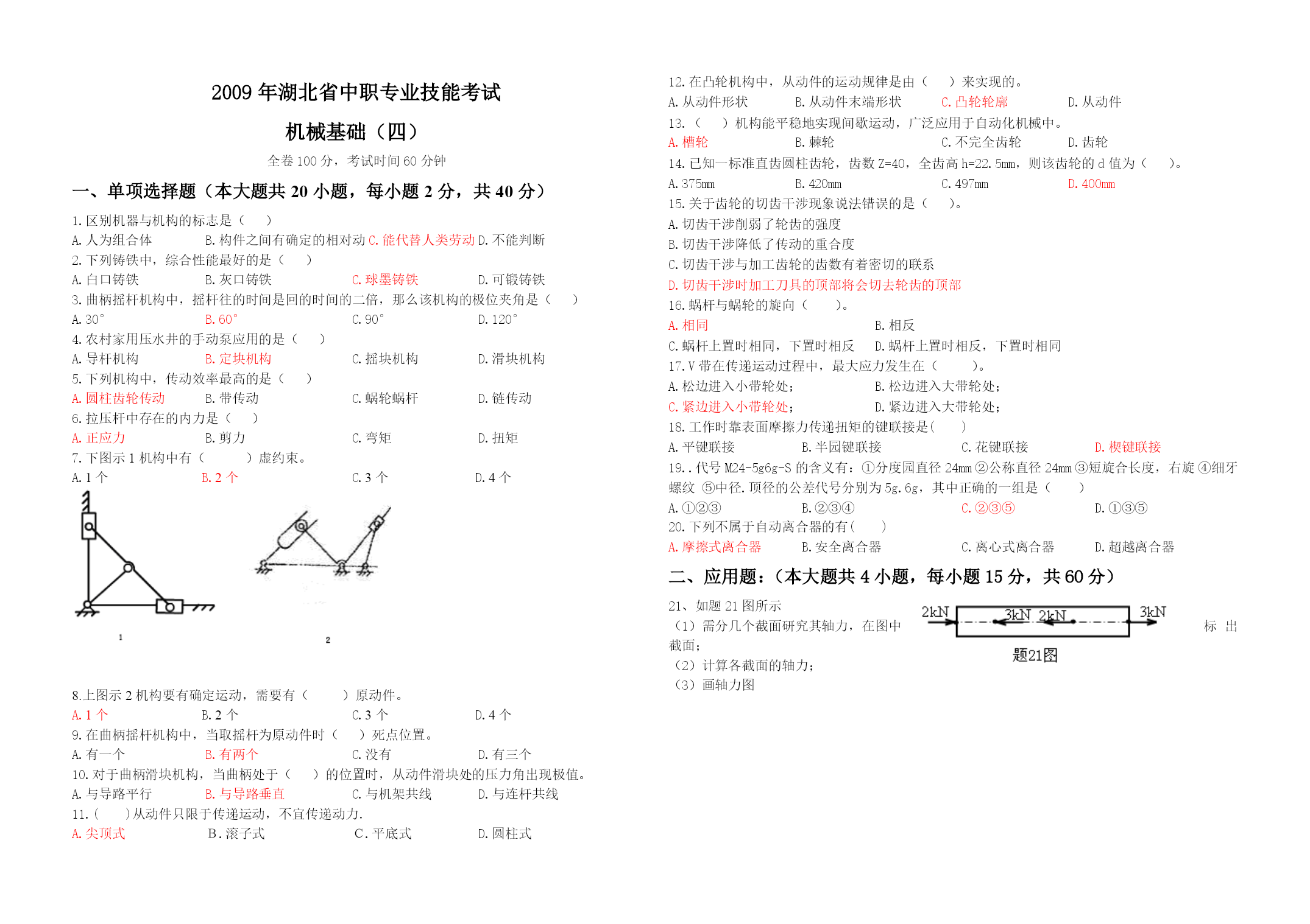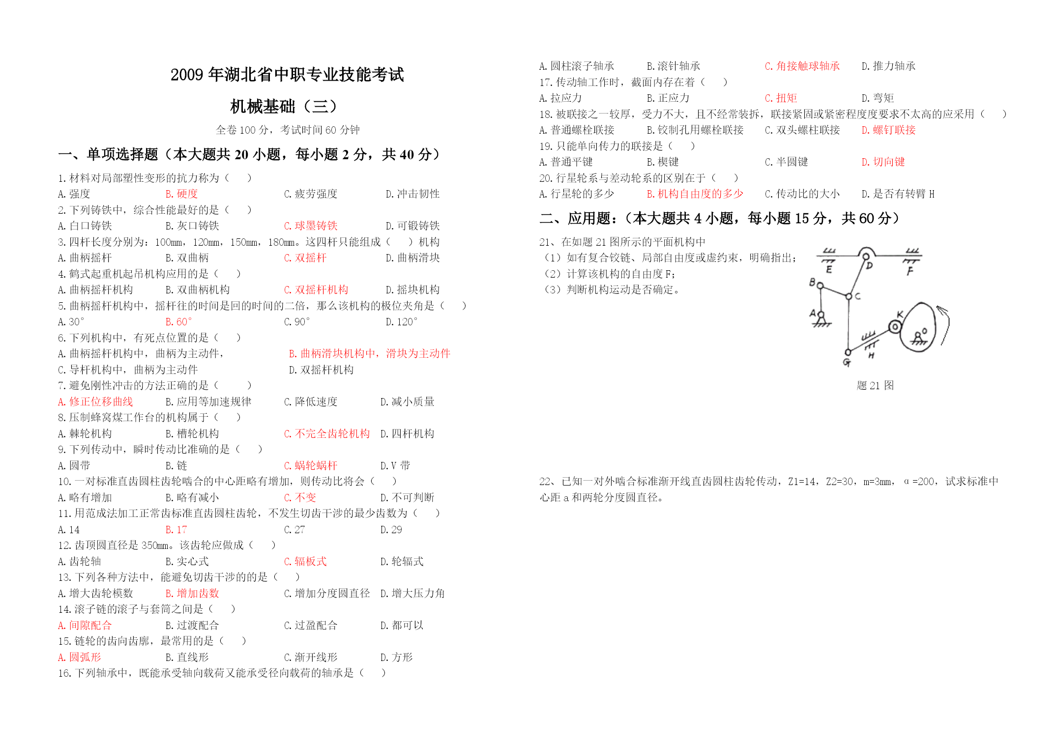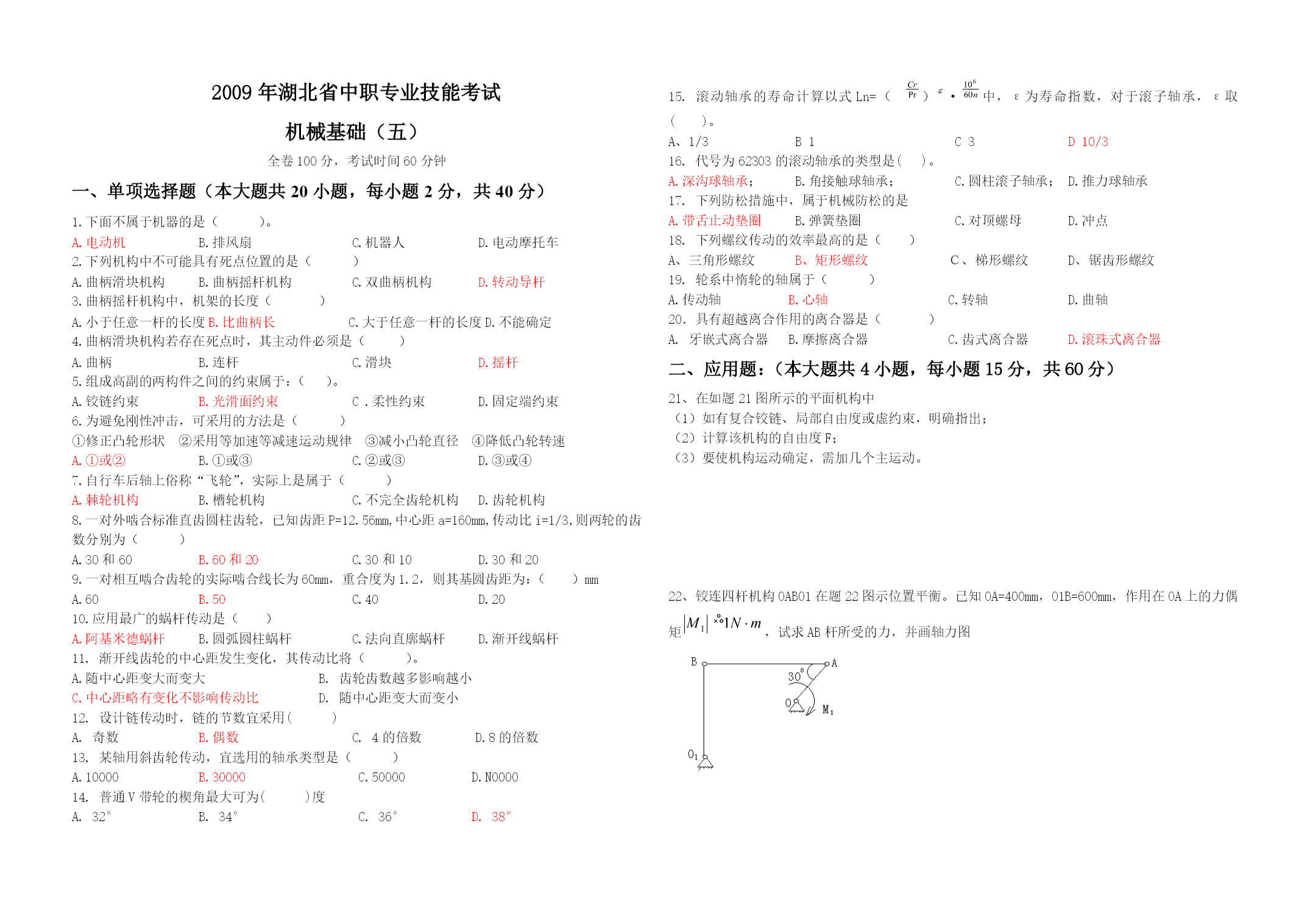 2009年湖北省中职专业技能考试机械基础(一)全卷100分,考试时间60分钟一、单项选择题(本大题共20小题,每小题2分,共40分)1.颚式破碎机的V带和带轮属于()A.原动机部分B.传动部分C.检控部分D.执行部分2.作平面运动的构件具有()自由度。A.一个B.三个C.六个D.九个3.机构具有确定运动的条件是()A.主动件数大于自由度数B.主动件数等于自由度数C.主动件数小于自由度数D.无法确定4.力矩不等于零的必要条件是()A.力为零B.力通过矩心C.力无穷大D.力不等于零且不能通过矩心5.内燃机的配气机构应用的凸轮机构是()A.盘状凸轮B.板状凸轮C.圆柱凸轮D.尖顶式凸轮6.控制打字机输格装置应用的是()A.棘轮机构B.槽轮机构C.不完全齿轮机构D.双曲柄机构7.闭式软齿面齿轮的主要失效形式为()A.齿面磨损B.齿面胶合C.塑性变形D.疲劳点蚀8.标准正常直齿圆柱齿轮不发生根切的最少齿数为()A.14B.17C.27D.299.下列各项中不属于斜齿圆柱齿轮特点的是()A.传动平稳B.承载能力强C.适于高速重载D.有冲击振动10.数控机床.录像机.打印机等精密机械应用的是()A.圆带B.平带C.同步带D.V带11.平均传比准确而瞬时传动比不恒定的传动是()A.平带B.齿轮C.链D.V带12.类型代号为“6”的轴承为()A.圆锥滚子轴承B.深沟球轴承C.推力球轴承D.角接触球轴承13.轴承代号为“30210”,下列说法正确的是()A.内径为10毫米B.圆锥滚子轴承C.推力轴承D.内径50毫米14.汽车变速箱与后桥之间的轴为()A.心轴B.转轴C.传动轴D.曲轴15.下列零件中属于非标准件的是()A.键B.销C.螺栓D.轴16.被联接件之一较厚,材料较软且经常装拆,联接紧固或紧密程度要求较高的,应采用的联接是()A.普通螺栓B.铰制孔用螺栓C.双头螺柱D.螺钉联接17.螺纹防松方法中,属于机械防松的是()A.弹簧垫圈B.对顶螺母C.带舌止动垫圈D.涂粘合剂18.轮系中不改变传动比的大小,只起改变转向作用的齿轮称为()A.主动轮B.从动轮C.惰轮D.行星轮19.计算周转轮系传动比时通常采用的是()A.反转法B.相对运动法C.相对速度法D.常规法20.机床进给螺旋应用的是()A.传力螺旋B.传导螺旋C.调整螺旋D.滚动螺旋二、应用题:(本大题共4小题,每小题15分,共60分)21、在如题21图所示的平面机构中(1)如有复合铰链、局部自由度或虚约束,明确指出;(2)计算该机构的自由度F;(3)判断机构运动是否确定。22、已知一标准直齿圆柱齿轮,齿数Z=40,齿高h=22.5mm,试求该齿轮的模数m;分度圆直径d;齿顶圆直径da及齿根圆直径df。23、已知P=500N,L=1.5m,试计算该梁的最大弯矩并画出弯矩图。24、如图所示的轮系中,设已知Z1=Z2=Z3’=Z4=20,Z3=Z5=40,又齿轮1、3、3’与5同轴线,试求传动比i15并标出n5的转向。2009年湖北省中职专业技能考试机械基础(二)全卷100分,考试时间60分钟一、单项选择题(本大题共20小题,每小题2分,共40分)1.试样在断裂前所能承受的最大应力是()A.抗拉强度B.屈服强度C.硬度D.疲劳强度2.下列材料中锻造性最好的是()A.低碳钢B.中碳钢C.高碳钢D.铸铁3.四杆机构中,以最短杆的对边作为机架,该机构一定为()A.曲柄摇杆机构B.双曲柄机构C.双摇杆机构D.不能判断4.某四杆机构的极位夹角为60度,该机构的摇杆往返时间比为()A.1B.2C.3D.45.卡车车厢的自动翻转卸料机构应用的是()A.曲柄滑块机构B.导杆机构C.摇块机构D.定块机构6.一个完整的等加速等减速运动,有()柔性冲击。A.2处B.3处C.1处D.4处7.电影放映机的卷片机构应用的是()A.棘轮机构B.槽轮机构C.不完全齿机构D.曲柄滑块机构8.有一标准直齿圆柱齿轮,模数m=5mm,齿顶圆直径与分度圆直径的差值是()mm.A.5B.10C.15D.209.对于()齿轮传动,一般按齿面接触疲劳强度进行计算,确定齿轮的参数和尺寸,然后验算轮齿弯曲疲劳强度。A.软齿闭式B.软齿开式C.硬齿闭式D.硬齿开式10.辐板式齿轮齿顶圆一般在()mm之间。A.100-160B.160-500C.500-750D.300-50011.用仿形法加工齿轮易产生切齿干涉现象,下列方法中,不能避免切齿干涉的是()A.限制最少齿数B.采用斜齿轮齿轮C.增加齿轮模数D.增大分度圆12