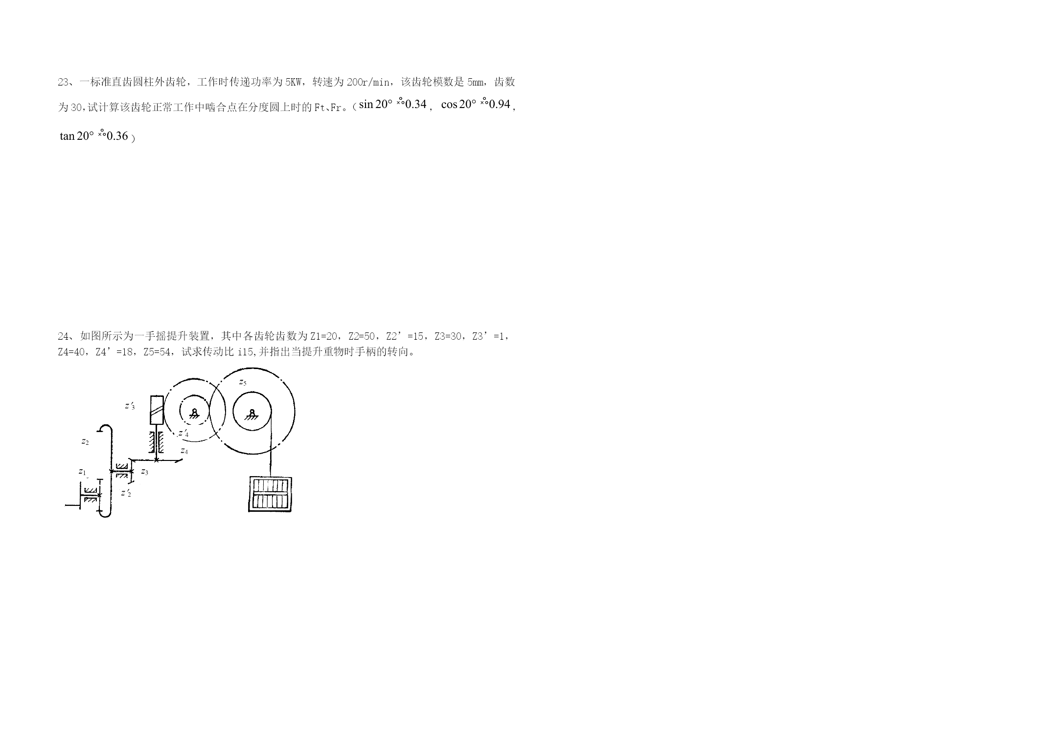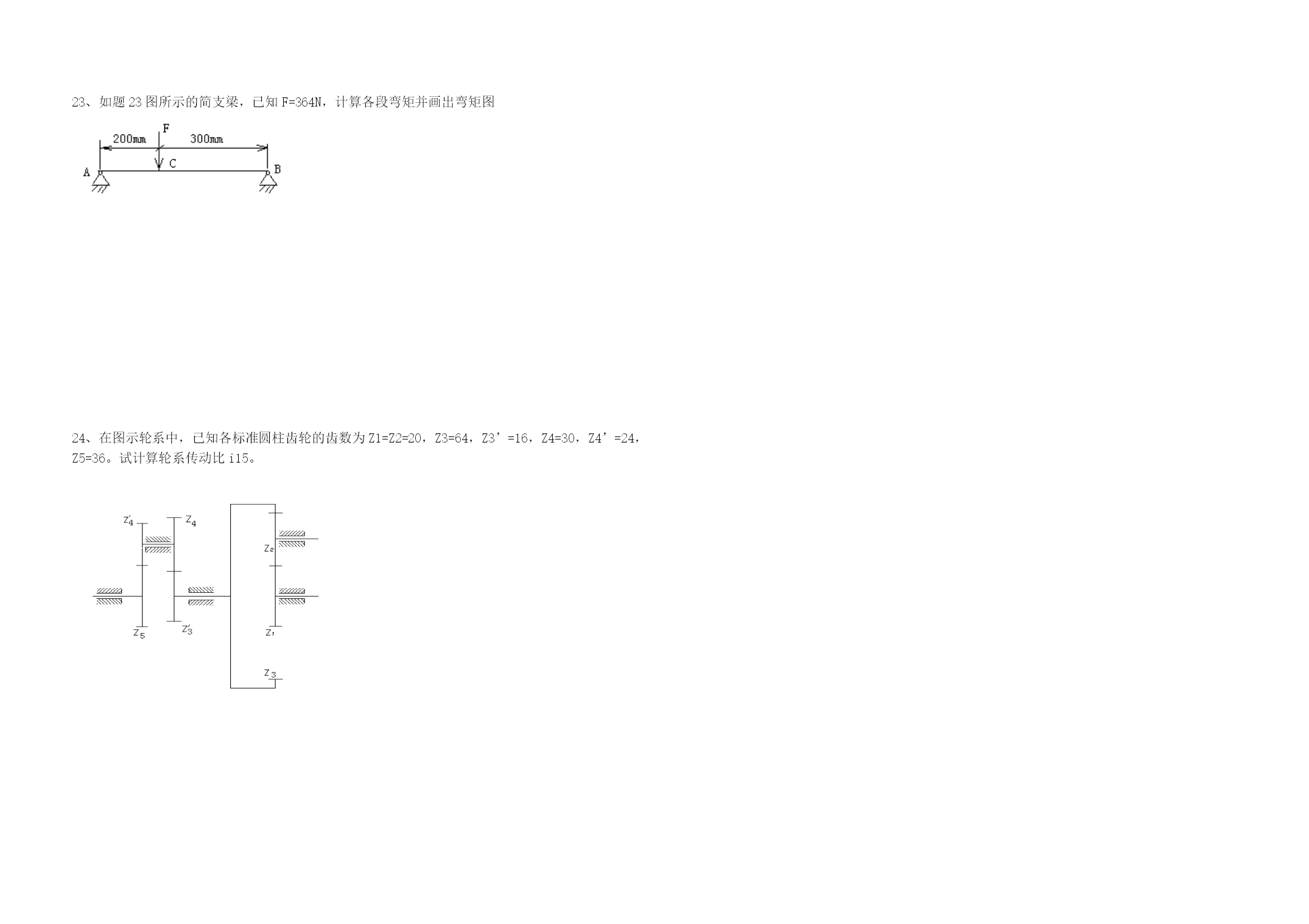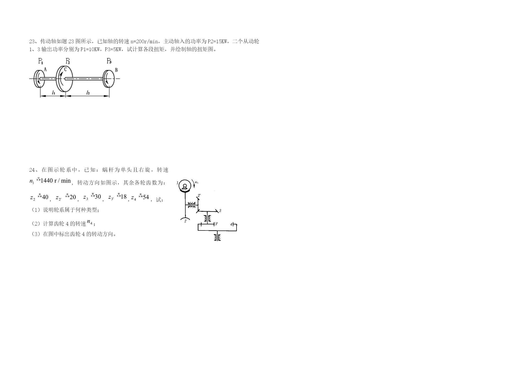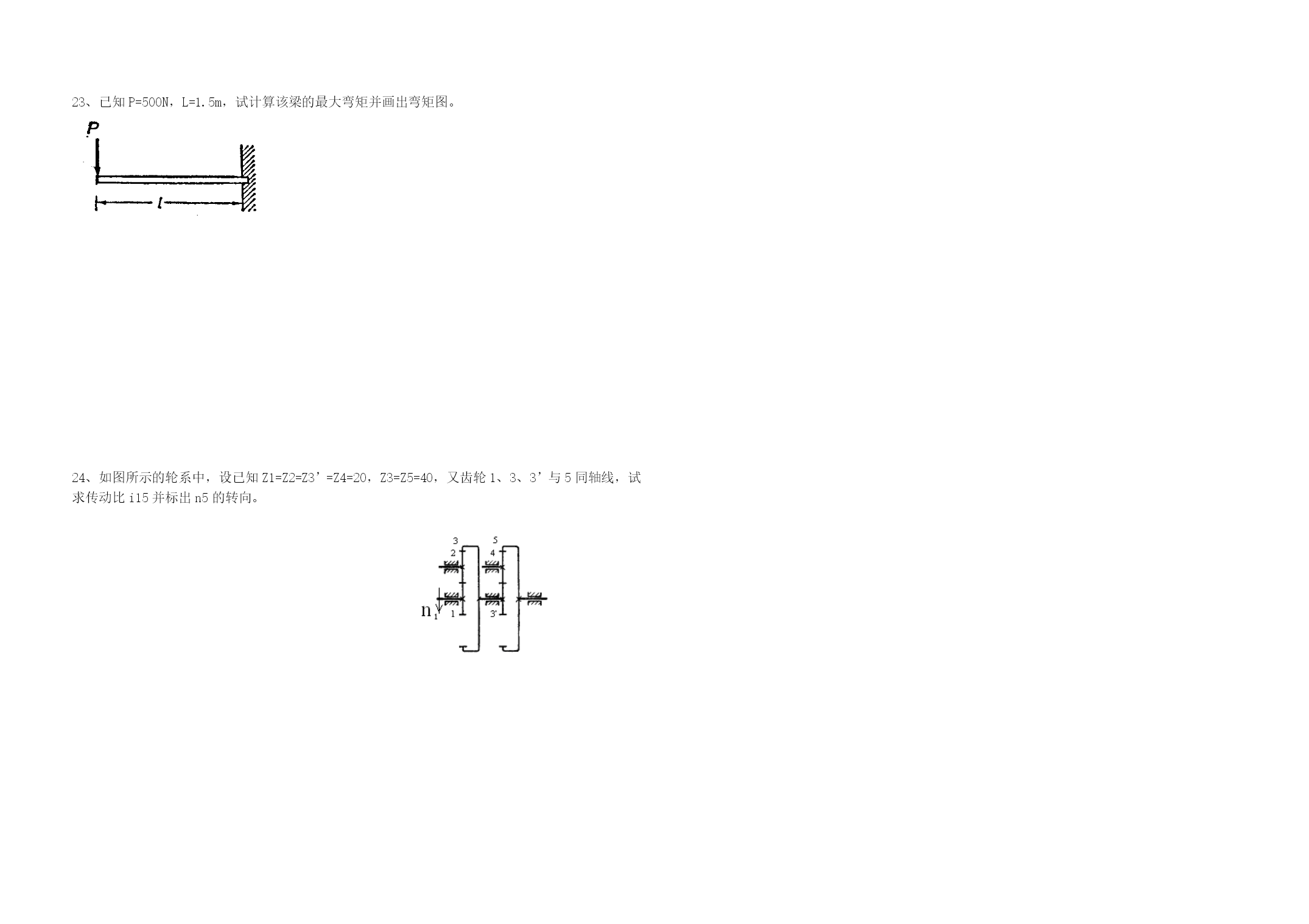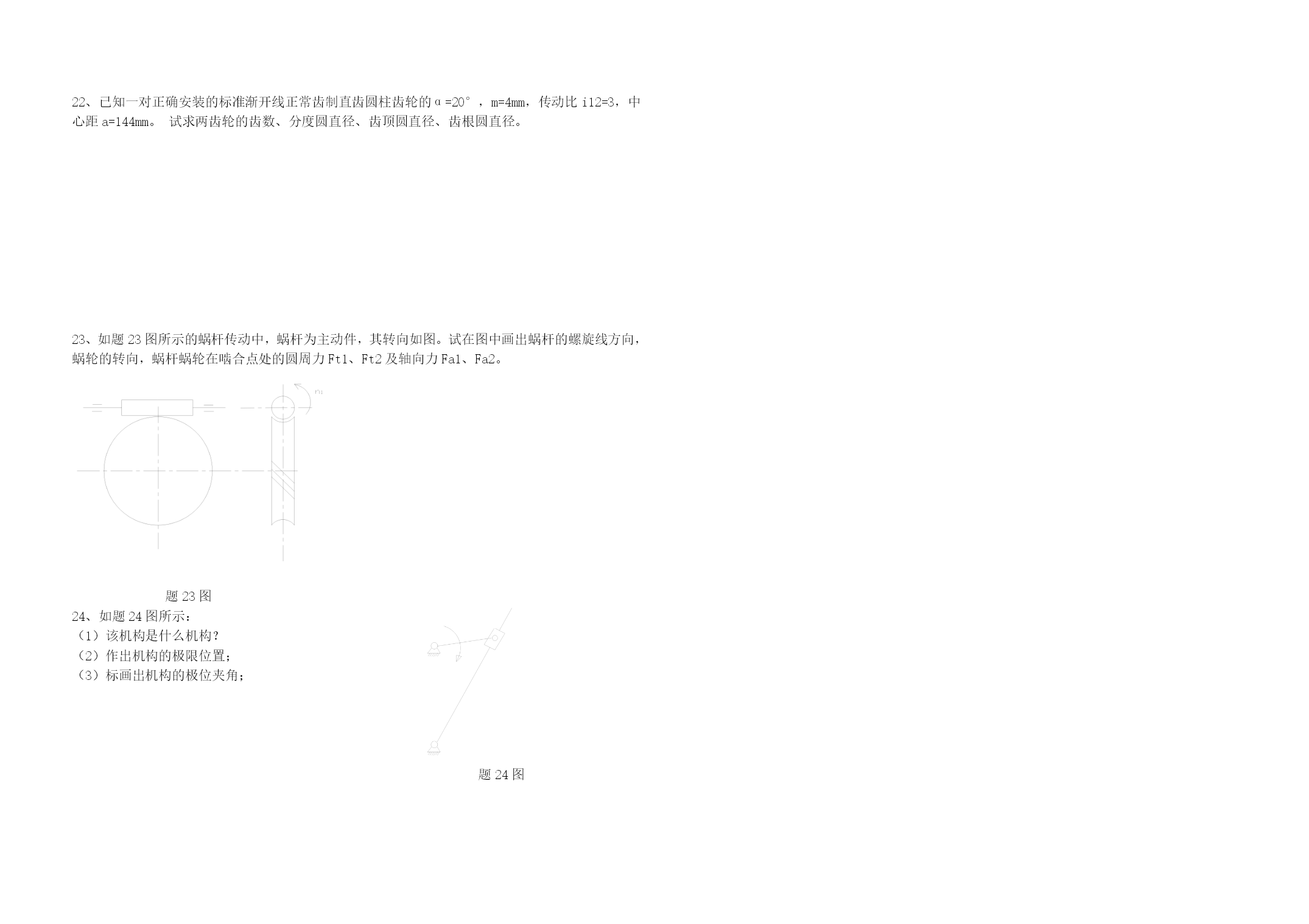 2009年湖北省中职专业技能考试机械基础(一)全卷100分,考试时间60分钟一、单项选择题(本大题共20小题,每小题2分,共40分)1.颚式破碎机的V带和带轮属于()A.原动机部分B.传动部分C.检控部分D.执行部分2.作平面运动的构件具有()自由度。A.一个B.三个C.六个D.九个3.机构具有确定运动的条件是()A.主动件数大于自由度数B.主动件数等于自由度数C.主动件数小于自由度数D.无法确定4.力矩不等于零的必要条件是()A.力为零B.力通过矩心C.力无穷大D.力不等于零且不能通过矩心5.内燃机的配气机构应用的凸轮机构是()A.盘状凸轮B.板状凸轮C.圆柱凸轮D.尖顶式凸轮6.控制打字机输格装置应用的是()A.棘轮机构B.槽轮机构C.不完全齿轮机构D.双曲柄机构7.闭式软齿面齿轮的主要失效形式为()A.齿面磨损B.齿面胶合C.塑性变形D.疲劳点蚀8.标准正常直齿圆柱齿轮不发生根切的最少齿数为()A.14B.17C.27D.299.下列各项中不属于斜齿圆柱齿轮特点的是()A.传动平稳B.承载能力强C.适于高速重载D.有冲击振动10.数控机床.录像机.打印机等精密机械应用的是()A.圆带B.平带C.同步带D.V带11.平均传比准确而瞬时传动比不恒定的传动是()A.平带B.齿轮C.链D.V带12.类型代号为“6”的轴承为()A.圆锥滚子轴承B.深沟球轴承C.推力球轴承D.角接触球轴承13.轴承代号为“30210”,下列说法正确的是()A.内径为10毫米B.圆锥滚子轴承C.推力轴承D.内径50毫米14.汽车变速箱与后桥之间的轴为()A.心轴B.转轴C.传动轴D.曲轴15.下列零件中属于非标准件的是()A.键B.销C.螺栓D.轴16.被联接件之一较厚,材料较软且经常装拆,联接紧固或紧密程度要求较高的,应采用的联接是()A.普通螺栓B.铰制孔用螺栓C.双头螺柱D.螺钉联接17.螺纹防松方法中,属于机械防松的是()A.弹簧垫圈B.对顶螺母C.带舌止动垫圈D.涂粘合剂18.轮系中不改变传动比的大小,只起改变转向作用的齿轮称为()A.主动轮B.从动轮C.惰轮D.行星轮19.计算周转轮系传动比时通常采用的是()A.反转法B.相对运动法C.相对速度法D.常规法20.机床进给螺旋应用的是()A.传力螺旋B.传导螺旋C.调整螺旋D.滚动螺旋二、应用题:(本大题共4小题,每小题15分,共60分)21、在如题21图所示的平面机构中(1)如有复合铰链、局部自由度或虚约束,明确指出;(2)计算该机构的自由度F;(3)判断机构运动是否确定。22、已知一标准直齿圆柱齿轮,齿数Z=40,齿高h=22.5mm,试求该齿轮的模数m;分度圆直径d;齿顶圆直径da及齿根圆直径df。23、已知P=500N,L=1.5m,试计算该梁的最大弯矩并画出弯矩图。24、如图所示的轮系中,设已知Z1=Z2=Z3’=Z4=20,Z3=Z5=40,又齿轮1、3、3’与5同轴线,试求传动比i15并标出n5的转向。2009年湖北省中职专业技能考试机械基础(二)全卷100分,考试时间60分钟一、单项选择题(本大题共20小题,每小题2分,共40分)1.试样在断裂前所能承受的最大应力是()A.抗拉强度B.屈服强度C.硬度D.疲劳强度2.下列材料中锻造性最好的是()A.低碳钢B.中碳钢C.高碳钢D.铸铁3.四杆机构中,以最短杆的对边作为机架,该机构一定为()A.曲柄摇杆机构B.双曲柄机构C.双摇杆机构D.不能判断4.某四杆机构的极位夹角为60度,该机构的摇杆往返时间比为()A.1B.2C.3D.45.卡车车厢的自动翻转卸料机构应用的是()A.曲柄滑块机构B.导杆机构C.摇块机构D.定块机构6.一个完整的等加速等减速运动,有()柔性冲击。A.2处B.3处C.1处D.4处7.电影放映机的卷片机构应用的是()A.棘轮机构B.槽轮机构C.不完全齿机构D.曲柄滑块机构8.有一标准直齿圆柱齿轮,模数m=5mm,齿顶圆直径与分度圆直径的差值是()mm.A.5B.10C.15D.209.对于()齿轮传动,一般按齿面接触疲劳强度进行计算,确定齿轮的参数和尺寸,然后验算轮齿弯曲疲劳强度。A.软齿闭式B.软齿开式C.硬齿闭式D.硬齿开式10.辐板式齿轮齿顶圆一般在()mm之间。A.100-160B.160-500C.500-750D.300-50011.用仿形法加工齿轮易产生切齿干涉现象,下列方法中,不能避免切齿干涉的是()A.限制最少齿数B.采用斜齿轮齿轮C.增加齿轮模数D.增大分度圆12