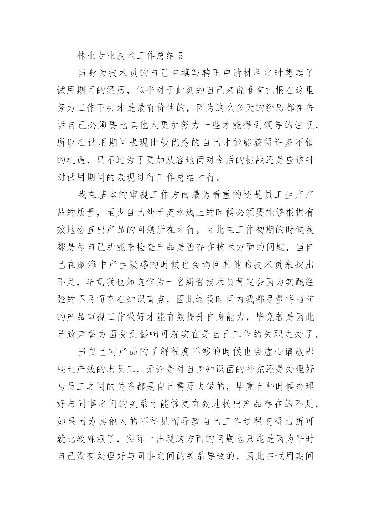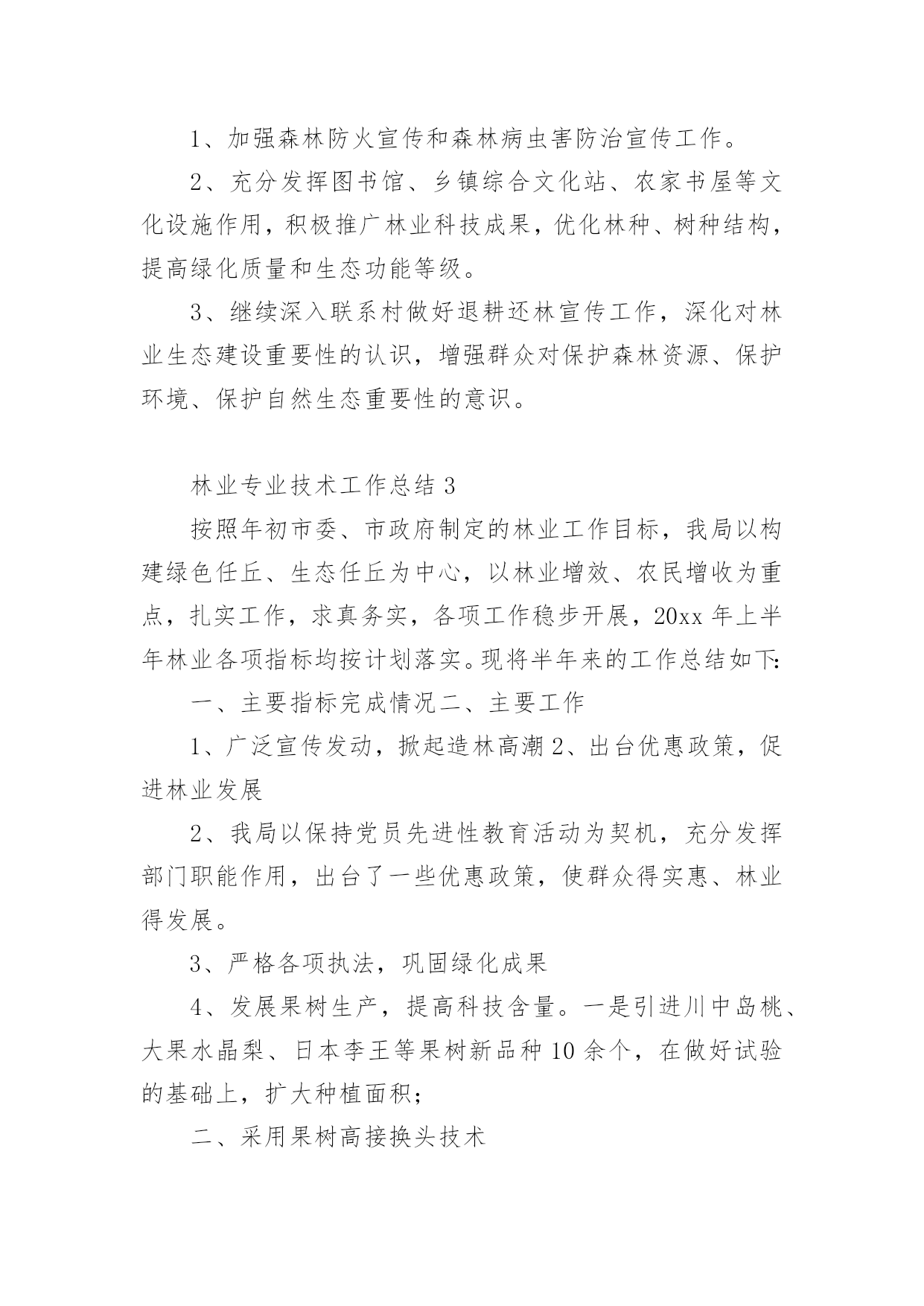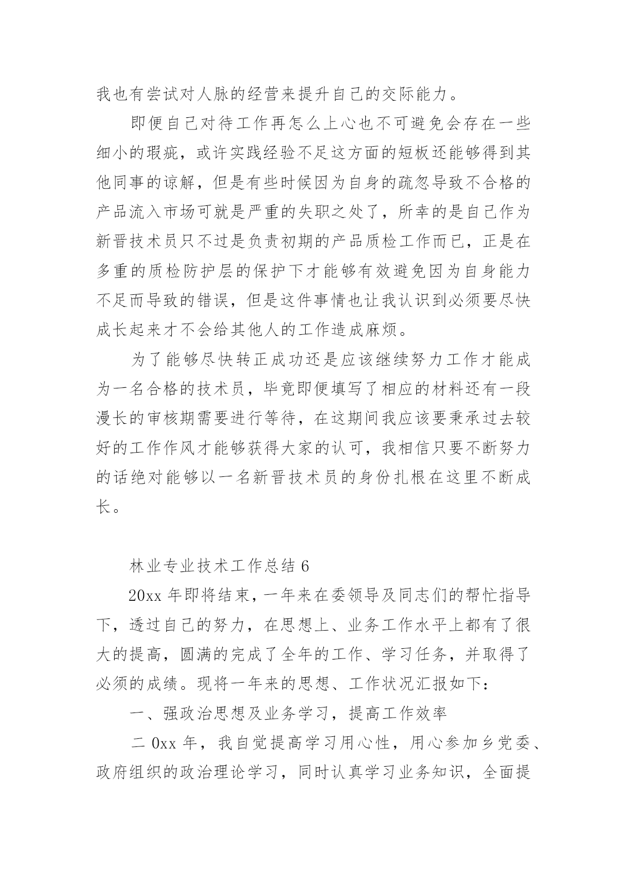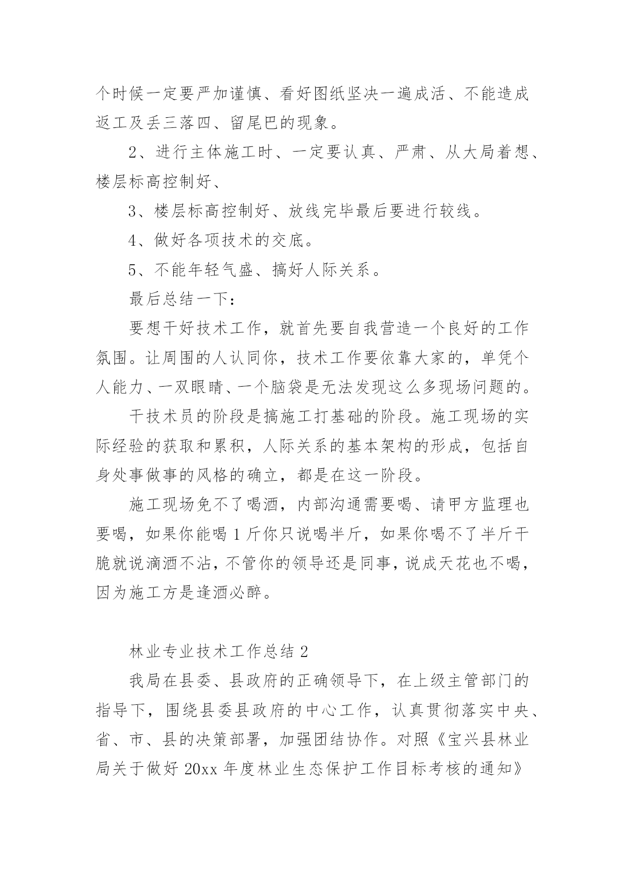 林业专业技术工作总结技术员一般属于初级职称,技术员是指能够完成特定技术任务的人员,也就是已经掌握了特定技术的专业基础理论和基本技能。总结是对一定时期内的工作加以总结,分析和研究,肯定成绩,找出问题,得出经验教训。以下是小编整理的林业专业技术工作总结(精选23篇),供大家写文参考!林业专业技术工作总结1转眼间,辞旧迎新、平凡而又不太忙碌的一年已到尽头,不知不觉时间过的真快,悄然无息、xx年的日历即将翻过去。伴随着时代前进的步伐、回首自己一年来经历的风雨路程、对自己工作中的不足、我做出如下工作总结:一、务实工作、自我加压、认真工作、有得有失xx前半年、值得一庆,(xx文平和谐家园高层c5#楼)自己着手参加的第一个住宅工程已经竣工,我们主抓质量、进度使规定期间内竣工。同时也让我学会了一些施工工序、包括图纸的一些细部构造、及公司规定的一些细部做法、及技术资料的整理等。包括为人处事都有很大的改进,也为自己积累了一定的经验。主体施工完毕后、主要参与砌体的放线、拉结筋的植设、及最后砌体的验收等。后期主要和甲方人员及监理人员做分户验收、及室外污水管道的标高抄测。泛泛的工作岗位维护的是一团氛围。做为一名新手、同样也出现了很多的错误、(楼层外飘窗的砌筑)造成返工、但我会汲取教训、认真熟读图纸、问题考虑全面。坚决不会在让同样的问题出现。后半年、新的工程开工、位于xx市xx区、楼座为三栋小高层及一个大车库总面积由于xxm2由于开始技术人员人手紧张、相当忙碌、虽说忙碌、但很快乐、对自己有很大的信心。因为这是我第一个从基础来挖到最后封顶的工程、所以我很期待。二、工作要有责任心,合理安排工作在这里更让巩固加深了上半年所学到的知识。更明白了:趁年轻多学习的道理。业余时间我会拿出一定的时间多去看规范、图集。唯一不足就是:工作没有计划性。所谓有失必有得,总结一年的工作后,我认识到工作计划的重要性,合理的安排工作可以大力的提高工作效率,使工作更好的顺利进行。数据的统计要从实际出发,以计算量为参考,经多方讨论确认后,再进行数据上报,以确保数据的准确性。做事要有责任心,发扬三勤管理精神,多看、多问、多查,只有这样才可以更好的发现工程中的问题并及时采取方法解决问题。在今后的施工过程中不能一味的按照图纸进行施工还要考虑到现场实际情况,有什么问题及时向领导汇报,只有这样才可以减少施工问题及返工现象的发生。最后,不管做什么事都应该有正确积极的态度,所谓态度决定一切。吸取xx年的失败、为了我能够在xx年取得更好的成绩、减少返工及维修使自己自我完善。我做出如下建议:1、xx年开春将会进行拉结筋植设及砌体抹灰工作、这个时候一定要严加谨慎、看好图纸坚决一遍成活、不能造成返工及丢三落四、留尾巴的现象。2、进行主体施工时、一定要认真、严肃、从大局着想、楼层标高控制好、3、楼层标高控制好、放线完毕最后要进行较线。4、做好各项技术的交底。5、不能年轻气盛、搞好人际关系。最后总结一下:要想干好技术工作,就首先要自我营造一个良好的工作氛围。让周围的人认同你,技术工作要依靠大家的,单凭个人能力、一双眼睛、一个脑袋是无法发现这么多现场问题的。干技术员的阶段是搞施工打基础的阶段。施工现场的实际经验的获取和累积,人际关系的基本架构的形成,包括自身处事做事的风格的确立,都是在这一阶段。施工现场免不了喝酒,内部沟通需要喝、请甲方监理也要喝,如果你能喝1斤你只说喝半斤,如果你喝不了半斤干脆就说滴酒不沾,不管你的领导还是同事,说成天花也不喝,因为施工方是逢酒必醉。林业专业技术工作总结2我局在县委、县政府的正确领导下,在上级主管部门的指导下,围绕县委县政府的中心工作,认真贯彻落实中央、省、市、县的决策部署,加强团结协作。对照《宝兴县林业局关于做好20xx年度林业生态保护工作目标考核的通知》要求,认真梳理各项工作,现将今年工作开展情况总结如下。一、加强组织领导我局高度重视林业工作,积极支持联系村林业工作开展,成立了以局长为组长,纪检组长、副局长为副组长,股室负责人为成员的林业工作领导小组,并制定了相关工作计划,建立了党政“一把手”亲自抓,分管领导具体抓,班子成员共同抓的领导体制,形成了有人管事的领导体系和有人干事的工作机制,积极配合联系村林业工作。二、各项工作开展情况一是建立健全信息宣传、资源管护、森林防火、有害生物防治机制,制定严格的林木保护和防火应对措施,确保联系村森林生态安全;二是利用宣传栏、电视、广播等各种方式开展林业方针政策、法律法规宣传工作,不断增强干部群众的法制观念和自觉维护森林资源安全的意识;三是购置林业类书刊、杂志等科教必需用品,充实图书馆、乡镇综合文化站、农家书屋等,并专人负责全天候开放,使广大群众经常自我“充电”,拓宽视野,普及林业防火、病虫害防控知识;四是全力推进灾后重建,协助联系村做好