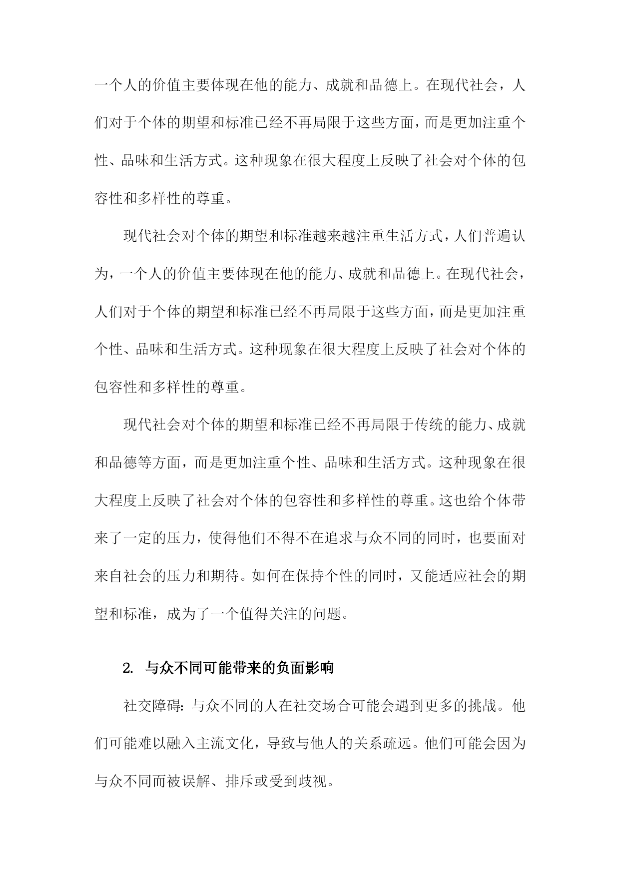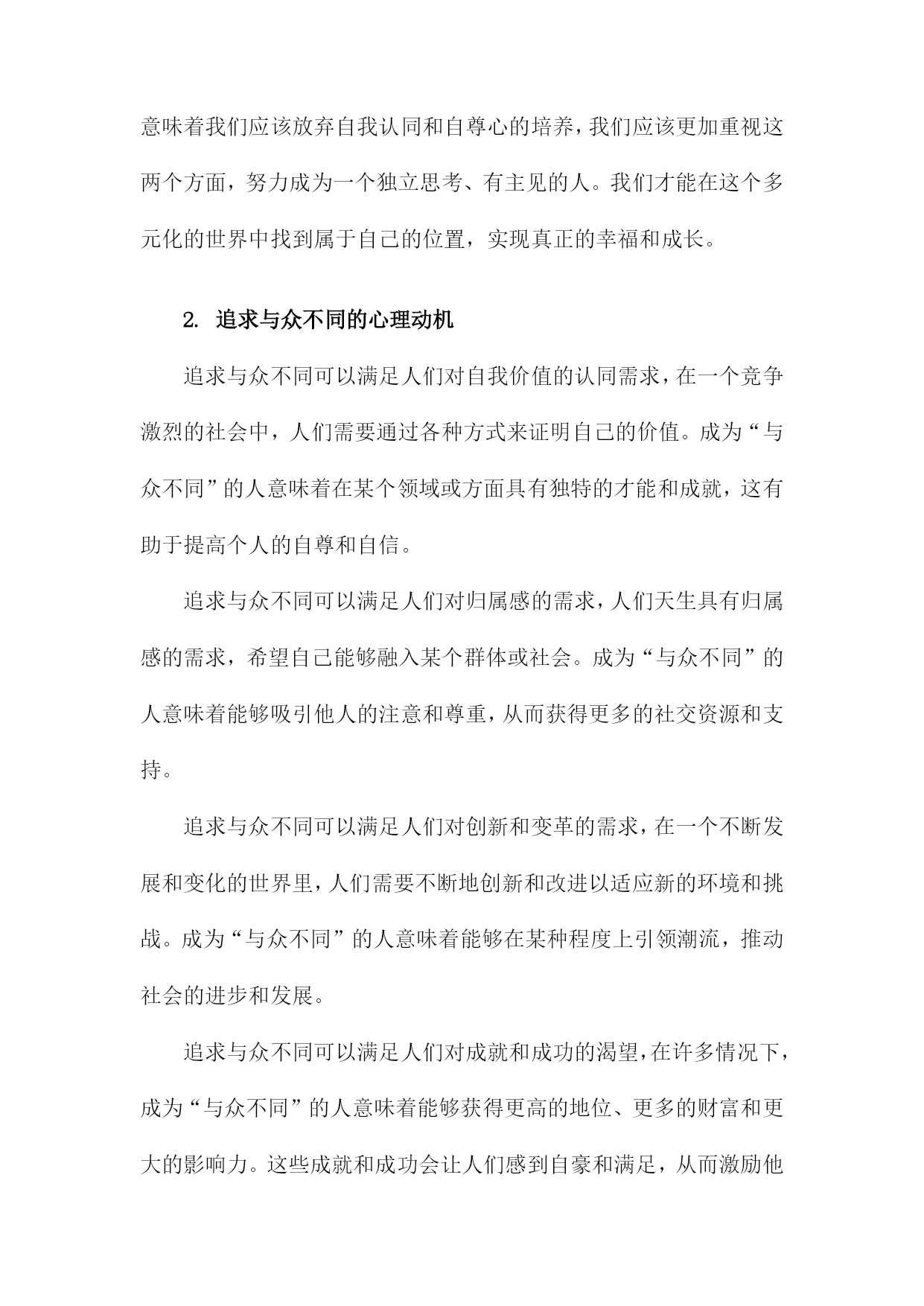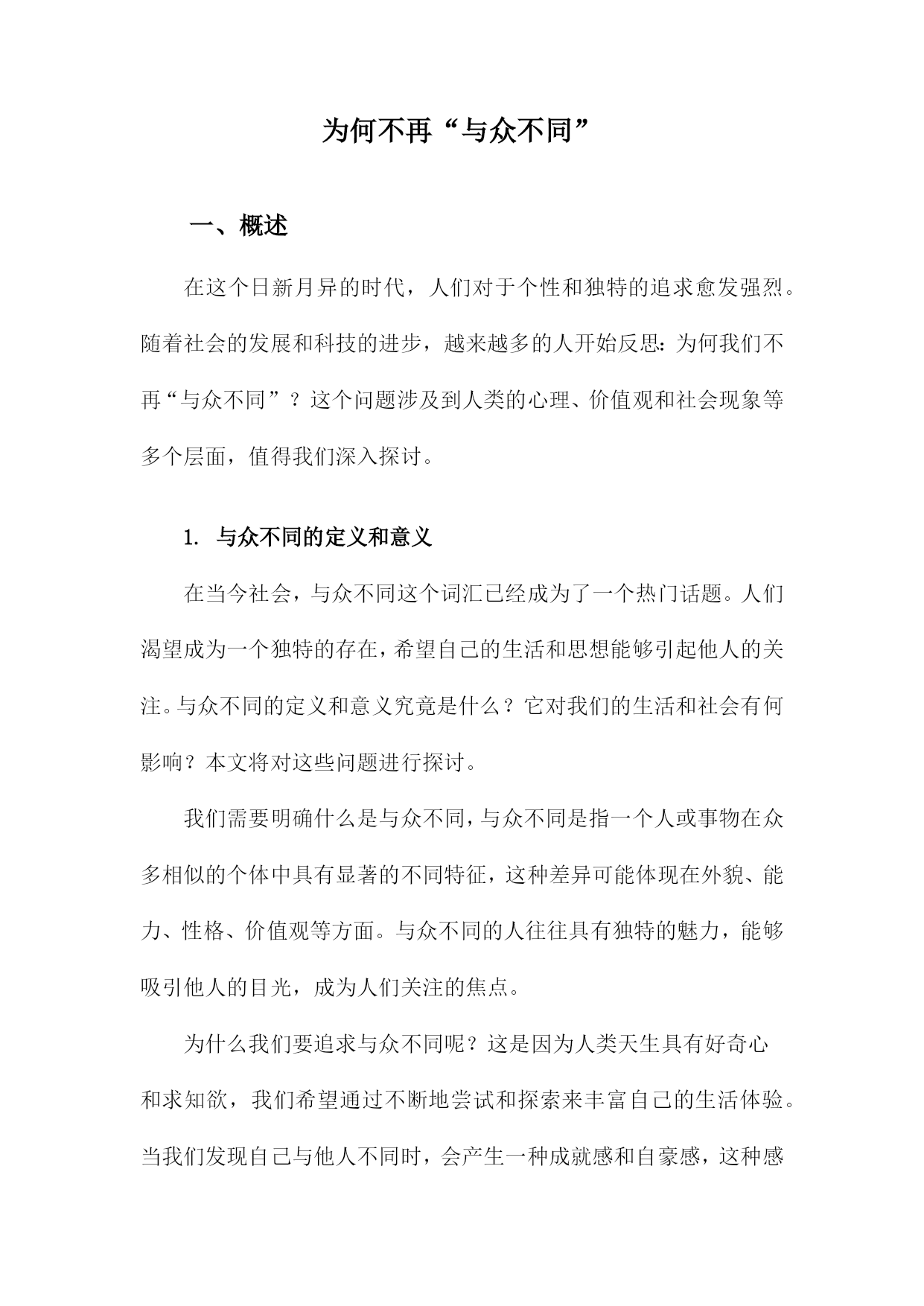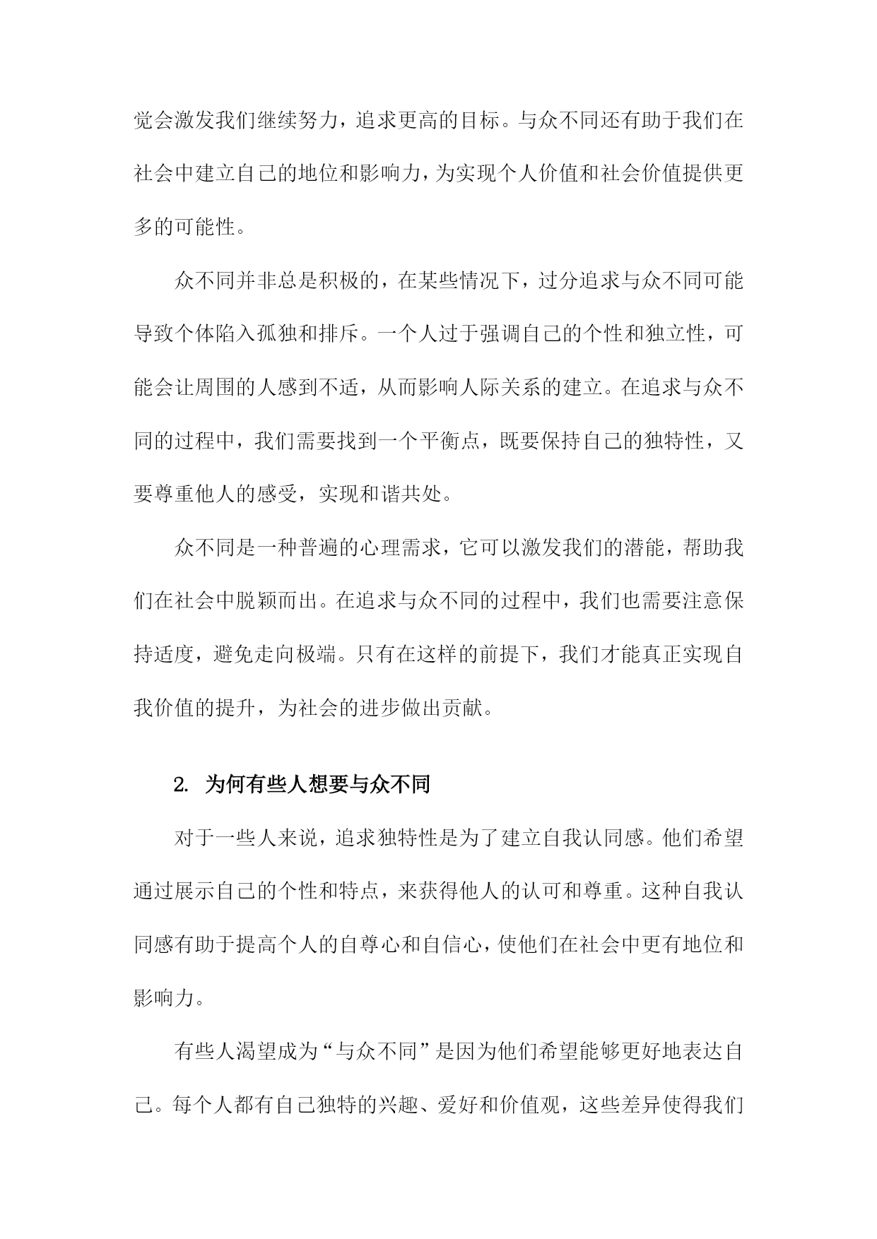 为何不再“与众不同”一、概述在这个日新月异的时代,人们对于个性和独特的追求愈发强烈。随着社会的发展和科技的进步,越来越多的人开始反思:为何我们不再“与众不同”?这个问题涉及到人类的心理、价值观和社会现象等多个层面,值得我们深入探讨。1.与众不同的定义和意义在当今社会,与众不同这个词汇已经成为了一个热门话题。人们渴望成为一个独特的存在,希望自己的生活和思想能够引起他人的关注。与众不同的定义和意义究竟是什么?它对我们的生活和社会有何影响?本文将对这些问题进行探讨。我们需要明确什么是与众不同,与众不同是指一个人或事物在众多相似的个体中具有显著的不同特征,这种差异可能体现在外貌、能力、性格、价值观等方面。与众不同的人往往具有独特的魅力,能够吸引他人的目光,成为人们关注的焦点。为什么我们要追求与众不同呢?这是因为人类天生具有好奇心和求知欲,我们希望通过不断地尝试和探索来丰富自己的生活体验。当我们发现自己与他人不同时,会产生一种成就感和自豪感,这种感觉会激发我们继续努力,追求更高的目标。与众不同还有助于我们在社会中建立自己的地位和影响力,为实现个人价值和社会价值提供更多的可能性。众不同并非总是积极的,在某些情况下,过分追求与众不同可能导致个体陷入孤独和排斥。一个人过于强调自己的个性和独立性,可能会让周围的人感到不适,从而影响人际关系的建立。在追求与众不同的过程中,我们需要找到一个平衡点,既要保持自己的独特性,又要尊重他人的感受,实现和谐共处。众不同是一种普遍的心理需求,它可以激发我们的潜能,帮助我们在社会中脱颖而出。在追求与众不同的过程中,我们也需要注意保持适度,避免走向极端。只有在这样的前提下,我们才能真正实现自我价值的提升,为社会的进步做出贡献。2.为何有些人想要与众不同对于一些人来说,追求独特性是为了建立自我认同感。他们希望通过展示自己的个性和特点,来获得他人的认可和尊重。这种自我认同感有助于提高个人的自尊心和自信心,使他们在社会中更有地位和影响力。有些人渴望成为“与众不同”是因为他们希望能够更好地表达自己。每个人都有自己独特的兴趣、爱好和价值观,这些差异使得我们在与他人交流时更加丰富多彩。通过展示自己的个性,这些人可以更容易地与他人建立联系,分享彼此的经历和感受。在这个竞争激烈的社会中,许多人担心自己会变得平庸无奇。为了避免被淹没在人群中,他们选择追求独特性,以此来区分自己和他人的差异。这种对抗平庸的心态使得许多人愿意付出更多的努力,以求在各个方面都能表现出众。有些人之所以渴望成为“与众不同”是因为他们对事物有着强烈的好奇心。他们喜欢尝试新事物,探索未知领域,并从中获得成就感。这种好奇心驱使他们不断挑战自己,突破舒适区,从而实现个人的成长和发展。在一定程度上,追求独特性也有助于提高个人在社交场合的优势。具有独特魅力的人往往更容易吸引他人的注意,从而在人际关系中占据有利地位。拥有独特品味和见解的人通常更擅长发现新鲜事物和创意思维,这对于他们在工作和生活中的成功至关重要。追求独特性是人类的一种普遍心理需求,这种需求可能源于对自我认同感的追求、对表达自我的渴望、对抗平庸的心态、满足好奇心的需求以及在社交场合的优势等多种原因。我们也应该意识到,在追求独特性的过程中,要保持适度,避免过于极端的表现,以免给他人带来困扰或误解。二、社会压力与与众不同在当今社会,人们越来越重视个性和独特性,追求与众不同。这种追求也带来了一定的社会压力,人们希望通过与众不同来展示自己的个性和才华,以获得他人的关注和认可;另一方面,社会舆论和大众审美也会对个体产生压力,使得许多人在追求与众不同的过程中不得不做出妥协和调整。从心理学的角度来看,人们天生具有追求认同感的需求。这种需求驱使人们在社交场合中寻求与他人的共同点,以便建立联系和归属感。当个体试图通过与众不同来满足这种需求时,就可能面临来自周围人的负面评价和排斥。这种压力可能导致个体感到焦虑、沮丧甚至自卑,从而影响其心理健康和生活质量。社会舆论和大众审美对个体的影响也是不容忽视的,在媒体和网络的影响下,人们往往容易受到某种审美观念和价值观的束缚,从而在追求与众不同的过程中不得不迎合这些观念。在时尚界,一些人为了追求独特性和新颖性,不惜花费大量金钱购买限量版或定制商品;在娱乐圈,一些明星为了迎合观众口味,不得不改变自己的形象和风格。这种迎合行为虽然有时能够带来短暂的成功和关注,但长期来看,却可能导致个体失去自我,陷入无尽的模仿和跟风之中。众不同也可能带来实际的生活困扰,在职场竞争中,过于独特的个性可能会让人们觉得难以相处或者难以管理;在人际关系中,过于强烈的自我主张可能会让人们觉得自私或者固执。这些因素都可能影响个体在社会中的适应能力和发展空间。尽管追求与众不同可以满足人们