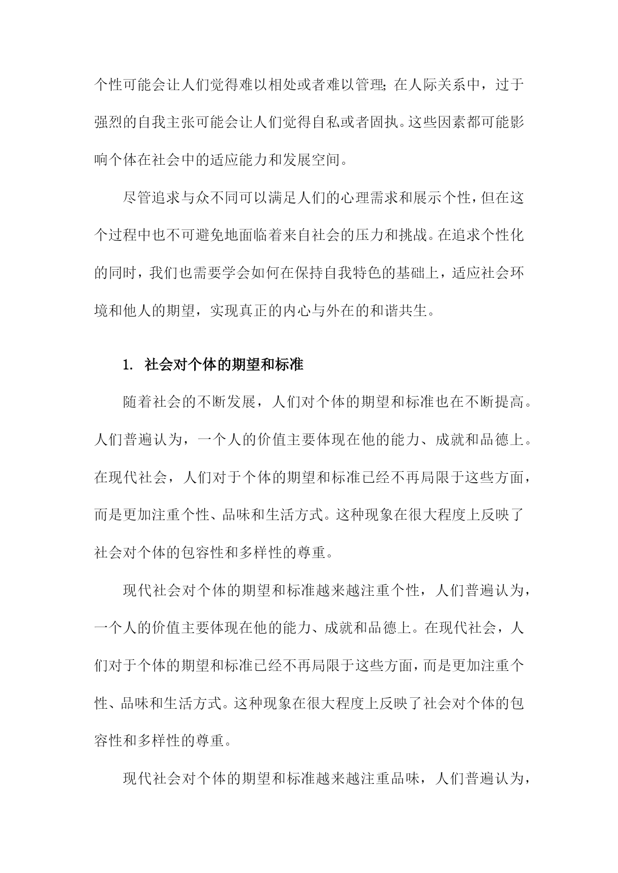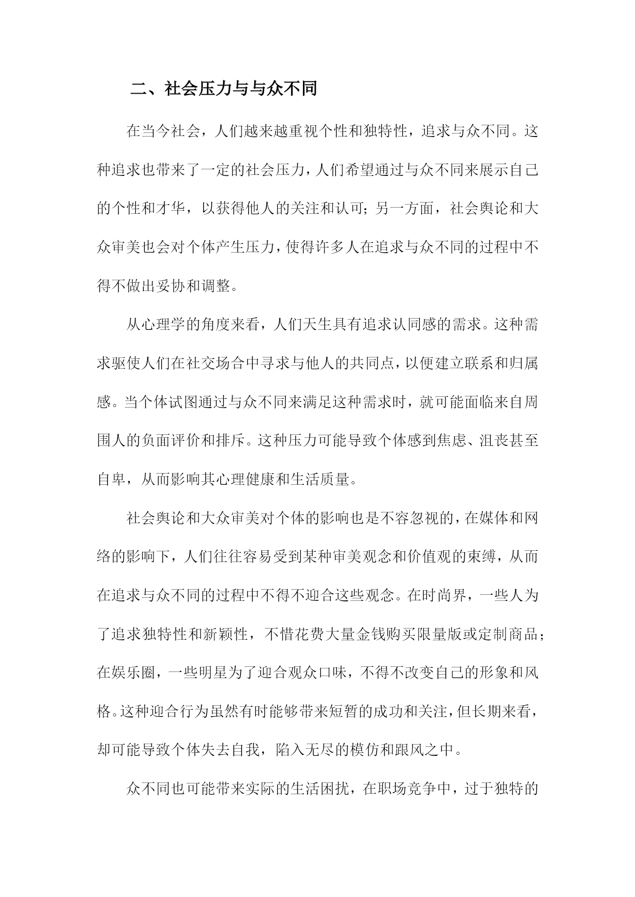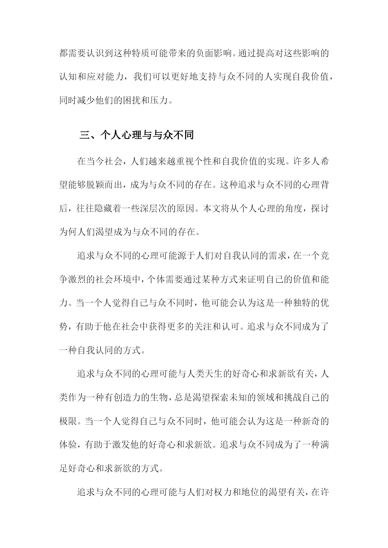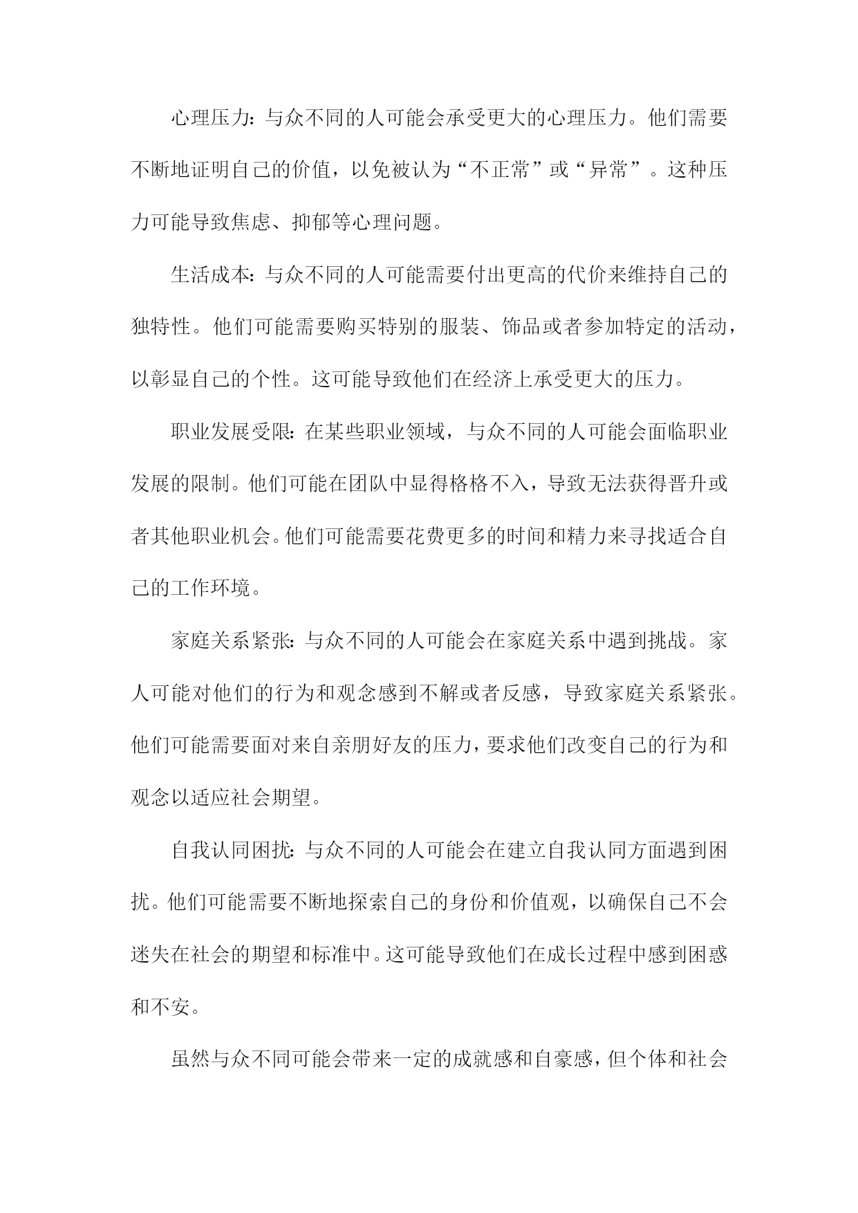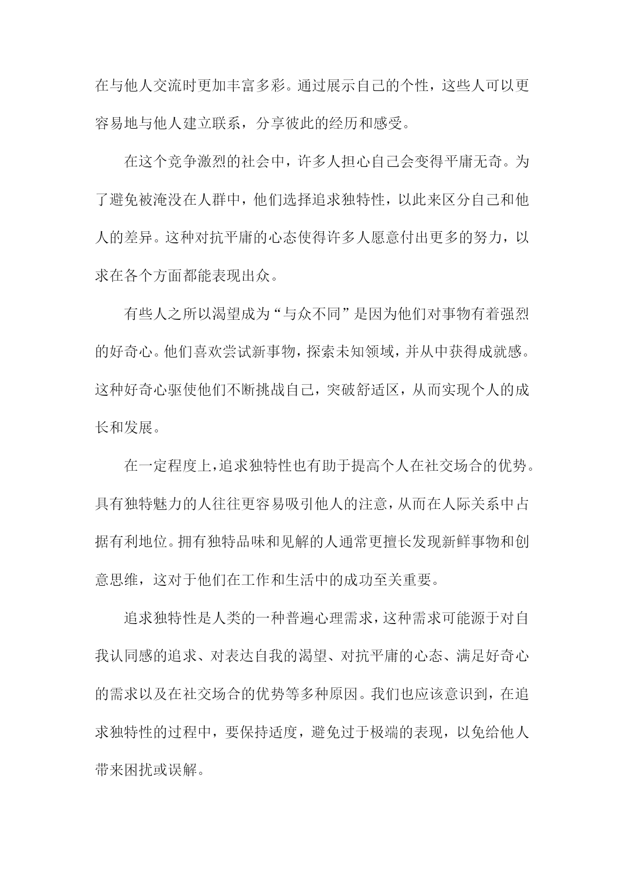 为何不再“与众不同”一、概述在这个日新月异的时代,人们对于个性和独特的追求愈发强烈。随着社会的发展和科技的进步,越来越多的人开始反思:为何我们不再“与众不同”?这个问题涉及到人类的心理、价值观和社会现象等多个层面,值得我们深入探讨。1.与众不同的定义和意义在当今社会,与众不同这个词汇已经成为了一个热门话题。人们渴望成为一个独特的存在,希望自己的生活和思想能够引起他人的关注。与众不同的定义和意义究竟是什么?它对我们的生活和社会有何影响?本文将对这些问题进行探讨。我们需要明确什么是与众不同,与众不同是指一个人或事物在众多相似的个体中具有显著的不同特征,这种差异可能体现在外貌、能力、性格、价值观等方面。与众不同的人往往具有独特的魅力,能够吸引他人的目光,成为人们关注的焦点。为什么我们要追求与众不同呢?这是因为人类天生具有好奇心和求知欲,我们希望通过不断地尝试和探索来丰富自己的生活体验。当我们发现自己与他人不同时,会产生一种成就感和自豪感,这种感觉会激发我们继续努力,追求更高的目标。与众不同还有助于我们在社会中建立自己的地位和影响力,为实现个人价值和社会价值提供更多的可能性。众不同并非总是积极的,在某些情况下,过分追求与众不同可能导致个体陷入孤独和排斥。一个人过于强调自己的个性和独立性,可能会让周围的人感到不适,从而影响人际关系的建立。在追求与众不同的过程中,我们需要找到一个平衡点,既要保持自己的独特性,又要尊重他人的感受,实现和谐共处。众不同是一种普遍的心理需求,它可以激发我们的潜能,帮助我们在社会中脱颖而出。在追求与众不同的过程中,我们也需要注意保持适度,避免走向极端。只有在这样的前提下,我们才能真正实现自我价值的提升,为社会的进步做出贡献。2.为何有些人想要与众不同对于一些人来说,追求独特性是为了建立自我认同感。他们希望通过展示自己的个性和特点,来获得他人的认可和尊重。这种自我认同感有助于提高个人的自尊心和自信心,使他们在社会中更有地位和影响力。有些人渴望成为“与众不同”是因为他们希望能够更好地表达自己。每个人都有自己独特的兴趣、爱好和价值观,这些差异使得我们在与他人交流时更加丰富多彩。通过展示自己的个性,这些人可以更容易地与他人建立联系,分享彼此的经历和感受。在这个竞争激烈的社会中,许多人担心自己会变得平庸无奇。为了避免被淹没在人群中,他们选择追求独特性,以此来区分自己和他人的差异。这种对抗平庸的心态使得许多人愿意付出更多的努力,以求在各个方面都能表现出众。有些人之所以渴望成为“与众不同”是因为他们对事物有着强烈的好奇心。他们喜欢尝试新事物,探索未知领域,并从中获得成就感。这种好奇心驱使他们不断挑战自己,突破舒适区,从而实现个人的成长和发展。在一定程度上,追求独特性也有助于提高个人在社交场合的优势。具有独特魅力的人往往更容易吸引他人的注意,从而在人际关系中占据有利地位。拥有独特品味和见解的人通常更擅长发现新鲜事物和创意思维,这对于他们在工作和生活中的成功至关重要。追求独特性是人类的一种普遍心理需求,这种需求可能源于对自我认同感的追求、对表达自我的渴望、对抗平庸的心态、满足好奇心的需求以及在社交场合的优势等多种原因。我们也应该意识到,在追求独特性的过程中,要保持适度,避免过于极端的表现,以免给他人带来困扰或误解。二、社会压力与与众不同在当今社会,人们越来越重视个性和独特性,追求与众不同。这种追求也带来了一定的社会压力,人们希望通过与众不同来展示自己的个性和才华,以获得他人的关注和认可;另一方面,社会舆论和大众审美也会对个体产生压力,使得许多人在追求与众不同的过程中不得不做出妥协和调整。从心理学的角度来看,人们天生具有追求认同感的需求。这种需求驱使人们在社交场合中寻求与他人的共同点,以便建立联系和归属感。当个体试图通过与众不同来满足这种需求时,就可能面临来自周围人的负面评价和排斥。这种压力可能导致个体感到焦虑、沮丧甚至自卑,从而影响其心理健康和生活质量。社会舆论和大众审美对个体的影响也是不容忽视的,在媒体和网络的影响下,人们往往容易受到某种审美观念和价值观的束缚,从而在追求与众不同的过程中不得不迎合这些观念。在时尚界,一些人为了追求独特性和新颖性,不惜花费大量金钱购买限量版或定制商品;在娱乐圈,一些明星为了迎合观众口味,不得不改变自己的形象和风格。这种迎合行为虽然有时能够带来短暂的成功和关注,但长期来看,却可能导致个体失去自我,陷入无尽的模仿和跟风之中。众不同也可能带来实际的生活困扰,在职场竞争中,过于独特的个性可能会让人们觉得难以相处或者难以管理;在人际关系中,过于强烈的自我主张可能会让人们觉得自私或者固执。这些因素都可能影响个体在社会中的适应能力和发展空间。尽管追求与众不同可以满足人们