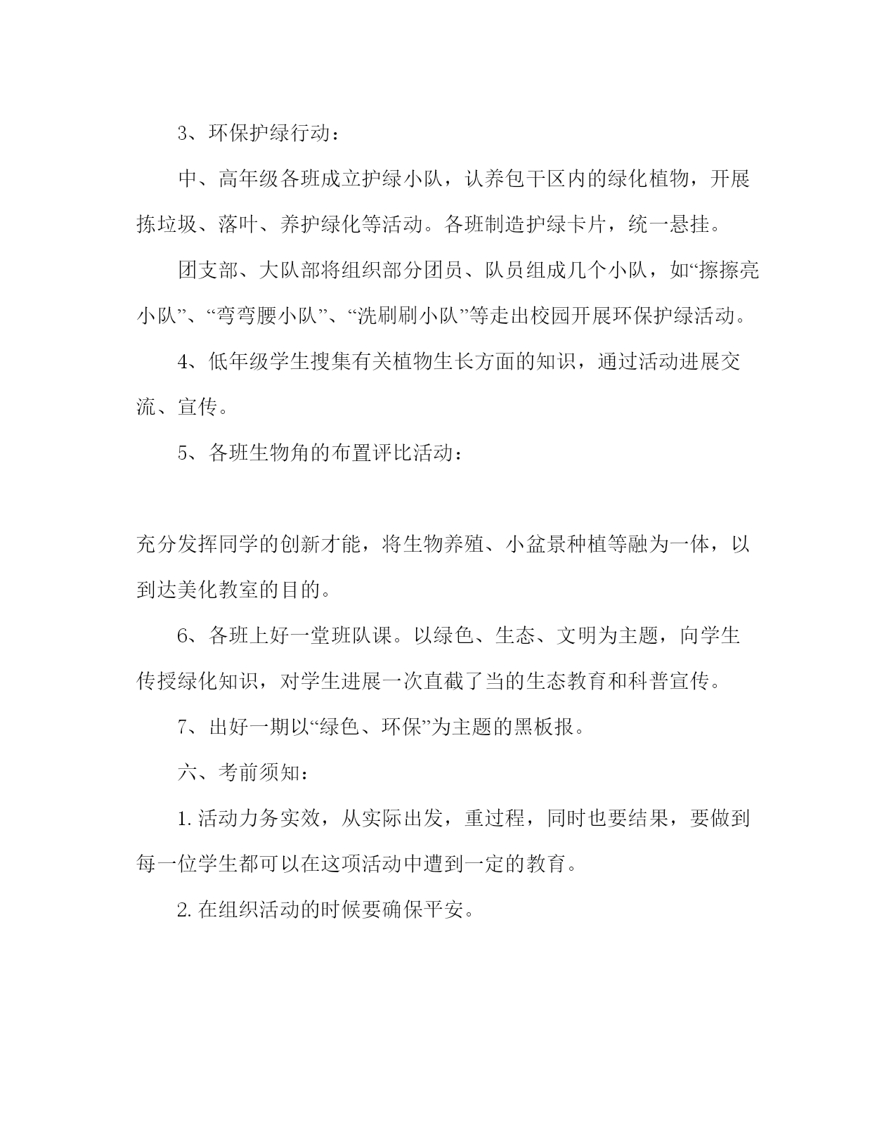 政教处范文之学校植树节活动方案一、活动目的:本次活动以植树节为契机,开展方式多样的植物种植、认养、护绿活动,要求人人参与,让学生在活动中体验环保,增长对植物生长的理解,加强环保认识、生态认识,为班级、学校、社区增添绿色,净化、绿化、美化环境。大力弘扬生态文明,积极应对全球气候变化,全面推进森林南浔建立,从而营建人与自然和谐相处的环境。二、活动口号:让我们积极行动,为地球妈妈献一片绿色三、活动时间:2010年3月四、参加人员:全校学生五、详细活动安排:1、在升旗仪式上向全体学生发出“为地球妈妈献一片绿色”的建议:人人参与植树、护绿、环保活动,为美化校园,净化环境尽一份力。(3月10日韩剑萍)2、播种、植树、栽花、种草活动:在各班的劳动实践基地进展动手种植的实践活动,播棉花、向日葵等种子,学生撰写观察日记。每个学生在自家的房前屋后种一棵树、栽一棵花或种一片草,并精心呵护。3、环保护绿行动:中、高年级各班成立护绿小队,认养包干区内的绿化植物,开展拣垃圾、落叶、养护绿化等活动。各班制造护绿卡片,统一悬挂。团支部、大队部将组织部分团员、队员组成几个小队,如“擦擦亮小队”、“弯弯腰小队”、“洗刷刷小队”等走出校园开展环保护绿活动。4、低年级学生搜集有关植物生长方面的知识,通过活动进展交流、宣传。5、各班生物角的布置评比活动:充分发挥同学的创新才能,将生物养殖、小盆景种植等融为一体,以到达美化教室的目的。6、各班上好一堂班队课。以绿色、生态、文明为主题,向学生传授绿化知识,对学生进展一次直截了当的生态教育和科普宣传。7、出好一期以“绿色、环保”为主题的黑板报。六、考前须知:1.活动力务实效,从实际出发,重过程,同时也要结果,要做到每一位学生都可以在这项活动中遭到一定的教育。2.在组织活动的时候要确保平安。