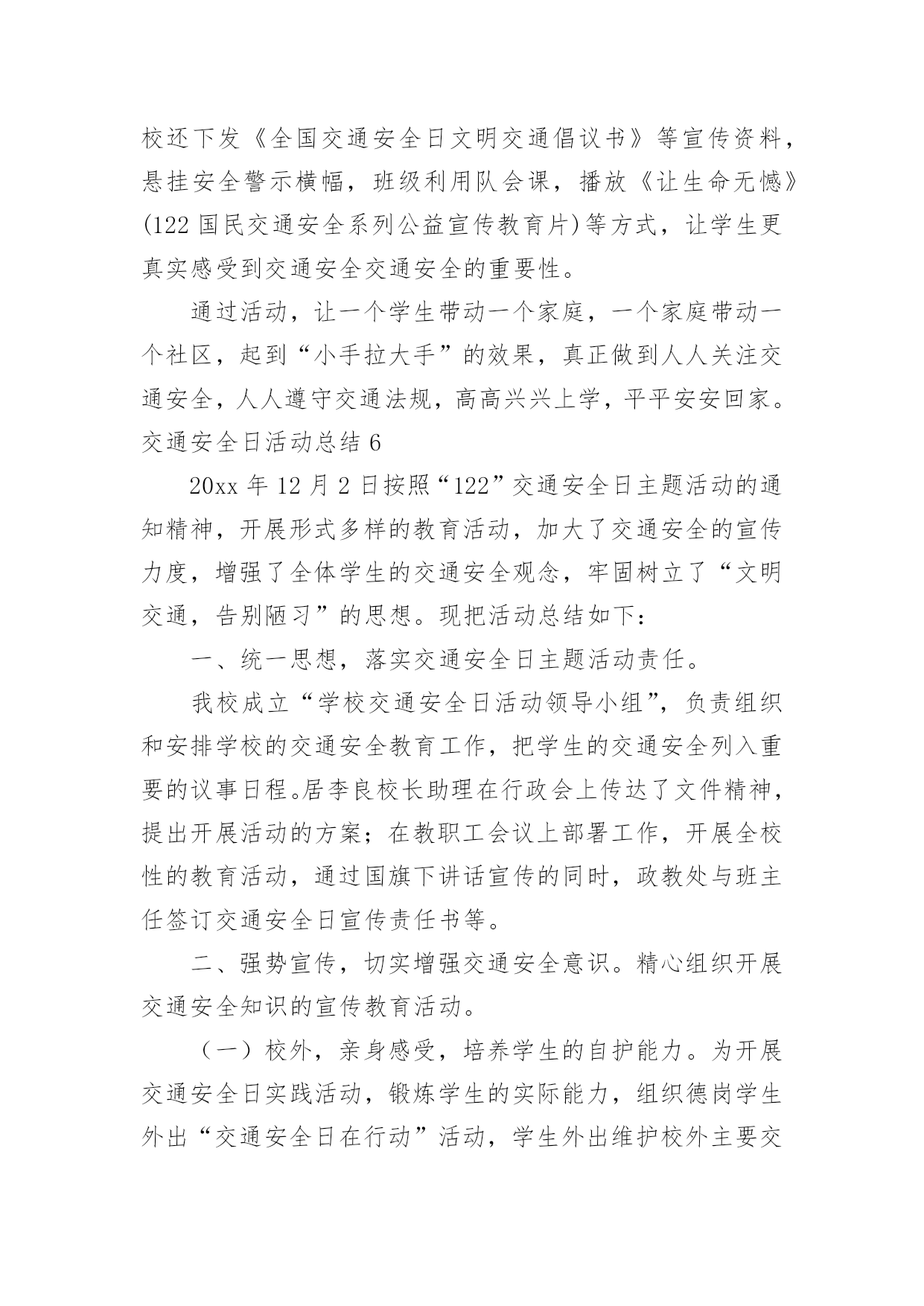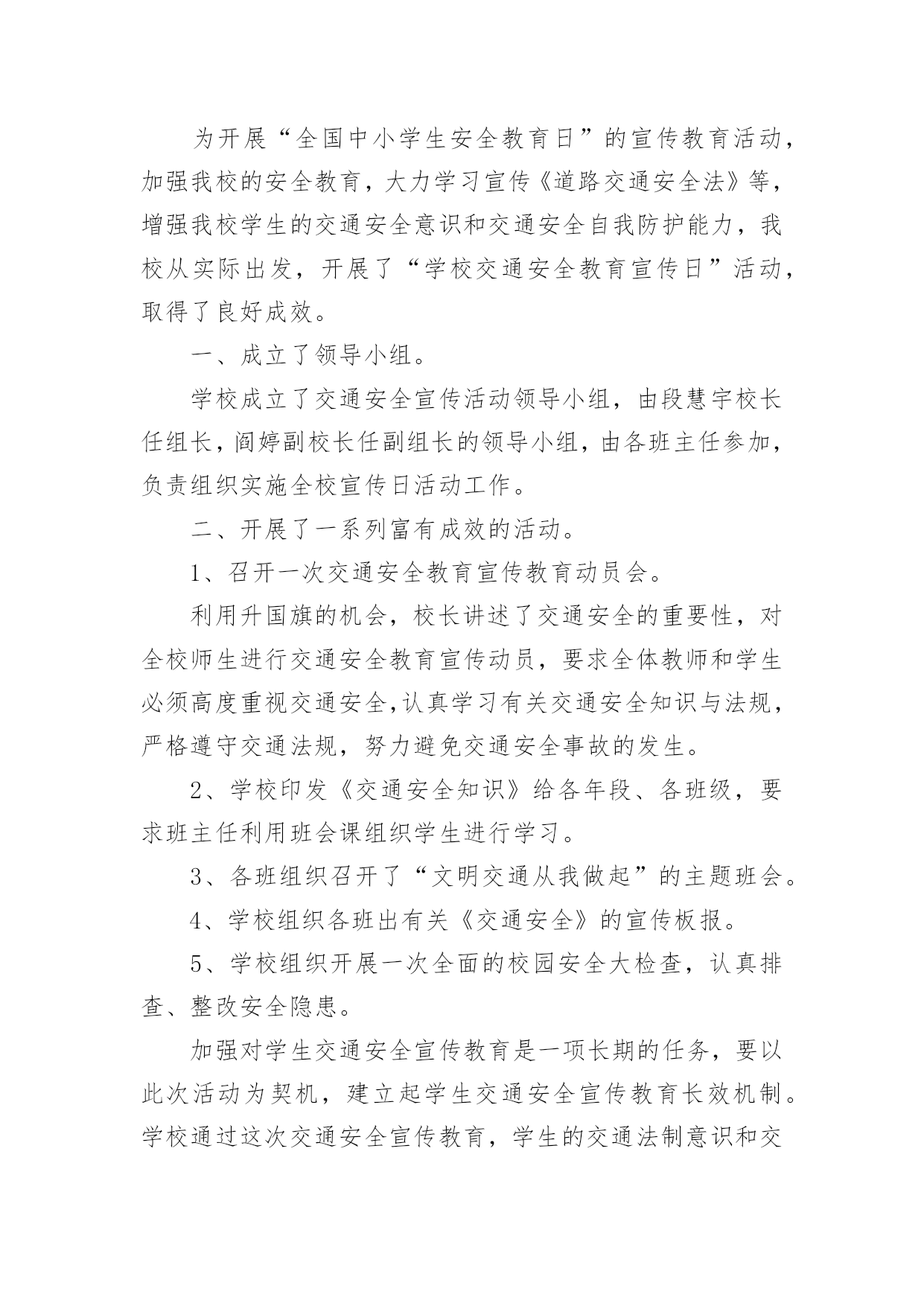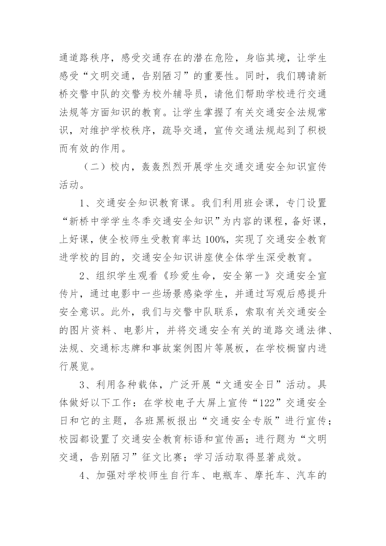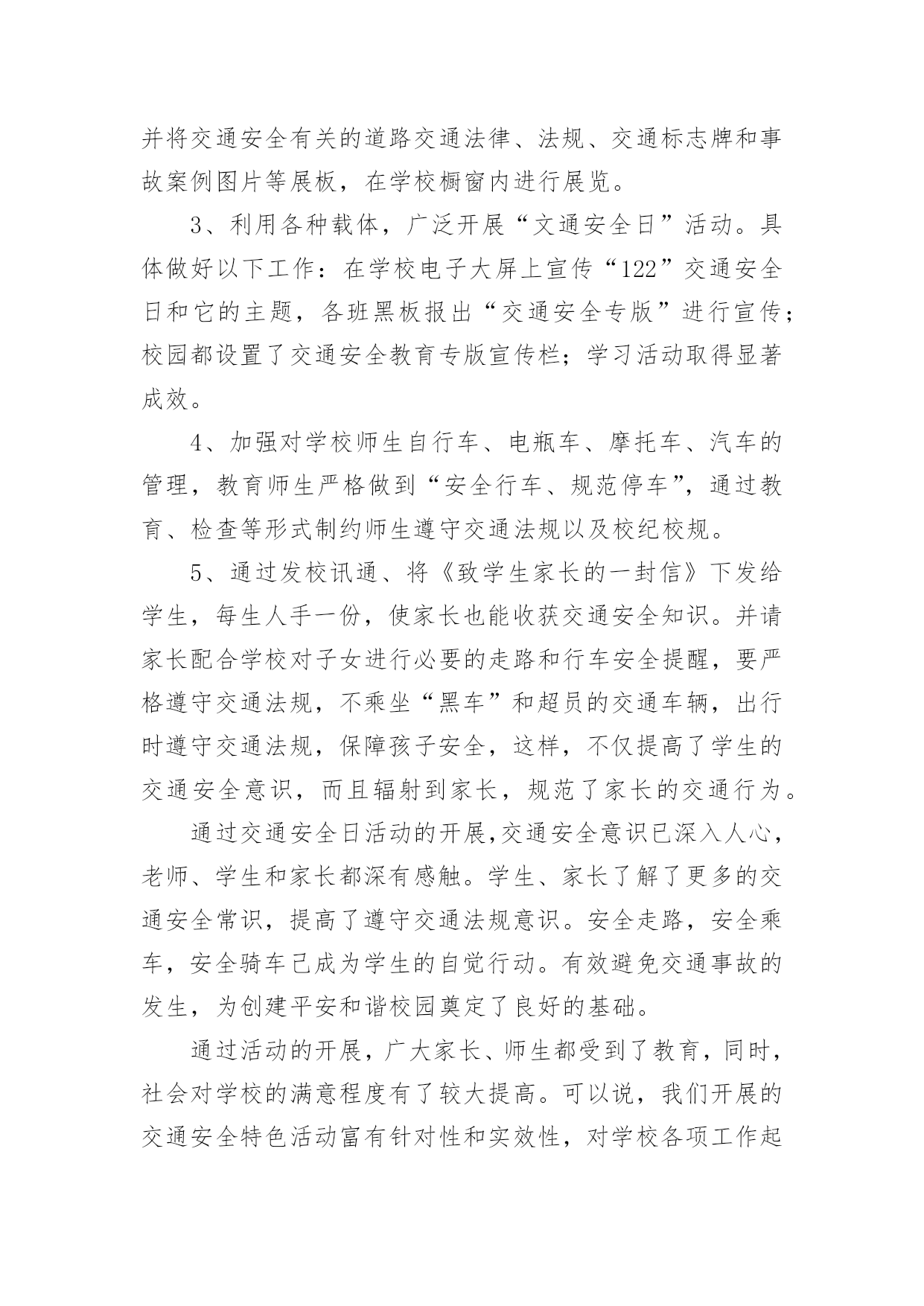 交通安全日活动总结交通安全日活动总结总结是对某一阶段的工作、学习或思想中的经验或情况进行分析研究的书面材料,它可使零星的、肤浅的、表面的感性认知上升到全面的、系统的、本质的理性认识上来,让我们抽出时间写写总结吧。那么总结要注意有什么内容呢?下面是小编精心整理的交通安全日活动总结,供大家参考借鉴,希望可以帮助到有需要的朋友。交通安全日活动总结1为增强广大师生交通安全和法律意识,11月23日,我局交警大队深入三江小学开展“交通安全宣传活动”讲座,受到在校1200多名师生的一致好评。民警针对学生的年龄特点,提醒小学生要时刻注意自身安全,提高自我安全防范意识。同时,通过讲述交通事故实例,警示学生们一定要遵守交通规则,文明礼让出行,不要骑自行车相互追逐,过马路要“一停二看三经过”,养成良好的交通习惯。开展此次交通安全知识讲座,进一步增强了学生们的交通安全防范意识和自我保护能力,为莘莘学子们的健康快乐成长提供了正面的交通安全宣传力量。交通安全日活动总结2为开展“全国中小学生安全教育日”的宣传教育活动,加强我校的安全教育,大力学习宣传《道路交通安全法》等,增强我校学生的交通安全意识和交通安全自我防护能力,我校从实际出发,开展了“学校交通安全教育宣传日”活动,取得了良好成效。一、成立了领导小组。学校成立了交通安全宣传活动领导小组,由段慧宇校长任组长,阎婷副校长任副组长的领导小组,由各班主任参加,负责组织实施全校宣传日活动工作。二、开展了一系列富有成效的活动。1、召开一次交通安全教育宣传教育动员会。利用升国旗的机会,校长讲述了交通安全的重要性,对全校师生进行交通安全教育宣传动员,要求全体教师和学生必须高度重视交通安全,认真学习有关交通安全知识与法规,严格遵守交通法规,努力避免交通安全事故的发生。2、学校印发《交通安全知识》给各年段、各班级,要求班主任利用班会课组织学生进行学习。3、各班组织召开了“文明交通从我做起”的主题班会。4、学校组织各班出有关《交通安全》的宣传板报。5、学校组织开展一次全面的校园安全大检查,认真排查、整改安全隐患。加强对学生交通安全宣传教育是一项长期的任务,要以此次活动为契机,建立起学生交通安全宣传教育长效机制。学校通过这次交通安全宣传教育,学生的交通法制意识和交通安全意识得到了很大的提高。交通安全日活动总结3我校严格执行关于开展20xx年“122”交通安全日主题活动的通知精神,开展形式多样的教育活动,加大了交通安全的宣传力度,增强了全体学生的交通安全观念,牢固树立了“摒弃交通陋习安全文明出行”的思想。现就活动情况汇报如下:一、加强领导,落实责任。我校成立“学校交通安全日活动领导小组”,负责组织和安排学校的交通安全教育工作,把学生的交通安全列入重要的议事日程。杜双莲校长全体教师会议上传达了通知精神,并部署工作,开展全校性的教育活动,通过国旗下讲话宣传的同时,要求各班组织召开一次关于交通安全的主题班会、观看交通安全教育警示片。二、加强宣传,增强意识。精心组织开展交通安全知识的宣传教育活动。(一)开展学生交通交通安全知识宣传活动。1、交通安全知识教育课。我们利用班会课,专门设置“惠济一中学生冬季交通安全知识”,并为学生认真讲解宣传,使全校师生受教育率达100%,实现了交通安全教育进课堂的目的,交通安全知识专题讲座使全体学生深受教育。2、组织学生观看《生命瞬间》宣传片,通过电影中一些场景感染学生,并通过写观后感提升安全意识。此外,我们与交警中队联系,索取有关交通安全的图片资料、电影片,并将交通安全有关的道路交通法律、法规、交通标志牌和事故案例图片等展板,在学校橱窗内进行展览。3、利用各种载体,广泛开展“文通安全日”活动。具体做好以下工作:在学校电子大屏上宣传“122”交通安全日和它的主题,各班黑板报出“交通安全专版”进行宣传;校园都设置了交通安全教育专版宣传栏;学习活动取得显著成效。4、加强对学校师生自行车、电瓶车、摩托车、汽车的管理,教育师生严格做到“安全行车、规范停车”,通过教育、检查等形式制约师生遵守交通法规以及校纪校规。5、通过发校讯通、将《致学生家长的一封信》下发给学生,每生人手一份,使家长也能收获交通安全知识。并请家长配合学校对子女进行必要的走路和行车安全提醒,要严格遵守交通法规,不乘坐“黑车”和超员的交通车辆,出行时遵守交通法规,保障孩子安全,这样,不仅提高了学生的交通安全意识,而且辐射到家长,规范了家长的交通行为。通过交通安全日活动的开展,交通安全意识已深入人心,老师、学生和家长都深有感触。学生、家长了解了更多的交通安全常识,提高了遵守交通法规意识。安全走路,安全乘车,安全骑车己成为学生的自觉行动。有效避免交通事故的发生,为创建平安和谐校园奠定了良好的基础。通过活动的开展,广大家长、师生都受到了教育,同时,社