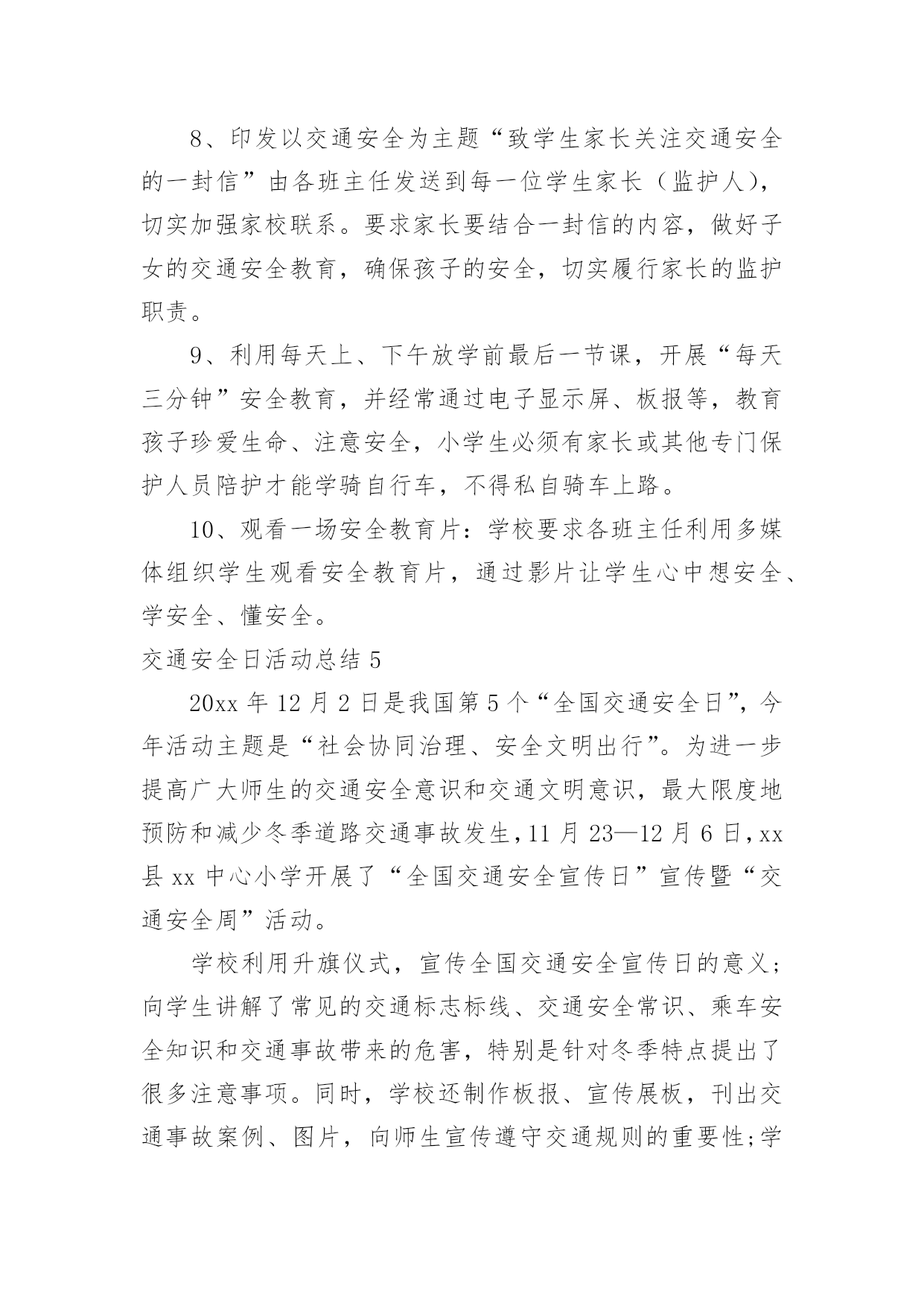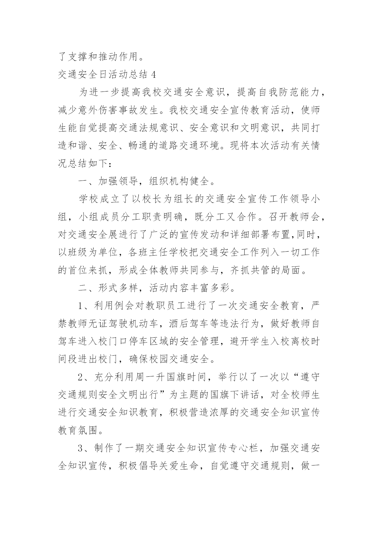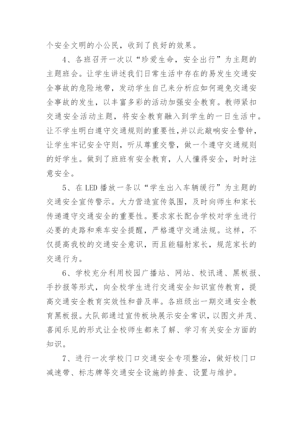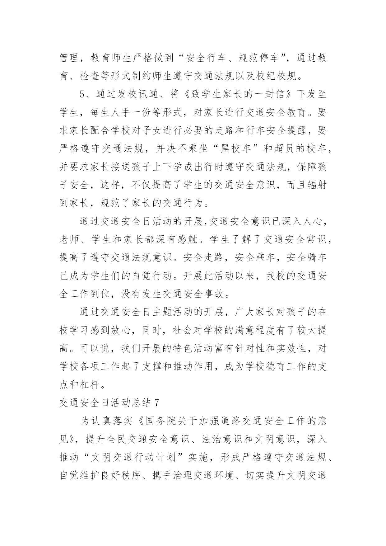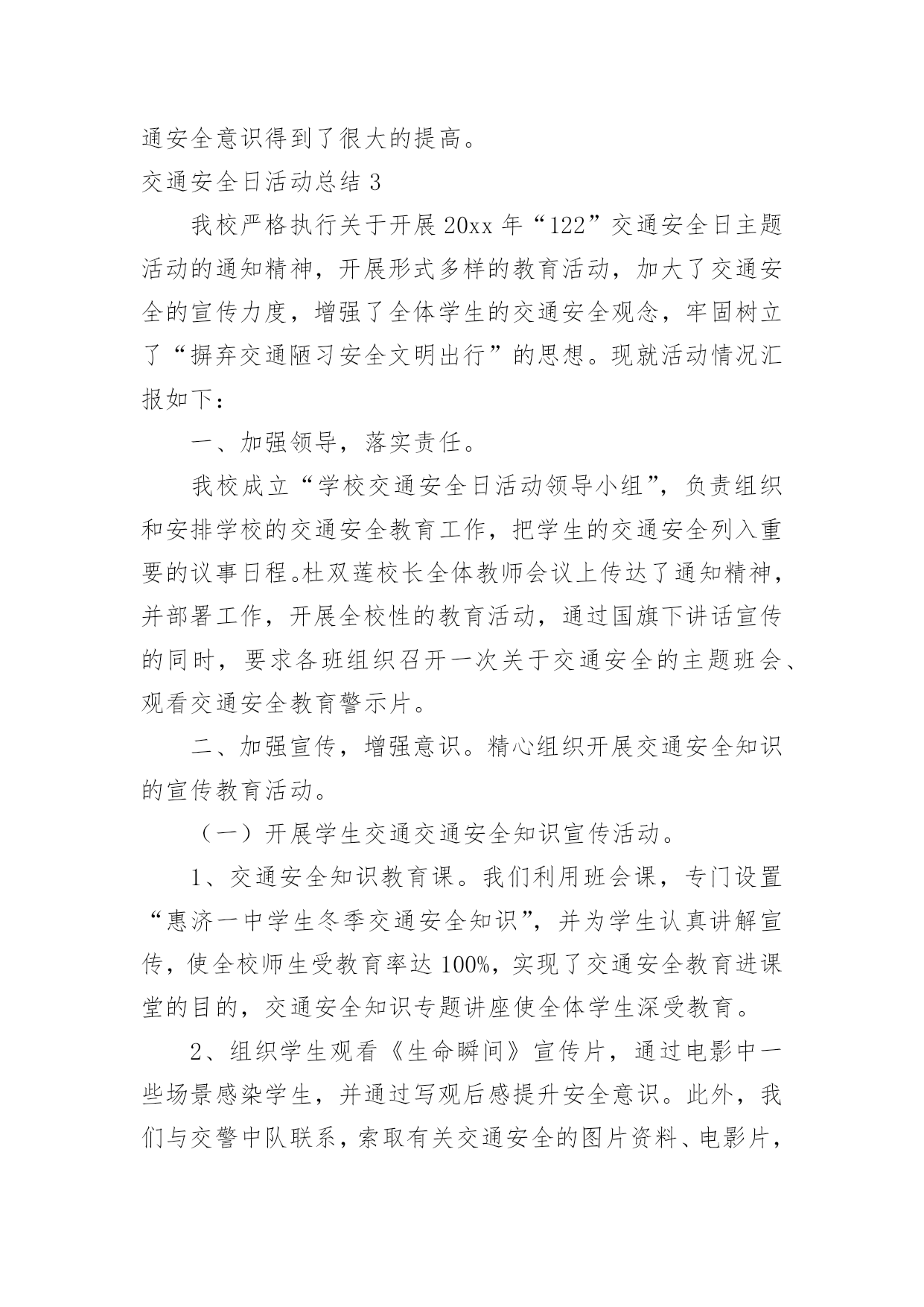 交通安全日活动总结交通安全日活动总结总结是对某一阶段的工作、学习或思想中的经验或情况进行分析研究的书面材料,它可使零星的、肤浅的、表面的感性认知上升到全面的、系统的、本质的理性认识上来,让我们抽出时间写写总结吧。那么总结要注意有什么内容呢?下面是小编精心整理的交通安全日活动总结,供大家参考借鉴,希望可以帮助到有需要的朋友。交通安全日活动总结1为增强广大师生交通安全和法律意识,11月23日,我局交警大队深入三江小学开展“交通安全宣传活动”讲座,受到在校1200多名师生的一致好评。民警针对学生的年龄特点,提醒小学生要时刻注意自身安全,提高自我安全防范意识。同时,通过讲述交通事故实例,警示学生们一定要遵守交通规则,文明礼让出行,不要骑自行车相互追逐,过马路要“一停二看三经过”,养成良好的交通习惯。开展此次交通安全知识讲座,进一步增强了学生们的交通安全防范意识和自我保护能力,为莘莘学子们的健康快乐成长提供了正面的交通安全宣传力量。交通安全日活动总结2为开展“全国中小学生安全教育日”的宣传教育活动,加强我校的安全教育,大力学习宣传《道路交通安全法》等,增强我校学生的交通安全意识和交通安全自我防护能力,我校从实际出发,开展了“学校交通安全教育宣传日”活动,取得了良好成效。一、成立了领导小组。学校成立了交通安全宣传活动领导小组,由段慧宇校长任组长,阎婷副校长任副组长的领导小组,由各班主任参加,负责组织实施全校宣传日活动工作。二、开展了一系列富有成效的活动。1、召开一次交通安全教育宣传教育动员会。利用升国旗的机会,校长讲述了交通安全的重要性,对全校师生进行交通安全教育宣传动员,要求全体教师和学生必须高度重视交通安全,认真学习有关交通安全知识与法规,严格遵守交通法规,努力避免交通安全事故的发生。2、学校印发《交通安全知识》给各年段、各班级,要求班主任利用班会课组织学生进行学习。3、各班组织召开了“文明交通从我做起”的主题班会。4、学校组织各班出有关《交通安全》的宣传板报。5、学校组织开展一次全面的校园安全大检查,认真排查、整改安全隐患。加强对学生交通安全宣传教育是一项长期的任务,要以此次活动为契机,建立起学生交通安全宣传教育长效机制。学校通过这次交通安全宣传教育,学生的交通法制意识和交通安全意识得到了很大的提高。交通安全日活动总结3我校严格执行关于开展20xx年“122”交通安全日主题活动的通知精神,开展形式多样的教育活动,加大了交通安全的宣传力度,增强了全体学生的交通安全观念,牢固树立了“摒弃交通陋习安全文明出行”的思想。现就活动情况汇报如下:一、加强领导,落实责任。我校成立“学校交通安全日活动领导小组”,负责组织和安排学校的交通安全教育工作,把学生的交通安全列入重要的议事日程。杜双莲校长全体教师会议上传达了通知精神,并部署工作,开展全校性的教育活动,通过国旗下讲话宣传的同时,要求各班组织召开一次关于交通安全的主题班会、观看交通安全教育警示片。二、加强宣传,增强意识。精心组织开展交通安全知识的宣传教育活动。(一)开展学生交通交通安全知识宣传活动。1、交通安全知识教育课。我们利用班会课,专门设置“惠济一中学生冬季交通安全知识”,并为学生认真讲解宣传,使全校师生受教育率达100%,实现了交通安全教育进课堂的目的,交通安全知识专题讲座使全体学生深受教育。2、组织学生观看《生命瞬间》宣传片,通过电影中一些场景感染学生,并通过写观后感提升安全意识。此外,我们与交警中队联系,索取有关交通安全的图片资料、电影片,并将交通安全有关的道路交通法律、法规、交通标志牌和事故案例图片等展板,在学校橱窗内进行展览。3、利用各种载体,广泛开展“文通安全日”活动。具体做好以下工作:在学校电子大屏上宣传“122”交通安全日和它的主题,各班黑板报出“交通安全专版”进行宣传;校园都设置了交通安全教育专版宣传栏;学习活动取得显著成效。4、加强对学校师生自行车、电瓶车、摩托车、汽车的管理,教育师生严格做到“安全行车、规范停车”,通过教育、检查等形式制约师生遵守交通法规以及校纪校规。5、通过发校讯通、将《致学生家长的一封信》下发给学生,每生人手一份,使家长也能收获交通安全知识。并请家长配合学校对子女进行必要的走路和行车安全提醒,要严格遵守交通法规,不乘坐“黑车”和超员的交通车辆,出行时遵守交通法规,保障孩子安全,这样,不仅提高了学生的交通安全意识,而且辐射到家长,规范了家长的交通行为。通过交通安全日活动的开展,交通安全意识已深入人心,老师、学生和家长都深有感触。学生、家长了解了更多的交通安全常识,提高了遵守交通法规意识。安全走路,安全乘车,安全骑车己成为学生的自觉行动。有效避免交通事故的发生,为创建平安和谐校园奠定了良好的基础。通过活动的开展,广大家长、师生都受到了教育,同时,社