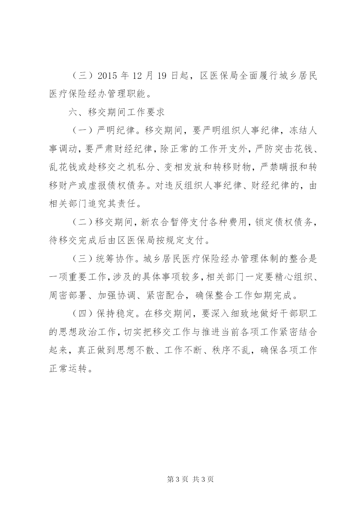 第PAGE\*Arabic\*MERGEFORMAT3页共NUMPAGES\*MERGEFORMAT3页城乡医疗保险,整合移交方案xxx城乡居民医疗保险整合移交工作实施方案为了确保我区城镇居民基本医疗保险和新型农村合作医疗整合工作的顺利推进,按照区委区政府的要求,结合工作实际,制定本实施方案。一、指导思想按照“积极稳妥、密切配合、平稳交接、有序进行”的工作要求,实现管理职能、机构人员、基金、资产、债权债务、信息等工作的平稳划转和整体移交,确保移交期间工作不断、队伍不乱。二、移交步骤(一)经办机构和人员移交。将区卫计局管理的新农合经办机构及在编在职工作人员整体划转至由区人社局管理的医保局,保证队伍的整体性和工作的连续性。(二)职能和业务移交。将新农合的经办和管理职能移交至区医保局。(三)资产移交。对所移交的办公设备等各类资产,新农合要进行整理、列出清单、登记造册,向区医保局完整移交。(四)文书档案、业务档案、财务账目、信息资料等移交。对历年所形成的各类文档资料、统计报表、数据信息等,新农合要进行整理归档、列出清单、登记造册,向区医保局进移交。三、组织领导为顺利完成移交工作,区人社局和区卫计局分别指定移交工作负责人和联络人。四、部门职责(一)区监察局负责对移交工作全过程进行监督。(二)区卫计局负责指导新农合做好基金、资产、账目,档案等移交内容的清理工作,确保各项移交内容真实、准确、完整。(三)区人社局负责人事关系转移等工作并指导区医保局做好各项移交内容的接收工作,确保接收后城乡居民医疗保险管理、报销、基金征收等各项工作正常有序开展。(四)区编办负责编制的划转、经办职能的调整并尽快落实服务中心的机构设臵。(五)区财政局负责移交工作中基金财政专户的管理转换工作,同时做好移交后办公经费和人员经费的核拨等工作。五、进度安排(一)2015年12月15日开始,区医保局和区新农合采取点对点的方式进行具体工作的全面移交。(二)2015年12月19日前,区医保局和新农合完成机构人员、职能业务、资产、档案、财务账目、信息资料等相关工作的移交。(三)2015年12月19日起,区医保局全面履行城乡居民医疗保险经办管理职能。六、移交期间工作要求(一)严明纪律。移交期间,要严明组织人事纪律,冻结人事调动,要严肃财经纪律,除正常的工作开支外,严防突击花钱、乱花钱或趁移交之机私分、变相发放和转移财物,严禁瞒报和转移财产或虚报债权债务。对违反组织人事纪律、财经纪律的,由相关部门追究其责任。(二)移交期间,新农合暂停支付各种费用,锁定债权债务,待移交完成后由区医保局按规定支付。(三)统筹协作。城乡居民医疗保险经办管理体制的整合是一项重要工作,涉及的具体事项较多,相关部门一定要精心组织、周密部署、加强协调、紧密配合,确保整合工作如期完成。(四)保持稳定。在移交期间,要深入细致地做好干部职工的思想政治工作,切实把移交工作与推进当前各项工作紧密结合起来,真正做到思想不散、工作不断、秩序不乱,确保各项工作正常运转。