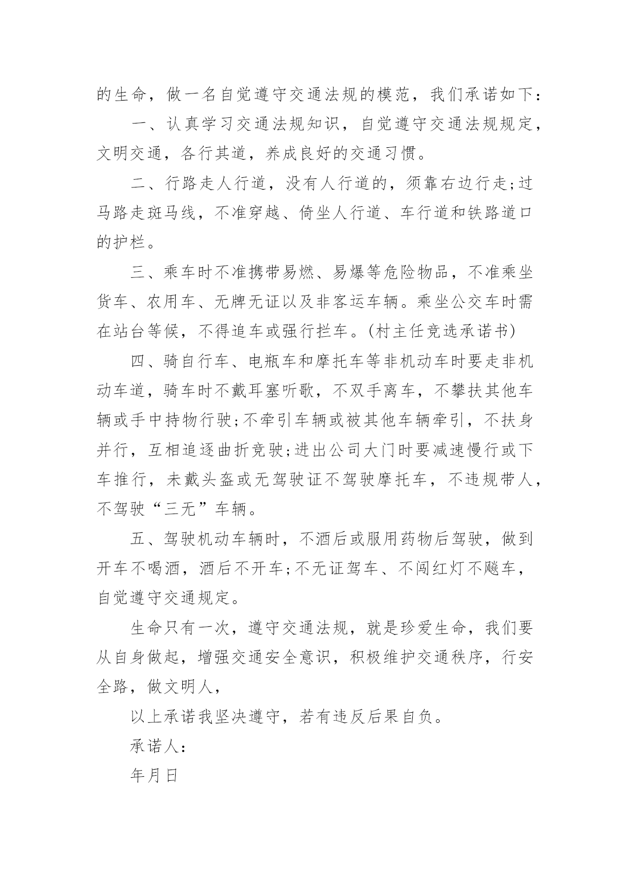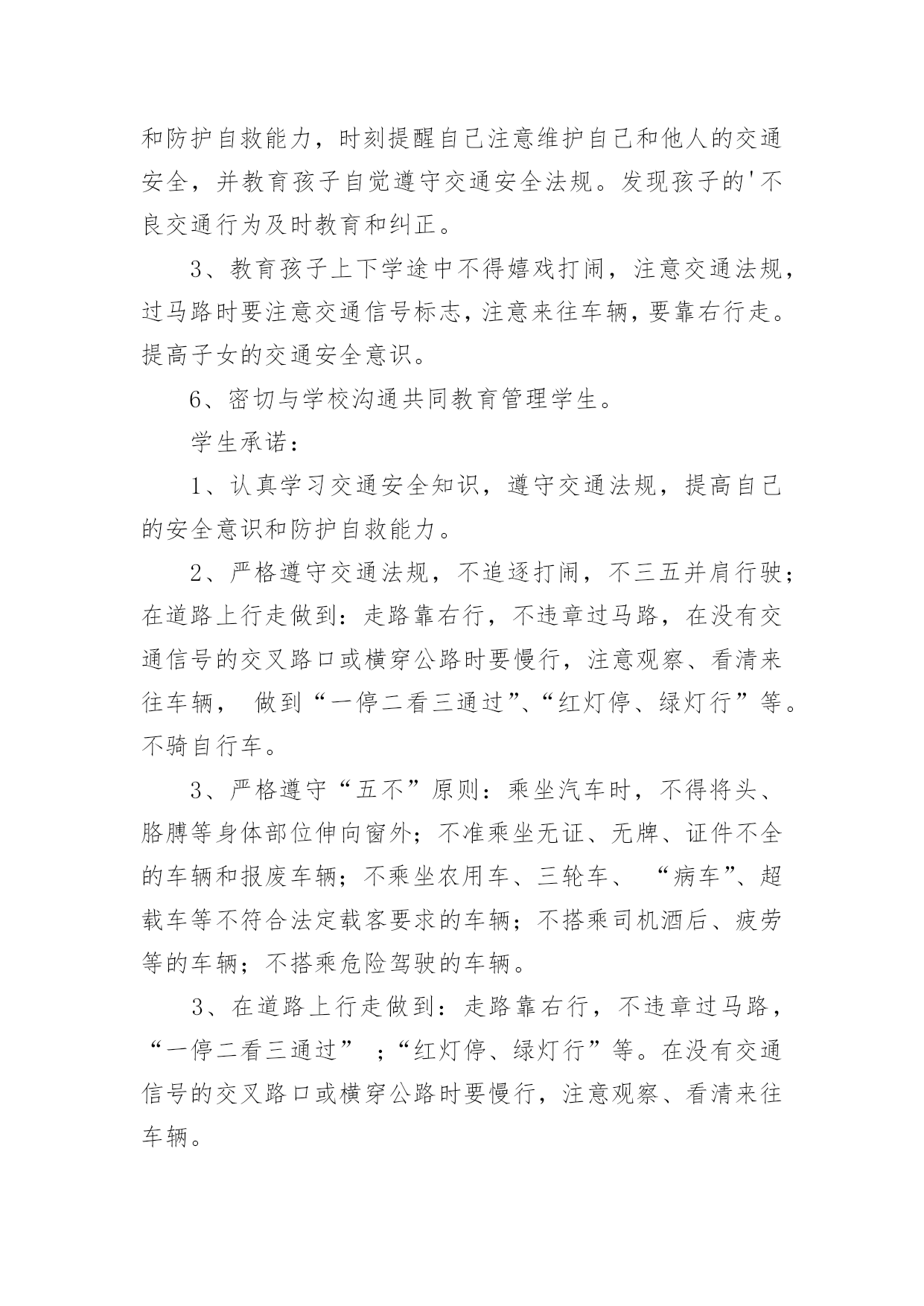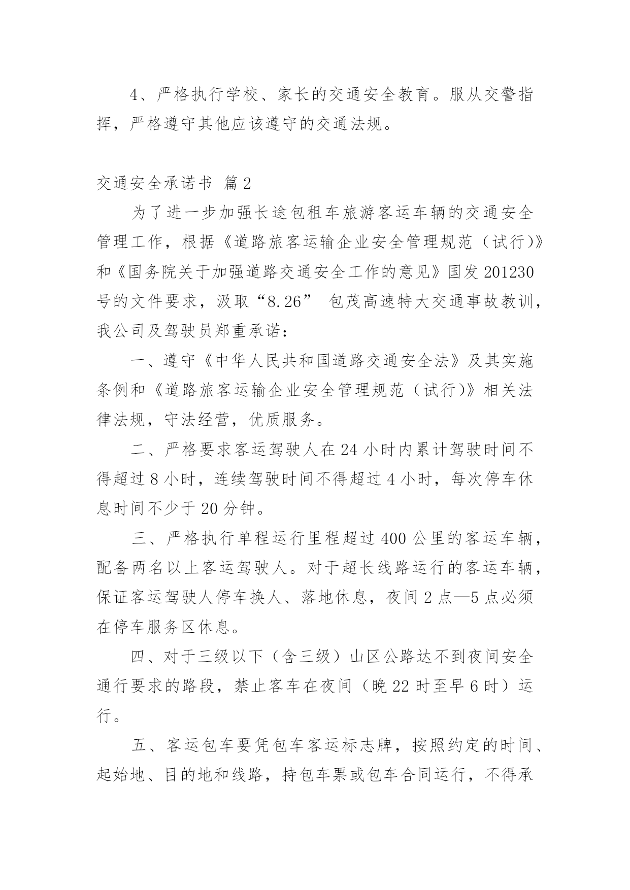 交通安全承诺书有关交通安全承诺书范文汇总七篇在当下社会,越来越多人会去使用承诺书,承诺书是承诺人对要约人的要约完全同意的意思,表示以书面形式。相信写承诺书是一个让许多人都头痛的问题,以下是小编帮大家整理的交通安全承诺书7篇,仅供参考,大家一起来看看吧。交通安全承诺书篇1安全无小事,交通安全从我做起。众多的事故告诉我们,交通事故的发生往往只是行人、车辆一念之间的疏忽、大意。为了进一步增强同学们的交通安全意识和遵守交通法规的自觉性,保障每一位同学的生命安全,保障学生上学、放学路上的交通安全,我校开展自觉遵守交通规则、文明出行的承诺活动。要求每一位学生及家长自觉做到以下承诺:家长承诺:1、家长不使用无证、无牌、报废车辆,农用车、三轮车、手扶车、“病车”、超载车等不符合法定载客要求的车辆接送学生,不酒后驾驶车辆接送学生。2、对孩子履行监护人的义务,保障孩子在校外的交通安全。配合学校加强对孩子的交通安全教育,一定督促好孩子认真学习交通法规和交通安全知识,提高自己的安全意识和防护自救能力,时刻提醒自己注意维护自己和他人的交通安全,并教育孩子自觉遵守交通安全法规。发现孩子的'不良交通行为及时教育和纠正。3、教育孩子上下学途中不得嬉戏打闹,注意交通法规,过马路时要注意交通信号标志,注意来往车辆,要靠右行走。提高子女的交通安全意识。6、密切与学校沟通共同教育管理学生。学生承诺:1、认真学习交通安全知识,遵守交通法规,提高自己的安全意识和防护自救能力。2、严格遵守交通法规,不追逐打闹,不三五并肩行驶;在道路上行走做到:走路靠右行,不违章过马路,在没有交通信号的交叉路口或横穿公路时要慢行,注意观察、看清来往车辆,做到“一停二看三通过”、“红灯停、绿灯行”等。不骑自行车。3、严格遵守“五不”原则:乘坐汽车时,不得将头、胳膊等身体部位伸向窗外;不准乘坐无证、无牌、证件不全的车辆和报废车辆;不乘坐农用车、三轮车、“病车”、超载车等不符合法定载客要求的车辆;不搭乘司机酒后、疲劳等的车辆;不搭乘危险驾驶的车辆。3、在道路上行走做到:走路靠右行,不违章过马路,“一停二看三通过”;“红灯停、绿灯行”等。在没有交通信号的交叉路口或横穿公路时要慢行,注意观察、看清来往车辆。4、严格执行学校、家长的交通安全教育。服从交警指挥,严格遵守其他应该遵守的交通法规。交通安全承诺书篇2为了进一步加强长途包租车旅游客运车辆的交通安全管理工作,根据《道路旅客运输企业安全管理规范(试行)》和《国务院关于加强道路交通安全工作的意见》国发201230号的文件要求,汲取“8.26”包茂高速特大交通事故教训,我公司及驾驶员郑重承诺:一、遵守《中华人民共和国道路交通安全法》及其实施条例和《道路旅客运输企业安全管理规范(试行)》相关法律法规,守法经营,优质服务。二、严格要求客运驾驶人在24小时内累计驾驶时间不得超过8小时,连续驾驶时间不得超过4小时,每次停车休息时间不少于20分钟。三、严格执行单程运行里程超过400公里的客运车辆,配备两名以上客运驾驶人。对于超长线路运行的客运车辆,保证客运驾驶人停车换人、落地休息,夜间2点—5点必须在停车服务区休息。四、对于三级以下(含三级)山区公路达不到夜间安全通行要求的路段,禁止客车在夜间(晚22时至早6时)运行。五、客运包车要凭包车客运标志牌,按照约定的时间、起始地、目的地和线路,持包车票或包车合同运行,不得承运包车合同约定之外的旅客。驾乘人员要对旅客携带物品进行安全检查,禁止三品上车。六、不发生超员、超速、疲劳驾驶、酒后驾驶、客货混装、在高速公路违法停车上下乘客、安全设施不全等严重交通违法行为。七、确保车辆符合安全技术条件,逾期未年审、年检或年审、年检不合格的车辆禁止上路行驶。八、严格执行派车单制度,认真填写车辆、客运驾驶人、线路基本信息,单位负责人签字。九、加强GPS动态监管,专人负责,24小时监控,实时监控车辆行驶动态,记录分析处理动态信息,及时提醒、提示违规行为。十、确保卫星定位装置正常使用,保持车辆运行时在线。对故意遮挡车载卫星定位装置信号、破坏车载卫星定位装置的驾驶人员,严肃处理。十一、驾驶员保持24小时开机,随时反馈车辆运行信息。不按时和公司及管理部门主动联系的,下次不予办理长途包租车旅游业务。十二、确保车内安全带、安全锤、灭火器、故障车警告标志的配备是否齐全有效,确保安全出口通道畅通,应急门、应急顶窗开启装置有效,开启顺畅。十三、企业必须做好长途包租车旅游业务把关初审工作。有以下情形的,不予办理长途包租车\旅游业务,发放牌证。1、双班驾驶员不得聘用不明底细,无驾驶客运车辆经验、驾驶技术不过硬和驾驶客车达不到三年以上的驾驶人驾驶长途包租车、旅游车辆;2、驾驶员违法记分达到3-12分未处理的(交警大队违法查询单为准);3、客运车辆要求:中型