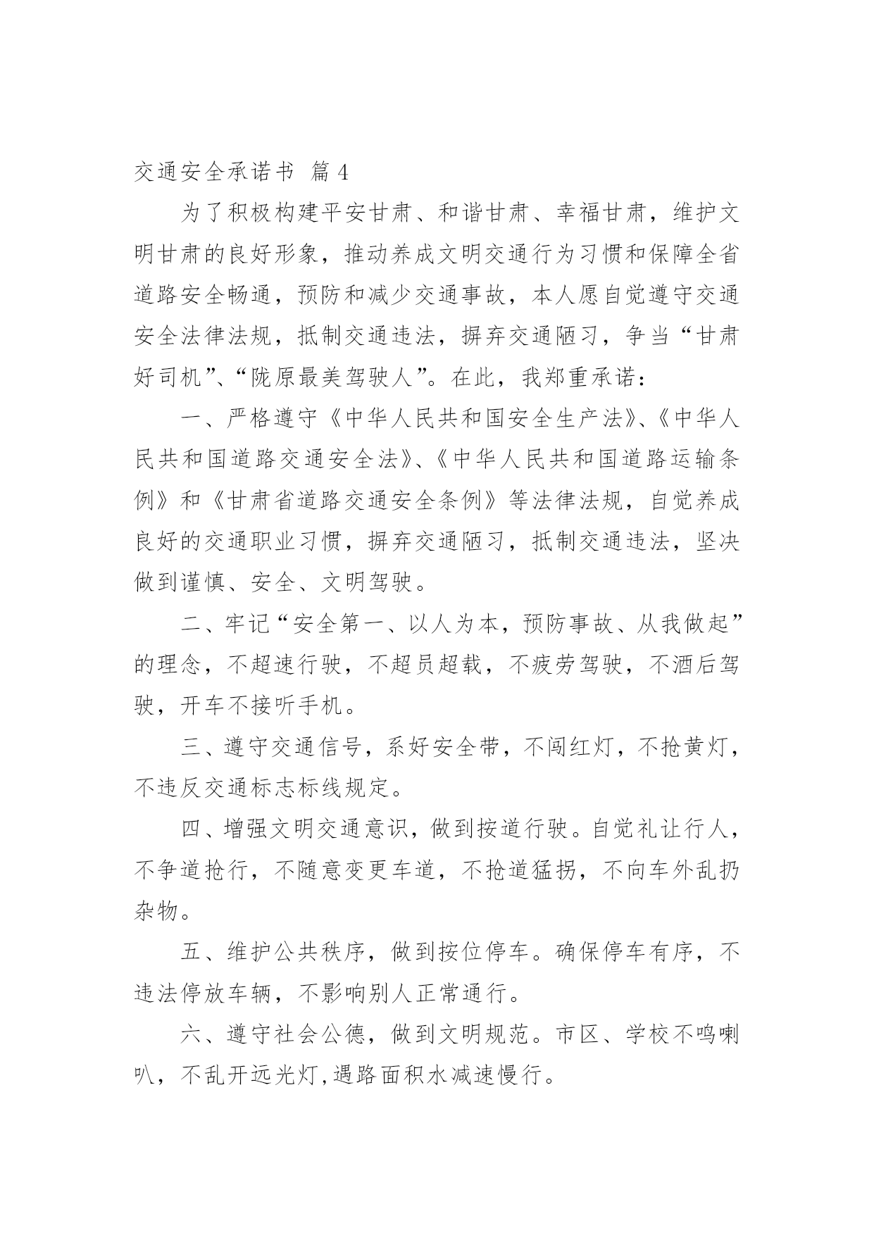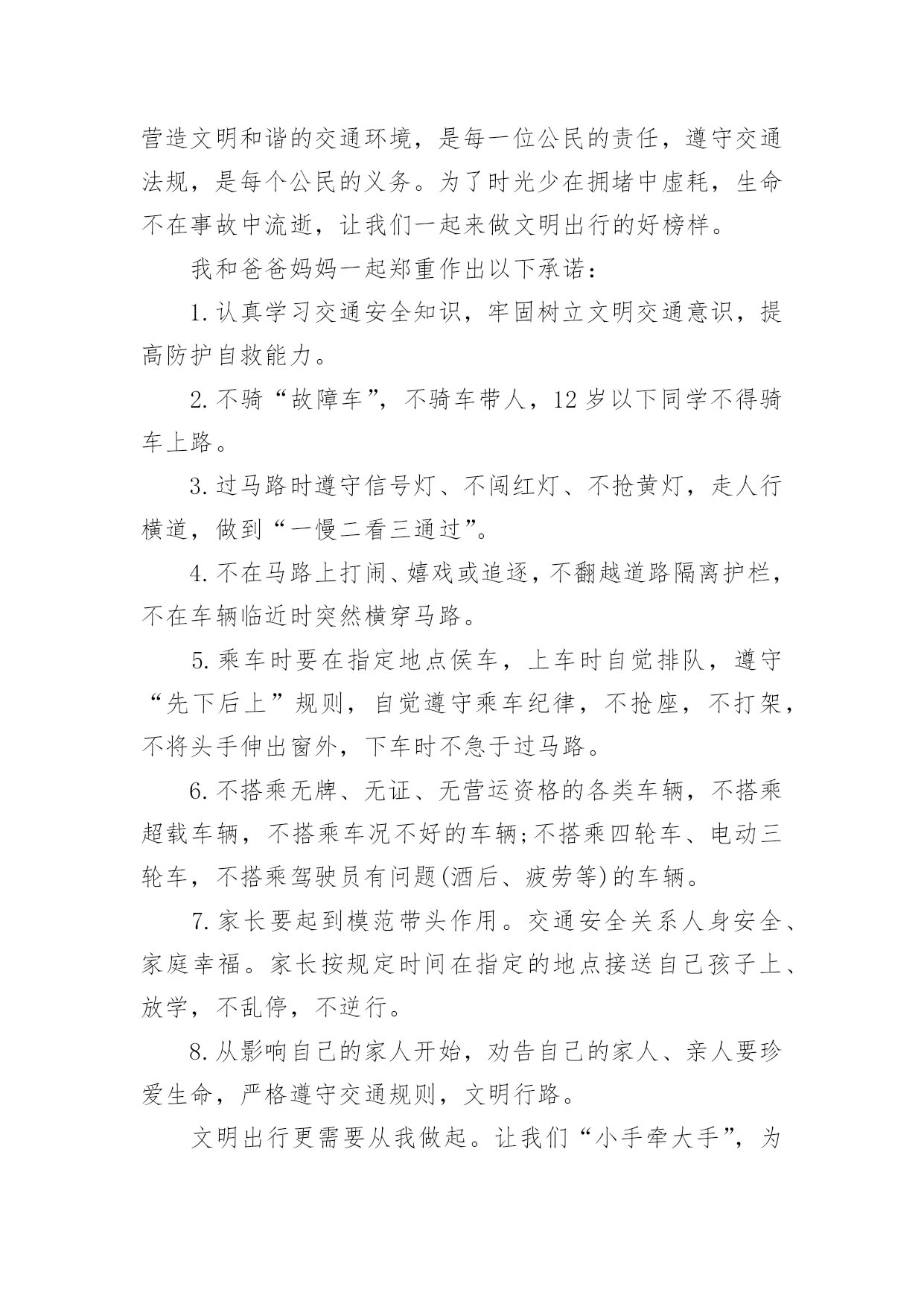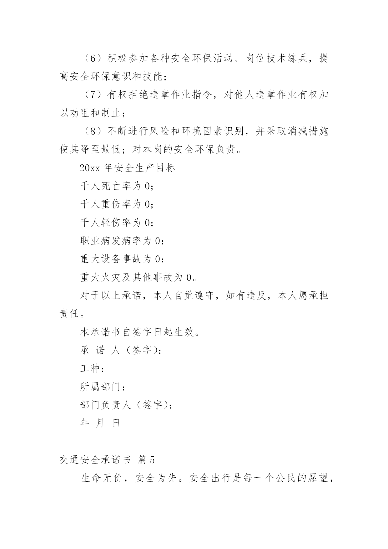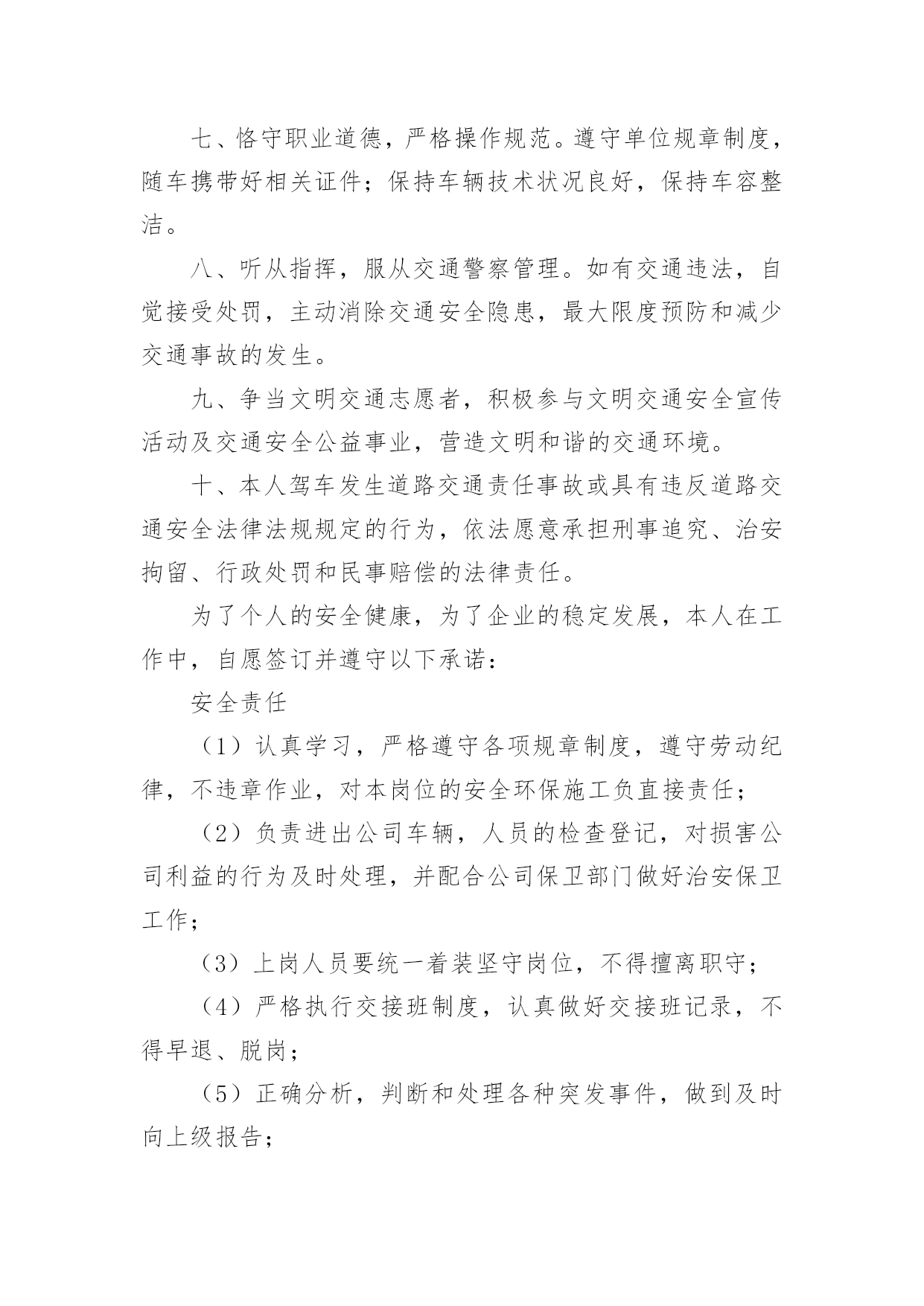 交通安全承诺书有关交通安全承诺书范文汇总七篇在当下社会,越来越多人会去使用承诺书,承诺书是承诺人对要约人的要约完全同意的意思,表示以书面形式。相信写承诺书是一个让许多人都头痛的问题,以下是小编帮大家整理的交通安全承诺书7篇,仅供参考,大家一起来看看吧。交通安全承诺书篇1安全无小事,交通安全从我做起。众多的事故告诉我们,交通事故的发生往往只是行人、车辆一念之间的疏忽、大意。为了进一步增强同学们的交通安全意识和遵守交通法规的自觉性,保障每一位同学的生命安全,保障学生上学、放学路上的交通安全,我校开展自觉遵守交通规则、文明出行的承诺活动。要求每一位学生及家长自觉做到以下承诺:家长承诺:1、家长不使用无证、无牌、报废车辆,农用车、三轮车、手扶车、“病车”、超载车等不符合法定载客要求的车辆接送学生,不酒后驾驶车辆接送学生。2、对孩子履行监护人的义务,保障孩子在校外的交通安全。配合学校加强对孩子的交通安全教育,一定督促好孩子认真学习交通法规和交通安全知识,提高自己的安全意识和防护自救能力,时刻提醒自己注意维护自己和他人的交通安全,并教育孩子自觉遵守交通安全法规。发现孩子的'不良交通行为及时教育和纠正。3、教育孩子上下学途中不得嬉戏打闹,注意交通法规,过马路时要注意交通信号标志,注意来往车辆,要靠右行走。提高子女的交通安全意识。6、密切与学校沟通共同教育管理学生。学生承诺:1、认真学习交通安全知识,遵守交通法规,提高自己的安全意识和防护自救能力。2、严格遵守交通法规,不追逐打闹,不三五并肩行驶;在道路上行走做到:走路靠右行,不违章过马路,在没有交通信号的交叉路口或横穿公路时要慢行,注意观察、看清来往车辆,做到“一停二看三通过”、“红灯停、绿灯行”等。不骑自行车。3、严格遵守“五不”原则:乘坐汽车时,不得将头、胳膊等身体部位伸向窗外;不准乘坐无证、无牌、证件不全的车辆和报废车辆;不乘坐农用车、三轮车、“病车”、超载车等不符合法定载客要求的车辆;不搭乘司机酒后、疲劳等的车辆;不搭乘危险驾驶的车辆。3、在道路上行走做到:走路靠右行,不违章过马路,“一停二看三通过”;“红灯停、绿灯行”等。在没有交通信号的交叉路口或横穿公路时要慢行,注意观察、看清来往车辆。4、严格执行学校、家长的交通安全教育。服从交警指挥,严格遵守其他应该遵守的交通法规。交通安全承诺书篇2为了进一步加强长途包租车旅游客运车辆的交通安全管理工作,根据《道路旅客运输企业安全管理规范(试行)》和《国务院关于加强道路交通安全工作的意见》国发201230号的文件要求,汲取“8.26”包茂高速特大交通事故教训,我公司及驾驶员郑重承诺:一、遵守《中华人民共和国道路交通安全法》及其实施条例和《道路旅客运输企业安全管理规范(试行)》相关法律法规,守法经营,优质服务。二、严格要求客运驾驶人在24小时内累计驾驶时间不得超过8小时,连续驾驶时间不得超过4小时,每次停车休息时间不少于20分钟。三、严格执行单程运行里程超过400公里的客运车辆,配备两名以上客运驾驶人。对于超长线路运行的客运车辆,保证客运驾驶人停车换人、落地休息,夜间2点—5点必须在停车服务区休息。四、对于三级以下(含三级)山区公路达不到夜间安全通行要求的路段,禁止客车在夜间(晚22时至早6时)运行。五、客运包车要凭包车客运标志牌,按照约定的时间、起始地、目的地和线路,持包车票或包车合同运行,不得承运包车合同约定之外的旅客。驾乘人员要对旅客携带物品进行安全检查,禁止三品上车。六、不发生超员、超速、疲劳驾驶、酒后驾驶、客货混装、在高速公路违法停车上下乘客、安全设施不全等严重交通违法行为。七、确保车辆符合安全技术条件,逾期未年审、年检或年审、年检不合格的车辆禁止上路行驶。八、严格执行派车单制度,认真填写车辆、客运驾驶人、线路基本信息,单位负责人签字。九、加强GPS动态监管,专人负责,24小时监控,实时监控车辆行驶动态,记录分析处理动态信息,及时提醒、提示违规行为。十、确保卫星定位装置正常使用,保持车辆运行时在线。对故意遮挡车载卫星定位装置信号、破坏车载卫星定位装置的驾驶人员,严肃处理。十一、驾驶员保持24小时开机,随时反馈车辆运行信息。不按时和公司及管理部门主动联系的,下次不予办理长途包租车旅游业务。十二、确保车内安全带、安全锤、灭火器、故障车警告标志的配备是否齐全有效,确保安全出口通道畅通,应急门、应急顶窗开启装置有效,开启顺畅。十三、企业必须做好长途包租车旅游业务把关初审工作。有以下情形的,不予办理长途包租车\旅游业务,发放牌证。1、双班驾驶员不得聘用不明底细,无驾驶客运车辆经验、驾驶技术不过硬和驾驶客车达不到三年以上的驾驶人驾驶长途包租车、旅游车辆;2、驾驶员违法记分达到3-12分未处理的(交警大队违法查询单为准);3、客运车辆要求:中型