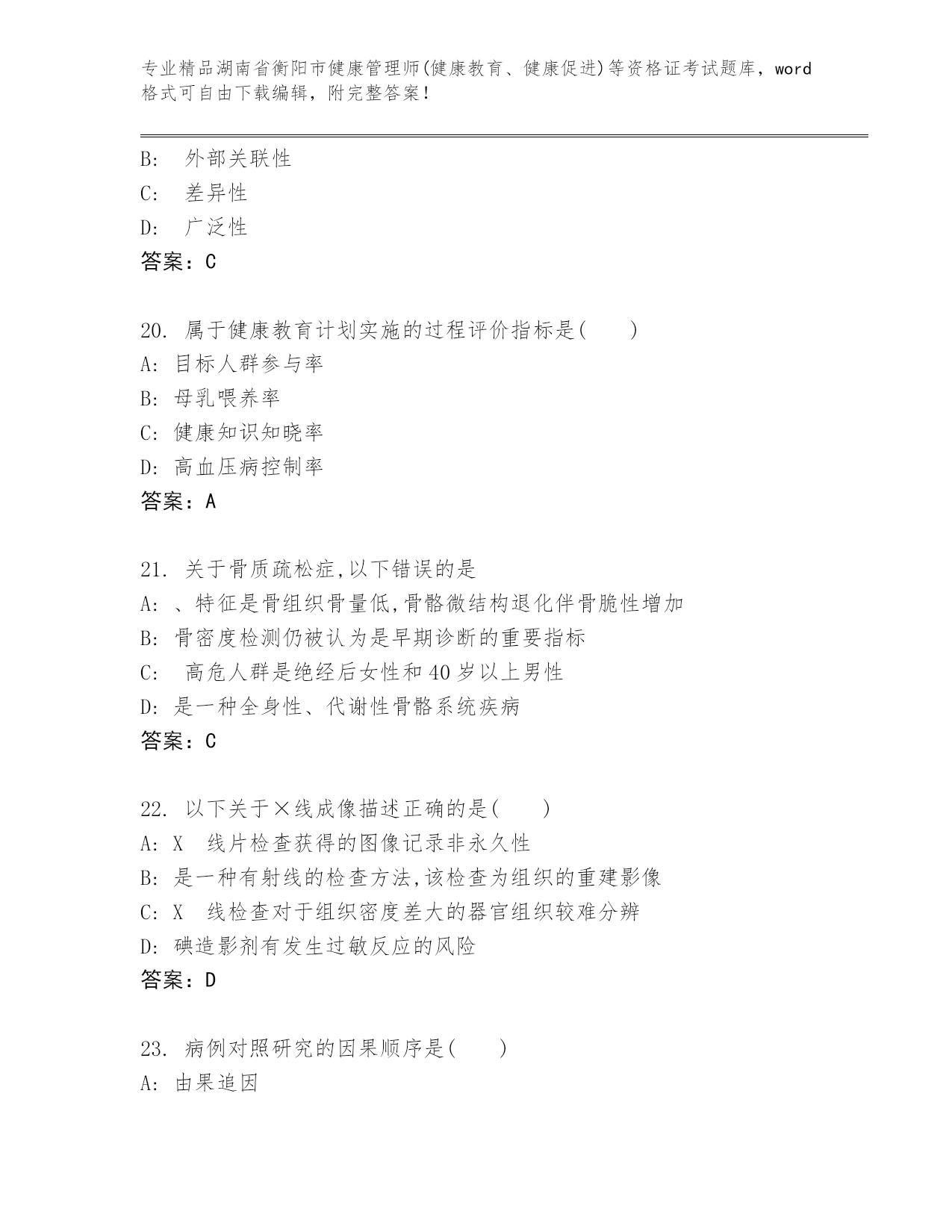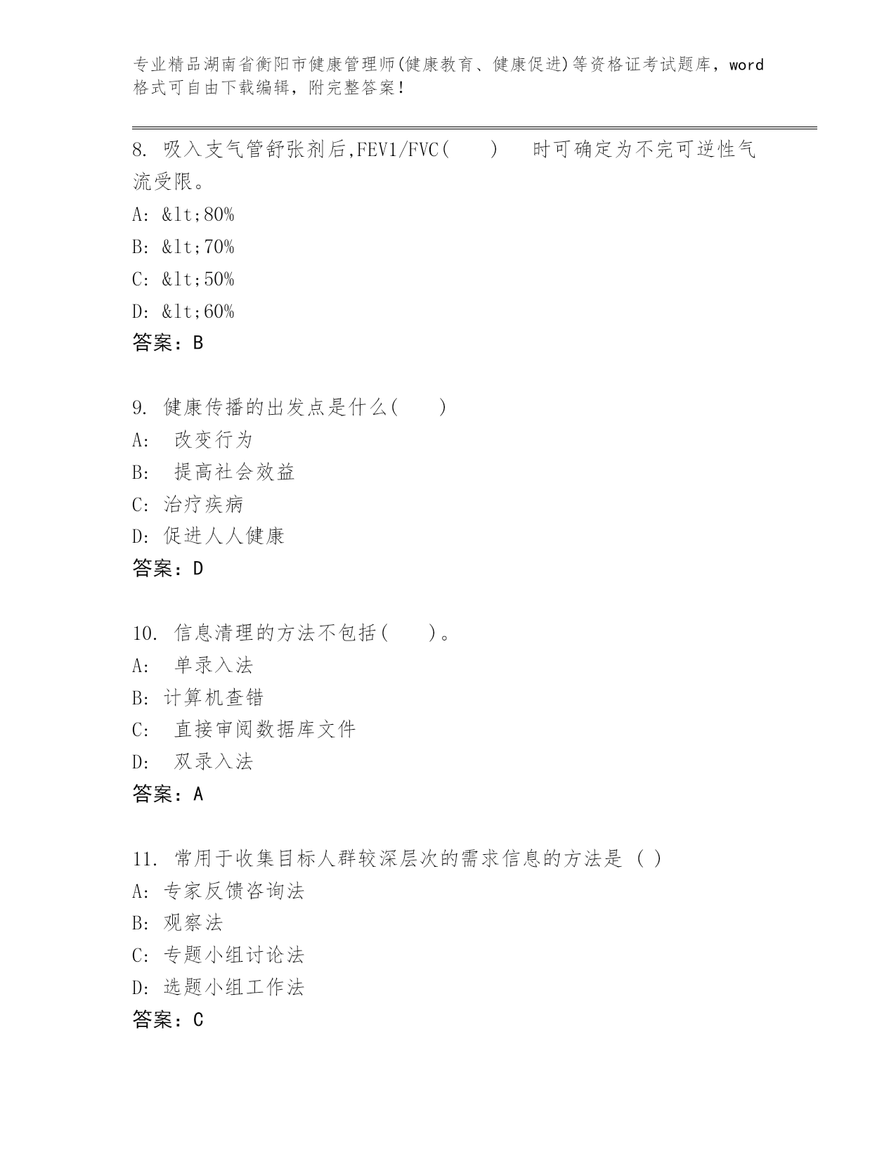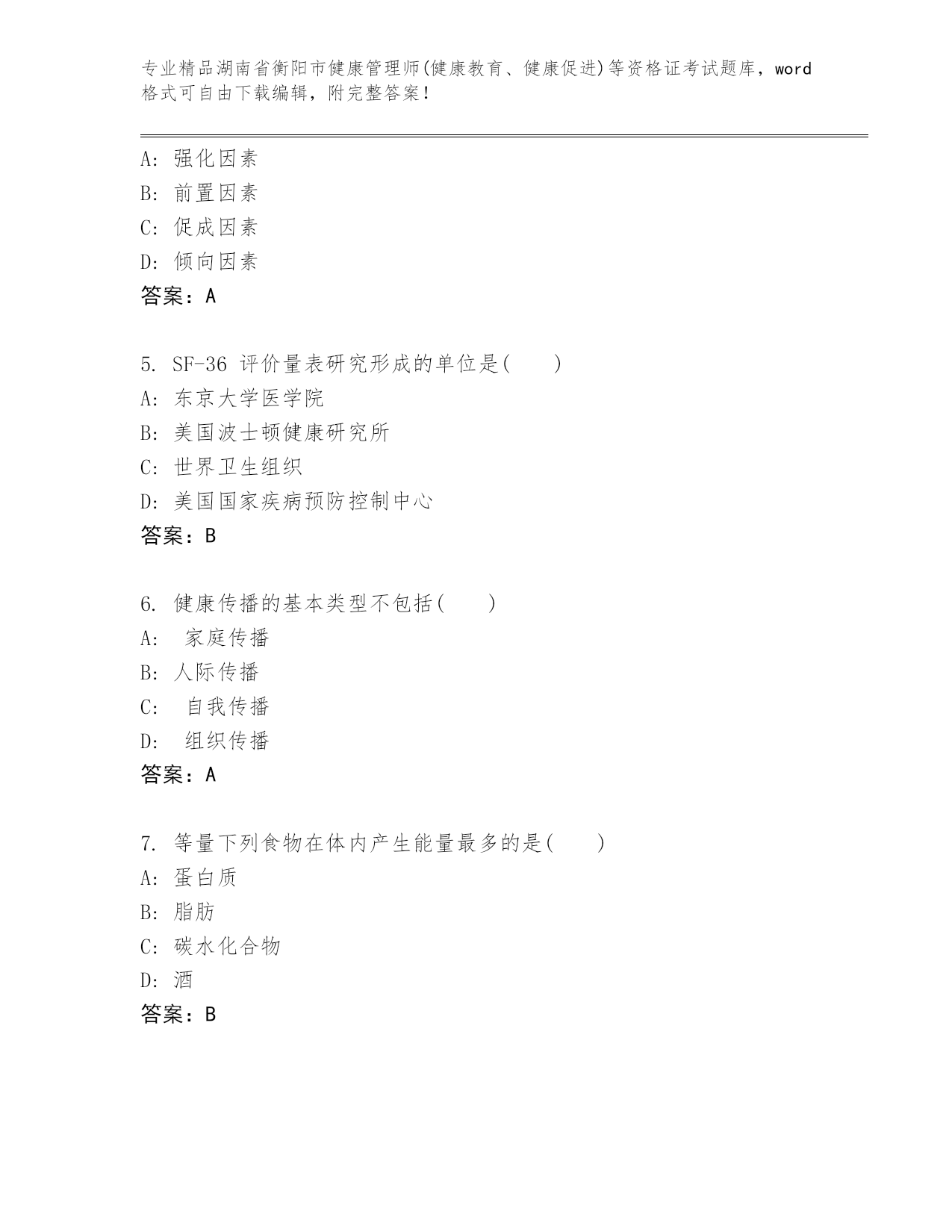 历年湖南省衡阳市健康管理师(健康教育、健康促进)等资格证考试大全含答案