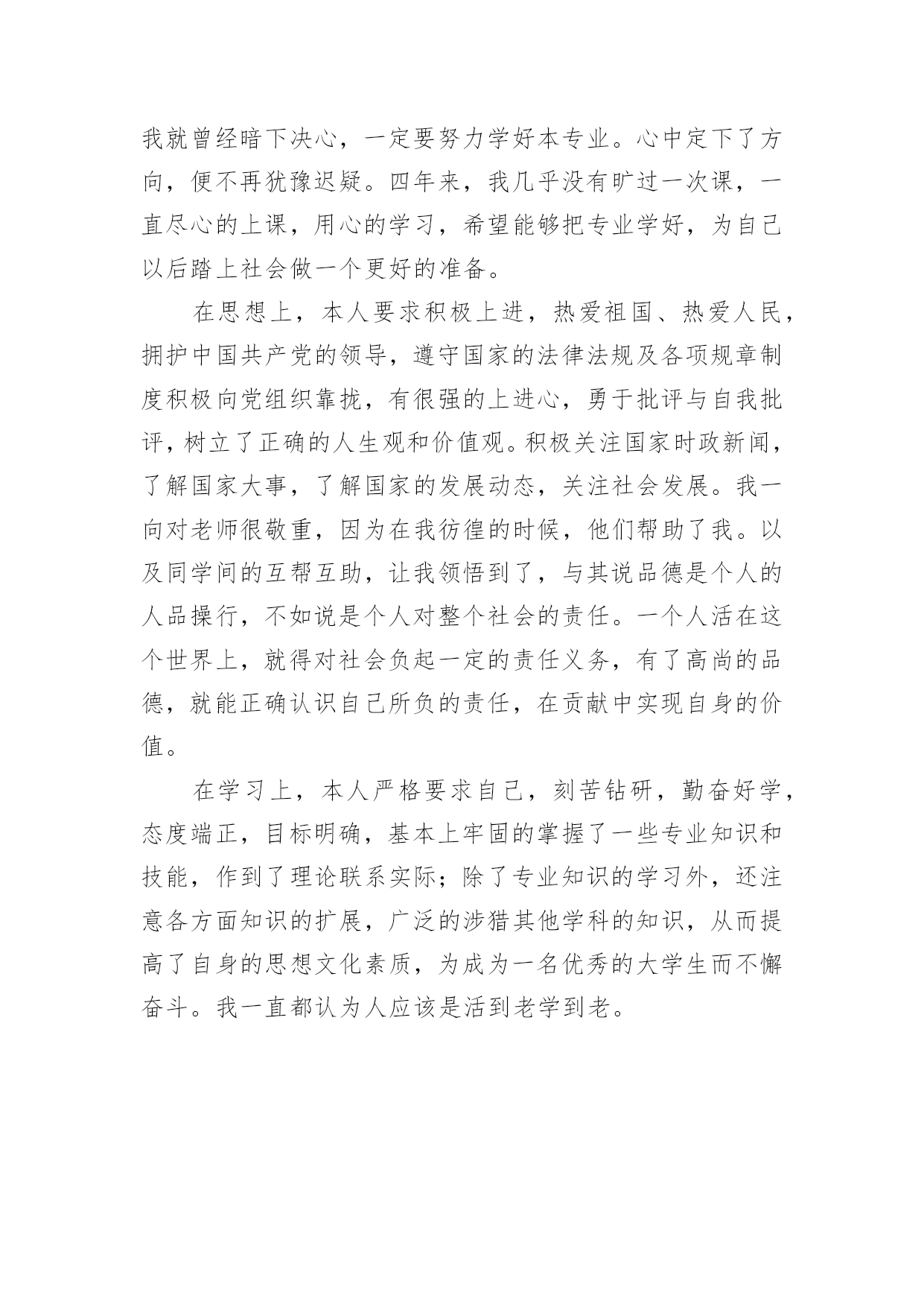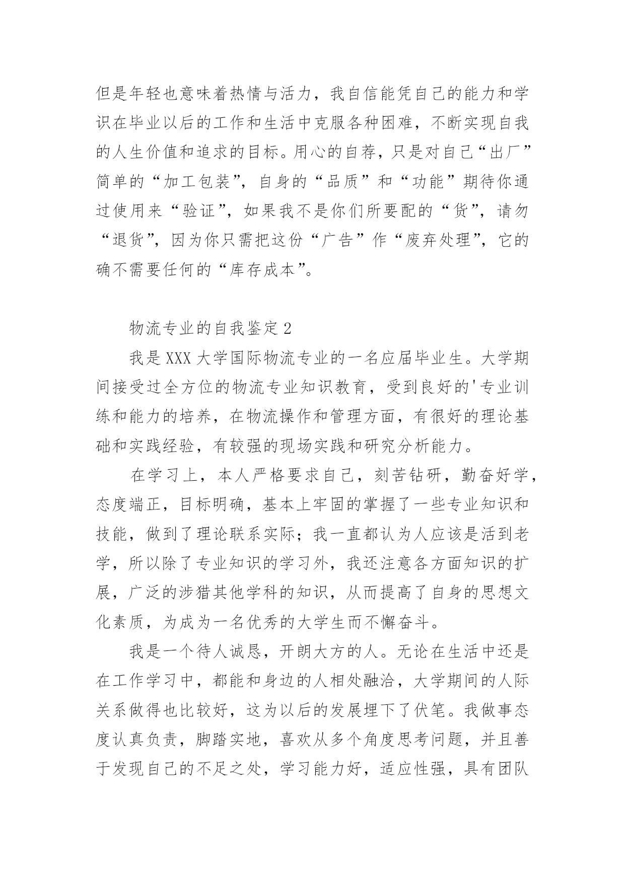 物流专业的自我鉴定自我鉴定就是把一个时期的个人情况进行一次全面系统的总结,自我鉴定可以让我们对自己有个正确的认知,不如立即行动起来写一份自我鉴定吧。那么自我鉴定要注意有什么内容呢?下面是小编整理的物流专业的自我鉴定,希望能够帮助到大家。物流专业的自我鉴定1我是xx学院物流管理专业应届毕业生,我乐观开朗、积极向上、交际和语言表达能力较强。三年的大学期间,我在不断的学习和实践中提高了自己的综合素质,已把自己塑造成为一个专业功底扎实、知识结构完善、适应能力强、富于协作精神的时代青年。在校期间于20xx年通过专业培训和国家正规机关考核后获得中国劳动和社会保障部颁发的助理物流师职业资格从业证书和物流职业经理资格证。毕业之际,我迫切希望能找到一份适合自己的工作。把在校学到的理论知识和自己潜隐的创造力赋之于实践,最重要的是在实践中不断地学习,锻炼和壮大自己,从而实现自己的人生价值。今天自信的我、努力的我诚挚希望贵公司能给我提供一个创造梦想的舞台,我将坚持不懈地努力回报公司的垂爱。作为一名20xx年物流管理专业的大学毕业生,我所拥有的是年轻与活力、知识与闯劲。年轻或许意味着缺乏经验,但是年轻也意味着热情与活力,我自信能凭自己的能力和学识在毕业以后的工作和生活中克服各种困难,不断实现自我的人生价值和追求的目标。用心的自荐,只是对自己“出厂”简单的“加工包装”,自身的“品质”和“功能”期待你通过使用来“验证”,如果我不是你们所要配的“货”,请勿“退货”,因为你只需把这份“广告”作“废弃处理”,它的确不需要任何的“库存成本”。物流专业的自我鉴定2我是XXX大学国际物流专业的一名应届毕业生。大学期间接受过全方位的物流专业知识教育,受到良好的'专业训练和能力的培养,在物流操作和管理方面,有很好的理论基础和实践经验,有较强的现场实践和研究分析能力。在学习上,本人严格要求自己,刻苦钻研,勤奋好学,态度端正,目标明确,基本上牢固的掌握了一些专业知识和技能,做到了理论联系实际;我一直都认为人应该是活到老学,所以除了专业知识的学习外,我还注意各方面知识的扩展,广泛的涉猎其他学科的知识,从而提高了自身的思想文化素质,为成为一名优秀的大学生而不懈奋斗。我是一个待人诚恳,开朗大方的人。无论在生活中还是在工作学习中,都能和身边的人相处融洽,大学期间的人际关系做得也比较好,这为以后的发展埋下了伏笔。我做事态度认真负责,脚踏实地,喜欢从多个角度思考问题,并且善于发现自己的不足之处,学习能力好,适应性强,具有团队精神和一定的应变能力和分析判断能力。实践是检验人才的最好标准,我始终相信“一份耕耘,一份收获”。勤奋踏实,积极进取是我最大的优点,民主的家庭培养了我乐观,自信的性格;十几年辗转求学的经历造就了我良好的环境适应能力;四年的学生工作及不断的校外实践提高了我组织协调,沟通和开拓的能力。我极富敬业精神,积极开朗,乐观向上,有很强的沟通能力和团队协作能力。希望能从事物流管理有关的工作,或者销售类的工作。如果能从事物流管理有关的工作,我可以充分的发挥自己所学的知识,将所学的知识与具体的实际的工作结合。将工作做的更好;我相信我的能力可以让企业发展的更好。物流专业的自我鉴定3经过四年的大学学习,现在学业已经接近尾声,为了更好地启程下一步的路,我对自己的四年大学生活做了一个个人鉴定。四年的大学生活是我人生的关键点。为了更好地适应社会的需要,在大学的四年时光里,我在掌握好学校课程的前提下,还充分利用课余时间,阅读了很多的课外读物,拓宽了自己的知识面。在校期间,我一直致力于将自己培养成一个复合型人才,不断地挑战自我,充实自己,为实现人生的价值打下坚实的基础。物流管理,是自己选择的专业。自从大一入学之日起,我就曾经暗下决心,一定要努力学好本专业。心中定下了方向,便不再犹豫迟疑。四年来,我几乎没有旷过一次课,一直尽心的上课,用心的学习,希望能够把专业学好,为自己以后踏上社会做一个更好的准备。在思想上,本人要求积极上进,热爱祖国、热爱人民,拥护中国共产党的领导,遵守国家的法律法规及各项规章制度积极向党组织靠拢,有很强的上进心,勇于批评与自我批评,树立了正确的人生观和价值观。积极关注国家时政新闻,了解国家大事,了解国家的发展动态,关注社会发展。我一向对老师很敬重,因为在我彷徨的时候,他们帮助了我。以及同学间的互帮互助,让我领悟到了,与其说品德是个人的人品操行,不如说是个人对整个社会的责任。一个人活在这个世界上,就得对社会负起一定的责任义务,有了高尚的品德,就能正确认识自己所负的责任,在贡献中实现自身的价值。在学习上,本人严格要求自己,刻苦钻研,勤奋好学,态度端正,目标明确,基本上牢固的掌握了一些专业知识和技能,作到了理论联系实际;除了专业知识的学习外,还注意各方面知识的扩展,广泛的涉猎其他学科
