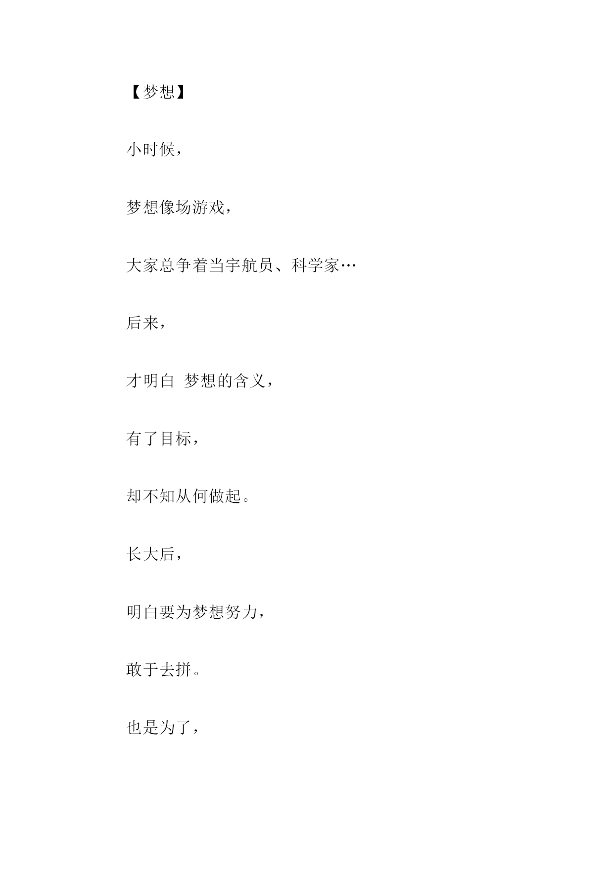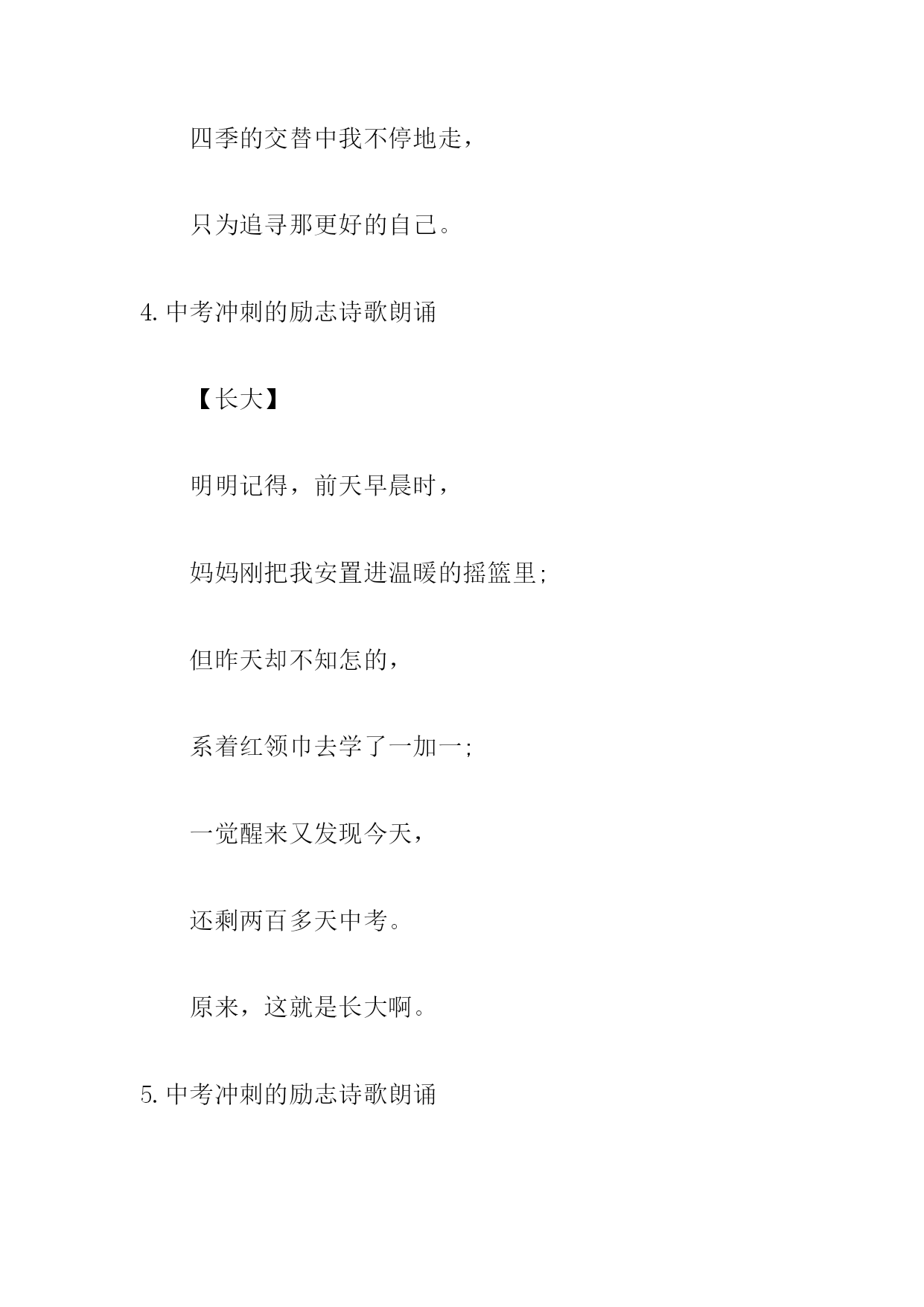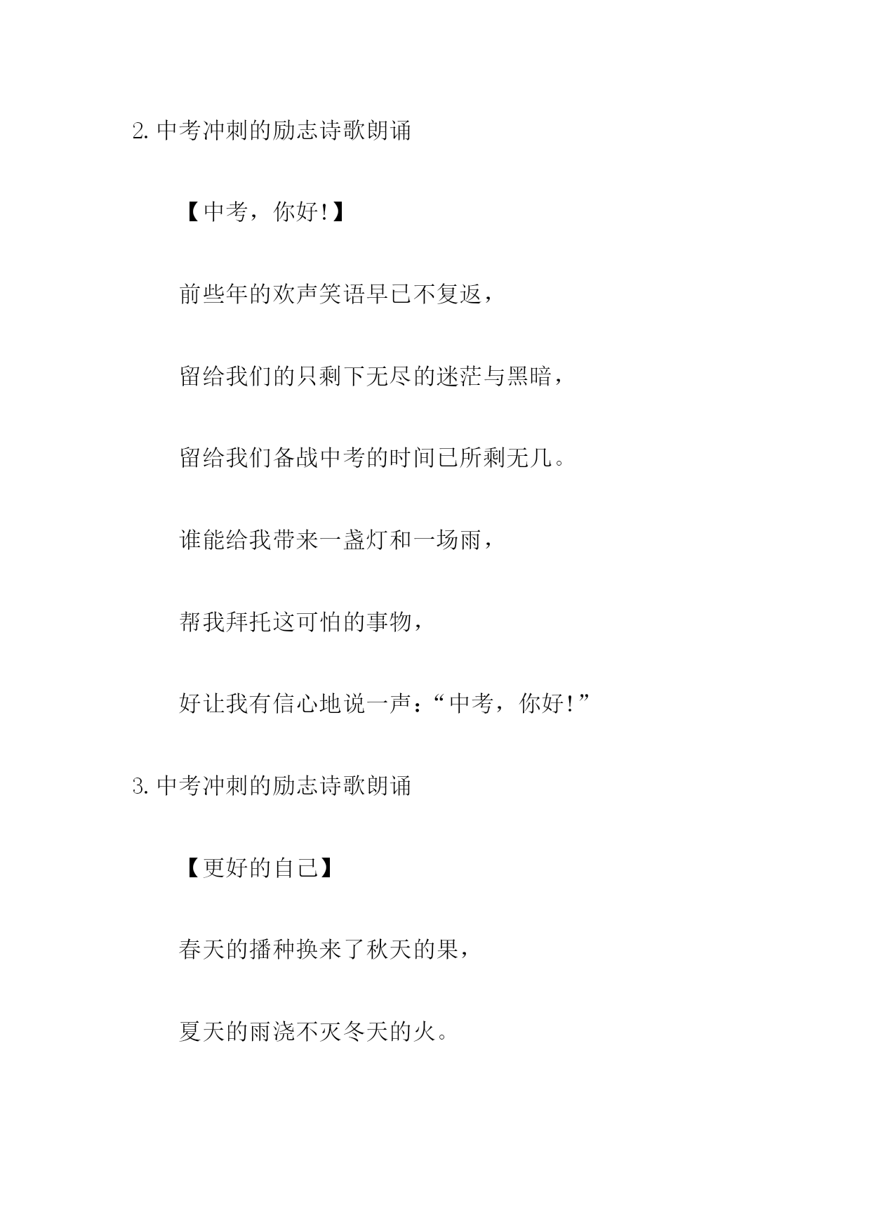 中考冲刺的励志诗歌朗诵1.中考冲刺的励志诗歌朗诵【且行且歌】即将来临的中考却是恋恋不舍想到以后看不见那些酒窝心生莫名的失落考试名次越滑越多梦想越加遥远且无法触摸通向未来的路途如此坎坷晦暗的日子谁还能在身边陪我那些形影不离的朋友多年以后又会如何某个阳光明媚的午后会不会想起那首名为青春的歌越长大越觉得寂寞蓦然怀念那份往昔的澄澈或许这就是生活而我们仍有尖锐的执着青春是一条明媚但悲伤的小河因为有朋友才不至如此脆弱纵然以后彼此天涯相隔也一定要记得我们曾并肩走过2.中考冲刺的励志诗歌朗诵【中考,你好!】前些年的欢声笑语早已不复返,留给我们的只剩下无尽的迷茫与黑暗,留给我们备战中考的时间已所剩无几。谁能给我带来一盏灯和一场雨,帮我拜托这可怕的事物,好让我有信心地说一声:“中考,你好!”3.中考冲刺的励志诗歌朗诵【更好的自己】春天的播种换来了秋天的果,夏天的雨浇不灭冬天的火。四季的交替中我不停地走,只为追寻那更好的自己。4.中考冲刺的励志诗歌朗诵【长大】明明记得,前天早晨时,妈妈刚把我安置进温暖的摇篮里;但昨天却不知怎的,系着红领巾去学了一加一;一觉醒来又发现今天,还剩两百多天中考。原来,这就是长大啊。5.中考冲刺的励志诗歌朗诵【梦想】小时候,梦想像场游戏,大家总争着当宇航员、科学家…后来,才明白梦想的含义,有了目标,却不知从何做起。长大后,明白要为梦想努力,敢于去拼。也是为了,不负光阴。6.中考冲刺的励志诗歌朗诵【努力】小时候努力是一条长长的跑道我在这头终点在哪头长大后努力是一座高高的书山我在下头知识在上头后来啊努力是一次远远的旅行我在后头梦想在前头而现在努力是一张薄薄的证书我在这头成功在那头7.中考冲刺的励志诗歌朗诵冲刺中考,时不我待。智者不惑,勇者不惧。不畏艰难,披荆斩棘!图其至远,犯其至难。问鼎六月,勤奋为基。背水一战,我自英才。九年六班,所向披靡!备战三年,亮剑在际。搏击风浪,紧咬牙关。怀揣梦想,青春无悔!8.中考冲刺的励志诗歌朗诵十年磨一剑,只为中考战。志同心相连,我辈必冲天。我:不做怯懦的退缩,不做无益的彷徨,不负父母的企盼,不负恩师的厚望,不负青春的理想,我将唤醒所有的潜能,我将凝聚全部的力量,将拼搏进行到底!将初三进行到底!将中考进行到底!坚持到底,永不放弃!坚持到底,永不放弃!中考冲刺的励志诗歌朗诵
