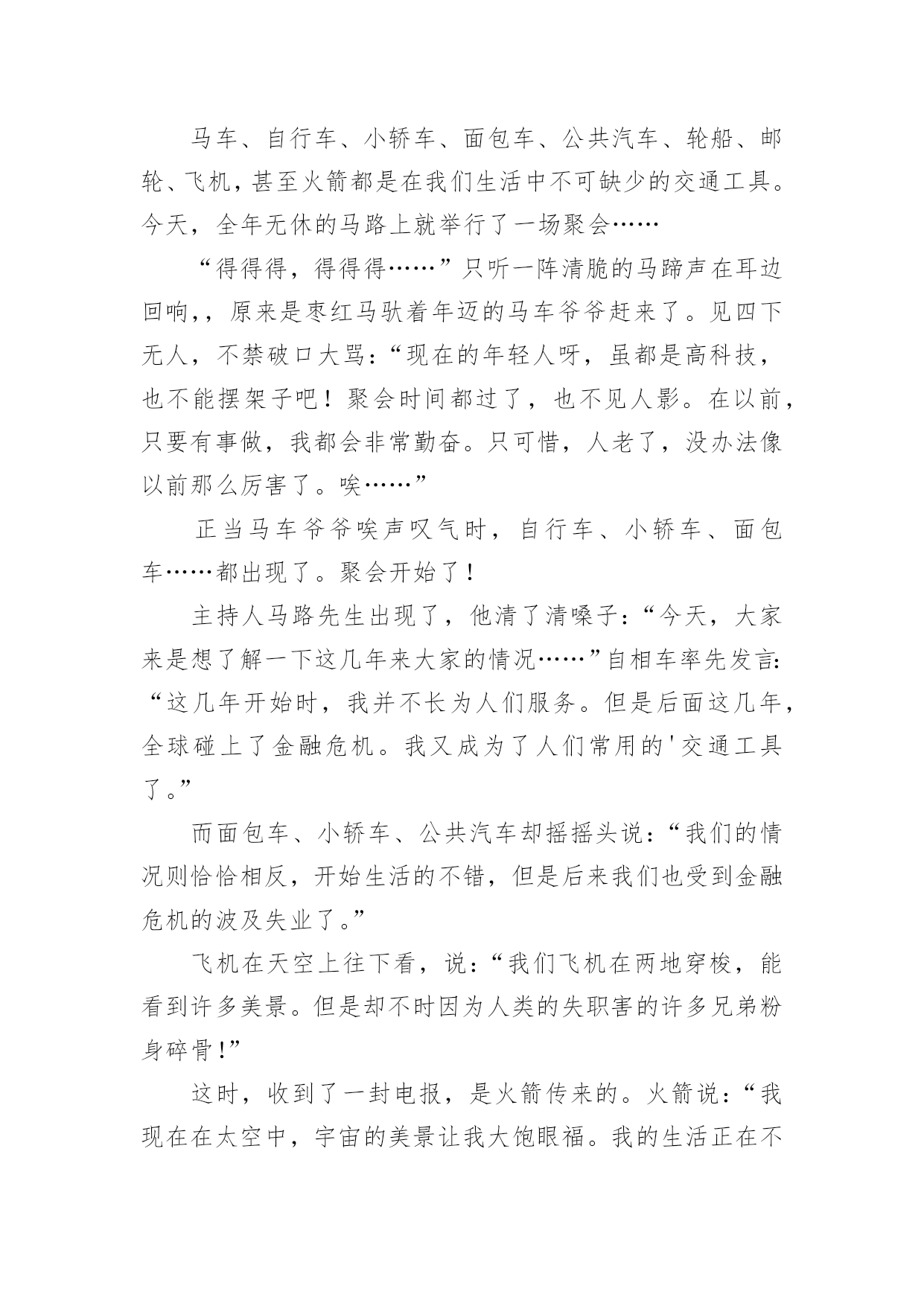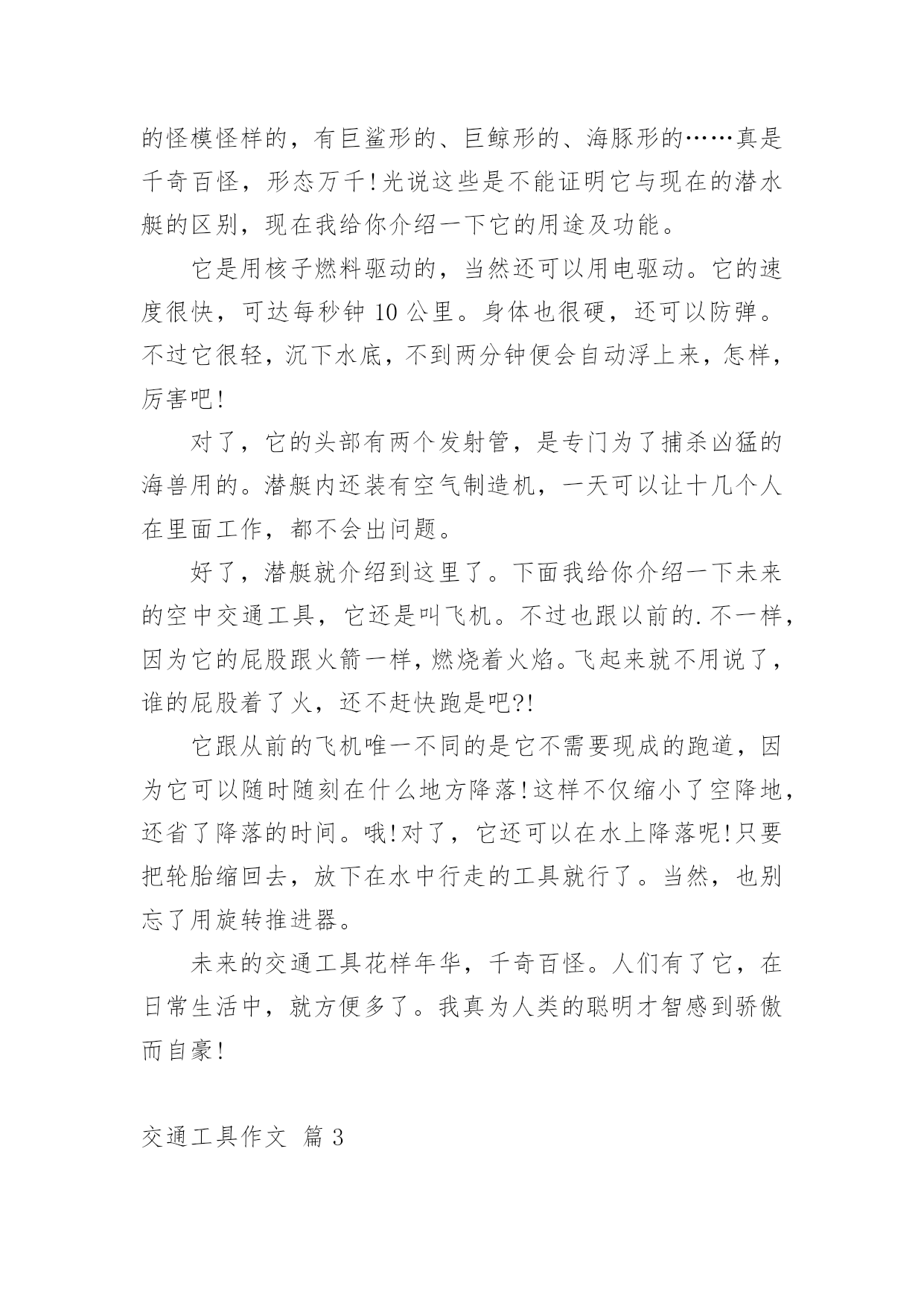 交通工具作文【经典】交通工具作文在平日的学习、工作和生活里,大家都写过作文,肯定对各类作文都很熟悉吧,作文一定要做到主题集中,围绕同一主题作深入阐述,切忌东拉西扯,主题涣散甚至无主题。你知道作文怎样写才规范吗?以下是小编为大家整理的交通工具作文3篇,欢迎阅读,希望大家能够喜欢。交通工具作文篇1昨天老师布置给我的.拼图作业我没有完成,所以今天我抽时间完成了这个作业。我的拼图作业的名字叫“我未来的交通工具”,我剪了各种形状,有圆形、三角形、半圆形、梯形,用它们拼出了汽车、飞机、小鸟、白云、小草,我觉得我拼出来的图形很好看,我很喜欢,希望老师和同学也同样喜欢它。交通工具作文篇2由于陆地面积很小,所以未来的交通工具大部分都是海、空等交通工具。现在就让我给你介绍一下海、空交通工具吧!首先我给你介绍的交通工具是水上行走的一种,它就是“潜水艇”。一听,也许有人会说:“去,这也算是未来的交通工具!?现在都有啦!哈哈,让我告诉你吧,这潜水艇可不一般,它长的怪模怪样的,有巨鲨形的、巨鲸形的、海豚形的……真是千奇百怪,形态万千!光说这些是不能证明它与现在的潜水艇的区别,现在我给你介绍一下它的用途及功能。它是用核子燃料驱动的,当然还可以用电驱动。它的速度很快,可达每秒钟10公里。身体也很硬,还可以防弹。不过它很轻,沉下水底,不到两分钟便会自动浮上来,怎样,厉害吧!对了,它的头部有两个发射管,是专门为了捕杀凶猛的海兽用的。潜艇内还装有空气制造机,一天可以让十几个人在里面工作,都不会出问题。好了,潜艇就介绍到这里了。下面我给你介绍一下未来的空中交通工具,它还是叫飞机。不过也跟以前的.不一样,因为它的屁股跟火箭一样,燃烧着火焰。飞起来就不用说了,谁的屁股着了火,还不赶快跑是吧?!它跟从前的飞机唯一不同的是它不需要现成的跑道,因为它可以随时随刻在什么地方降落!这样不仅缩小了空降地,还省了降落的时间。哦!对了,它还可以在水上降落呢!只要把轮胎缩回去,放下在水中行走的工具就行了。当然,也别忘了用旋转推进器。未来的交通工具花样年华,千奇百怪。人们有了它,在日常生活中,就方便多了。我真为人类的聪明才智感到骄傲而自豪!交通工具作文篇3马车、自行车、小轿车、面包车、公共汽车、轮船、邮轮、飞机,甚至火箭都是在我们生活中不可缺少的交通工具。今天,全年无休的马路上就举行了一场聚会……“得得得,得得得……”只听一阵清脆的马蹄声在耳边回响,,原来是枣红马驮着年迈的马车爷爷赶来了。见四下无人,不禁破口大骂:“现在的年轻人呀,虽都是高科技,也不能摆架子吧!聚会时间都过了,也不见人影。在以前,只要有事做,我都会非常勤奋。只可惜,人老了,没办法像以前那么厉害了。唉……”正当马车爷爷唉声叹气时,自行车、小轿车、面包车……都出现了。聚会开始了!主持人马路先生出现了,他清了清嗓子:“今天,大家来是想了解一下这几年来大家的情况……”自相车率先发言:“这几年开始时,我并不长为人们服务。但是后面这几年,全球碰上了金融危机。我又成为了人们常用的'交通工具了。”而面包车、小轿车、公共汽车却摇摇头说:“我们的情况则恰恰相反,开始生活的不错,但是后来我们也受到金融危机的波及失业了。”飞机在天空上往下看,说:“我们飞机在两地穿梭,能看到许多美景。但是却不时因为人类的失职害的许多兄弟粉身碎骨!”这时,收到了一封电报,是火箭传来的。火箭说:“我现在在太空中,宇宙的美景让我大饱眼福。我的生活正在不断的改善中,我对未来充满了憧憬。”了解了大家的情况后,大家纷纷感叹:“时代变了,有的东西受到了重视,有的东西受到了淘汰。”而这一切不得不让我们为祖国伟大的母亲的变化而惊讶!