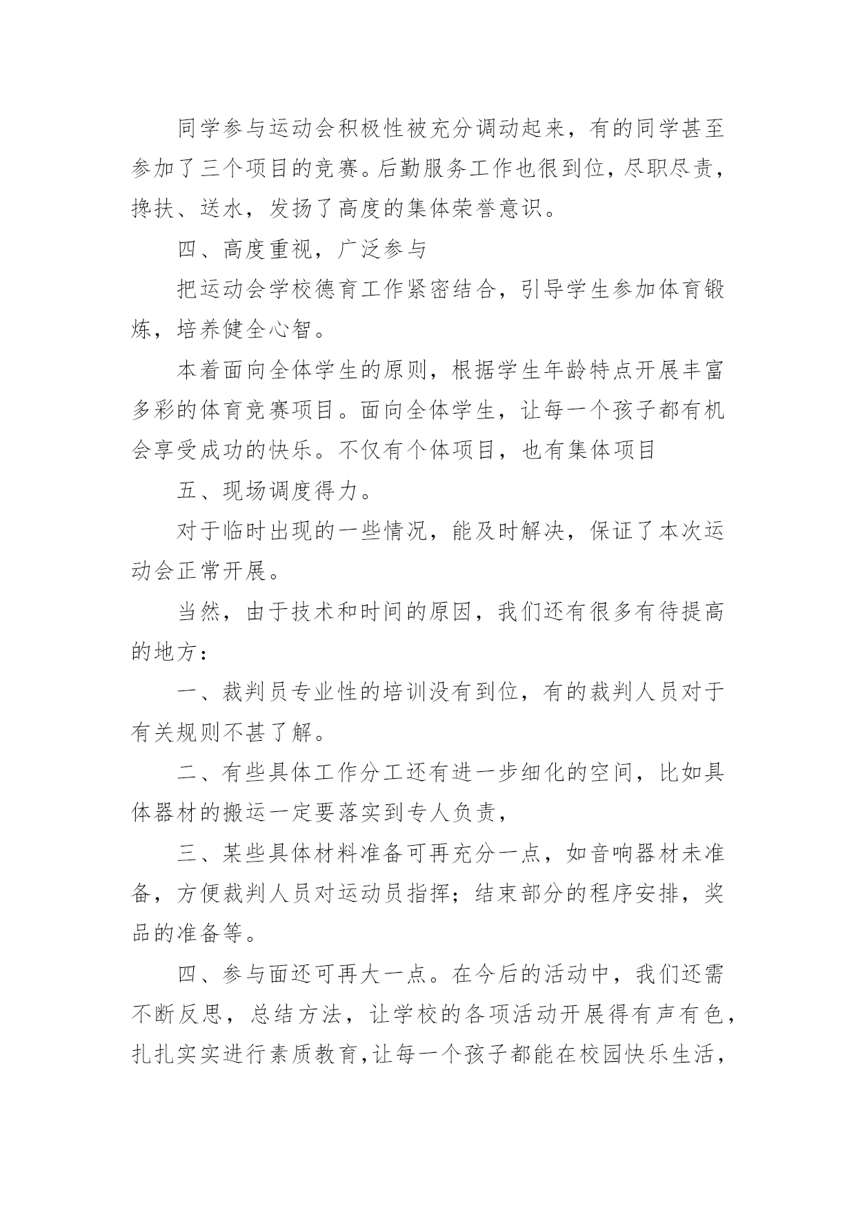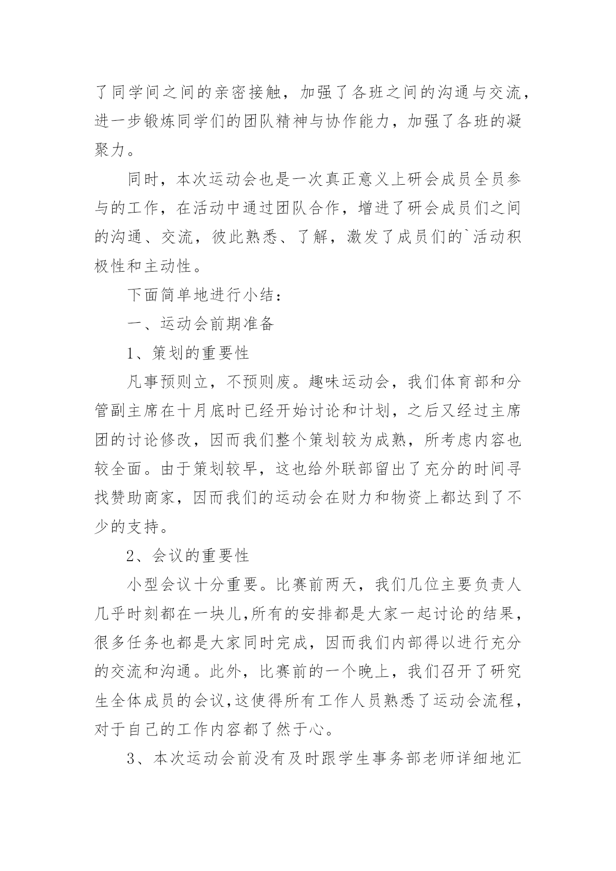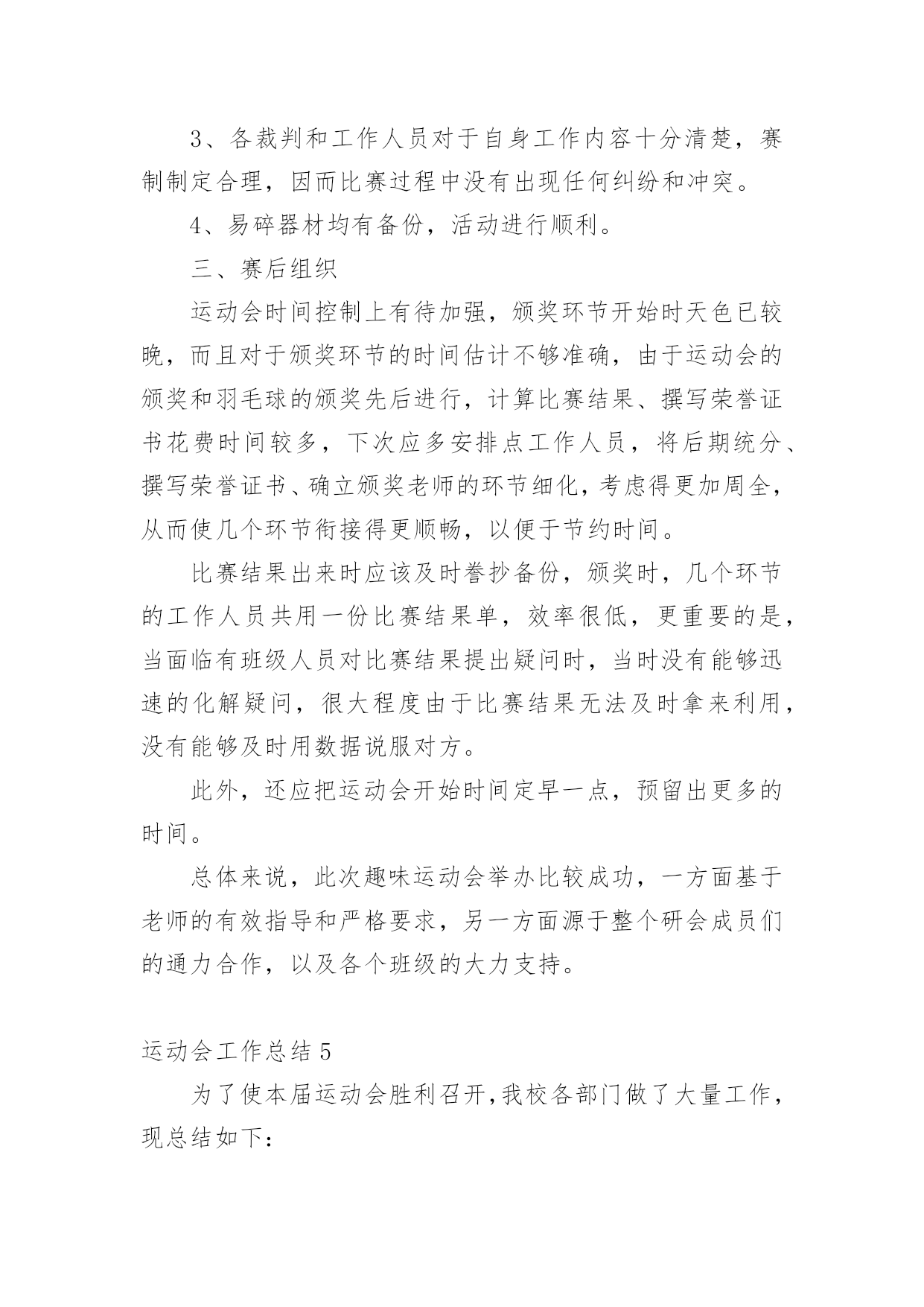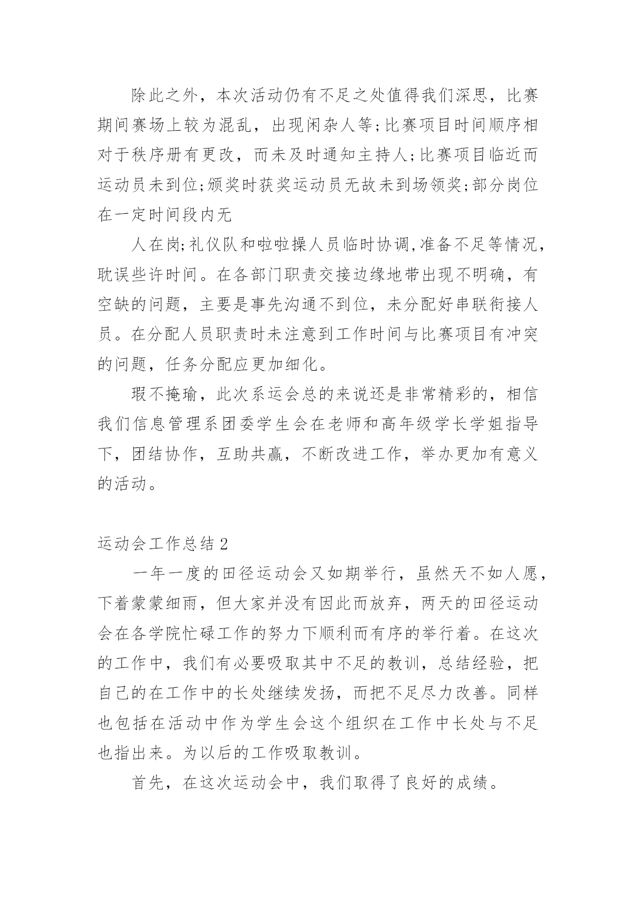运动会工作总结运动会工作总结15篇总结就是把一个时间段取得的成绩、存在的问题及得到的经验和教训进行一次全面系统的总结的书面材料,它可以帮助我们总结以往思想,发扬成绩,让我们来为自己写一份总结吧。那么总结应该包括什么内容呢?下面是小编为大家整理的运动会工作总结,欢迎大家分享。运动会工作总结1小学20xx年冬季运动会在12月1日成功举办。在全体老师的大力支持和同学们的踊跃参与、共同努力下,本着“赛出水平、赛出精神”的要求,此次运动会开得激烈、有序、活泼,充分展示了我校学生的风采。现将本次运动会得失总结如下:一、组织体系健全。全校教师都有明确的分工,各司其职,各负其责,保证了本次运动会的有序举行。二、准备工作到位。宣传工作、动员工作开展较早,组织各班同学踊跃报名。运动员编号工作、秩序册制作,赛场布置都在规定的时间前做好。三、同学大力配合。同学参与运动会积极性被充分调动起来,有的同学甚至参加了三个项目的竞赛。后勤服务工作也很到位,尽职尽责,搀扶、送水,发扬了高度的集体荣誉意识。四、高度重视,广泛参与把运动会学校德育工作紧密结合,引导学生参加体育锻炼,培养健全心智。本着面向全体学生的原则,根据学生年龄特点开展丰富多彩的体育竞赛项目。面向全体学生,让每一个孩子都有机会享受成功的快乐。不仅有个体项目,也有集体项目五、现场调度得力。对于临时出现的一些情况,能及时解决,保证了本次运动会正常开展。当然,由于技术和时间的原因,我们还有很多有待提高的地方:一、裁判员专业性的培训没有到位,有的裁判人员对于有关规则不甚了解。二、有些具体工作分工还有进一步细化的空间,比如具体器材的搬运一定要落实到专人负责,三、某些具体材料准备可再充分一点,如音响器材未准备,方便裁判人员对运动员指挥;结束部分的程序安排,奖品的准备等。四、参与面还可再大一点。在今后的活动中,我们还需不断反思,总结方法,让学校的各项活动开展得有声有色,扎扎实实进行素质教育,让每一个孩子都能在校园快乐生活,让每一个孩子都能享受成功的`快乐。有总结才有反思,有反思才有进步。在此,我们感谢大家的支持,我们所做的一切工作都是为了我校体育工作的顺利开展,并将一如既往,努力为广大同学营造一个积极向上,奋发有为的氛围。同时,希望同学们以运动会为契机,大力发扬拼搏精神和团队意识,在以后的学习和生活中取得良好的成绩。为了促进大学生身心健康发展,增强大学生身体素质,同时为了切实为全体同学提供一个体育竞技的平台,我系进行紧张筹备工作,并于20xx年x月x日在我校北操场举行规模盛大的运动会,并圆满结束,各部门相互配合,为系运会的顺利闭幕贡献了一份力量。这次运动会为我系学生们提供了广阔交流的平台,使学生们感受到体育竞技的魅力,也增进了同学们之间的相互了解,增强了同学们的集体荣誉感。同时也对我们团委学生会进行了一次严峻的考验,让我们能够及时发现问题并在以后的工作中吸取教训。我作为我系团委学生会的新成员,在此次活动中不断学习,尽力完成自己的工作任务。总的来说,此次系运会举办的还是相当成功的,在活动开展前团委学生会就系运会相关工作进行协调布置,各部门对自己的分工认真执行,责任到人。在活动中,各部门积极主动完成本部门的工作并及时修补漏洞,使整个活动顺利进行,衔接良好。我文艺部在此次系运会中承担主持人及机动组相关事宜,期间进展顺利,未出现大问题。除此之外,本次活动仍有不足之处值得我们深思,比赛期间赛场上较为混乱,出现闲杂人等;比赛项目时间顺序相对于秩序册有更改,而未及时通知主持人;比赛项目临近而运动员未到位;颁奖时获奖运动员无故未到场领奖;部分岗位在一定时间段内无人在岗;礼仪队和啦啦操人员临时协调,准备不足等情况,耽误些许时间。在各部门职责交接边缘地带出现不明确,有空缺的问题,主要是事先沟通不到位,未分配好串联衔接人员。在分配人员职责时未注意到工作时间与比赛项目有冲突的问题,任务分配应更加细化。瑕不掩瑜,此次系运会总的来说还是非常精彩的,相信我们信息管理系团委学生会在老师和高年级学长学姐指导下,团结协作,互助共赢,不断改进工作,举办更加有意义的活动。运动会工作总结2一年一度的田径运动会又如期举行,虽然天不如人愿,下着蒙蒙细雨,但大家并没有因此而放弃,两天的田径运动会在各学院忙碌工作的努力下顺利而有序的举行着。在这次的工作中,我们有必要吸取其中不足的教训,总结经验,把自己的在工作中的长处继续发扬,而把不足尽力改善。同样也包括在活动中作为学生会这个组织在工作中长处与不足也指出来。为以后的工作吸取教训。首先,在这次运动会中,我们取得了良好的成绩。在这次活动中,让我们懂得了团结一致的真正用意,荣誉并不是靠一个、两个人而争取就能得到了。比如:运动员们那风雨无阻的精神就值得我们去学习。在活动中,哪怕天空一直下着小雨,但比赛场上还是没有减
