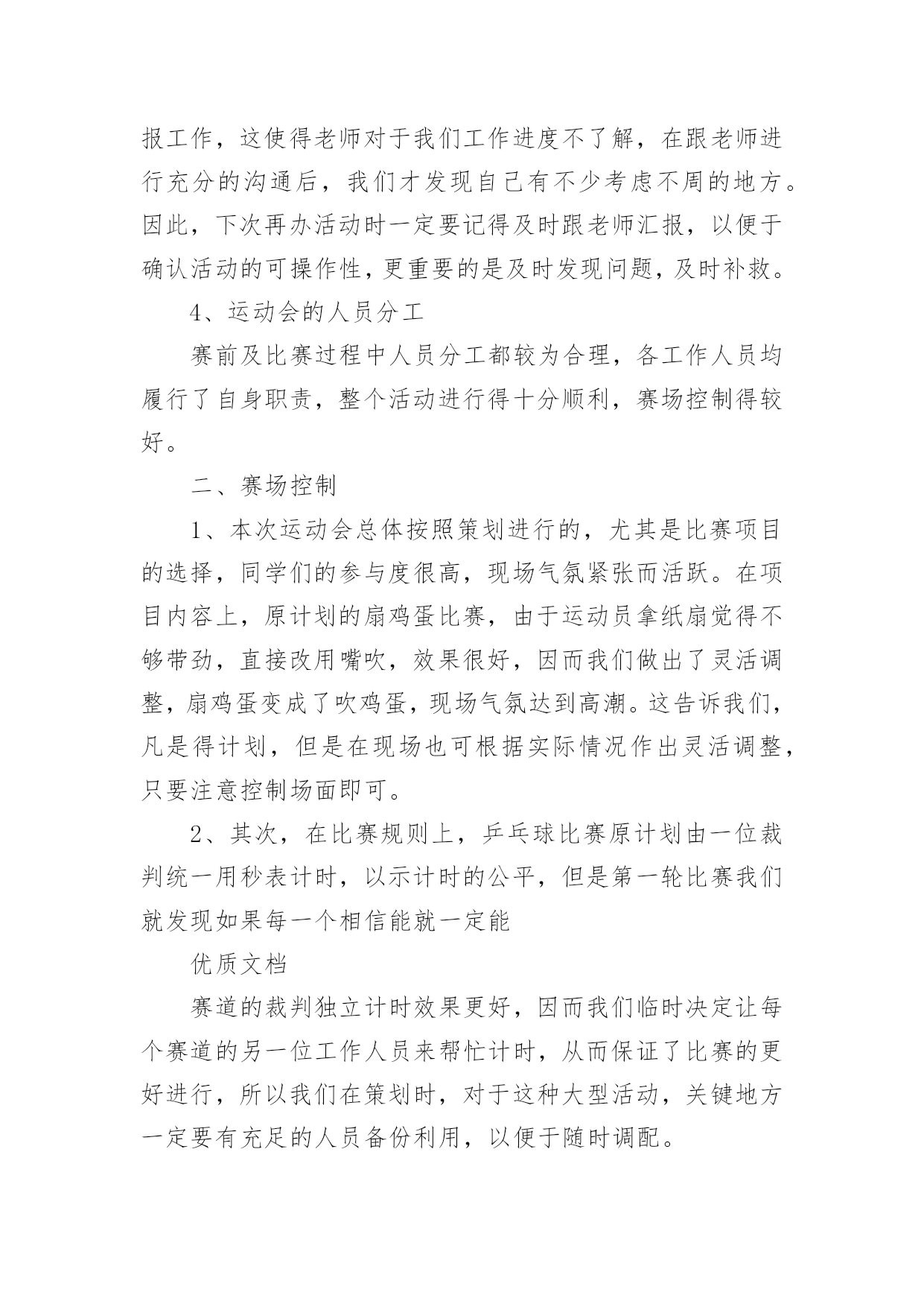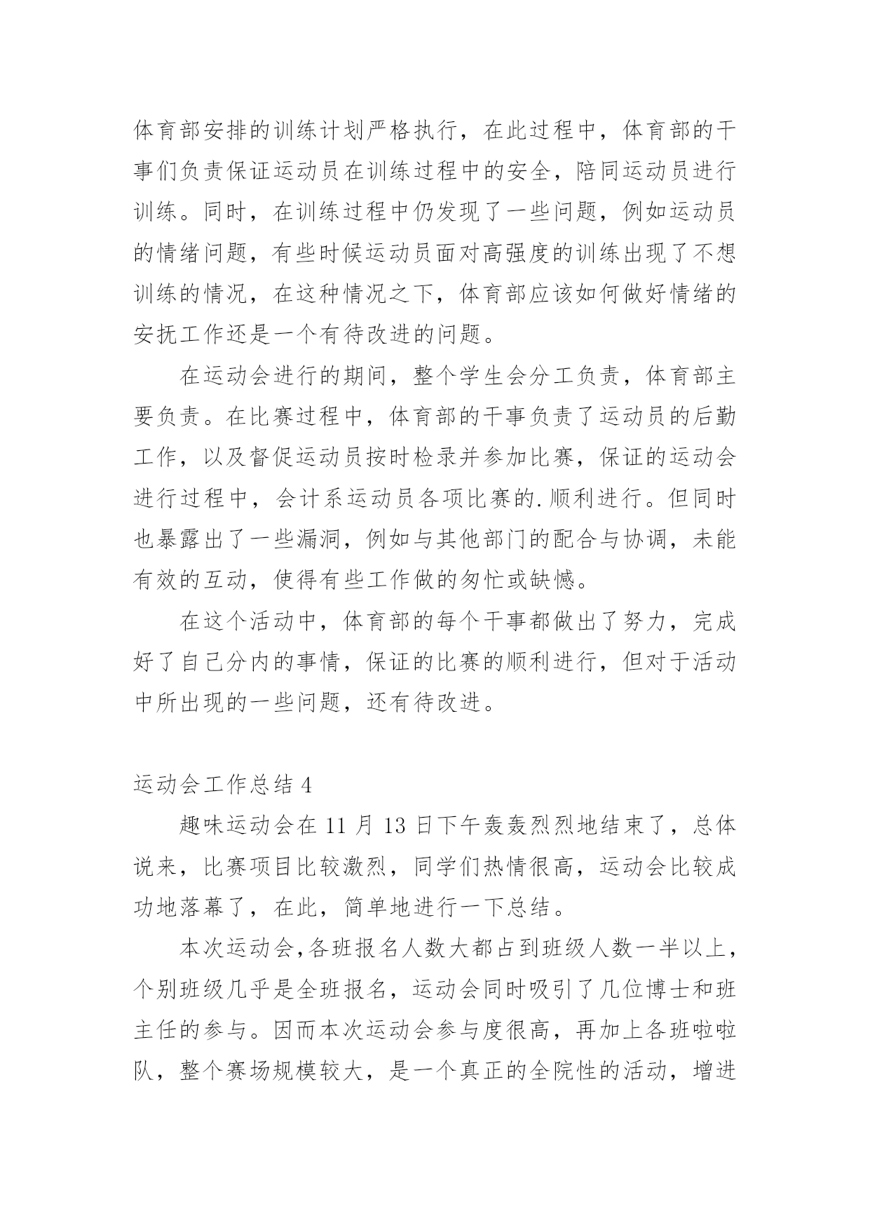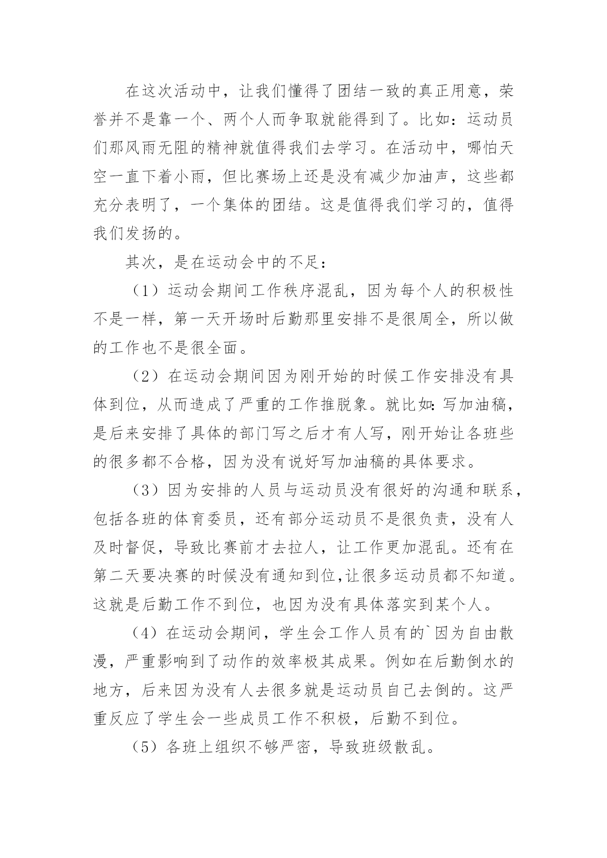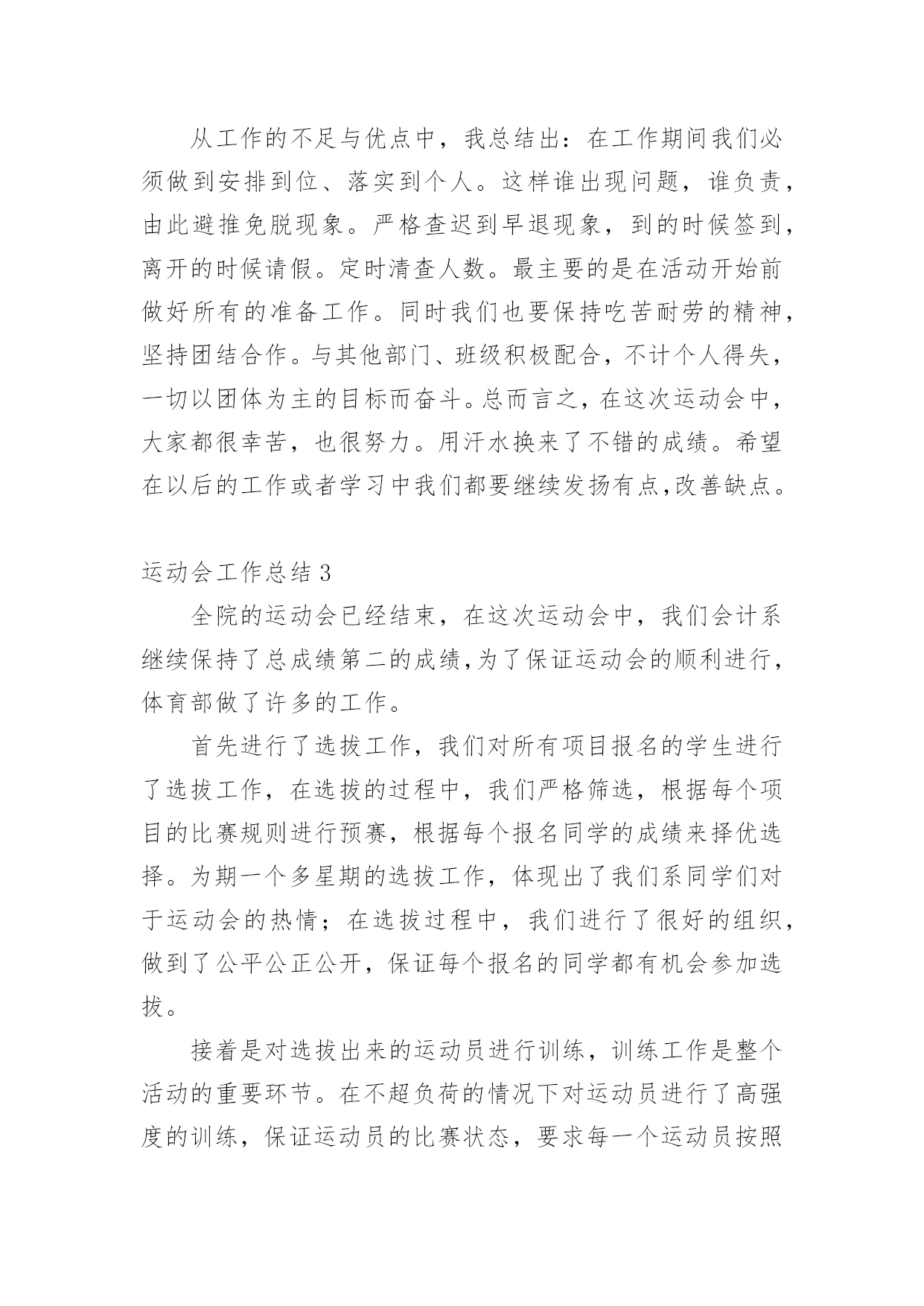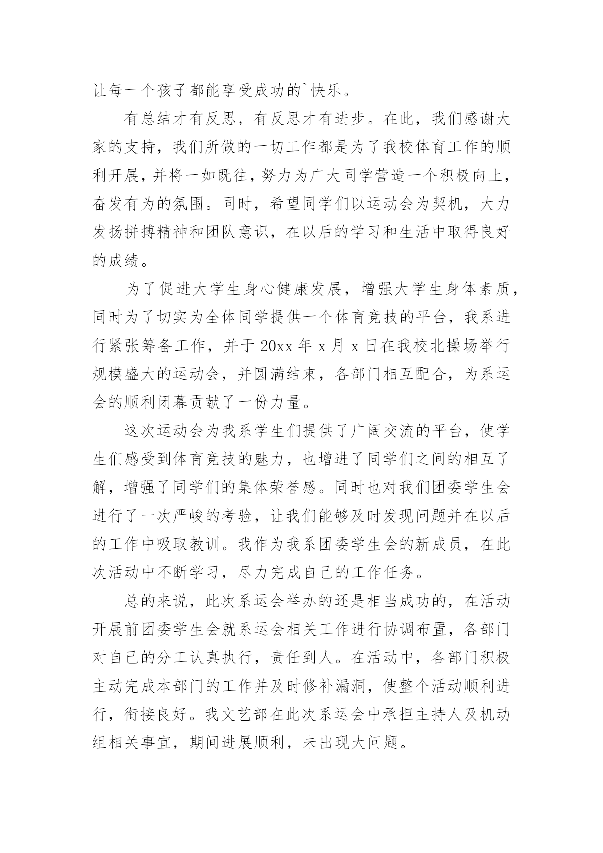 运动会工作总结运动会工作总结15篇总结就是把一个时间段取得的成绩、存在的问题及得到的经验和教训进行一次全面系统的总结的书面材料,它可以帮助我们总结以往思想,发扬成绩,让我们来为自己写一份总结吧。那么总结应该包括什么内容呢?下面是小编为大家整理的运动会工作总结,欢迎大家分享。运动会工作总结1小学20xx年冬季运动会在12月1日成功举办。在全体老师的大力支持和同学们的踊跃参与、共同努力下,本着“赛出水平、赛出精神”的要求,此次运动会开得激烈、有序、活泼,充分展示了我校学生的风采。现将本次运动会得失总结如下:一、组织体系健全。全校教师都有明确的分工,各司其职,各负其责,保证了本次运动会的有序举行。二、准备工作到位。宣传工作、动员工作开展较早,组织各班同学踊跃报名。运动员编号工作、秩序册制作,赛场布置都在规定的时间前做好。三、同学大力配合。同学参与运动会积极性被充分调动起来,有的同学甚至参加了三个项目的竞赛。后勤服务工作也很到位,尽职尽责,搀扶、送水,发扬了高度的集体荣誉意识。四、高度重视,广泛参与把运动会学校德育工作紧密结合,引导学生参加体育锻炼,培养健全心智。本着面向全体学生的原则,根据学生年龄特点开展丰富多彩的体育竞赛项目。面向全体学生,让每一个孩子都有机会享受成功的快乐。不仅有个体项目,也有集体项目五、现场调度得力。对于临时出现的一些情况,能及时解决,保证了本次运动会正常开展。当然,由于技术和时间的原因,我们还有很多有待提高的地方:一、裁判员专业性的培训没有到位,有的裁判人员对于有关规则不甚了解。二、有些具体工作分工还有进一步细化的空间,比如具体器材的搬运一定要落实到专人负责,三、某些具体材料准备可再充分一点,如音响器材未准备,方便裁判人员对运动员指挥;结束部分的程序安排,奖品的准备等。四、参与面还可再大一点。在今后的活动中,我们还需不断反思,总结方法,让学校的各项活动开展得有声有色,扎扎实实进行素质教育,让每一个孩子都能在校园快乐生活,让每一个孩子都能享受成功的`快乐。有总结才有反思,有反思才有进步。在此,我们感谢大家的支持,我们所做的一切工作都是为了我校体育工作的顺利开展,并将一如既往,努力为广大同学营造一个积极向上,奋发有为的氛围。同时,希望同学们以运动会为契机,大力发扬拼搏精神和团队意识,在以后的学习和生活中取得良好的成绩。为了促进大学生身心健康发展,增强大学生身体素质,同时为了切实为全体同学提供一个体育竞技的平台,我系进行紧张筹备工作,并于20xx年x月x日在我校北操场举行规模盛大的运动会,并圆满结束,各部门相互配合,为系运会的顺利闭幕贡献了一份力量。这次运动会为我系学生们提供了广阔交流的平台,使学生们感受到体育竞技的魅力,也增进了同学们之间的相互了解,增强了同学们的集体荣誉感。同时也对我们团委学生会进行了一次严峻的考验,让我们能够及时发现问题并在以后的工作中吸取教训。我作为我系团委学生会的新成员,在此次活动中不断学习,尽力完成自己的工作任务。总的来说,此次系运会举办的还是相当成功的,在活动开展前团委学生会就系运会相关工作进行协调布置,各部门对自己的分工认真执行,责任到人。在活动中,各部门积极主动完成本部门的工作并及时修补漏洞,使整个活动顺利进行,衔接良好。我文艺部在此次系运会中承担主持人及机动组相关事宜,期间进展顺利,未出现大问题。除此之外,本次活动仍有不足之处值得我们深思,比赛期间赛场上较为混乱,出现闲杂人等;比赛项目时间顺序相对于秩序册有更改,而未及时通知主持人;比赛项目临近而运动员未到位;颁奖时获奖运动员无故未到场领奖;部分岗位在一定时间段内无人在岗;礼仪队和啦啦操人员临时协调,准备不足等情况,耽误些许时间。在各部门职责交接边缘地带出现不明确,有空缺的问题,主要是事先沟通不到位,未分配好串联衔接人员。在分配人员职责时未注意到工作时间与比赛项目有冲突的问题,任务分配应更加细化。瑕不掩瑜,此次系运会总的来说还是非常精彩的,相信我们信息管理系团委学生会在老师和高年级学长学姐指导下,团结协作,互助共赢,不断改进工作,举办更加有意义的活动。运动会工作总结2一年一度的田径运动会又如期举行,虽然天不如人愿,下着蒙蒙细雨,但大家并没有因此而放弃,两天的田径运动会在各学院忙碌工作的努力下顺利而有序的举行着。在这次的工作中,我们有必要吸取其中不足的教训,总结经验,把自己的在工作中的长处继续发扬,而把不足尽力改善。同样也包括在活动中作为学生会这个组织在工作中长处与不足也指出来。为以后的工作吸取教训。首先,在这次运动会中,我们取得了良好的成绩。在这次活动中,让我们懂得了团结一致的真正用意,荣誉并不是靠一个、两个人而争取就能得到了。比如:运动员们那风雨无阻的精神就值得我们去学习。在活动中,哪怕天空一直下着小雨,但比赛场上还是没有减