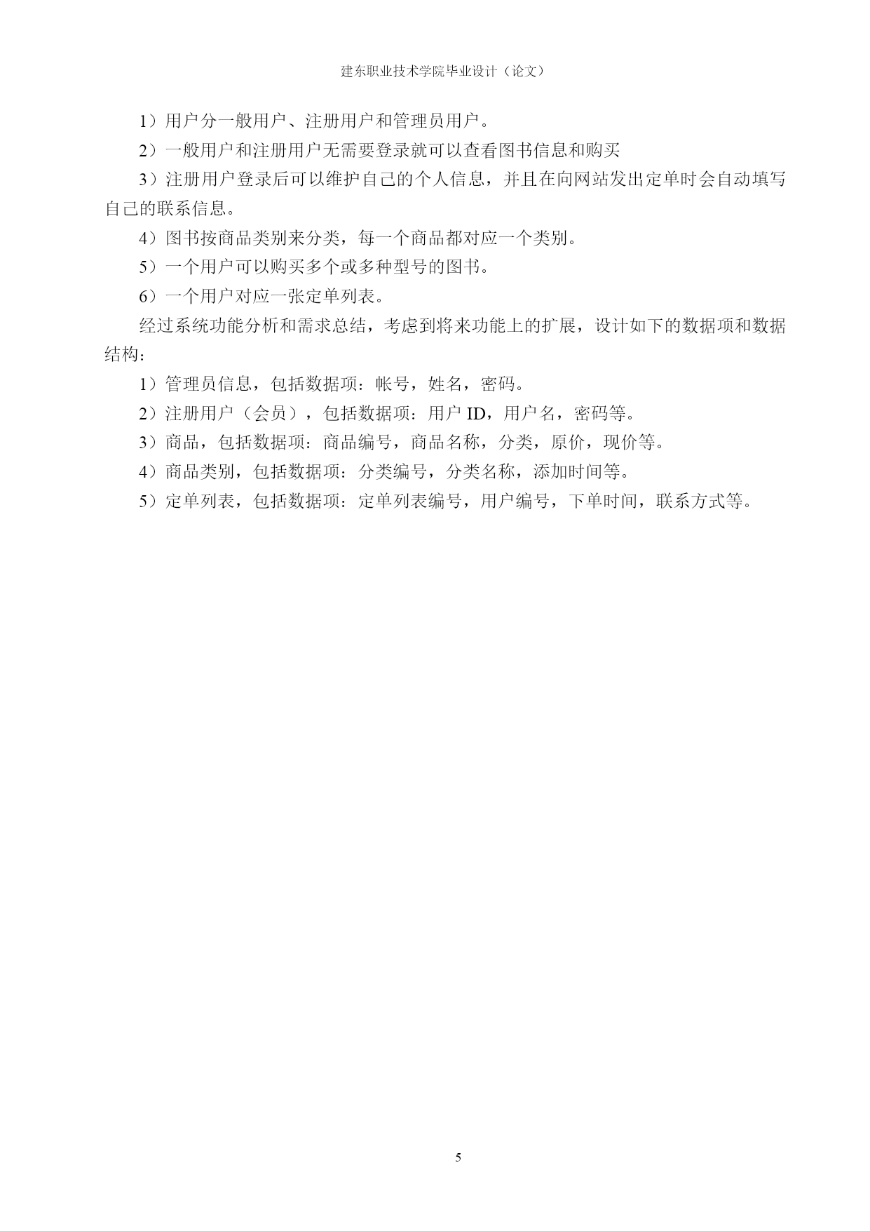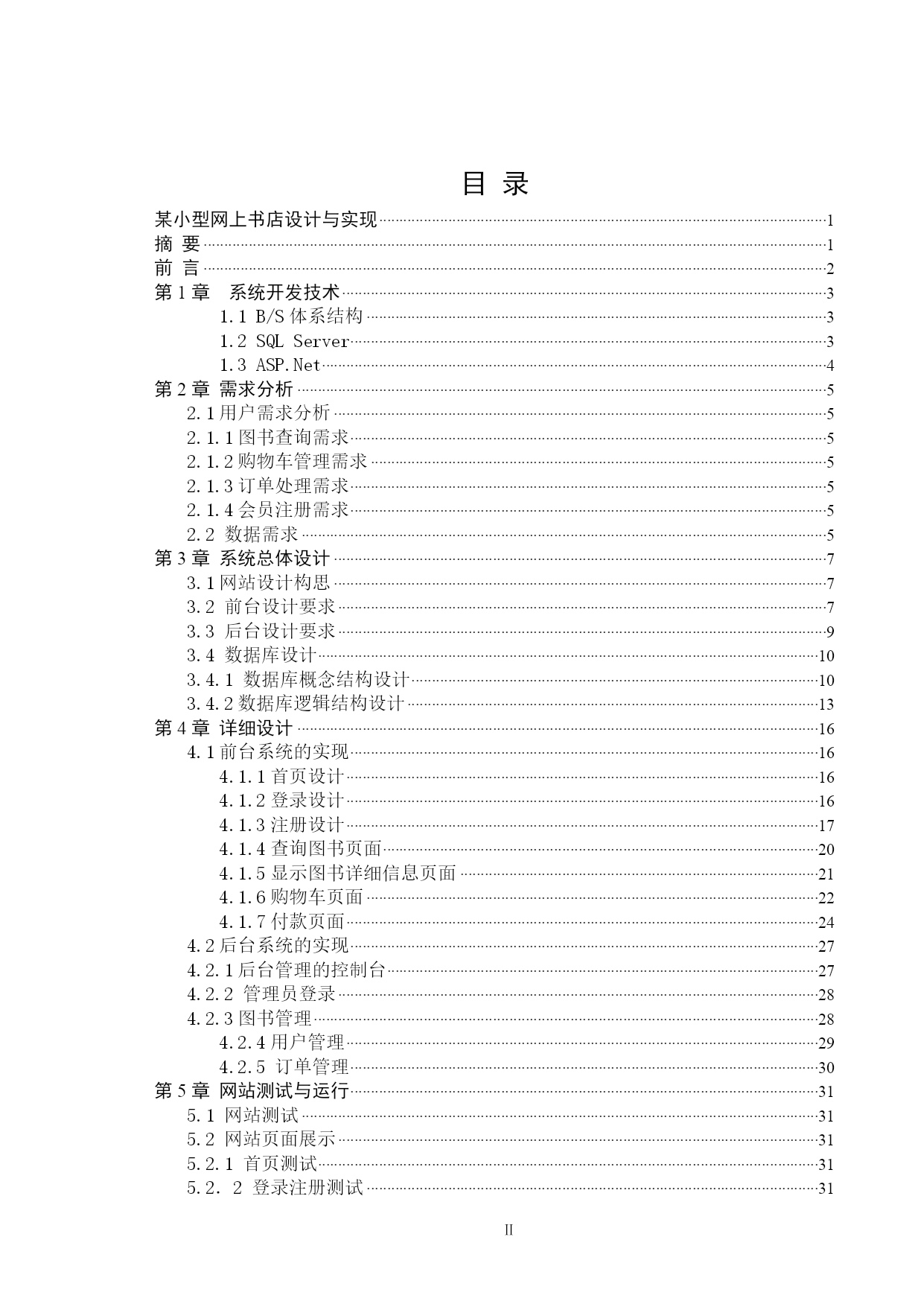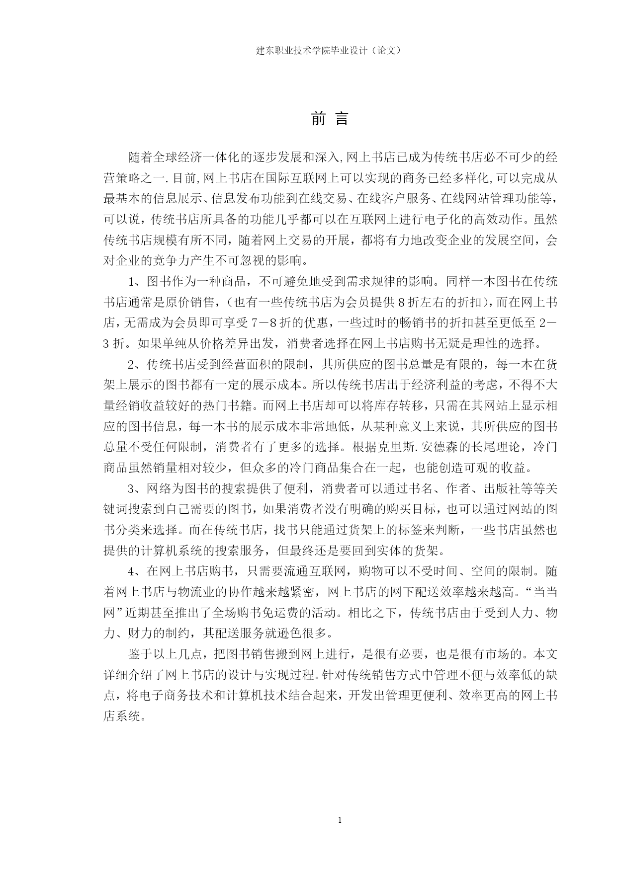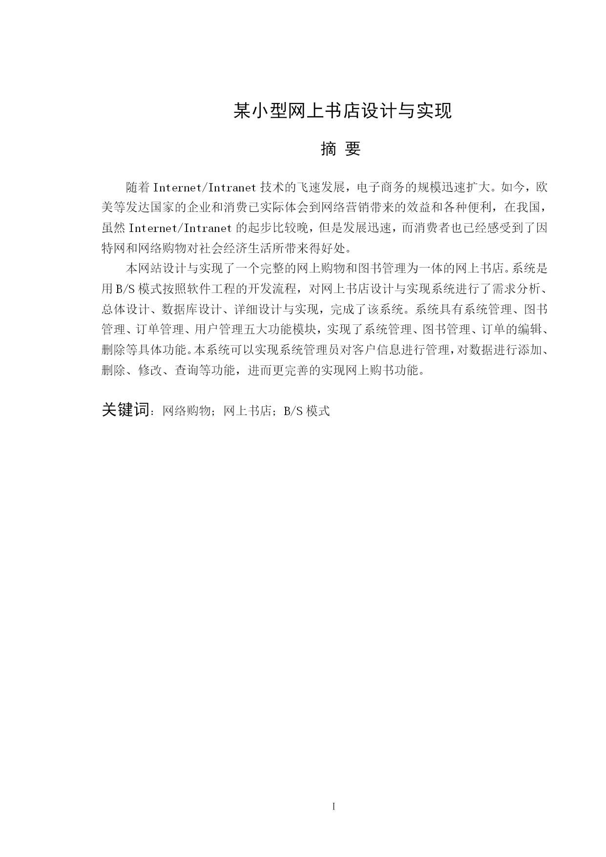 建东职业技术学院毕业设计说明书设计题目某小型网上书店设计与实现系部名称电子与电气工程系专业班级计算机应用(202117)学号100202117学生姓名李晓鹏指导教师庄霞职称讲师完成日期2012年11月4日Ⅰ某小型网上书店设计与实现摘要随着Internet/Intranet技术的飞速发展,电子商务的规模迅速扩大。如今,欧美等发达国家的企业和消费已实际体会到网络营销带来的效益和各种便利,在我国,虽然Internet/Intranet的起步比较晚,但是发展迅速,而消费者也已经感受到了因特网和网络购物对社会经济生活所带来得好处。本网站设计与实现了一个完整的网上购物和图书管理为一体的网上书店。系统是用B/S模式按照软件工程的开发流程,对网上书店设计与实现系统进行了需求分析、总体设计、数据库设计、详细设计与实现,完成了该系统。系统具有系统管理、图书管理、订单管理、用户管理五大功能模块,实现了系统管理、图书管理、订单的编辑、删除等具体功能。本系统可以实现系统管理员对客户信息进行管理,对数据进行添加、删除、修改、查询等功能,进而更完善的实现网上购书功能。关键词:网络购物;网上书店;B/S模式ⅡPAGE1目录TOC\o"1-3"\h\z\uHYPERLINK\l"_Toc339815415"某小型网上书店设计与实现PAGEREF_Toc339815415\h1HYPERLINK\l"_Toc339815416"摘要PAGEREF_Toc339815416\h1HYPERLINK\l"_Toc339815417"前言PAGEREF_Toc339815417\h2HYPERLINK\l"_Toc339815418"第1章系统开发技术PAGEREF_Toc339815418\h3HYPERLINK\l"_Toc339815419"1.1B/S体系结构PAGEREF_Toc339815419\h3HYPERLINK\l"_Toc339815420"1.2SQLServerPAGEREF_Toc339815420\h3HYPERLINK\l"_Toc339815421"1.3ASP.NetPAGEREF_Toc339815421\h4HYPERLINK\l"_Toc339815422"第2章需求分析PAGEREF_Toc339815422\h5HYPERLINK\l"_Toc339815423"2.1用户需求分析PAGEREF_Toc339815423\h5HYPERLINK\l"_Toc339815424"2.1.1图书查询需求PAGEREF_Toc339815424\h5HYPERLINK\l"_Toc339815425"2.1.2购物车管理需求PAGEREF_Toc339815425\h5HYPERLINK\l"_Toc339815426"2.1.3订单处理需求PAGEREF_Toc339815426\h5HYPERLINK\l"_Toc339815427"2.1.4会员注册需求PAGEREF_Toc339815427\h5HYPERLINK\l"_Toc339815428"2.2数据需求PAGEREF_Toc339815428\h5HYPERLINK\l"_Toc339815429"第3章系统总体设计PAGEREF_Toc339815429\h7HYPERLINK\l"_Toc339815430"3.1网站设计构思PAGEREF_Toc339815430\h7HYPERLINK\l"_Toc339815431"3.2前台设计要求PAGEREF_Toc339815431\h7HYPERLINK\l"_Toc339815432"3.3后台设计要求PAGEREF_Toc339815432\h9HYPERLINK\l"_Toc339815433"3.4数据库设计PAGEREF_Toc339815433\h10HYPERLINK\l"_Toc339815434"3.4.1数据库概念结构设计PAGEREF_Toc339815434\h10HYPERLINK\l"_Toc339815435"3.4.2数据库逻辑结构设计PAGEREF_Toc339815435\h13HYPERLINK\l"_Toc339815436"第4章详细设计PAG