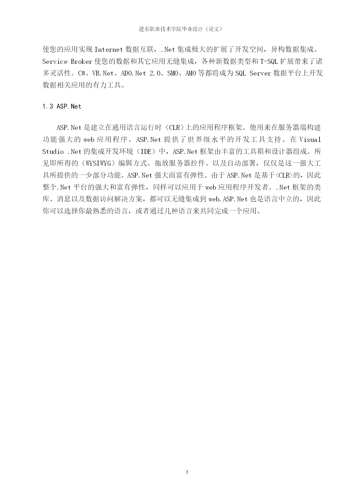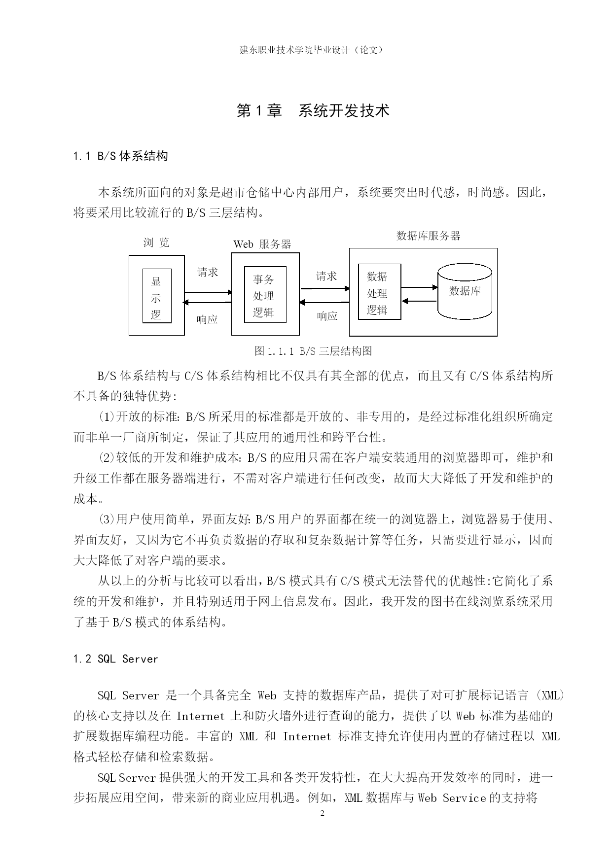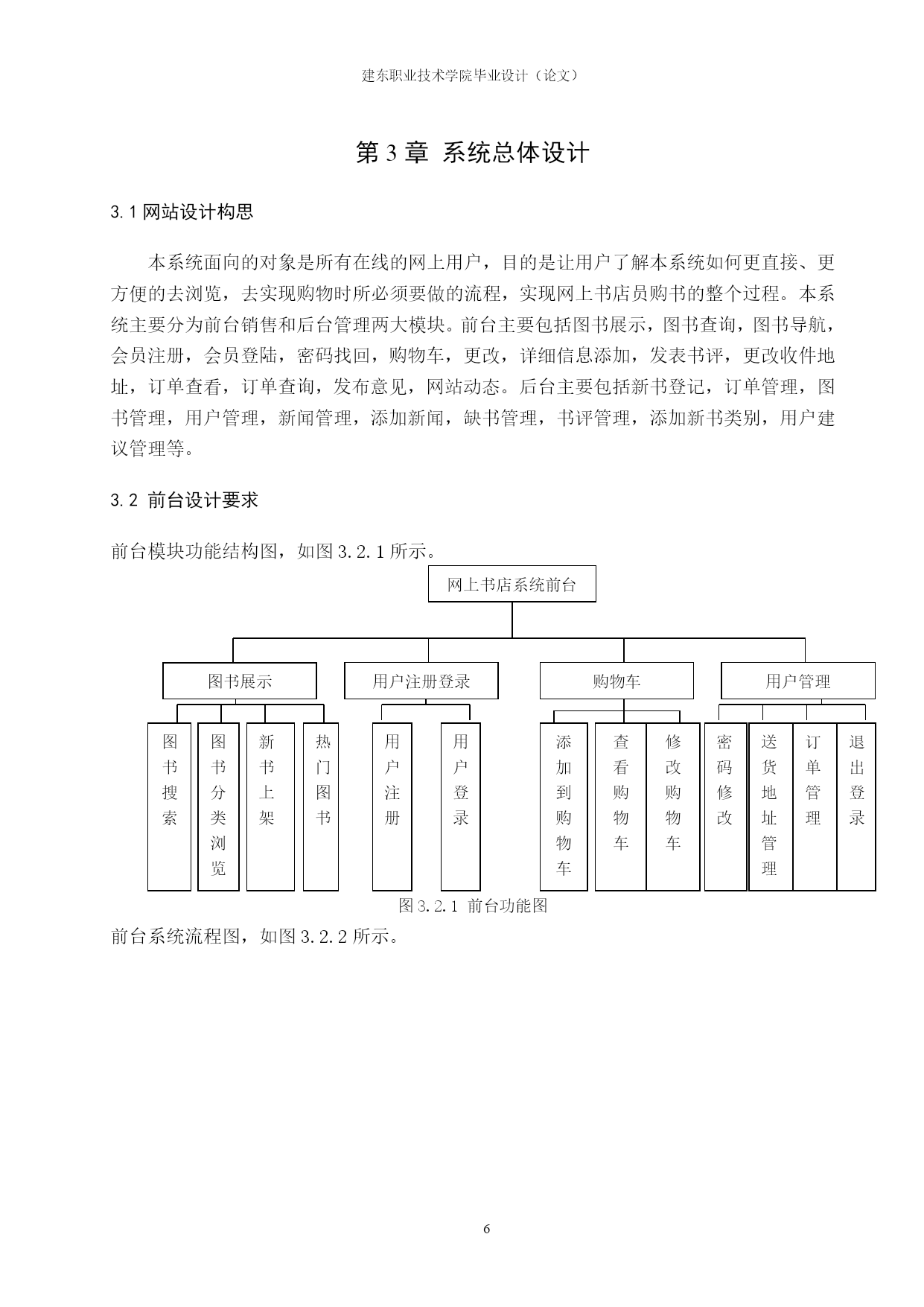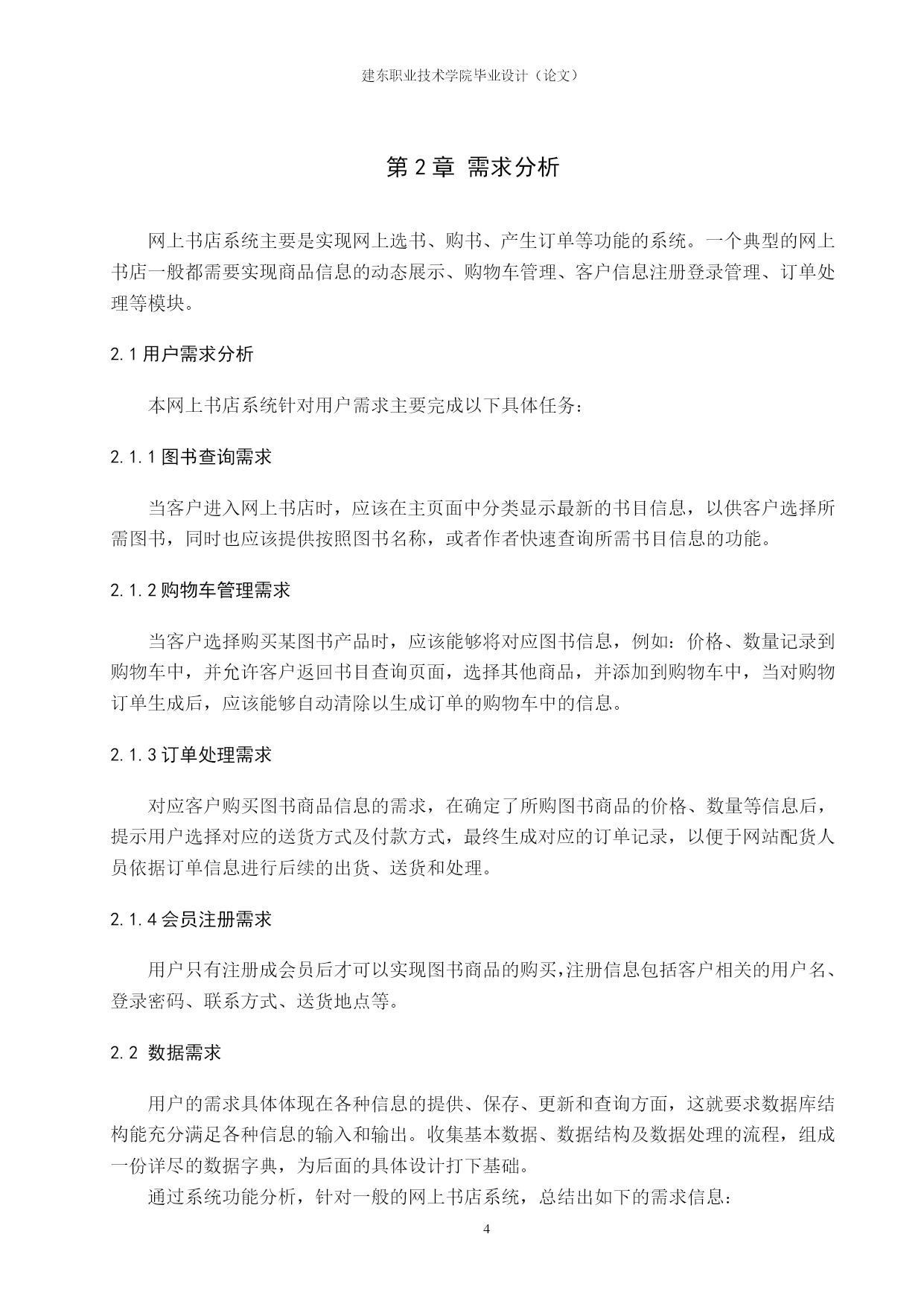 建东职业技术学院毕业设计说明书设计题目某小型网上书店设计与实现系部名称电子与电气工程系专业班级计算机应用(202117)学号100202117学生姓名李晓鹏指导教师庄霞职称讲师完成日期2012年11月4日Ⅰ某小型网上书店设计与实现摘要随着Internet/Intranet技术的飞速发展,电子商务的规模迅速扩大。如今,欧美等发达国家的企业和消费已实际体会到网络营销带来的效益和各种便利,在我国,虽然Internet/Intranet的起步比较晚,但是发展迅速,而消费者也已经感受到了因特网和网络购物对社会经济生活所带来得好处。本网站设计与实现了一个完整的网上购物和图书管理为一体的网上书店。系统是用B/S模式按照软件工程的开发流程,对网上书店设计与实现系统进行了需求分析、总体设计、数据库设计、详细设计与实现,完成了该系统。系统具有系统管理、图书管理、订单管理、用户管理五大功能模块,实现了系统管理、图书管理、订单的编辑、删除等具体功能。本系统可以实现系统管理员对客户信息进行管理,对数据进行添加、删除、修改、查询等功能,进而更完善的实现网上购书功能。关键词:网络购物;网上书店;B/S模式ⅡPAGE1目录TOC\o"1-3"\h\z\uHYPERLINK\l"_Toc339815415"某小型网上书店设计与实现PAGEREF_Toc339815415\h1HYPERLINK\l"_Toc339815416"摘要PAGEREF_Toc339815416\h1HYPERLINK\l"_Toc339815417"前言PAGEREF_Toc339815417\h2HYPERLINK\l"_Toc339815418"第1章系统开发技术PAGEREF_Toc339815418\h3HYPERLINK\l"_Toc339815419"1.1B/S体系结构PAGEREF_Toc339815419\h3HYPERLINK\l"_Toc339815420"1.2SQLServerPAGEREF_Toc339815420\h3HYPERLINK\l"_Toc339815421"1.3ASP.NetPAGEREF_Toc339815421\h4HYPERLINK\l"_Toc339815422"第2章需求分析PAGEREF_Toc339815422\h5HYPERLINK\l"_Toc339815423"2.1用户需求分析PAGEREF_Toc339815423\h5HYPERLINK\l"_Toc339815424"2.1.1图书查询需求PAGEREF_Toc339815424\h5HYPERLINK\l"_Toc339815425"2.1.2购物车管理需求PAGEREF_Toc339815425\h5HYPERLINK\l"_Toc339815426"2.1.3订单处理需求PAGEREF_Toc339815426\h5HYPERLINK\l"_Toc339815427"2.1.4会员注册需求PAGEREF_Toc339815427\h5HYPERLINK\l"_Toc339815428"2.2数据需求PAGEREF_Toc339815428\h5HYPERLINK\l"_Toc339815429"第3章系统总体设计PAGEREF_Toc339815429\h7HYPERLINK\l"_Toc339815430"3.1网站设计构思PAGEREF_Toc339815430\h7HYPERLINK\l"_Toc339815431"3.2前台设计要求PAGEREF_Toc339815431\h7HYPERLINK\l"_Toc339815432"3.3后台设计要求PAGEREF_Toc339815432\h9HYPERLINK\l"_Toc339815433"3.4数据库设计PAGEREF_Toc339815433\h10HYPERLINK\l"_Toc339815434"3.4.1数据库概念结构设计PAGEREF_Toc339815434\h10HYPERLINK\l"_Toc339815435"3.4.2数据库逻辑结构设计PAGEREF_Toc339815435\h13HYPERLINK\l"_Toc339815436"第4章详细设计PAG