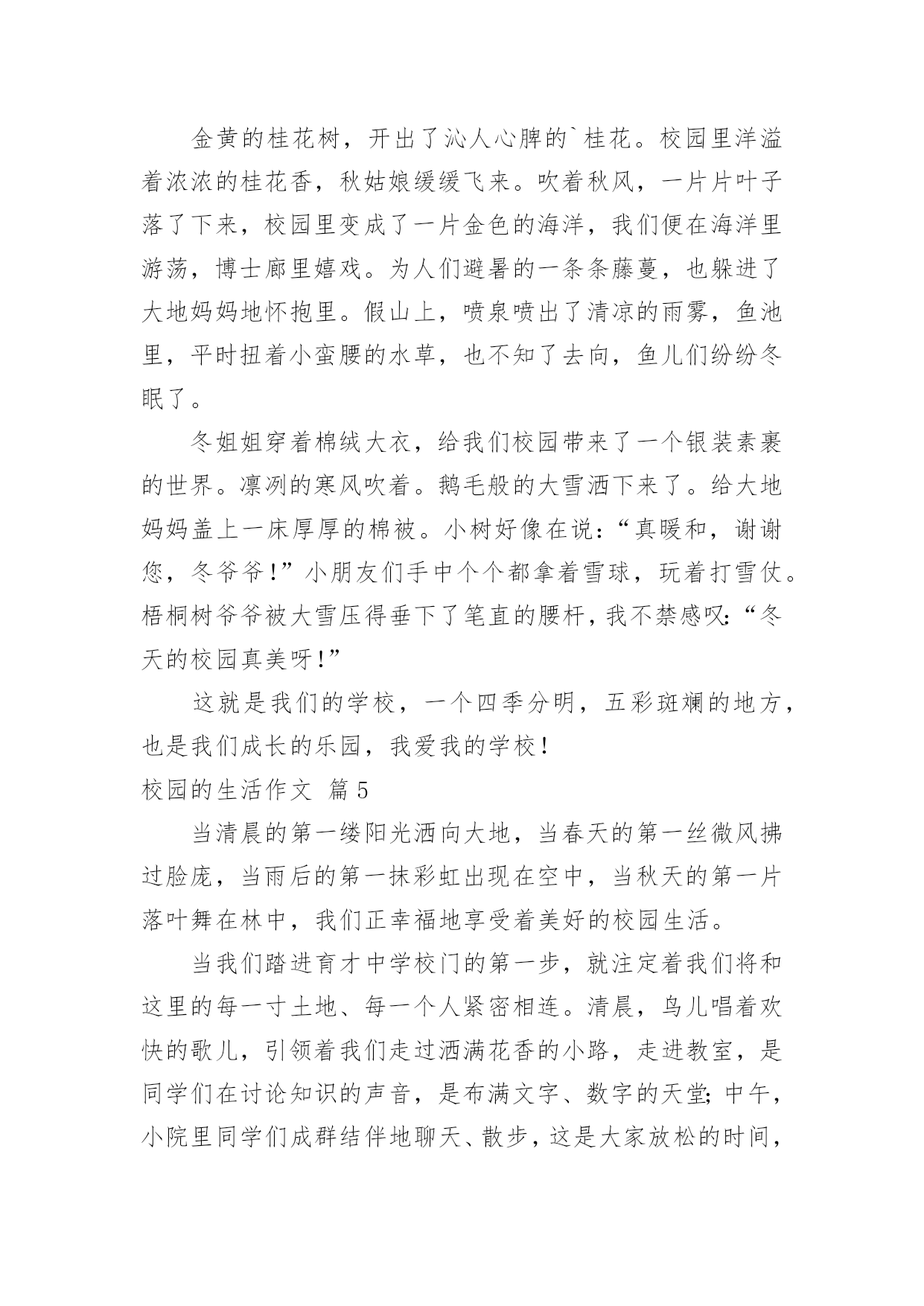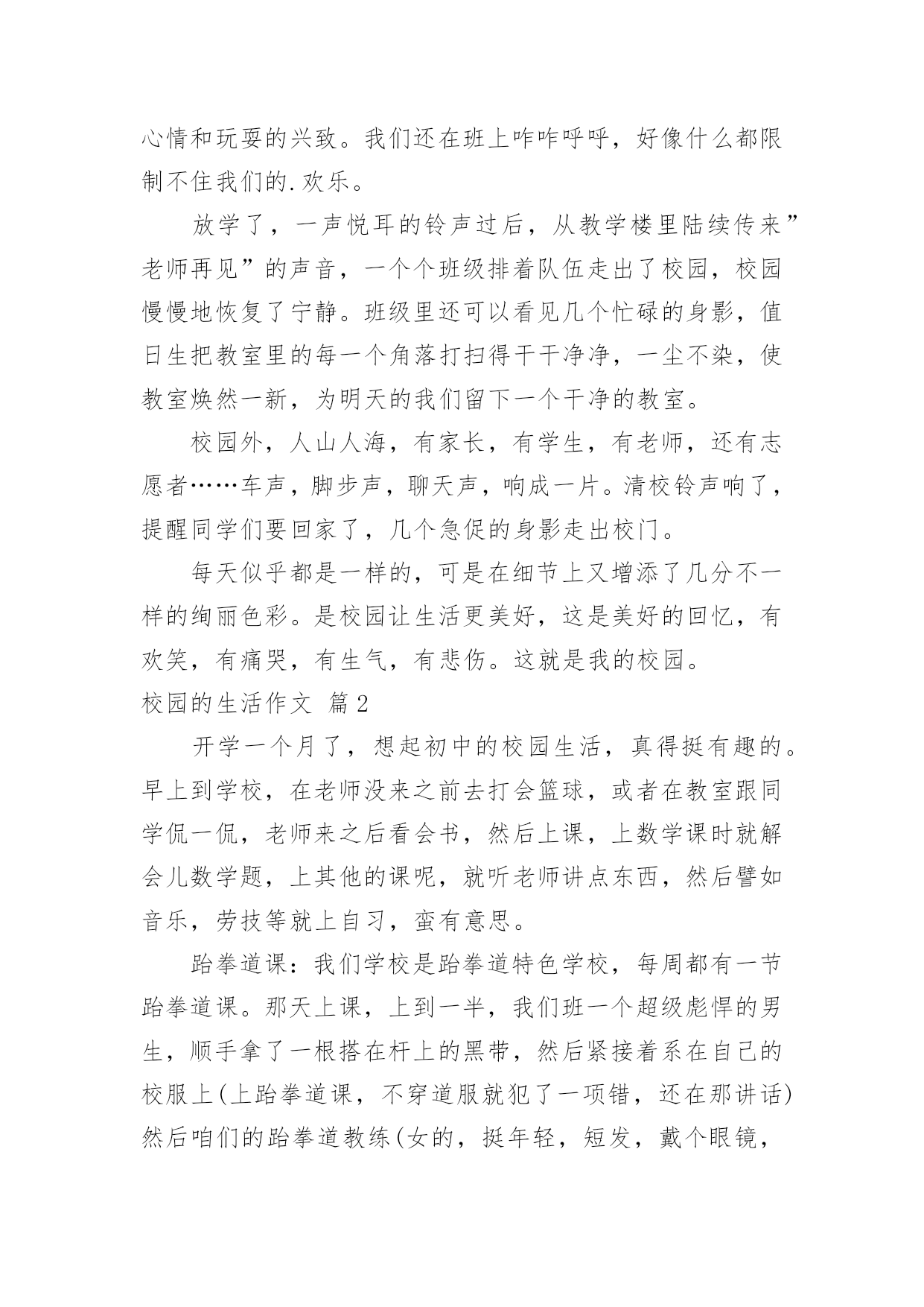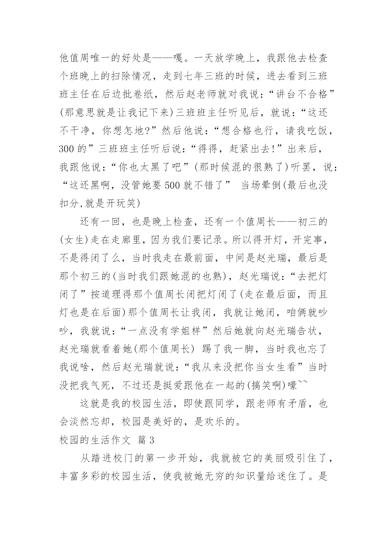 校园的生活作文精选校园的生活作文5篇在平凡的学习、工作、生活中,大家都有写作文的经历,对作文很是熟悉吧,借助作文可以提高我们的语言组织能力。相信许多人会觉得作文很难写吧,以下是小编帮大家整理的校园的生活作文5篇,供大家参考借鉴,希望可以帮助到有需要的朋友。校园的生活作文篇1校园,让生活更美好!伴着清晨的微风,一走进校门,就看见和蔼可亲的老师面带微笑地看着我们。一栋高大的教学楼映入眼帘,教学楼中的朗朗读书声,声声入耳。上课了,热闹的校园安静下来,只剩下鸟儿悦耳婉转的歌声和我们的读书声,小鸟仿佛也想加入读书的队伍,在为我们卖力地“伴奏”着。我们也在它们的陪伴下,全神贯注着听着老师讲着有趣的课。下课后,操场上的纸飞机在空中划过一道优美的弧线,篮球发出的“砰砰”声中充满了大家对它的热爱。同学们尽情地嬉戏打闹,操场后面的一块空地是女生的“天堂”。春天到来的时候,这里的几棵桂花树散发出淡淡的清香,在这里读书,聊天,做游戏再惬意不过了。高楼层的孩子们在老师的提醒中放慢了奔跑的脚步,我们没有广阔的地方可以玩耍,但是这也限制不了我们喜悦的心情和玩耍的兴致。我们还在班上咋咋呼呼,好像什么都限制不住我们的.欢乐。放学了,一声悦耳的铃声过后,从教学楼里陆续传来”老师再见”的声音,一个个班级排着队伍走出了校园,校园慢慢地恢复了宁静。班级里还可以看见几个忙碌的身影,值日生把教室里的每一个角落打扫得干干净净,一尘不染,使教室焕然一新,为明天的我们留下一个干净的教室。校园外,人山人海,有家长,有学生,有老师,还有志愿者……车声,脚步声,聊天声,响成一片。清校铃声响了,提醒同学们要回家了,几个急促的身影走出校门。每天似乎都是一样的,可是在细节上又增添了几分不一样的绚丽色彩。是校园让生活更美好,这是美好的回忆,有欢笑,有痛哭,有生气,有悲伤。这就是我的校园。校园的生活作文篇2开学一个月了,想起初中的校园生活,真得挺有趣的。早上到学校,在老师没来之前去打会篮球,或者在教室跟同学侃一侃,老师来之后看会书,然后上课,上数学课时就解会儿数学题,上其他的课呢,就听老师讲点东西,然后譬如音乐,劳技等就上自习,蛮有意思。跆拳道课:我们学校是跆拳道特色学校,每周都有一节跆拳道课。那天上课,上到一半,我们班一个超级彪悍的男生,顺手拿了一根搭在杆上的黑带,然后紧接着系在自己的校服上(上跆拳道课,不穿道服就犯了一项错,还在那讲话)然后咱们的跆拳道教练(女的,挺年轻,短发,戴个眼镜,姓郑)就看着了,就说:“诶,那个男生,过来一下。”那个男生瞅了瞅别人,然后就过去了。郑教练就问他:“犯了几项错?”那个男生考虑了一会说:“两项。”“拿黑带?”“嗯,三项”“顶嘴?”“四项”(快速的回答)“往自己校服上系?(跆拳道很讲究的)”“恩,五项”然后郑教练让他躺下(我们都知道,其实是要给他撕韧带,很疼的)然后那个男生还跟教练皮,教练生气了,上去绊他一下,倒地了。那个男生还挣扎,教练摁他腿,还没怎的呢,就叫上了,开始撕的时候像杀猪似的(不过真的很疼,不是装的),估计全楼都听见了,撕完之后,那个男生就坐在地上不起来,郑教练瞅他说:“怎么?还想...?”然后那个男生就连忙起来回去了。看到这,大家都以为郑教练挺狠的,其实郑教练挺好的,她跟咱们说,她上学时写检讨书,从不写‘我错了’都写‘我做这事错了’(我才明白什么意思:说明她永不言败,对事不对人,是个不错的教练政治课:咱们原来的政治老师去当班主任了,然后又给我们新换一个政治老师,第一节课给我们的印象是挺严厉,第二节课呢,我们把她给气哭了(她刚大学毕业),这把我们吓的,赶忙道歉,之后又演小品,这一节课才过去(她也没给我们打小报告),不过这也让我们对她有了更深刻的了解(其实她挺好的)上课的事讲完了,该讲值周时候的事了,上学期值周的时候,管我们的是赵光瑞(一个戴眼镜,胖胖的.,男老师,长的很像功夫熊猫,会打太极,有时比功夫熊猫还搞笑)跟他值周唯一的好处是——嘎。一天放学晚上,我跟他去检查个班晚上的扫除情况,走到七年三班的时候,进去看到三班班主任在后边批卷纸,然后赵老师就对我说:“讲台不合格”(那意思就是让我记下来)三班班主任听见后,就说:“这还不干净,你想怎地?”然后他说:“想合格也行,请我吃饭,300的”三班班主任听后说:“得得,赶紧出去!”出来后,我跟他说:“你也太黑了吧”(那时候混的很熟了)听罢,说:“这还黑啊,没管她要500就不错了”当场晕倒(最后也没扣分,就是开玩笑)还有一回,也是晚上检查,还有一个值周长——初三的(女生)走在走廊里,因为我们要记录。所以得开灯,开完事,不是得闭了么,当时我走在最前面,中间是赵光瑞,最后是那个初三的(当时我们跟她混的也熟),赵光瑞说:“去把灯闭了”按道理得那个值周长闭把灯闭了(走在最后面,而且灯也是在后面)那个值周长让我