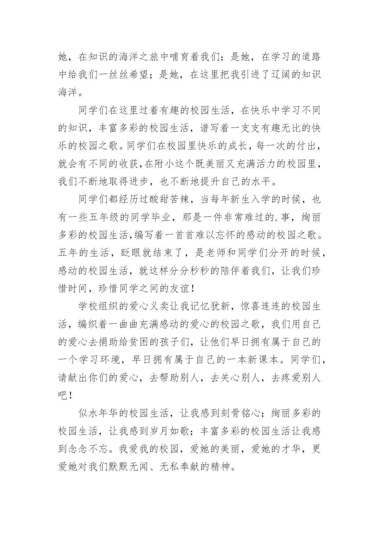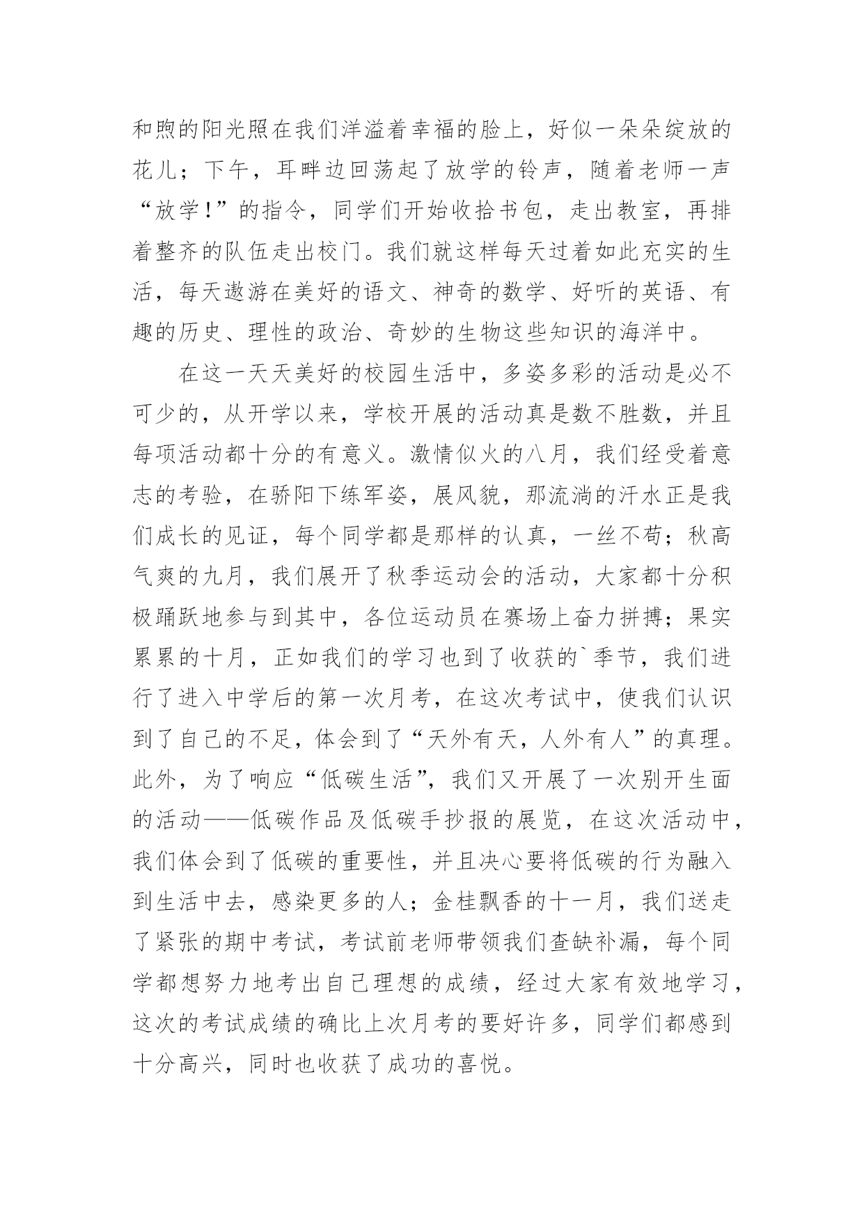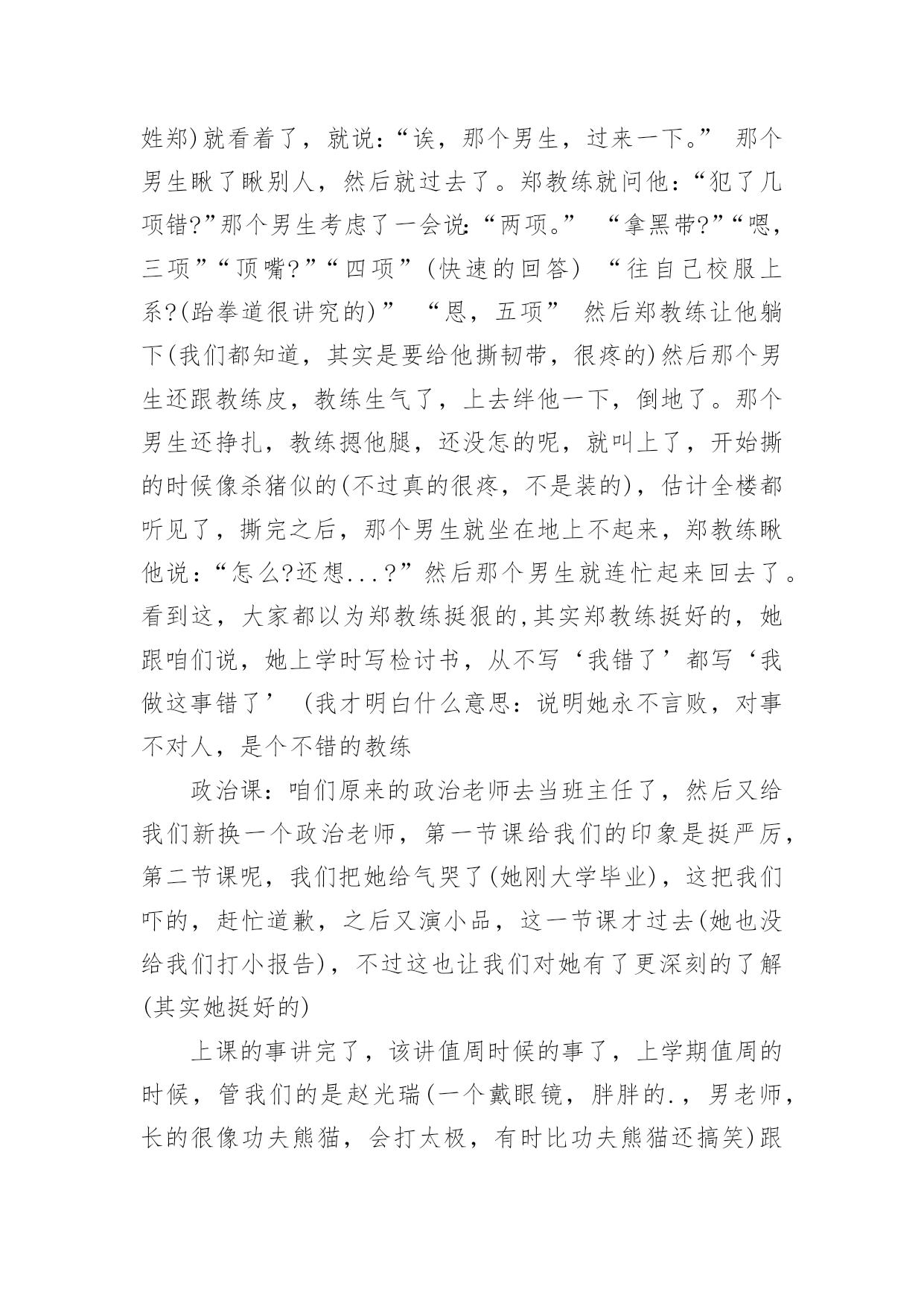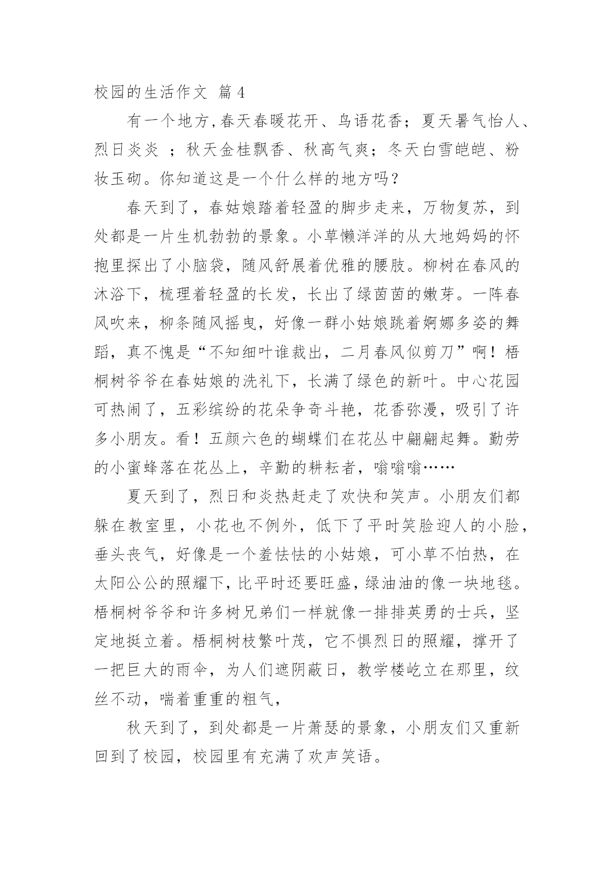 校园的生活作文精选校园的生活作文5篇在平凡的学习、工作、生活中,大家都有写作文的经历,对作文很是熟悉吧,借助作文可以提高我们的语言组织能力。相信许多人会觉得作文很难写吧,以下是小编帮大家整理的校园的生活作文5篇,供大家参考借鉴,希望可以帮助到有需要的朋友。校园的生活作文篇1校园,让生活更美好!伴着清晨的微风,一走进校门,就看见和蔼可亲的老师面带微笑地看着我们。一栋高大的教学楼映入眼帘,教学楼中的朗朗读书声,声声入耳。上课了,热闹的校园安静下来,只剩下鸟儿悦耳婉转的歌声和我们的读书声,小鸟仿佛也想加入读书的队伍,在为我们卖力地“伴奏”着。我们也在它们的陪伴下,全神贯注着听着老师讲着有趣的课。下课后,操场上的纸飞机在空中划过一道优美的弧线,篮球发出的“砰砰”声中充满了大家对它的热爱。同学们尽情地嬉戏打闹,操场后面的一块空地是女生的“天堂”。春天到来的时候,这里的几棵桂花树散发出淡淡的清香,在这里读书,聊天,做游戏再惬意不过了。高楼层的孩子们在老师的提醒中放慢了奔跑的脚步,我们没有广阔的地方可以玩耍,但是这也限制不了我们喜悦的心情和玩耍的兴致。我们还在班上咋咋呼呼,好像什么都限制不住我们的.欢乐。放学了,一声悦耳的铃声过后,从教学楼里陆续传来”老师再见”的声音,一个个班级排着队伍走出了校园,校园慢慢地恢复了宁静。班级里还可以看见几个忙碌的身影,值日生把教室里的每一个角落打扫得干干净净,一尘不染,使教室焕然一新,为明天的我们留下一个干净的教室。校园外,人山人海,有家长,有学生,有老师,还有志愿者……车声,脚步声,聊天声,响成一片。清校铃声响了,提醒同学们要回家了,几个急促的身影走出校门。每天似乎都是一样的,可是在细节上又增添了几分不一样的绚丽色彩。是校园让生活更美好,这是美好的回忆,有欢笑,有痛哭,有生气,有悲伤。这就是我的校园。校园的生活作文篇2开学一个月了,想起初中的校园生活,真得挺有趣的。早上到学校,在老师没来之前去打会篮球,或者在教室跟同学侃一侃,老师来之后看会书,然后上课,上数学课时就解会儿数学题,上其他的课呢,就听老师讲点东西,然后譬如音乐,劳技等就上自习,蛮有意思。跆拳道课:我们学校是跆拳道特色学校,每周都有一节跆拳道课。那天上课,上到一半,我们班一个超级彪悍的男生,顺手拿了一根搭在杆上的黑带,然后紧接着系在自己的校服上(上跆拳道课,不穿道服就犯了一项错,还在那讲话)然后咱们的跆拳道教练(女的,挺年轻,短发,戴个眼镜,姓郑)就看着了,就说:“诶,那个男生,过来一下。”那个男生瞅了瞅别人,然后就过去了。郑教练就问他:“犯了几项错?”那个男生考虑了一会说:“两项。”“拿黑带?”“嗯,三项”“顶嘴?”“四项”(快速的回答)“往自己校服上系?(跆拳道很讲究的)”“恩,五项”然后郑教练让他躺下(我们都知道,其实是要给他撕韧带,很疼的)然后那个男生还跟教练皮,教练生气了,上去绊他一下,倒地了。那个男生还挣扎,教练摁他腿,还没怎的呢,就叫上了,开始撕的时候像杀猪似的(不过真的很疼,不是装的),估计全楼都听见了,撕完之后,那个男生就坐在地上不起来,郑教练瞅他说:“怎么?还想...?”然后那个男生就连忙起来回去了。看到这,大家都以为郑教练挺狠的,其实郑教练挺好的,她跟咱们说,她上学时写检讨书,从不写‘我错了’都写‘我做这事错了’(我才明白什么意思:说明她永不言败,对事不对人,是个不错的教练政治课:咱们原来的政治老师去当班主任了,然后又给我们新换一个政治老师,第一节课给我们的印象是挺严厉,第二节课呢,我们把她给气哭了(她刚大学毕业),这把我们吓的,赶忙道歉,之后又演小品,这一节课才过去(她也没给我们打小报告),不过这也让我们对她有了更深刻的了解(其实她挺好的)上课的事讲完了,该讲值周时候的事了,上学期值周的时候,管我们的是赵光瑞(一个戴眼镜,胖胖的.,男老师,长的很像功夫熊猫,会打太极,有时比功夫熊猫还搞笑)跟他值周唯一的好处是——嘎。一天放学晚上,我跟他去检查个班晚上的扫除情况,走到七年三班的时候,进去看到三班班主任在后边批卷纸,然后赵老师就对我说:“讲台不合格”(那意思就是让我记下来)三班班主任听见后,就说:“这还不干净,你想怎地?”然后他说:“想合格也行,请我吃饭,300的”三班班主任听后说:“得得,赶紧出去!”出来后,我跟他说:“你也太黑了吧”(那时候混的很熟了)听罢,说:“这还黑啊,没管她要500就不错了”当场晕倒(最后也没扣分,就是开玩笑)还有一回,也是晚上检查,还有一个值周长——初三的(女生)走在走廊里,因为我们要记录。所以得开灯,开完事,不是得闭了么,当时我走在最前面,中间是赵光瑞,最后是那个初三的(当时我们跟她混的也熟),赵光瑞说:“去把灯闭了”按道理得那个值周长闭把灯闭了(走在最后面,而且灯也是在后面)那个值周长让我