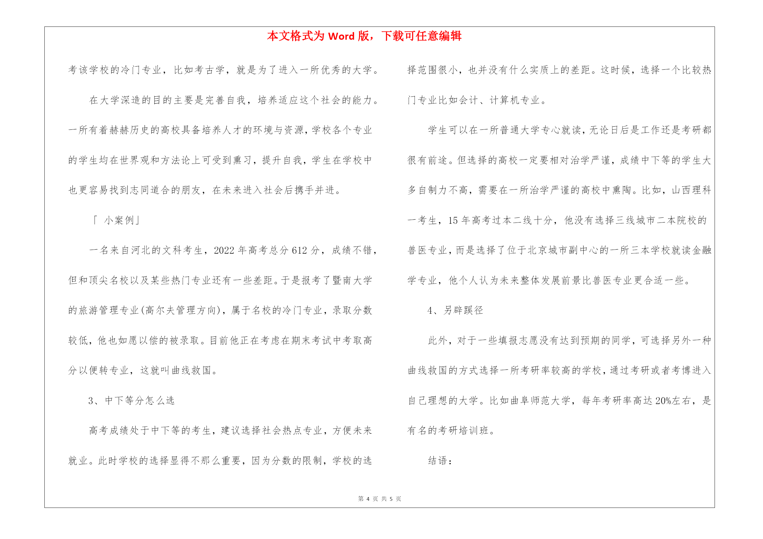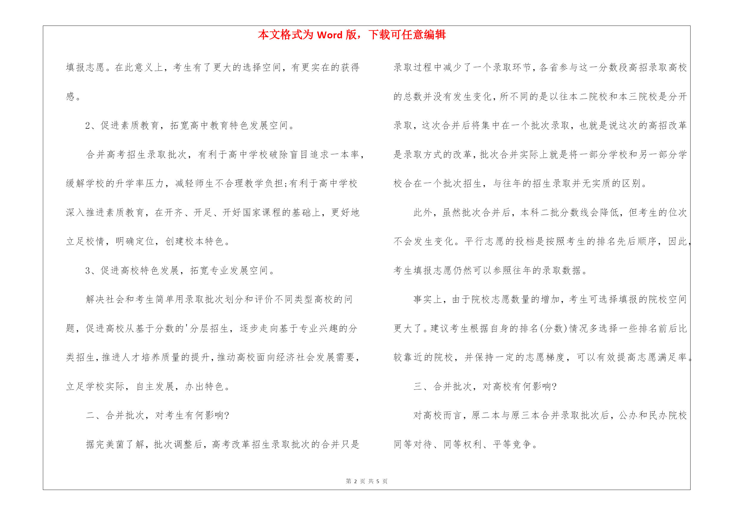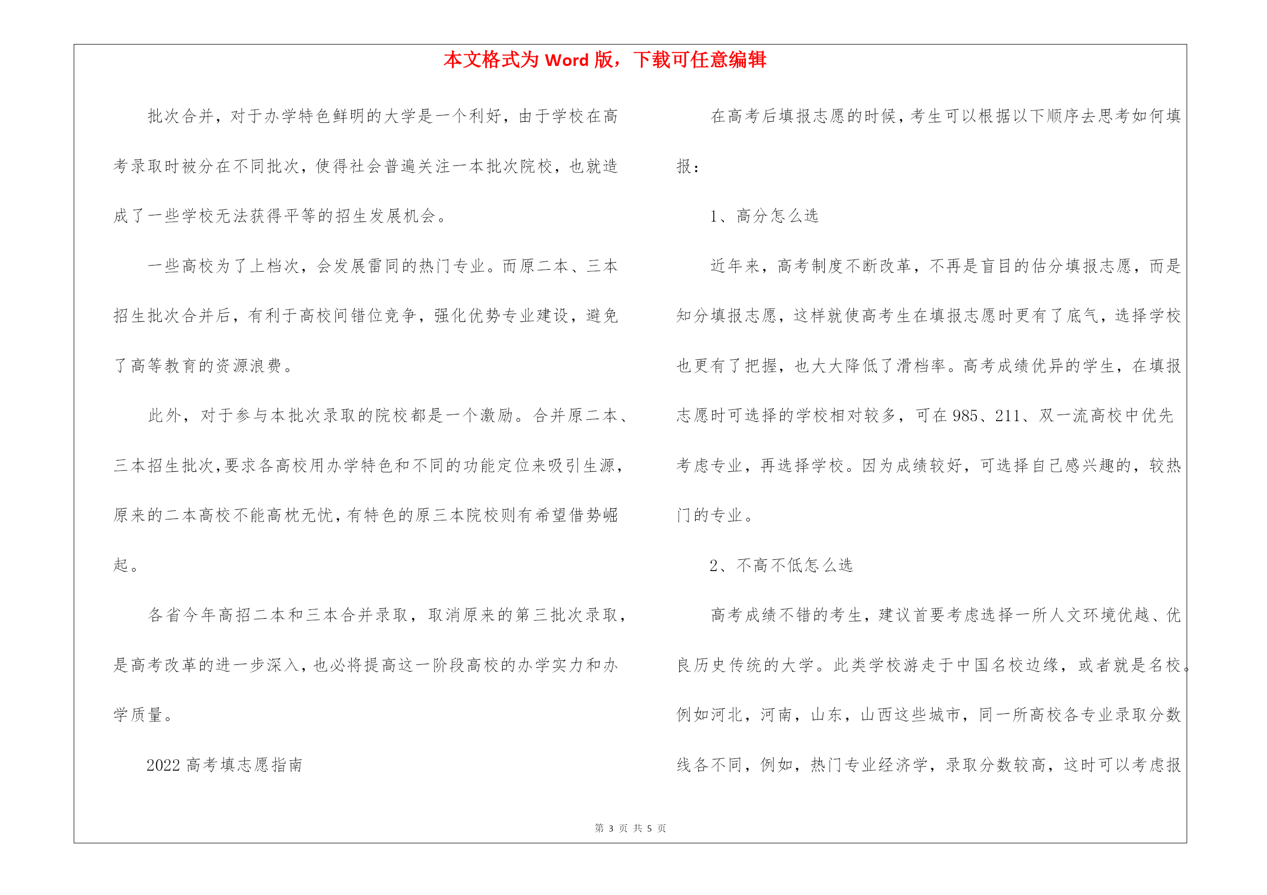 本文格式为Word版,下载可任意编辑第PAGE\*MERGEFORMAT5页共NUMPAGES\*MERGEFORMAT5页2022高考志愿填报改革2022高考志愿填报改革这两年,高考填报志愿发生了重大的改变,作为2022年即将毕业的高三学生们,该如何填报志愿呢?下面是出国留学网的我为大家整理的高考录取规则重大改革,2022年志愿该怎么填?跟我一起去看看吧!高考录取规则重大改革,2022年志愿该怎么填?这两年,高考改革的动作可是有点多。从取消文理分科,到英语退出高考舞台,再到合并本科录取批次可以说每个动作都会对所涉及的考生、高中和高校,产生一次蝴蝶效应。今天,完美菌就把合并本科录取批次这个政策拎出来,和大家详细聊一聊此政策的用意,以及对各方面又会产生什么样的影响。我国最早正式表明要取消高校招生录取批次,是在2022年。当年,国务院印发了《关于深化考试招生制度改革的实施意见》。《意见》指出,从2022年起,有条件的省份要逐步开展录取批次改革。近日,山东、海南分别召开2022年普通高校考试招生新闻发布会,宣布从2022年起,将合并本科一批、二批录取批次。而截止到目前,已有包括浙江、四川、湖北、广东、北京、河南、江苏、安徽等22个省市开始实施合并录取批次(包括合并一二批的6个省市和合并二三批的16个省市),其中,浙江采取按考生高考总分分段填报志愿、分段录取的政策。一、为什么要合并录取批次?据教育部相关介绍,合并高考招生录取批次的出发点有三个:1、拓展学生选择机会,促进学生全面发展和个性发展。考生填报高校志愿、专业志愿的数量不变,志愿填报的空间并未减少。有助于进一步引导考生根据自身兴趣特长和社会对人才的需求填报志愿。在此意义上,考生有了更大的选择空间,有更实在的获得感。2、促进素质教育,拓宽高中教育特色发展空间。合并高考招生录取批次,有利于高中学校破除盲目追求一本率,缓解学校的升学率压力,减轻师生不合理教学负担;有利于高中学校深入推进素质教育,在开齐、开足、开好国家课程的基础上,更好地立足校情,明确定位,创建校本特色。3、促进高校特色发展,拓宽专业发展空间。解决社会和考生简单用录取批次划分和评价不同类型高校的问题,促进高校从基于分数的'分层招生,逐步走向基于专业兴趣的分类招生,推进人才培养质量的提升,推动高校面向经济社会发展需要,立足学校实际,自主发展,办出特色。二、合并批次,对考生有何影响?据完美菌了解,批次调整后,高考改革招生录取批次的合并只是录取过程中减少了一个录取环节,各省参与这一分数段高招录取高校的总数并没有发生变化,所不同的是以往本二院校和本三院校是分开录取,这次合并后将集中在一个批次录取,也就是说这次的高招改革是录取方式的改革,批次合并实际上就是将一部分学校和另一部分学校合在一个批次招生,与往年的招生录取并无实质的区别。此外,虽然批次合并后,本科二批分数线会降低,但考生的位次不会发生变化。平行志愿的投档是按照考生的排名先后顺序,因此,考生填报志愿仍然可以参照往年的录取数据。事实上,由于院校志愿数量的增加,考生可选择填报的院校空间更大了。建议考生根据自身的排名(分数)情况多选择一些排名前后比较靠近的院校,并保持一定的志愿梯度,可以有效提高志愿满足率。三、合并批次,对高校有何影响?对高校而言,原二本与原三本合并录取批次后,公办和民办院校同等对待、同等权利、平等竞争。批次合并,对于办学特色鲜明的大学是一个利好,由于学校在高考录取时被分在不同批次,使得社会普遍关注一本批次院校,也就造成了一些学校无法获得平等的招生发展机会。一些高校为了上档次,会发展雷同的热门专业。而原二本、三本招生批次合并后,有利于高校间错位竞争,强化优势专业建设,避免了高等教育的资源浪费。此外,对于参与本批次录取的院校都是一个激励。合并原二本、三本招生批次,要求各高校用办学特色和不同的功能定位来吸引生源,原来的二本高校不能高枕无忧,有特色的原三本院校则有希望借势崛起。各省今年高招二本和三本合并录取,取消原来的第三批次录取,是高考改革的进一步深入,也必将提高这一阶段高校的办学实力和办学质量。2022高考填志愿指南在高考后填报志愿的时候,考生可以根据以下顺序去思考如何填报:1、高分怎么选近年来,高考制度不断改革,不再是盲目的估分填报志愿,而是知分填报志愿,这样就使高考生在填报志愿时更有了底气,选择学校也更有了把握,也大大降低了滑档率。高考成绩优异的学生,在填报志愿时可选择的学校相对较多,可在985、211、双一流高校中优先考虑专业,再选择学校。因为成绩较好,可选择自己感兴趣的,较热门的专业。2、不高不低怎么选高考成绩不错的考生,建议首要考虑选择一所人文环境优越、优良历史传统的大学。此类学校游走于中国名校边缘,或者就是名校。例如河北,河南,山东,