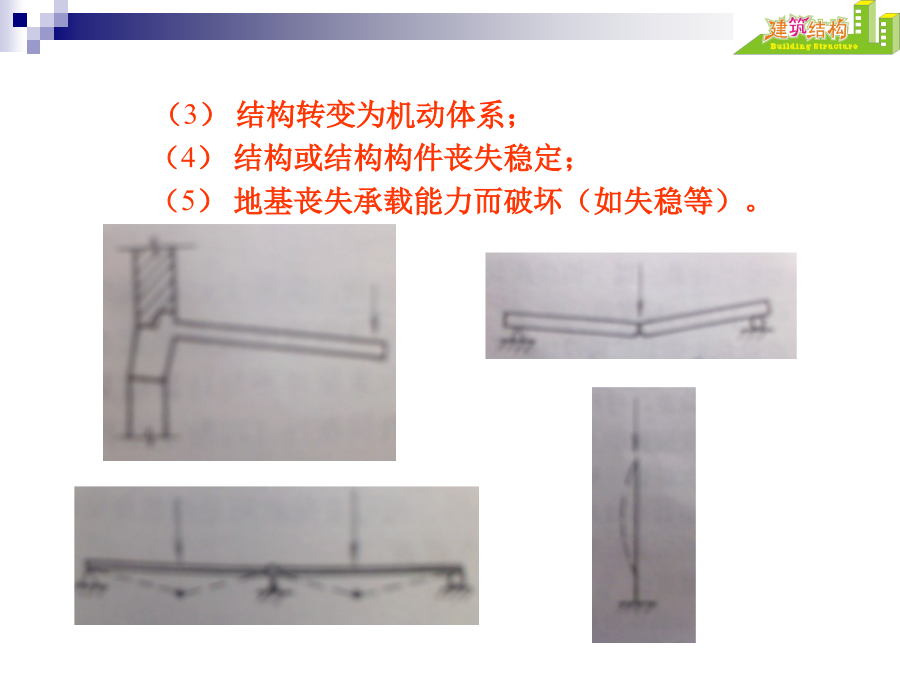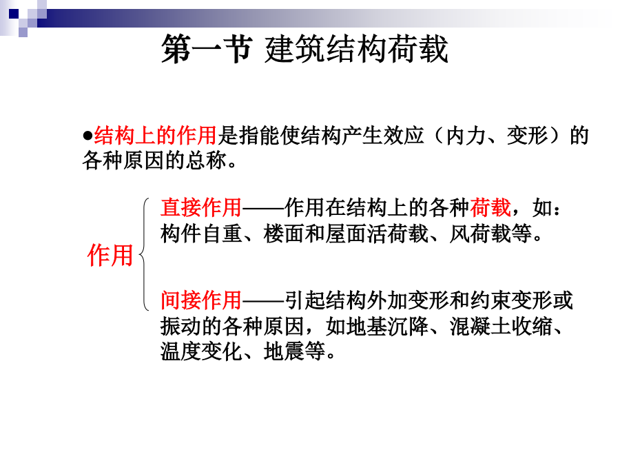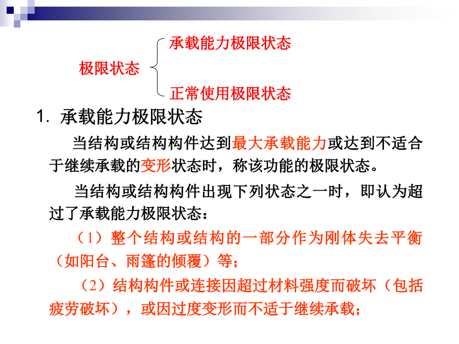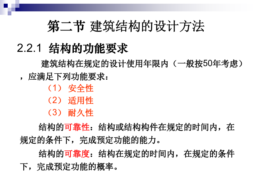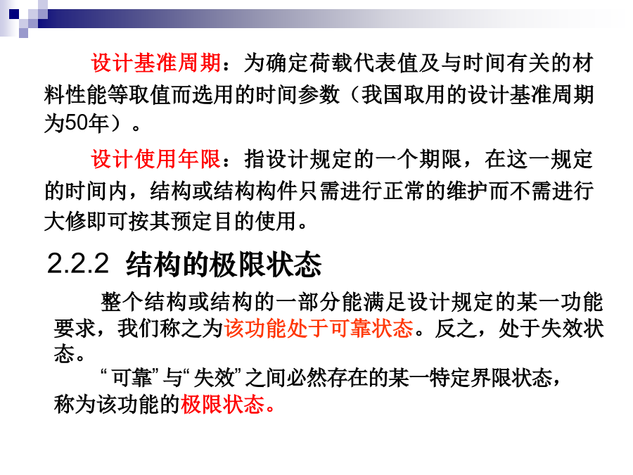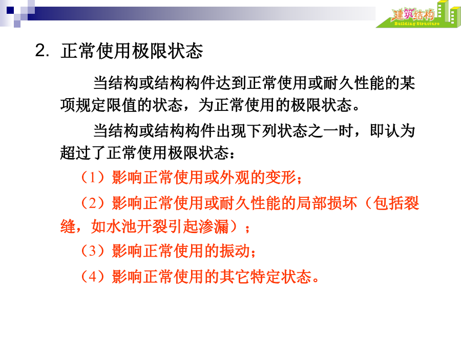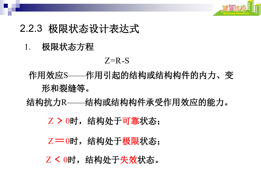 (3)结构转变为机动体系;(4)结构或结构构件丧失稳定;(5)地基丧失承载能力而破坏(如失稳等)。2.正常使用极限状态2.2.3极限状态设计表达式极限状态设计表达式承载能力极限状态设计表达式γ0S≤Rγ0—结构重要性系数。γ0的确定:按照《建筑结构可靠度设计统一标准》,根据建筑结构破坏后果的严重性,将建筑结构划分为三个安全等级。对安全等级为一级、二级、三级的结构构件,其结构构件的重要性系数γ0分别取1.1、1.0、0.9。S—荷载效应组合设计值。R—结构构件的承载力设计值。内力组合设计值S的确定考虑永久性荷载和可变荷载共同作用所得的结构内力值称为结构的内力组合值。对于基本组合,荷载效应组合的设计值S应从下列组合值中取最不利值确定:(1)由可变荷载效应控制的组合:(2)由永久荷载效应控制的组合:对于一般排架、框架结构,基本组合可采用简化规则,并应按下列组合值中取最不利值确定:(1)由可变荷载效应控制的组合:(2)由永久荷载效应控制的组合仍按公式(1)采用。正常使用极限状态验算(2)对于频遇组合,荷载效应组合值S按下式计算:地震波