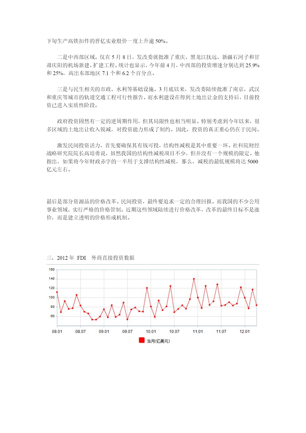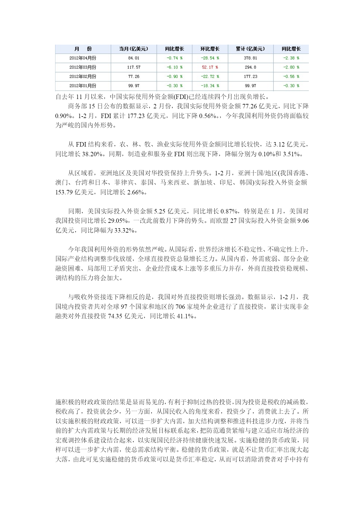 投资指标:=1\*GB3①固定资产投资指标=2\*GB3②外商投资指标固定资产投资指标数据今年1至4月我国固定资产投资增速为19.25%自2003年以来,我国固定资产投资增速一直维持在25%的较高水平,成为拉动经济增长的主力军。然而,这一态势从去年5月开始发生改变。在触及25.8%的年内高位后,投资增速一路下滑,到去年底已降至23.8%。今年以来,国内投资继续放缓。一季度,资本形成总额对GDP的贡献率只有33.4%,较去年全年大降20.8个百分点。与此同时,最终消费的贡献率上升24.4个百分点至76%。在我国的整个固定资产投资中,制造业投资、房地产投资和基建投资是最重要的三块。而前两者目前面临比较大的压力:制造业企业一季度盈利下滑,且部分行业出现严重产能过剩,没能力投、没地方投的矛盾显现。房地产投资方面,在调控政策不放松、部分房企现金流紧张的局面下,消化库存才是当前的趋势。从国家发改委的项目审批和各地陆续公布的项目开工情况看,本轮投资的定向性比较明显,主要包括三个方面:一是“十二五”已经规划好的项目。比如铁路,中央政府已强调要落实今年5000亿元的铁路投资,争取建成一批重大项目,而各地也陆续传出铁路复工的消息。受此影响,4月下旬生产高铁扣件的晋亿实业股价一度上升逾50%。二是中西部区域。仅在5月8日,发改委就批准了重庆、黑龙江抚远、新疆石河子和甘肃庆阳的机场新建、扩建工程。统计也显示,今年前4月,中西部的投资增速分别达到25.9%和25%,高出东部地区7.1个和6.2个百分点。三是与民生相关的市政、水利等基础设施。3月底以来,发改委陆续批准了南京、武汉和重庆等城市的轨道交通工程可行性报告。而水利建设在得到土地出让金的支持后,目前投资已进入实质性阶段。政府投资固然有一定的逆周期作用,但其局限性也相当明显。特别考虑到今年以来,很多区域的土地出让收入锐减,对投资能力形成了制约。因此,投资的真正重心仍在于民间。激发民间投资活力,首先要确保其有钱可投,结构性减税是其中重要一环。社科院财经战略研究院院长高培勇说,虽然我国的结构性减税项目不少,但并没有一个规模的限定。他指出,如果将今年财政赤字的一半用于支撑结构性减税,那么,减税的最低规模将达5000亿元左右。最后是部分资源品的价格改革。民间投资,最终要追求一定的合理回报。而我国的不少公用事业领域,实行严格的价格管制。近期这些领域陆续进行价格改革,改革的最终目标不是涨价,而是建立透明的价格形成机制。三、2012年FDI外商直接投资数据自去年11月以来,中国实际使用外资金额(FDI)已经连续四个月出现负增长。商务部15日公布的数据显示,2月份,我国实际使用外资金额77.26亿美元,同比下降0.90%。1-2月,FDI累计177.23亿美元,同比下降0.56%。,今年我国利用外资仍将面临较为严峻的国内外形势。从FDI结构来看,农、林、牧、渔业实际使用外资金额同比增长较快,达3.12亿美元,同比增长38.20%。同期,制造业和服务业FDI则出现下降,降幅分别为0.10%和3.51%。从区域看,亚洲地区及美国对华投资保持上升势头。1-2月,亚洲十国/地区(我国香港、澳门、台湾和日本、菲律宾、泰国、马来西亚、新加坡、印尼、韩国)实际投入外资金额153.79亿美元,同比增长2.66%。同期,美国实际投入外资金额5.25亿美元,同比增长0.87%,特别是在1月,美国对我国投资同比增长29.05%,一改此前数月下降的势头。而欧盟27国实际投入外资金额9.06亿美元,同比降幅为33.32%。今年我国利用外资的形势依然严峻。从国际看,世界经济增长不稳定性、不确定性上升,国际产业结构调整步伐放缓,全球直接投资总量增长乏力。从国内看,外需疲弱、部分企业融资困难、局部用工矛盾突出、企业经营成本上涨等多重压力并存,外商直接投资稳规模、调结构的压力将会加大。与吸收外资接连下降相反的是,我国对外直接投资则增长强劲。数据显示,1-2月,我国境内投资者共对全球97个国家和地区的706家境外企业进行了直接投资,累计实现非金融类对外直接投资74.35亿美元,同比增长41.1%。施积极的财政政策的结果是显而易见的,有利于抑制过热的投资,因为投资是税收的减函数,税收高了,投资就会少,另一方面,从国民收入的角度来看,投资少了,消费就上去了。所以实施积极的财政政策,可以进一步扩大内需,加大结构调整和推进科技进步力度,并将当前的扩大内需政策与长期的经济发展目标联系起来,把防范通货紧缩与建立适应市场经济的宏观调控体系建设结合起来,以实现国民经济持续健康快速发展。实施稳健的货币政策,同样可以进一步扩大内需